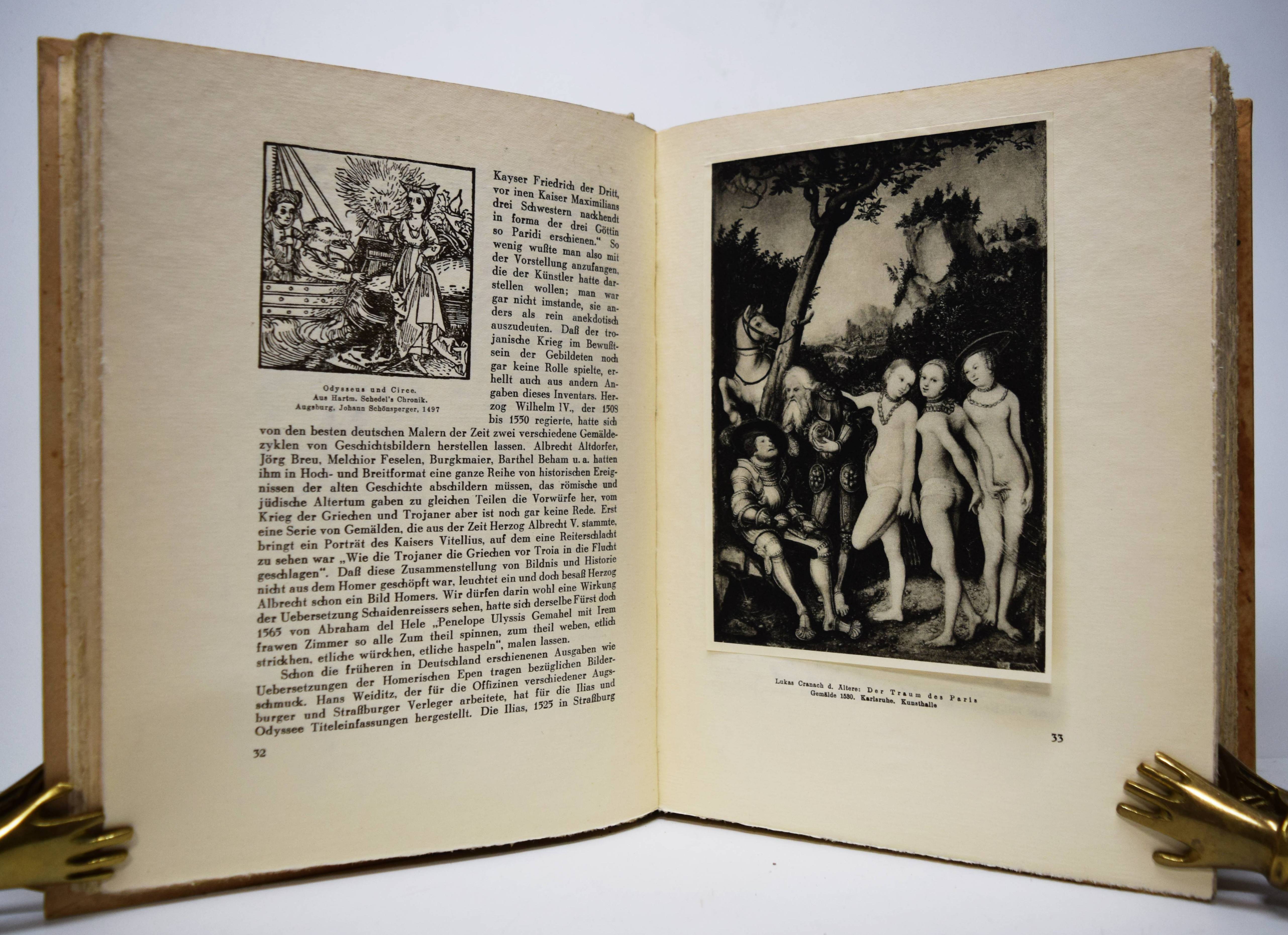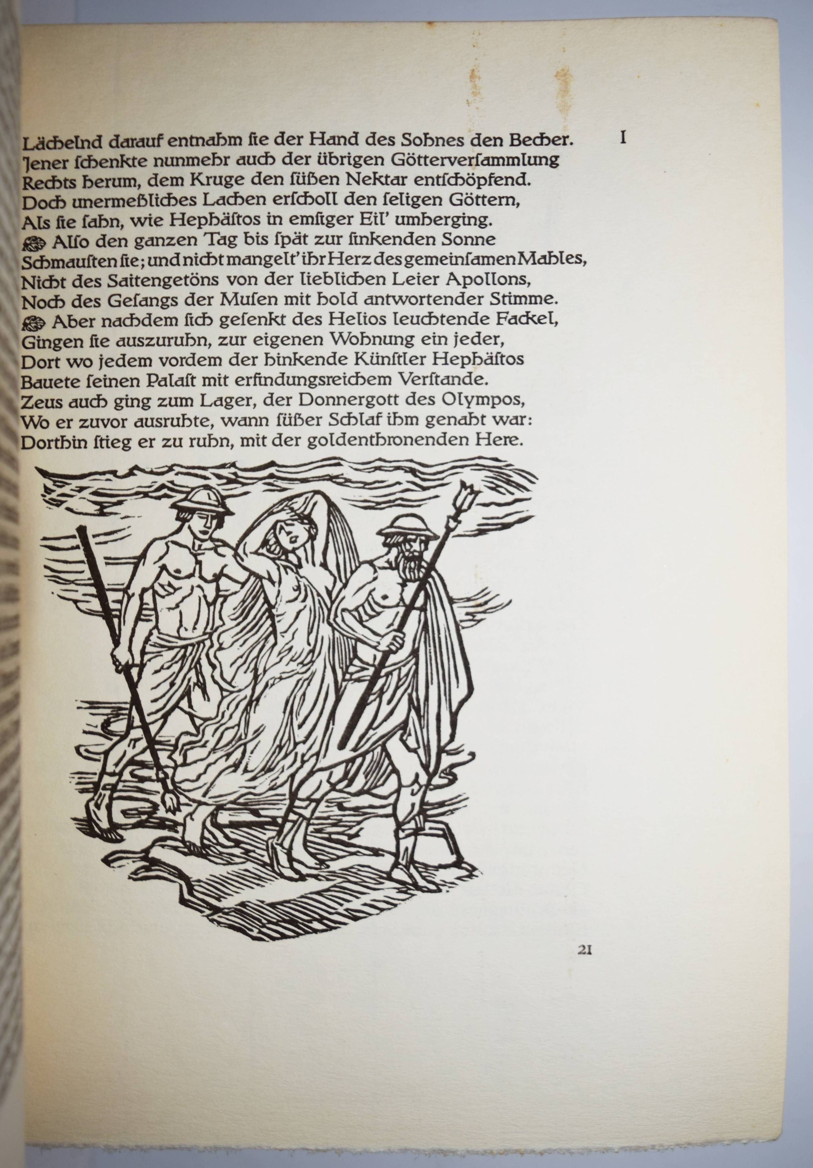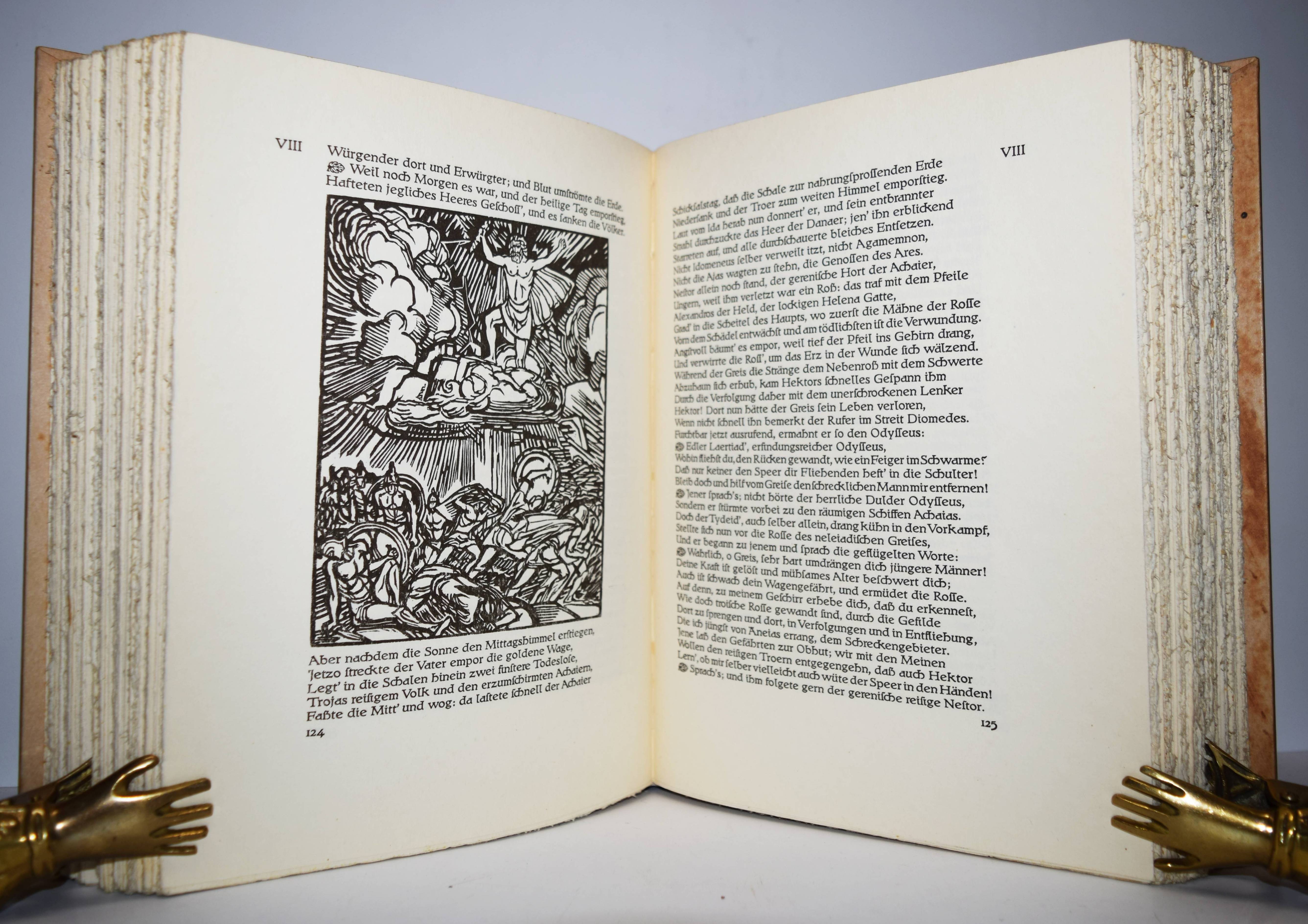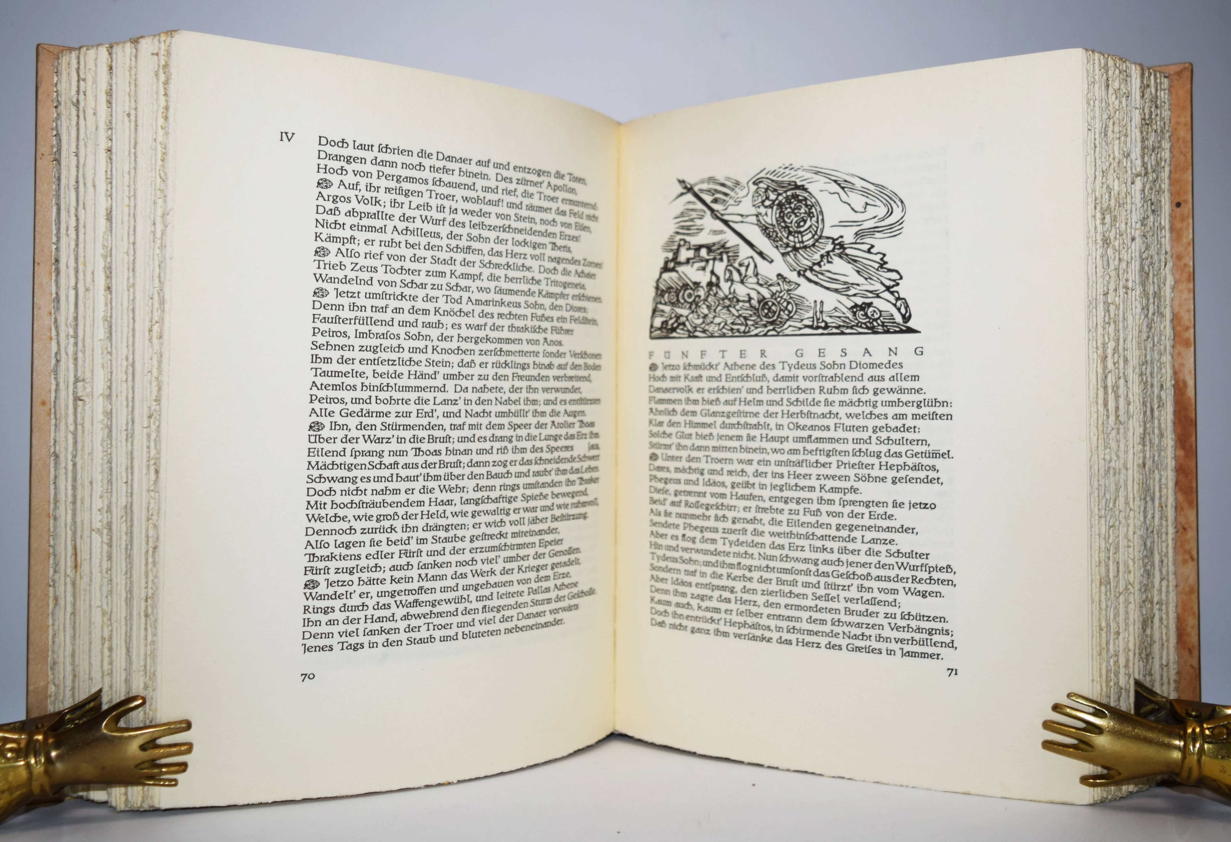 Homer. Ilias. Deutsch von Johann Heinrich Voß mit Hozschnitten von Ludwig von Hofmann und einer Einleitung „Homer in der Kunst“ von Max v. Boehn und Wolfgang Bruhn. Berlin, Askanischer Verlag Carl Albert Kindle (1939). 4°. 420 S., 4 Bl. mit zahlr. teils ganzs. und mont. Illustrationen und Textholzschnitten. Illustr. blindgepr. Orig.-Halbpergamenteinband. Sehr gutes sauberes Exemplar.