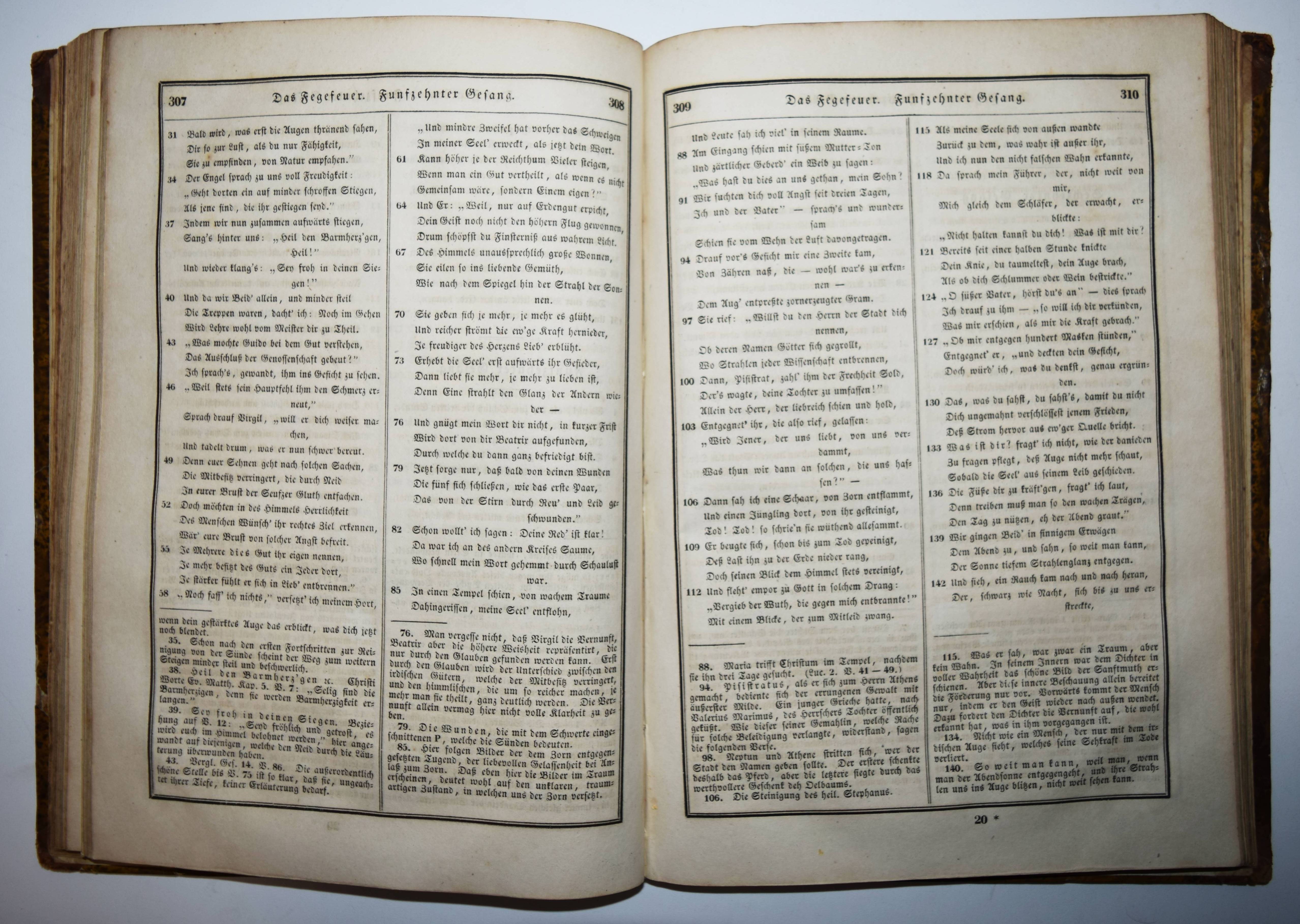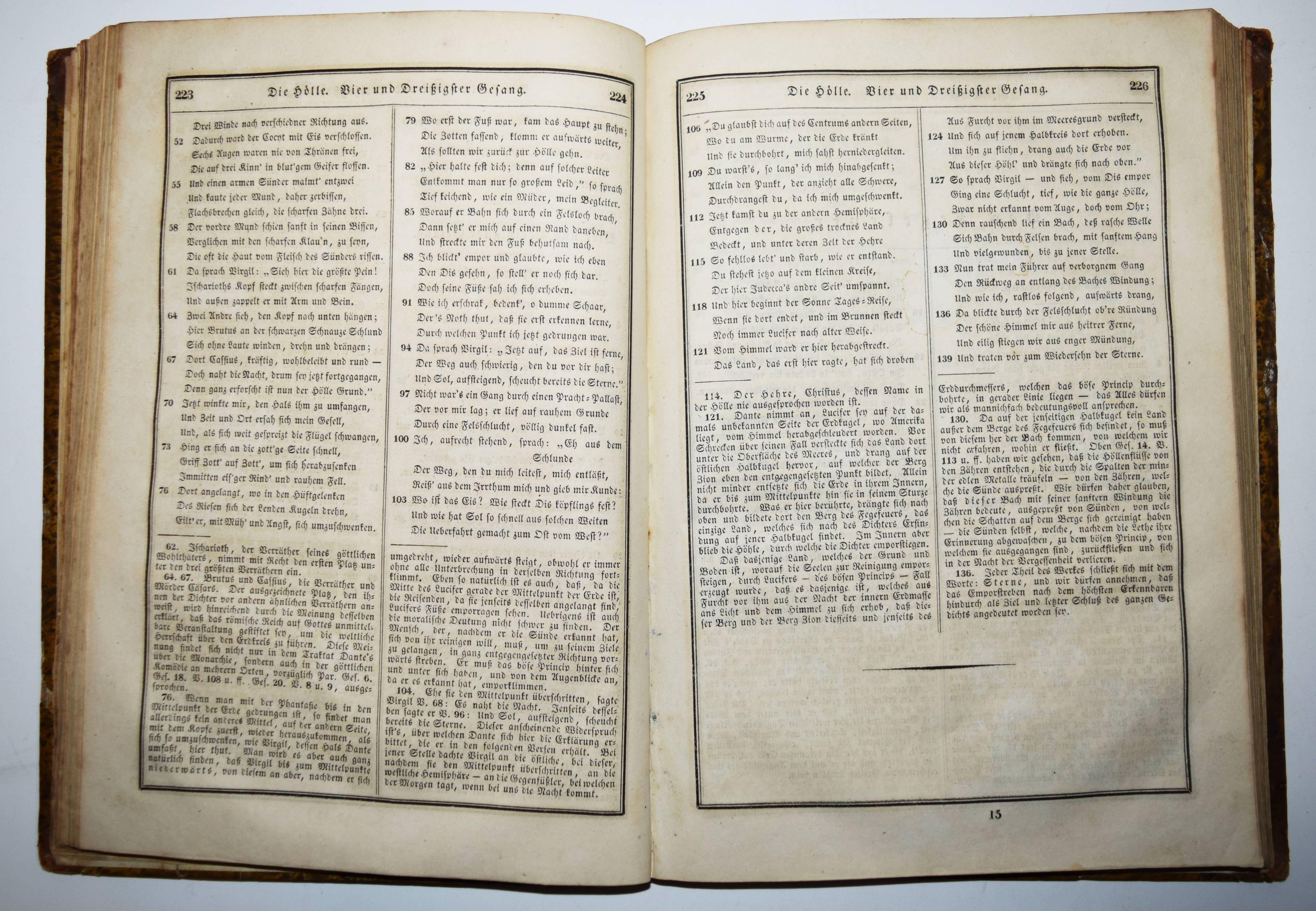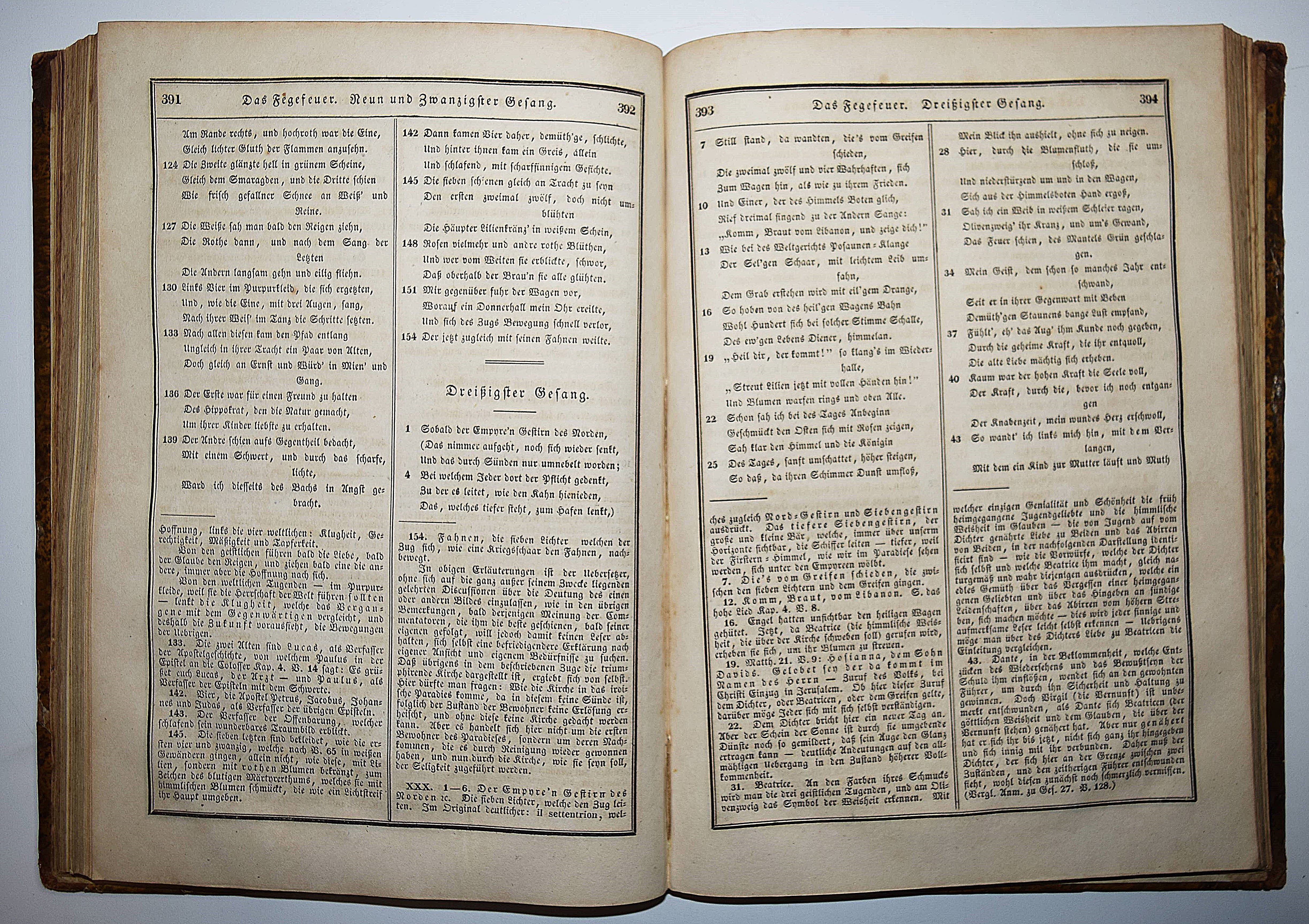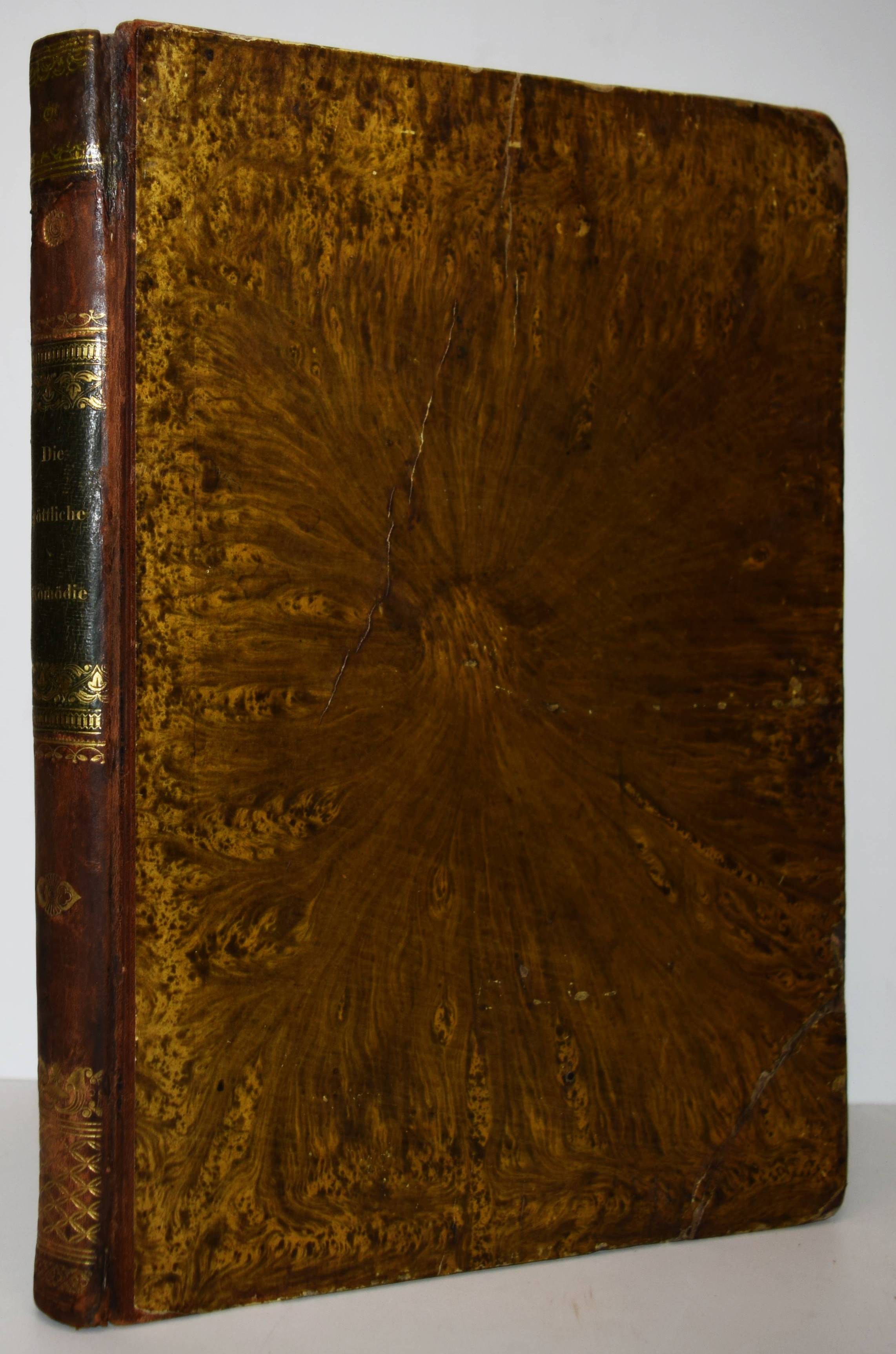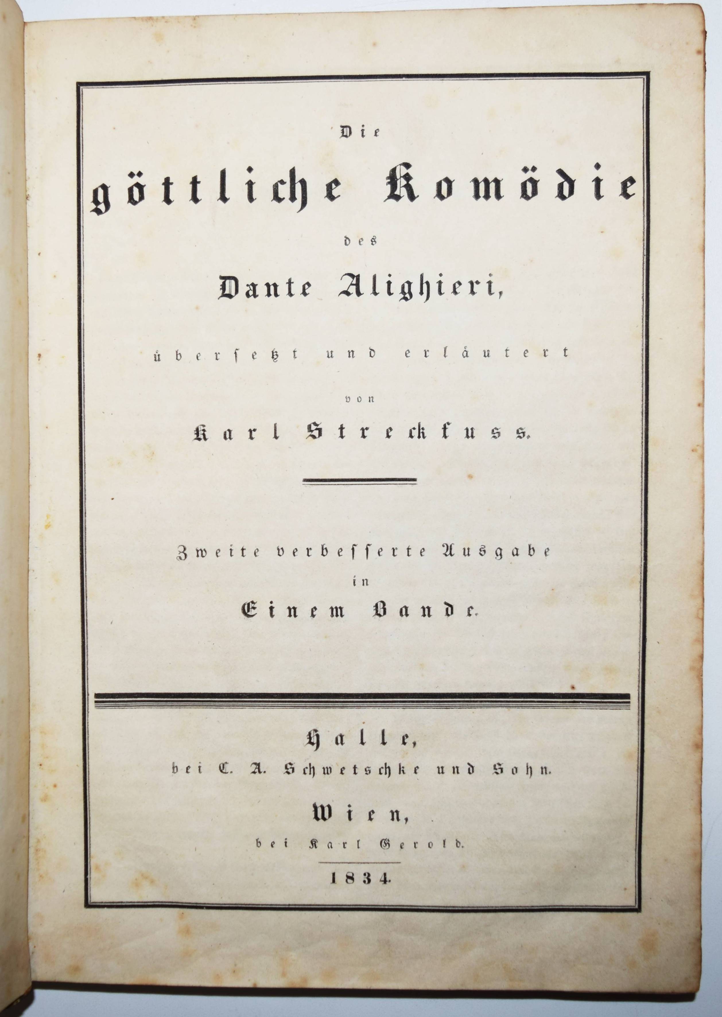 Dante Alighieri. Göttliche Komödie. Übersetzt und erläutert von Karl Streckfuss. 2. verbesserte Ausgabe in einem Bande. Halle, C. A. Schwetschke und Sohn und Wien, Karl Gerold 1834. Gr.-8° (24,5 x 17,5 cm.). Titel, 596 Spalten. Halblederband der Zeit mit goldgepr. Rückenschild und Rückenvergoldung. ADB XXXVI, 560 ff. Goedeke VII, 794, 37. – Zweite Ausgabe der Übertragung durch Karl Streckfuß (1778-1844), der Dantes Werk „verständnißvoll und glatt in deutsche Verse umgesetzt und mit brauchbaren Commentaren für den Durchschnittsbedarf begleitet hat. Seine Uebertragungen (erstmalig 1824-26) zeigen keine holprigen oder dunkeln Stellen, entbehren aber in der Regel des congenialen Anempfindens und Hineindenkens. Trotzdem sind sie werthvoll und haben in der Geschichte der neudeutschen, von den Führern der Romantik befruchteten Uebersetzerkunst ihre Rolle“ (L. Fränkel in ADB). – Rücken am Kapital unauffällig restauriert, stellenweise etwas braunfleckig, gutes Exemplar.