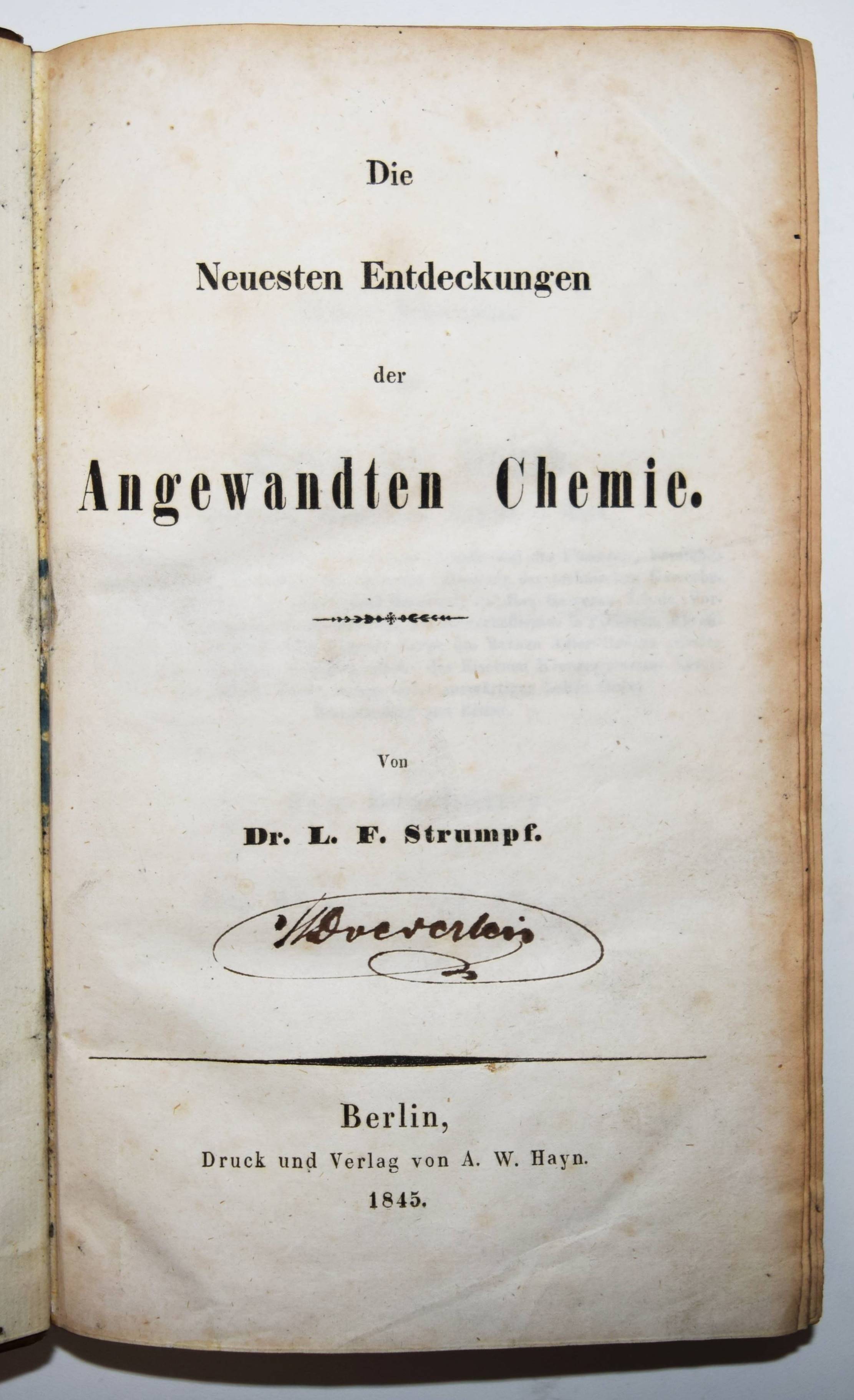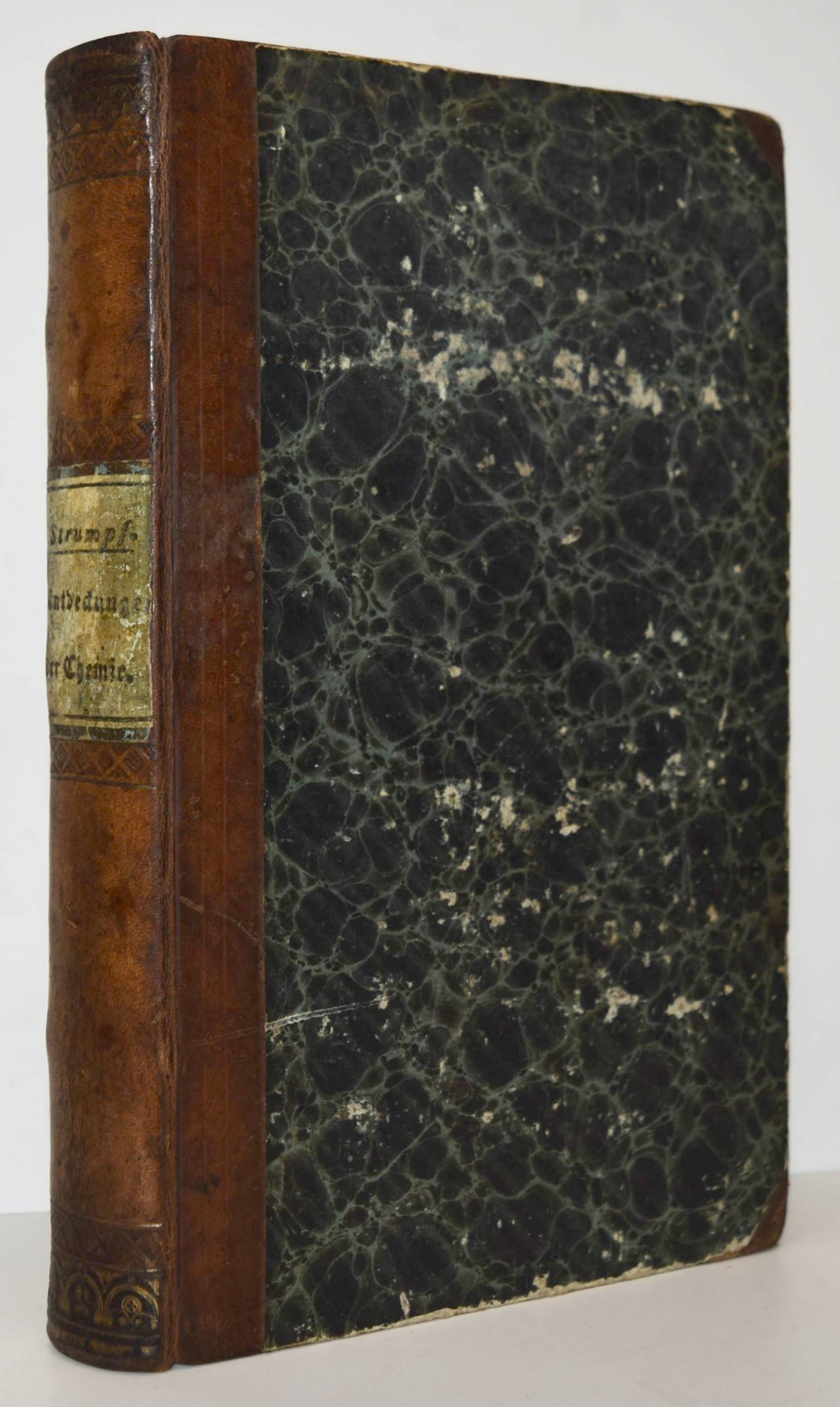 Strumpf, F(erdinand) L(udwig). Die neuesten Entdeckungen der angewandten Chemie. Berlin, A. W. Hayn 1845. 8°. XXV (2), 491 S. Halblederband der Zeit mit goldgepr. Rückenschild und dezenter Rückenvergoldung. Erste Ausgabe, selten. – Mit hunderten interessanten Anwendungen und Erklärungen chemischer Reaktionen. Über „Agrikultur-Chemie, (Holz)-Kohlenproduktion, Wesen und Zubereitung der Theesorten, Zuckerfabrikation, Alkoholgehalt einiger Weine und Biere, Ueber Branntweine aus zuckerhaltigen Pflanzensäften, Uebersicht von Untersuchungen mehrerer Biersorten, Räucherung des Fleisches, Milch, Tinte für Stahlfedern, Farben und Kitte, Schwefelgewinnung, Photographisches Bild durch Cyaneisenkalium, Trennung des Goldes vom Platin, Galvanischer Vergoldung des Kupfers, Königswasser und die wechselseitige Zersetzung der Salpetersäure und Salzsäure“ und vieles mehr. – F. L. Strumpf (1776-1852) war Apotheker in Berlin. – Deckel etwas berieben, zeitgenöss. Besitzvermerk auf dem Titelblatt, im Blattrand durchgehend etwas braun- und fingerfleckig, gutes Exemplar.