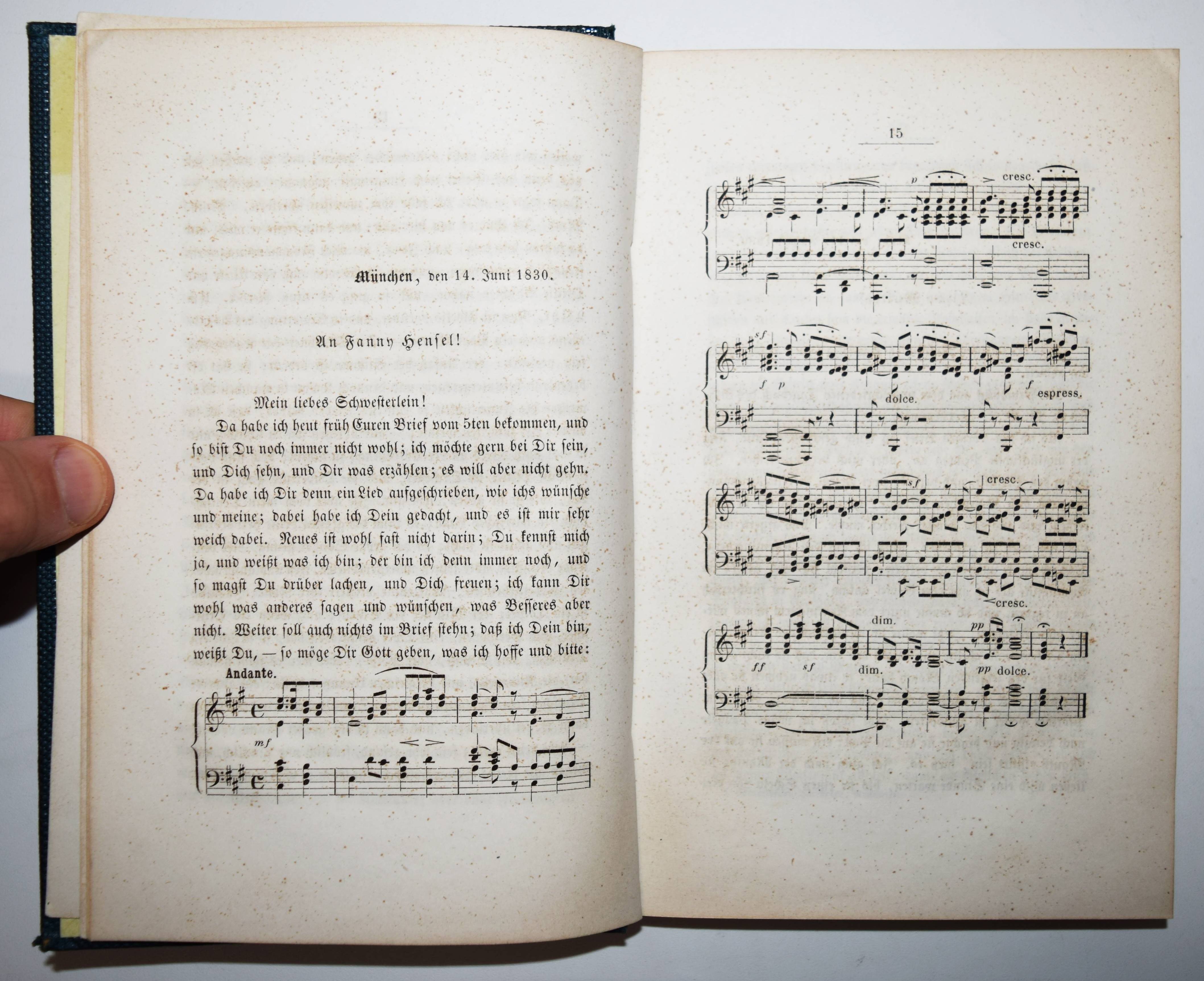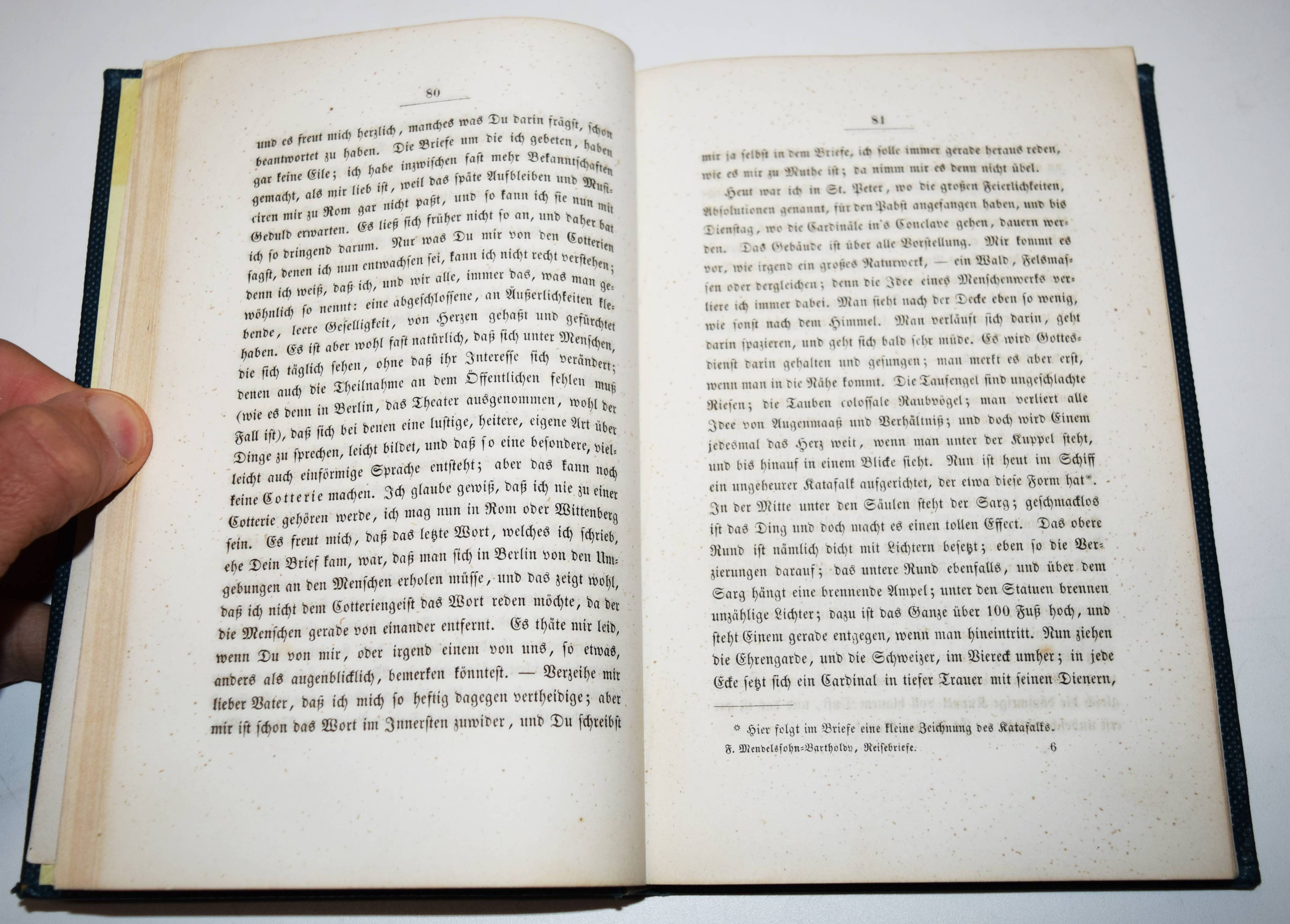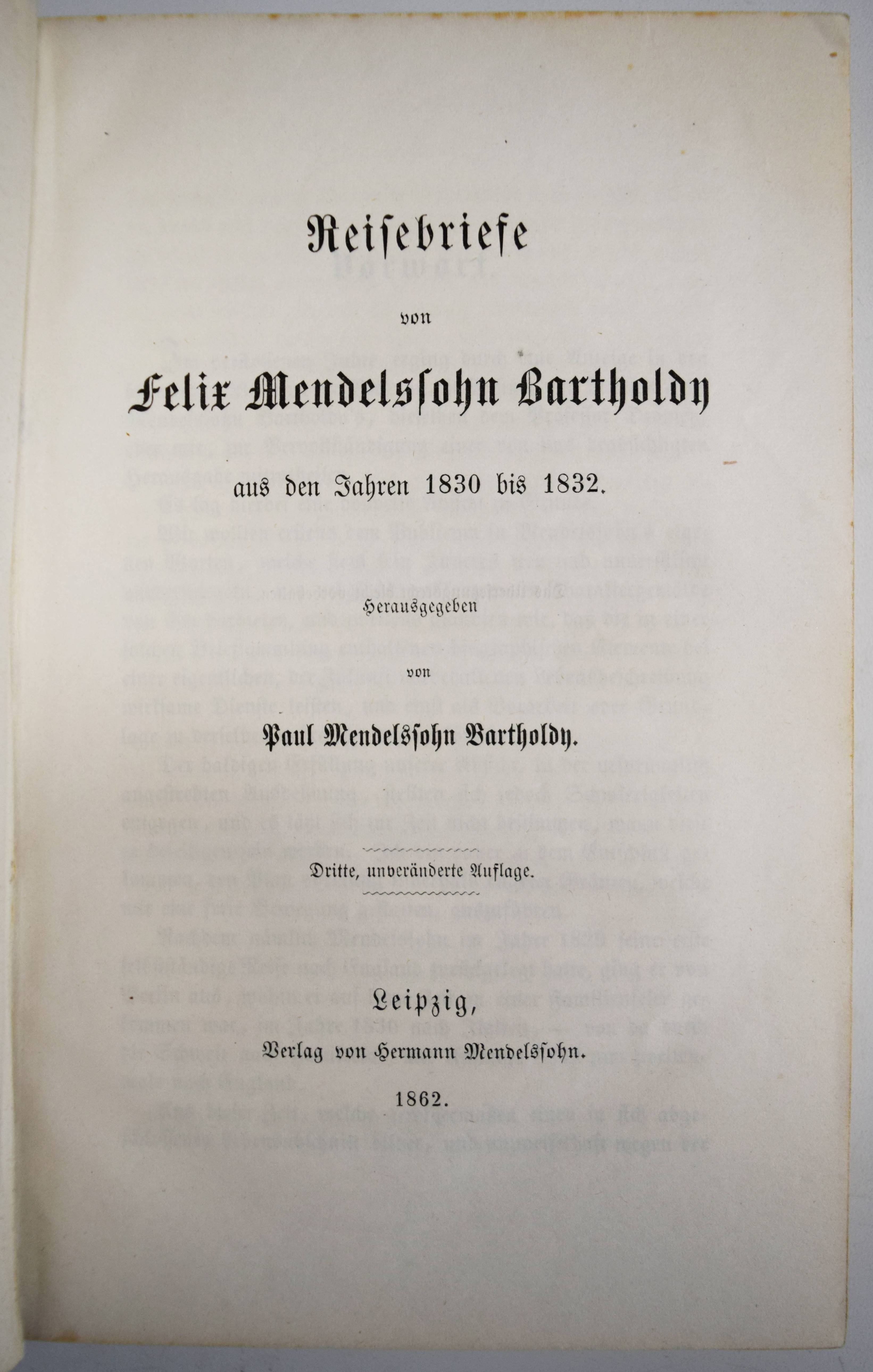 Mendelssohn Bartholdy, Felix. Reisebriefe. Aus den Jahren 1830 bis 1832. Herausgegeben von Paul Mendelssohn Bartholdy. 3. unveränderte Auflage. Leipzig, Hermann Medelssohn 1862. 8°. [1] Bl., IV, [1] Bl., 340 S. mit Musik-Beispielen und 2 Holzschnitten. Blindgeprägter Orig.-Leinenband mit goldgepr. Rücken- und Deckeltitel und Romanikervergoldung. Gutes Exemplar im dekorativen Verlagseinband.