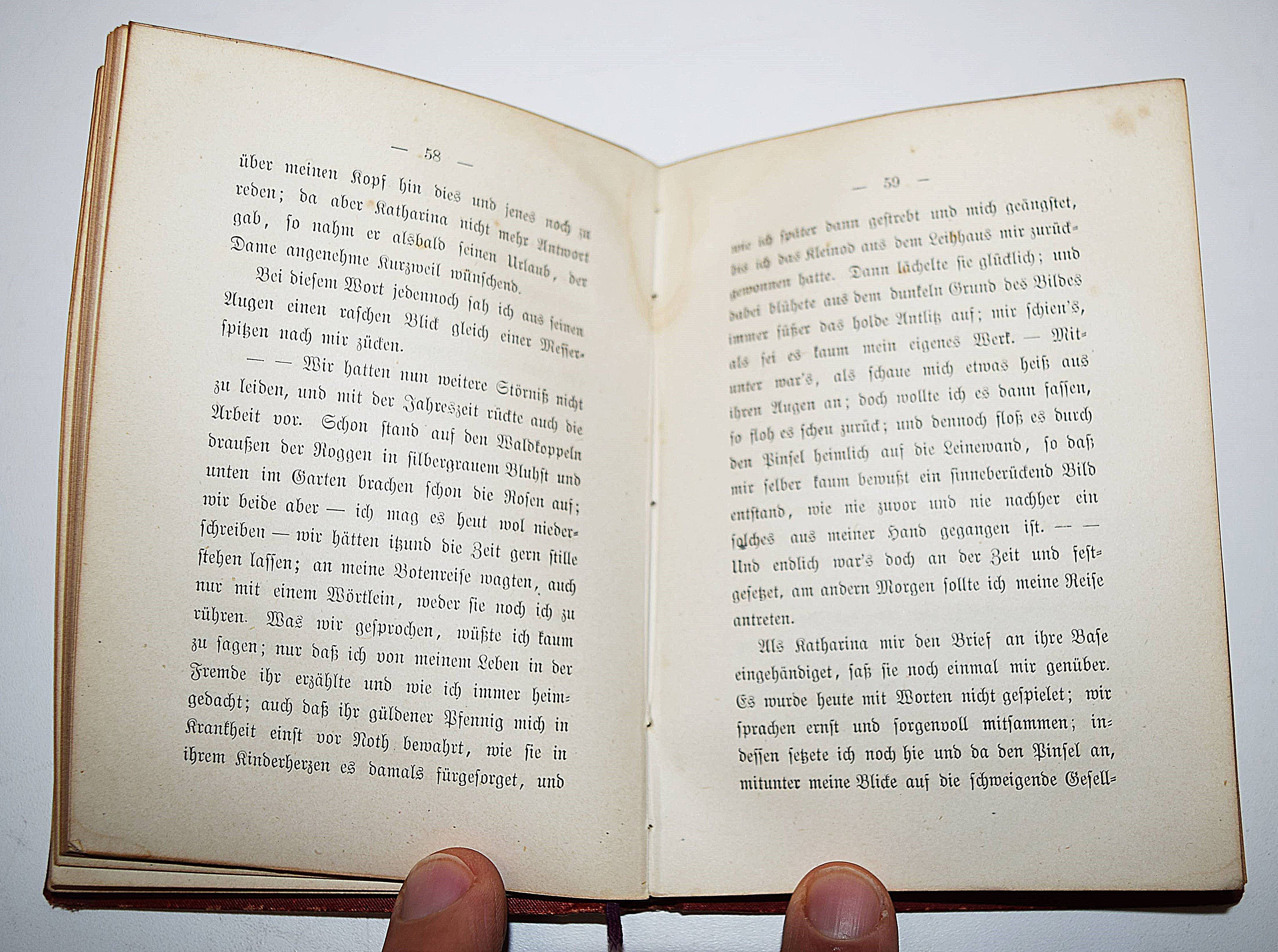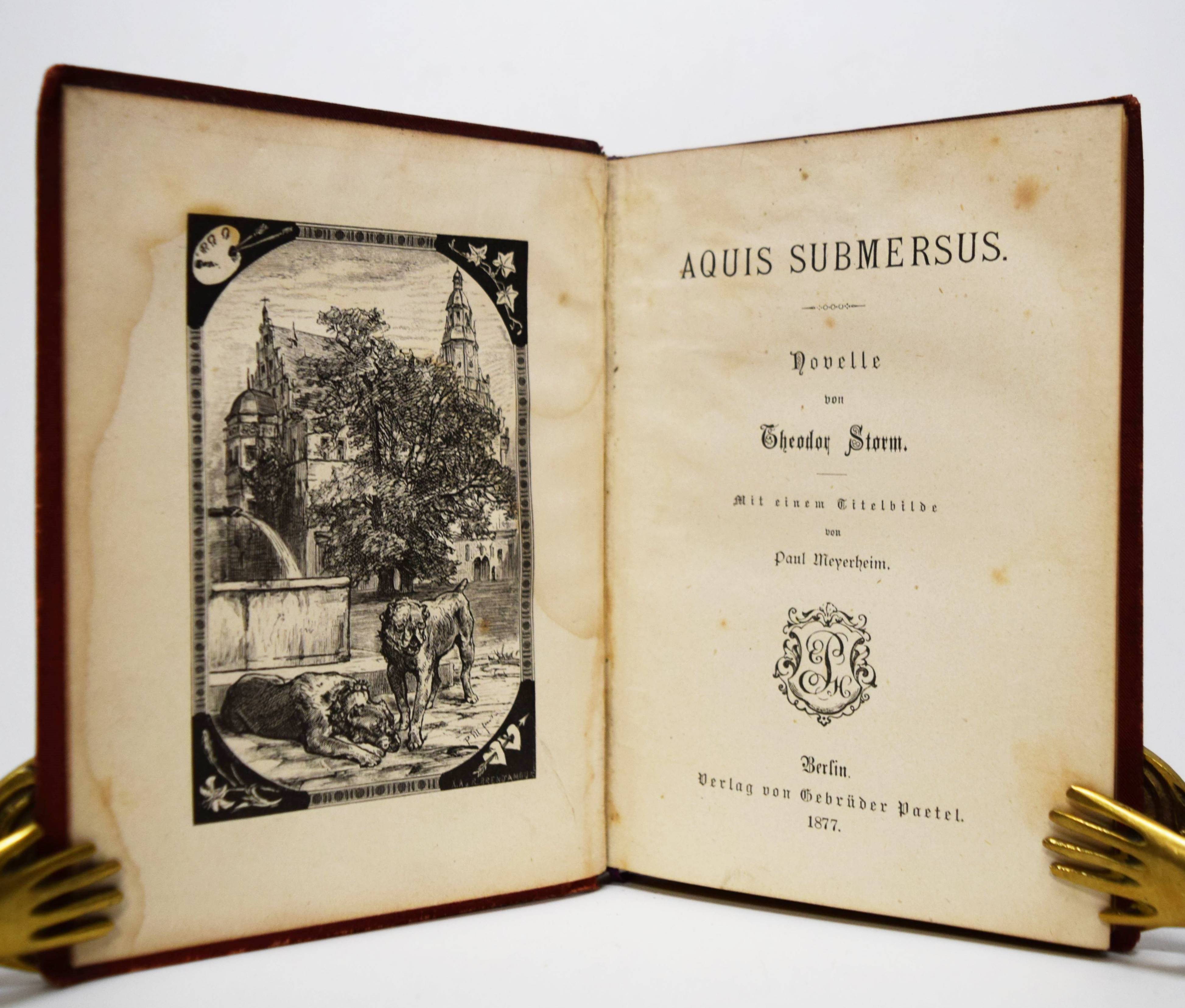 Storm, Theodor. Aquis submersus. Novelle. Berlin, Gebrüder Paetel 1877. Kl.-8°. [4] Bl., 158 S., [2] Bl. mit Frontispiz in Holzstich von Paul Meyerheim. Weinroter Orig.-Leinenband mit goldgepr. Rücken- und Deckeltitel und reicher Deckelornamentik sowie Goldschnitt. Slg. Borst 3359. W.-G.² 28. – Erste Ausgabe. – Einband angestaubt, Rückendeckel fleckig, Name auf dem Vorsatz, Frontispiz im Rand etwas wasserfleckig, stellenweise leicht braunfleckig, gutes Exemplar.