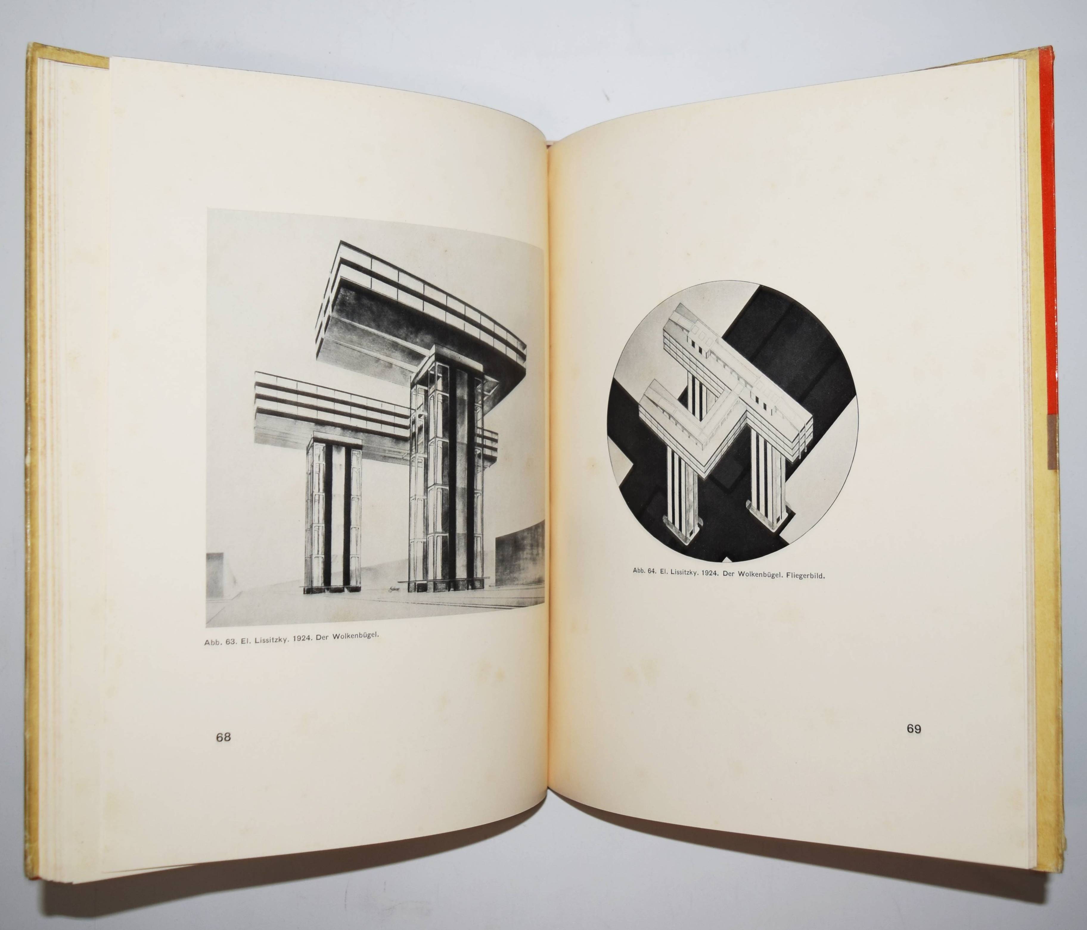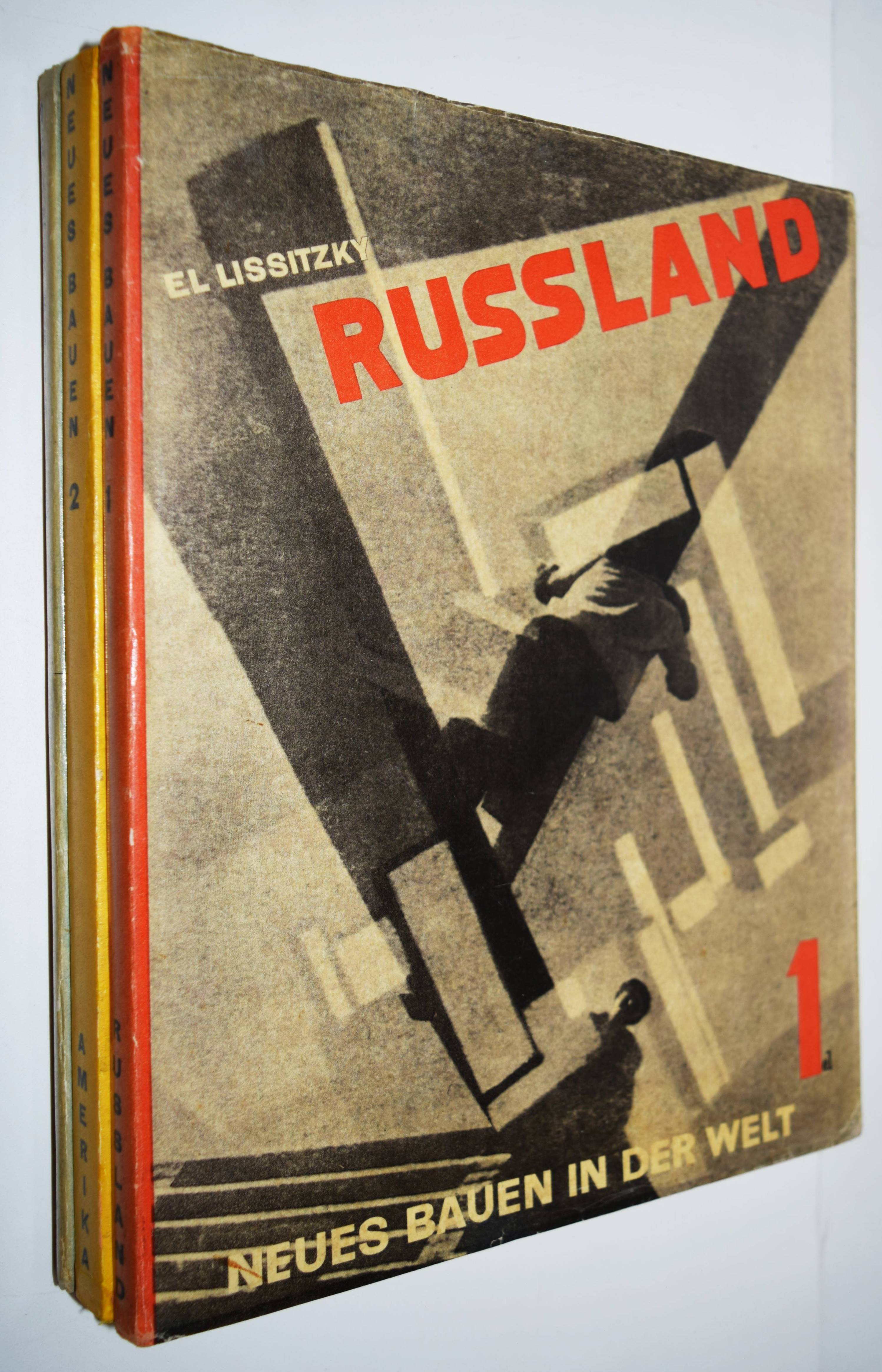 Lissitzky – Gantner, Joseph. Neues Bauen in der Welt. I. El Lissitzky. Russland. Die Rekonstruktion der Architektur in der Sowjetunion. – II. Richard J. Neutra. Amerika. Die Stilbildung des neuen Bauens in den Vereinigten Staaten. – III. Roger Ginsburger. Frankreich. Die Entwichklung der neuen Ideen nach Konstruktion und Form. 3 Bände. Wien, Anton Schroll & Co. 1930. 4°. 103 S.; 163 S.; 132 S. mit zusammen 547 Abb. und Grundrissen. Orig.-Leinenbände mit illustr. Schutzumschlägen von El Lissitzky. Bolliger, Dokumentations-Bibliothek VI, 26 f. (mit Abb.). Heiting/Jaeger I, 394 ff. (mit zahlr. Abb.). Kruft 483. Lissitzky-Küppers Tafel 158, 86. – Erste Ausgabe der Bände I-III der gesuchten Reihe mit den Photomontagen von El Lissitzky in der sehr seltenen gebunden Ausgabe. – „(U)nter Friedrich Meyer (1876-1946), der den Verlag seit 1914 leitete, wurde zeitgenössische österreichische Architektur gefördert und mit der 1928 konzipierten Buchreihe „Neues Bauen in der Welt“ sogar der Anschluss an die internationale Avantgarde gesucht… Deren Herausgeberschaft übernahm der Kunsthistoriker Joseph Gantner, zugleich Schriftleiter der Zeitschrift „Das Neue Frankfurt“. Wohl von ihm wurde El Lissitzky, der Frankfurt im Spätsommer 1928 besucht hatte, für die Gestaltung der Einbände und Umschläge von drei die Reihe eröffnenden „Nationenbänden“ gewonnen…“ (R. Jaeger). – Selbst in den Bildunterschriften wird die Euphorie über das „neue Bauen“ spürbar: „Elektrische Schweißarbeit verbindet mit Geschwindigkeit eines Urgeschehens schwere Stahlglieder zu homogenen Rahmen“ (Neutra S. 150). – Später erschienen noch Band IV Heinrich Kulka. Adolf Loos. Das Werk des Architekten. und Band VI. Josef Frank. Die internationale Werkbundsiedlung Wien 1932. Der geplante Band V von W. Gropius. „Das Hochhaus“ ist nie erschienen. – Schutzumschläge teils etwas berieben, alle Bände außergewöhnlich schön erhalten.