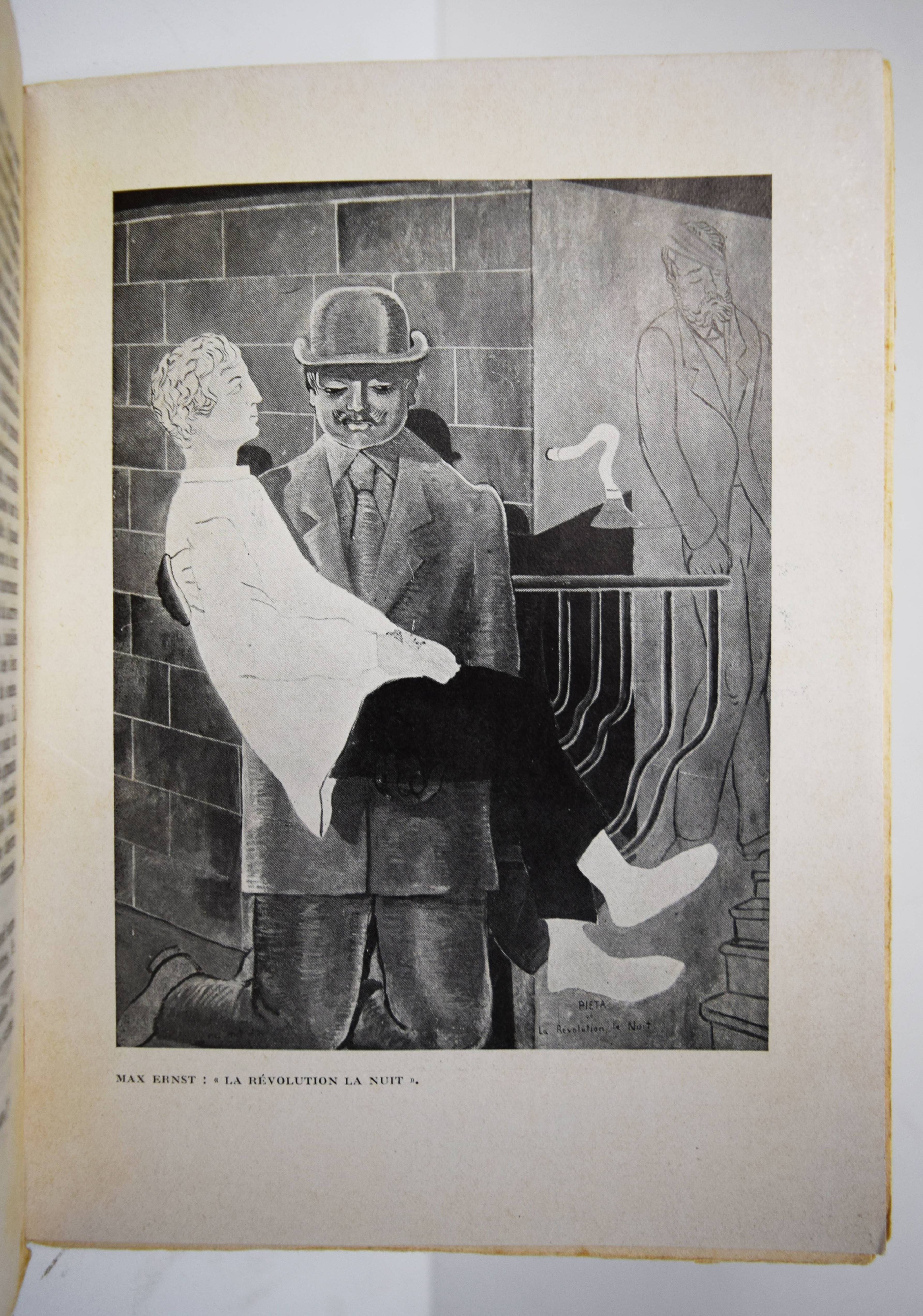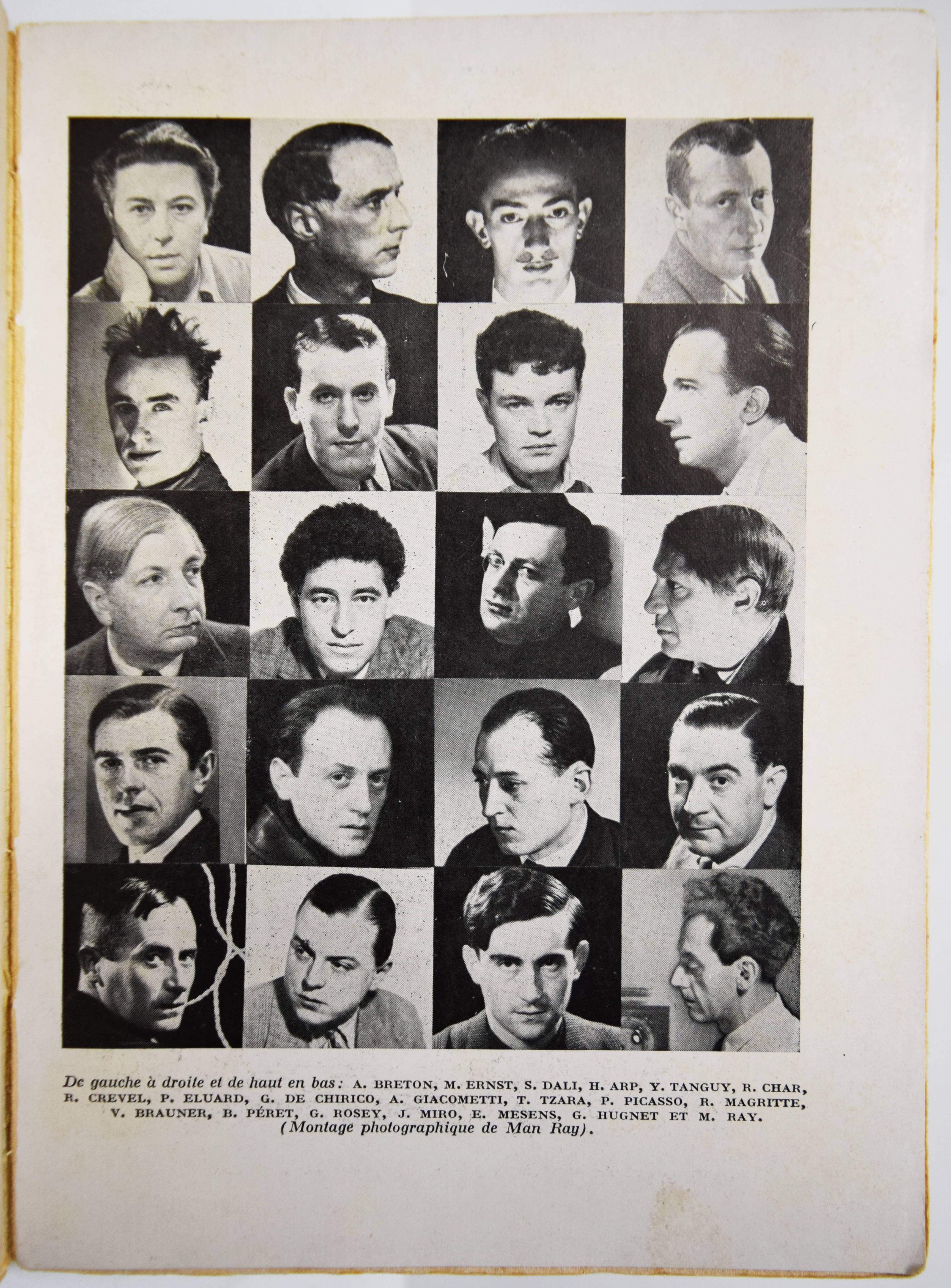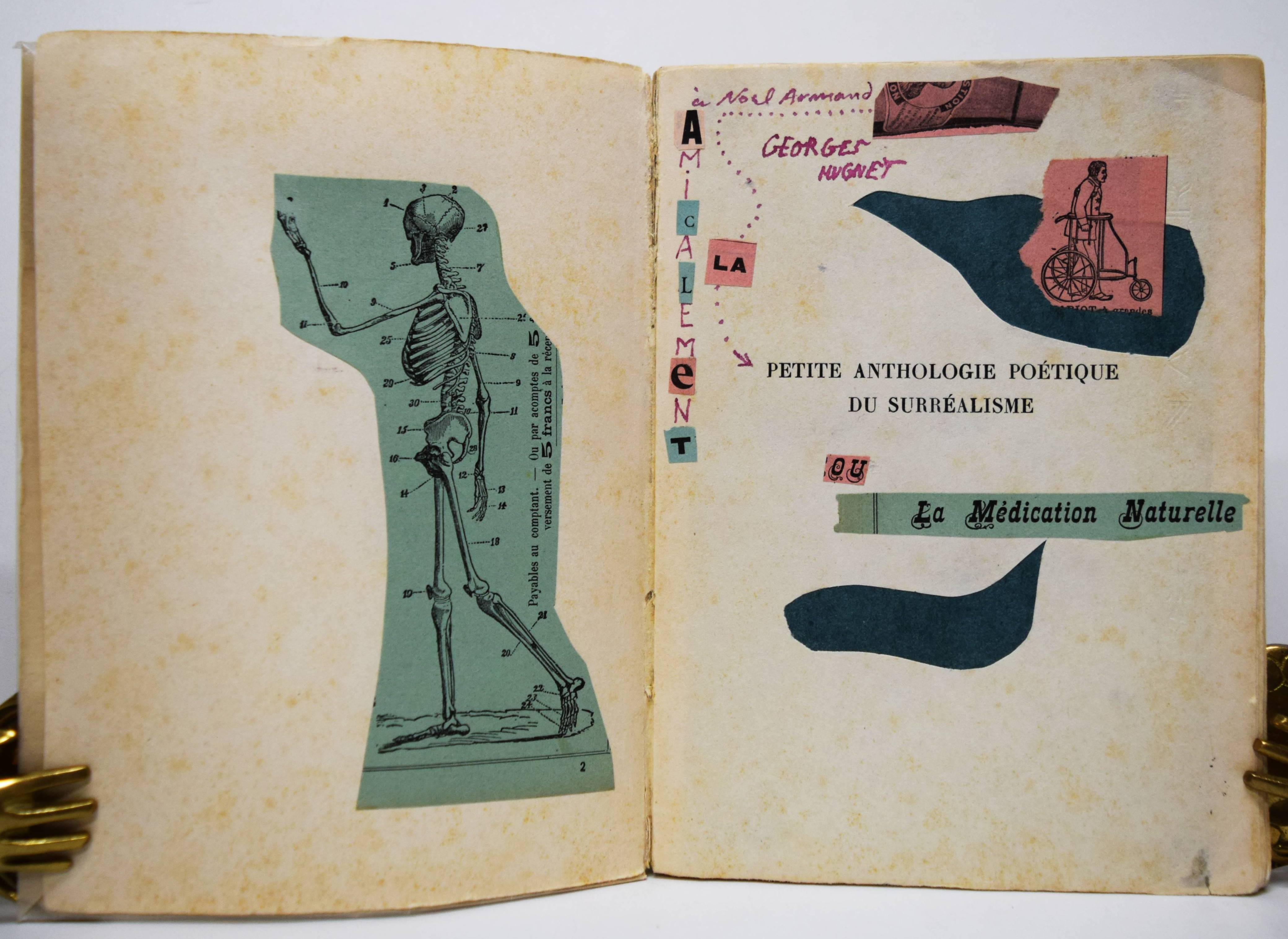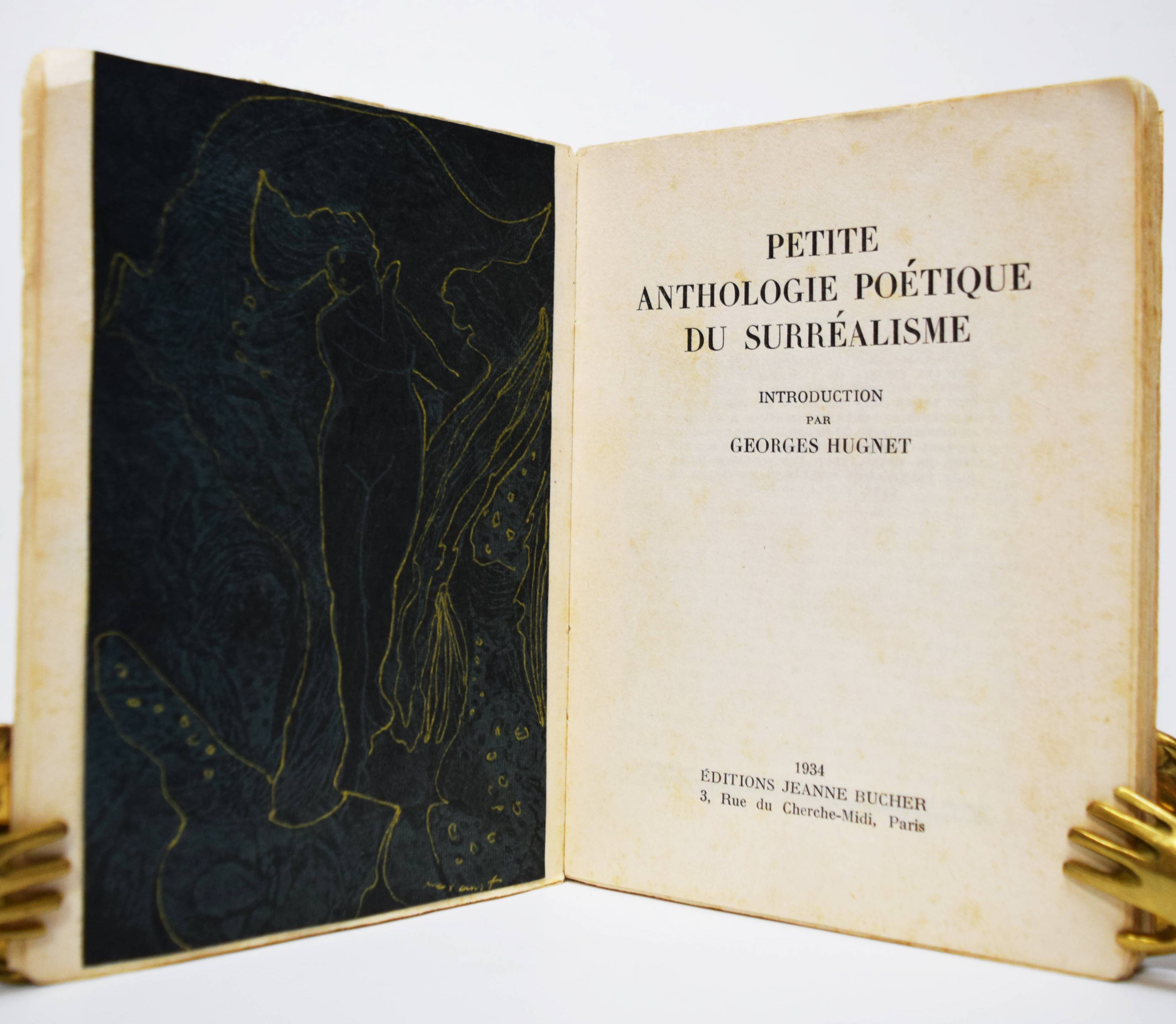 Hugnet, George (Edition). Petite anthologie poétique du surréalisme. Introduction par Georges Hugnet. Paris, Éditions Jeanne Bucher 1934. 8°. 166 p. avec 16 planches, 1 collage par G. Hugnet et 1 photogramme par Max Ernst. Broche, couverture imprimée. Première édition, l’un des 2000 exemplaires sur papier Alfa Bouffant. – Avec dédicace manuscrite et collage original de G. Hugnet pour Noël Armand, ainsi qu’un photogramme retravaillé à l’or et signé par Max Ernst. Avec ex-libris pour Noël Armand par René Magritte. – Avec des contributions (textes et illustrations) de H. Arp, A. Breton, S. Dali, M. Duchamp, Max Ernst, P. Picasso, Man Ray et autres. – Légèrement taché de brun par endroits, sinon en bon état.