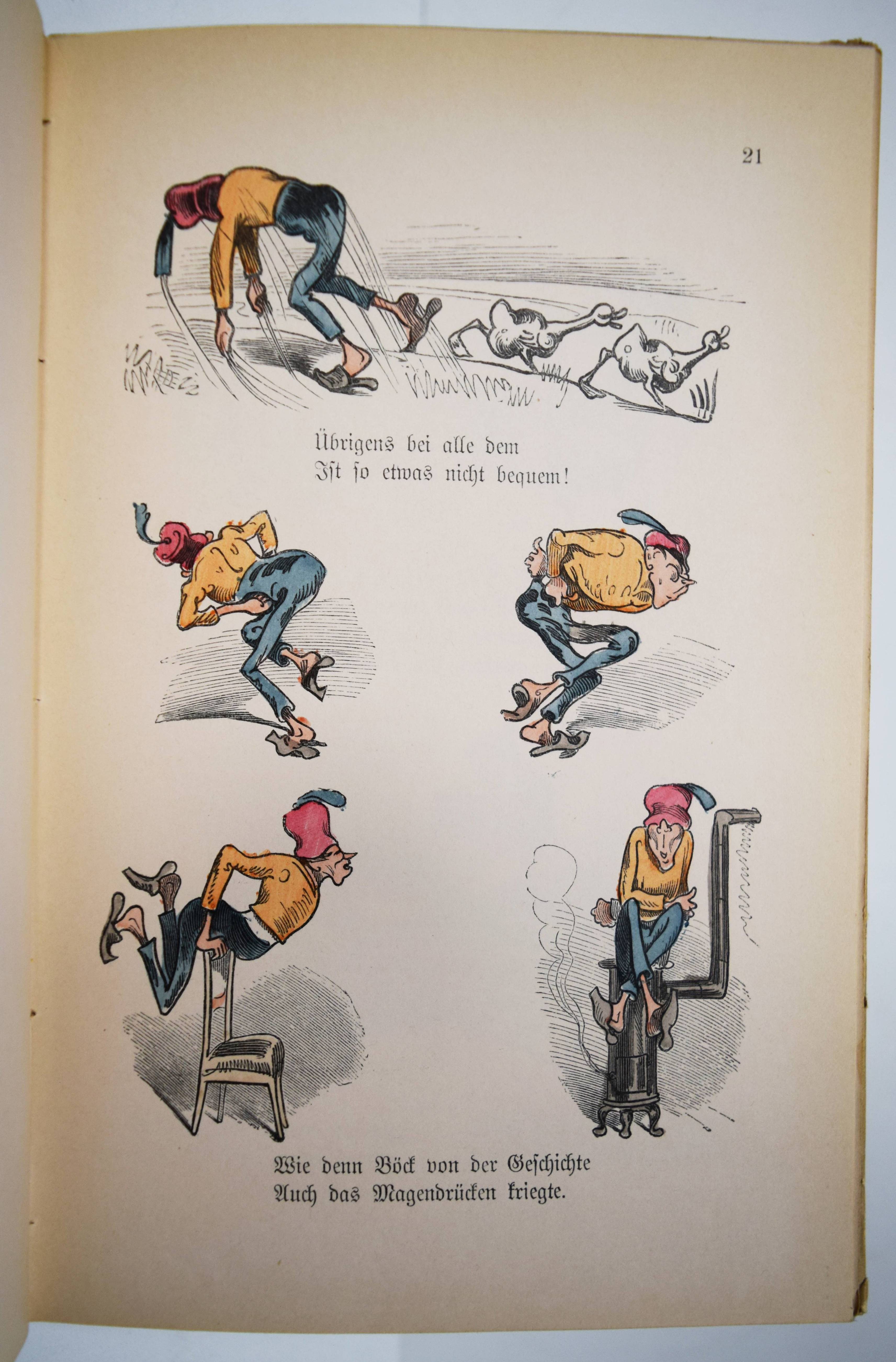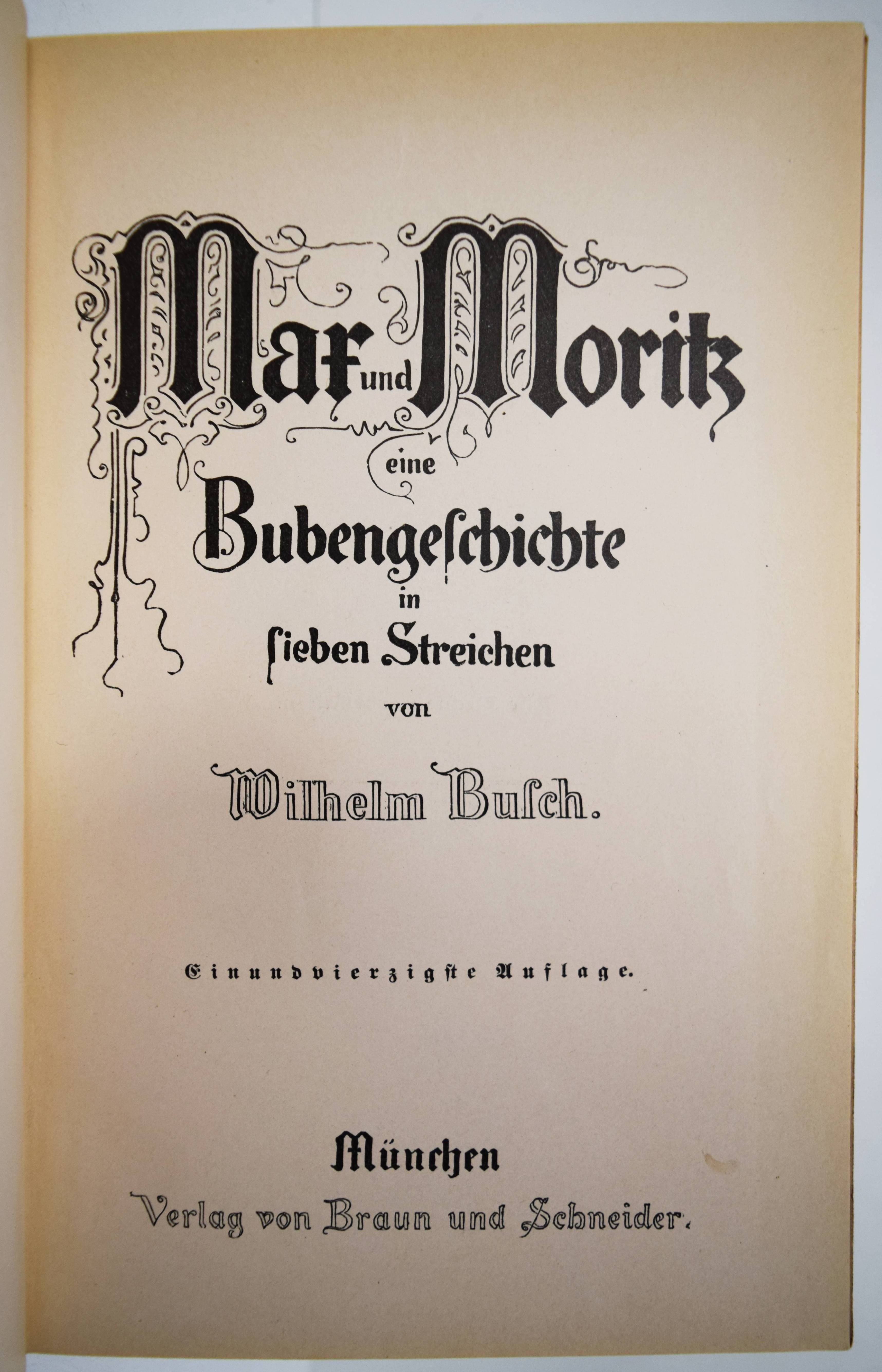 Busch, Wilhelm. Max und Moritz eine Bubengeschichte in sieben Streichen. 41. Auflage. München, Braun und Schneider o. J. (1899). 8°. 53 S. mit handkol. Illustrationen in Strichätzung. Typogr. Orig.-Pappband. Liebert, Busch 143. – Einband geringfügig berieben und angestaubt, sehr gutes sauberes Exemplar.