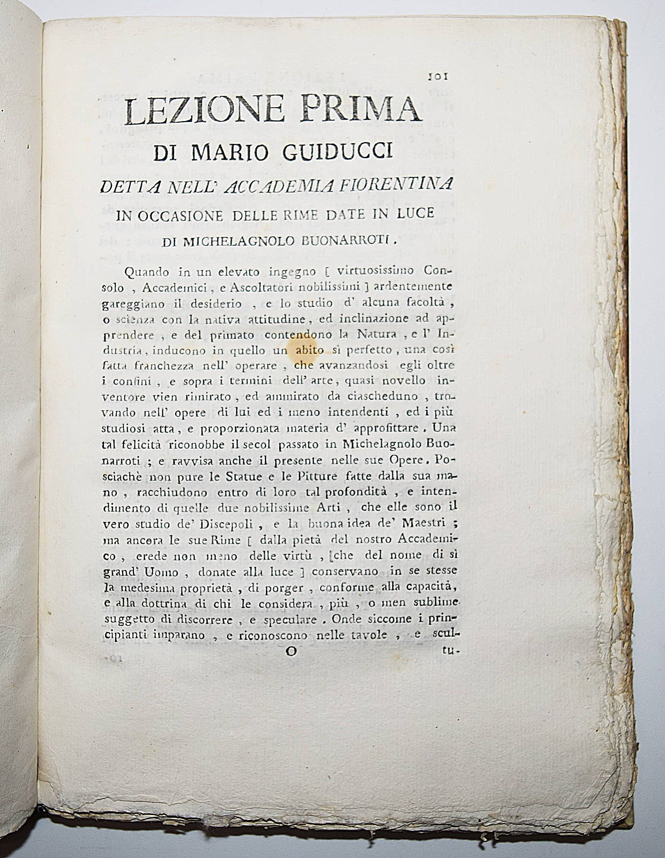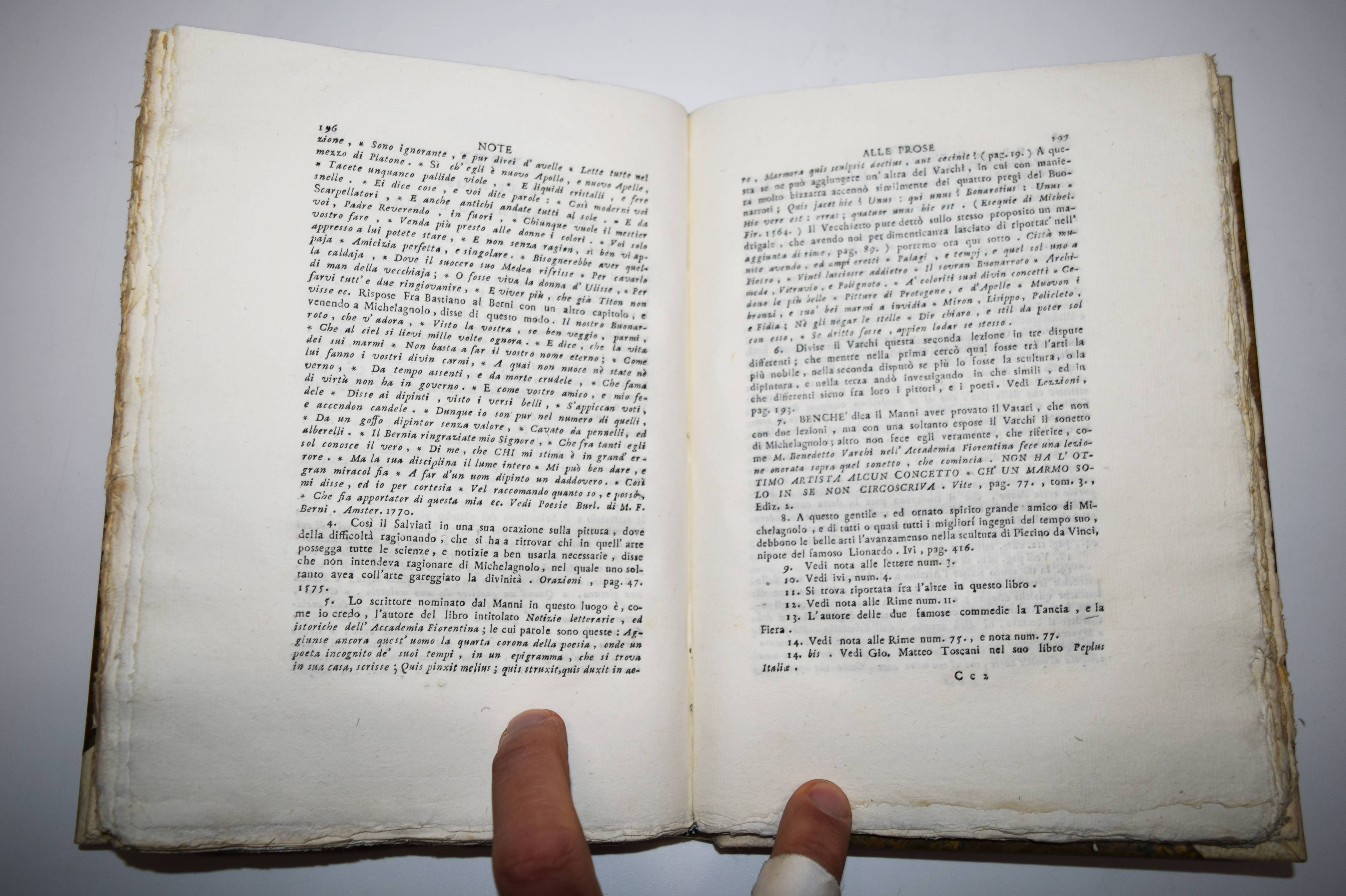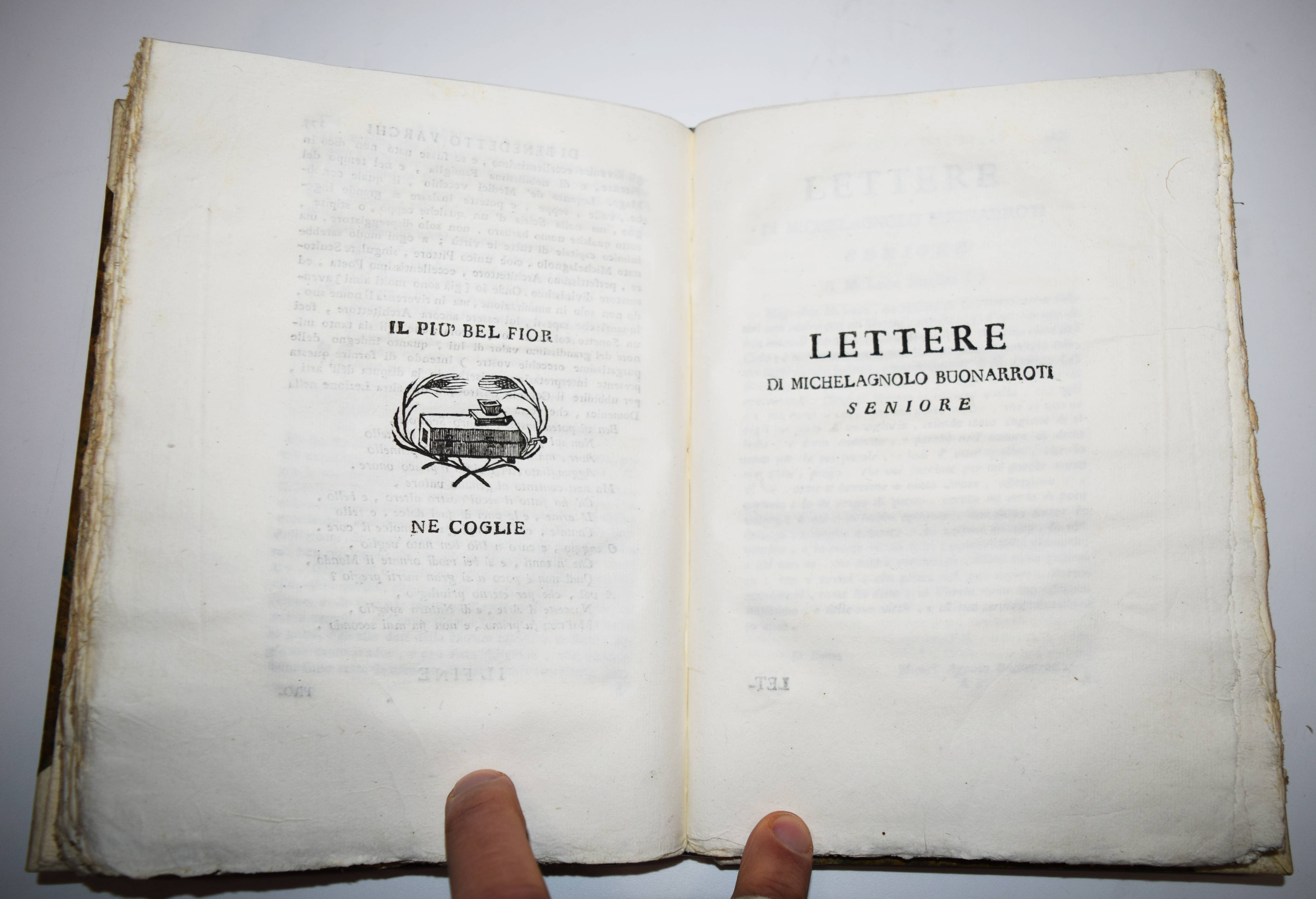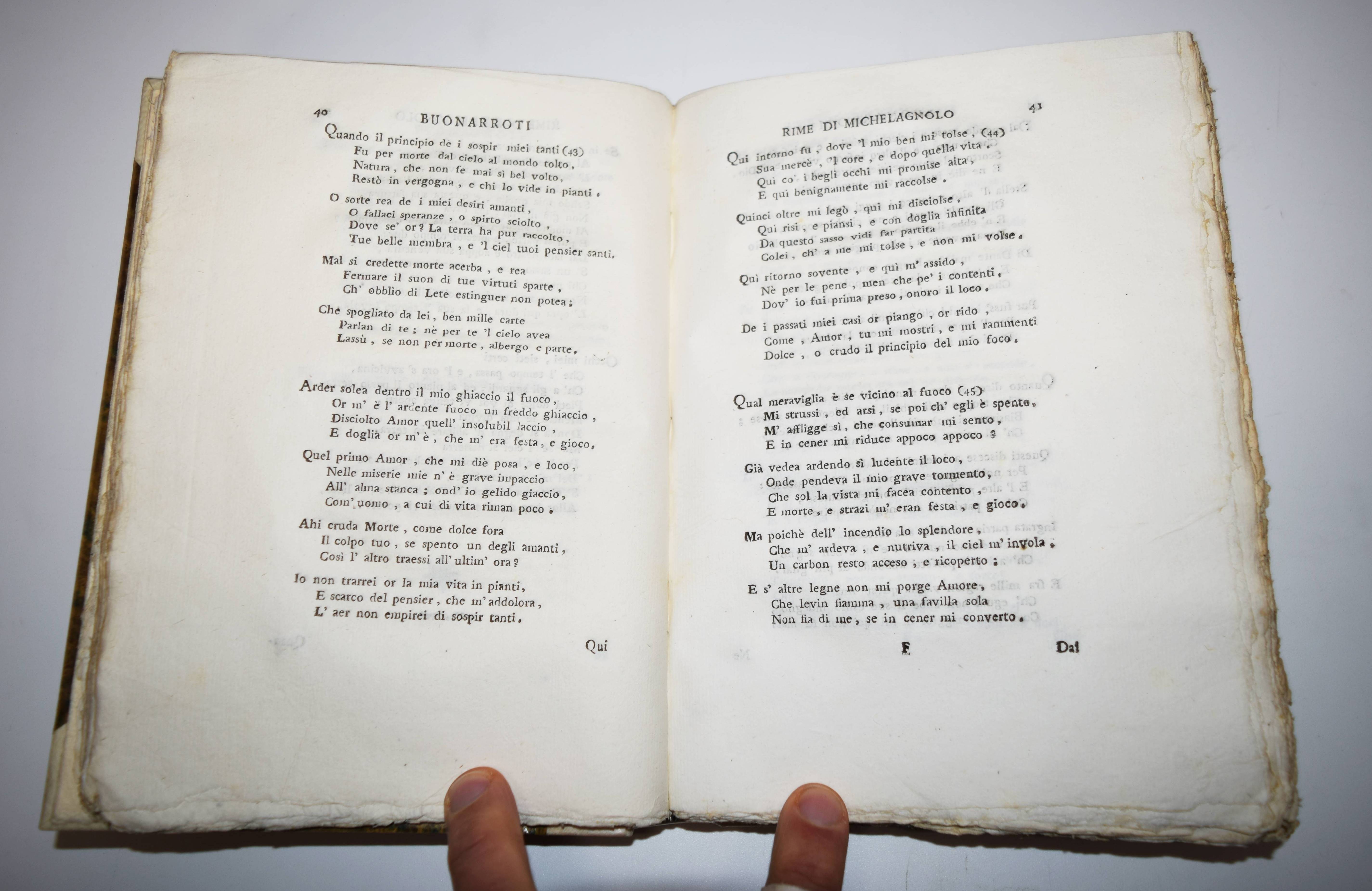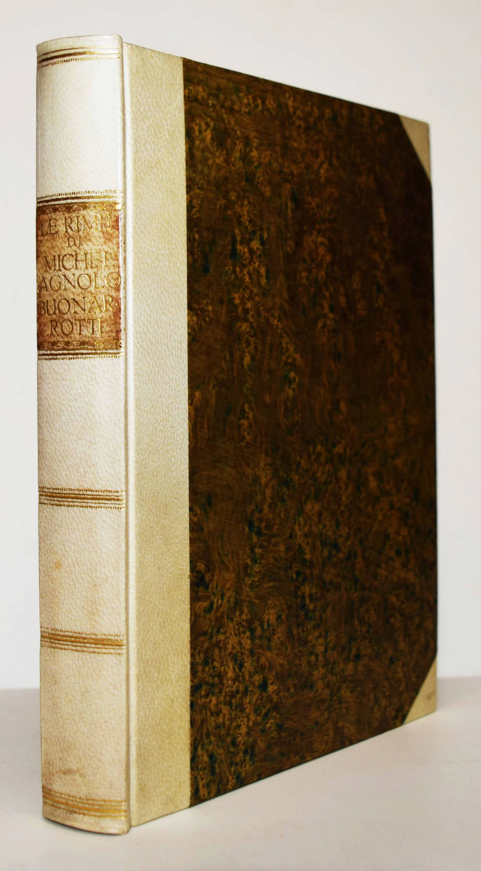 Michelangelo Buonarroti. Le rime di Michelagnolo Buonarroti, pittore, scultore, architetto e poeta fiorentino. Testo di lingua italiana. Roma, Fr. Philippus Anfossi Sacri Palatii Apostoliei Magister 1817. Gr.-8° (23 x 16,5 cm.). XVI, 264, (2) p. with title vignette in woodcut (device of the Accademia della Crusca). Modern half-parchment binding with stamped spine label and gilt lines. Gamba, Testi di lingua 250: „È ricopiata l’edizione 1726, e sono al fine Rime inedite tolte da un codice vaticano. L’editore anonimo è stato Alessandro Maggiori.“ – „Lettere di Michelagnolo Buonarroti“ (p. 179-193). – „Lezione terza detta nell’ Accademia fiorentina da Benedetto Varchi sopra il primo sonetto di Michelagnolo Buonarroti“ (p. 135-177). – „Lezione prima-[seconda] di Mario Guiducci detta nell’ Accademia fiorentian in occasione delle Rime datein luce di Michelagnola Buonarotti“ (p. 101-134). – Very good and clean copy, untrimmed on the sides and bottom.