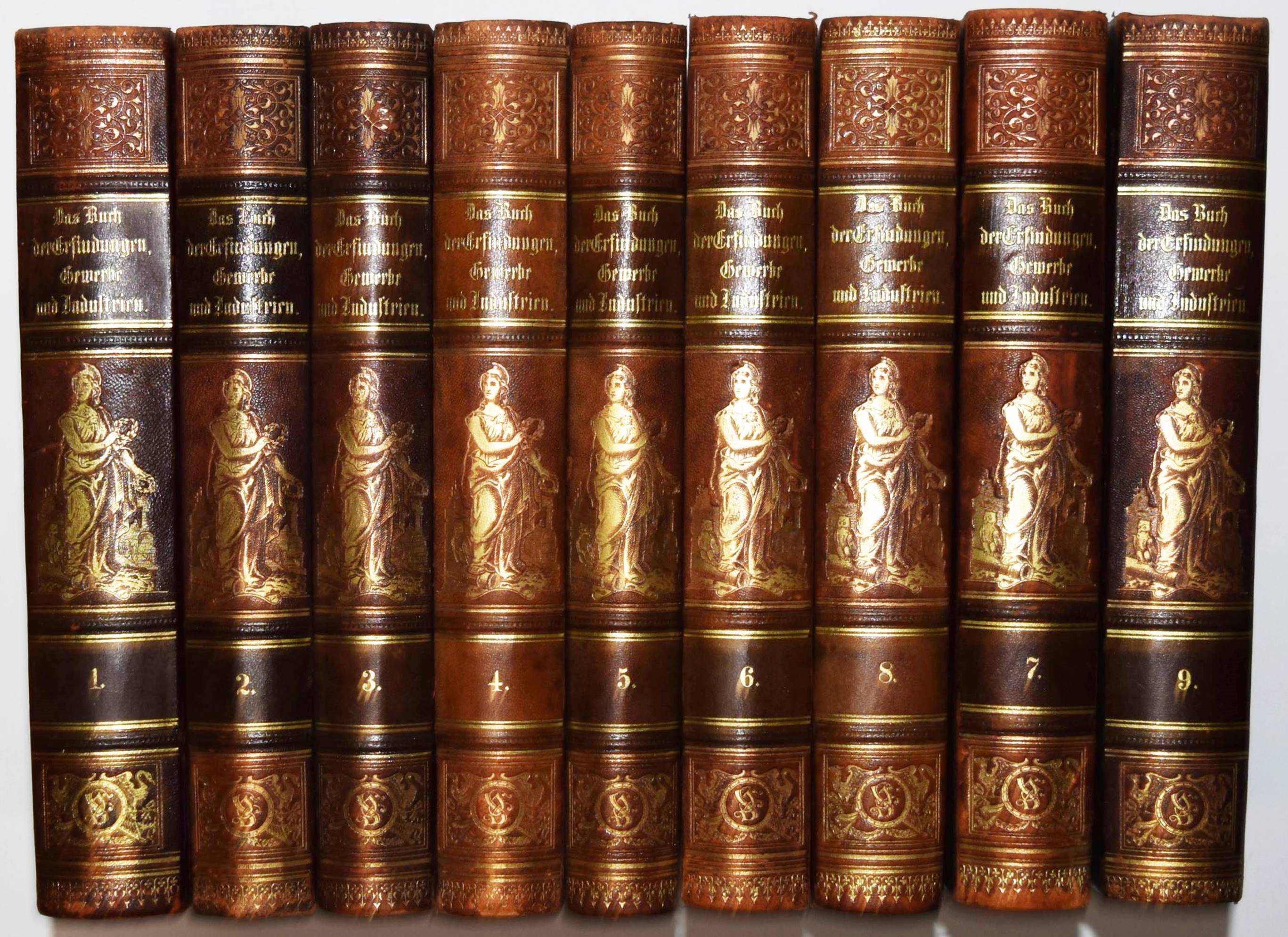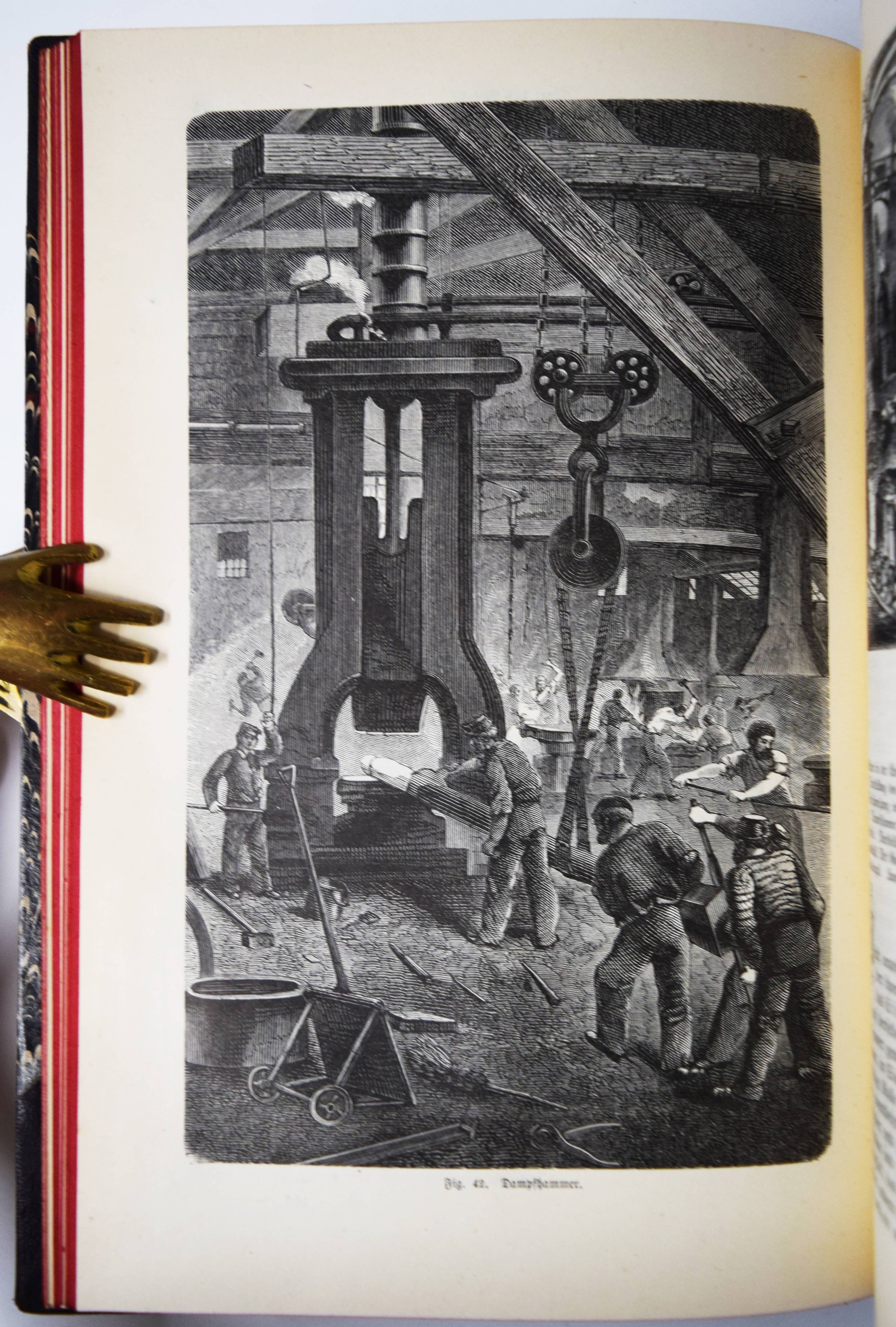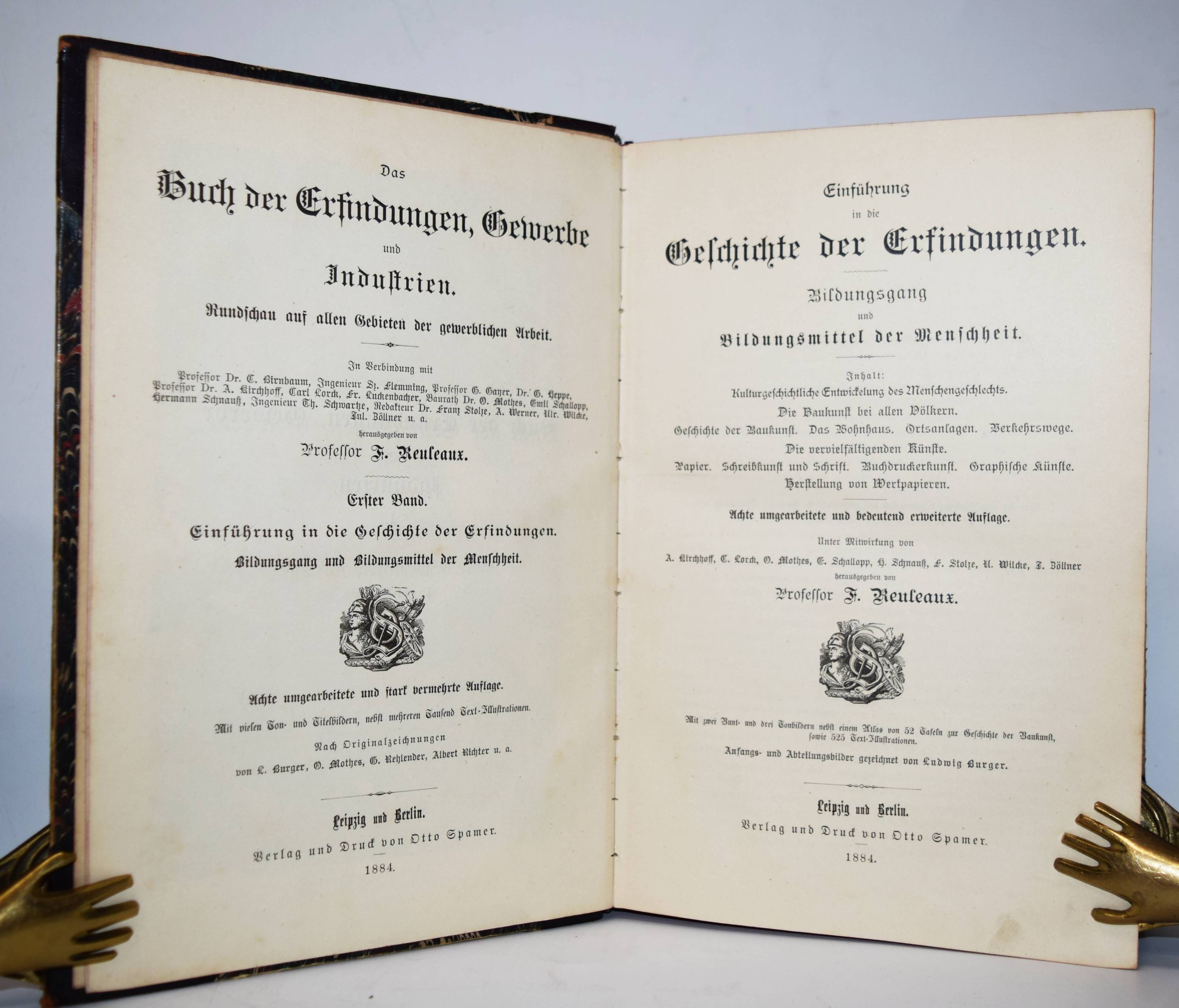Reuleaux, F. (Hrsg.). Das Buch der Erfindungen, Gewerbe und Industrien. Rundschau auf allen Gebieten der gewerblichen Arbeit. Pracht-Ausgabe. 8. umgearbeitete und bedeutend erweiterte Auflage. 9 Bände. Leipzig und Berlin, Otto Spamer 1884-1893. Gr.-8°. Mit zahlr., teils chromolithogr. doppelblattgr. und gefalt. Tafeln sowie zahlreichen Abbildungen in Holzstich. Orig.-Halblederbände mit figürl. Rückenvergoldung. I. Einführung in die Geschichte der Erfindungen: Bildungsgang und Bildungsmittel der Menschheit. – II. Die Kräfte der Natur und ihre Bedeutung, Physikalische Technologie. – III. Die Gewinnung der Rohstoffe aus dem Innern der Erde, von der Erdoberfläche sowie aus dem Wasser. – IV. Die chemische Behandlung der Rohstoffe. Eine chemische Technologie. – V. Die Chemie des täglichen Lebens. – VI. Die mechanische Bearbeitung der Rohstoffe. – VII und VIII. Der Weltverkehr und seine Mittel. – IX. Die Elektrizität, ihre Erzeugung und ihre Anwendung in Industrie und Gewerbe. – Einbände etwas berieben, stellenweise etwas finger- und braunfleckig, sonst gutes Exemplar der deokorativ gebundenen Pracht-Ausgabe.