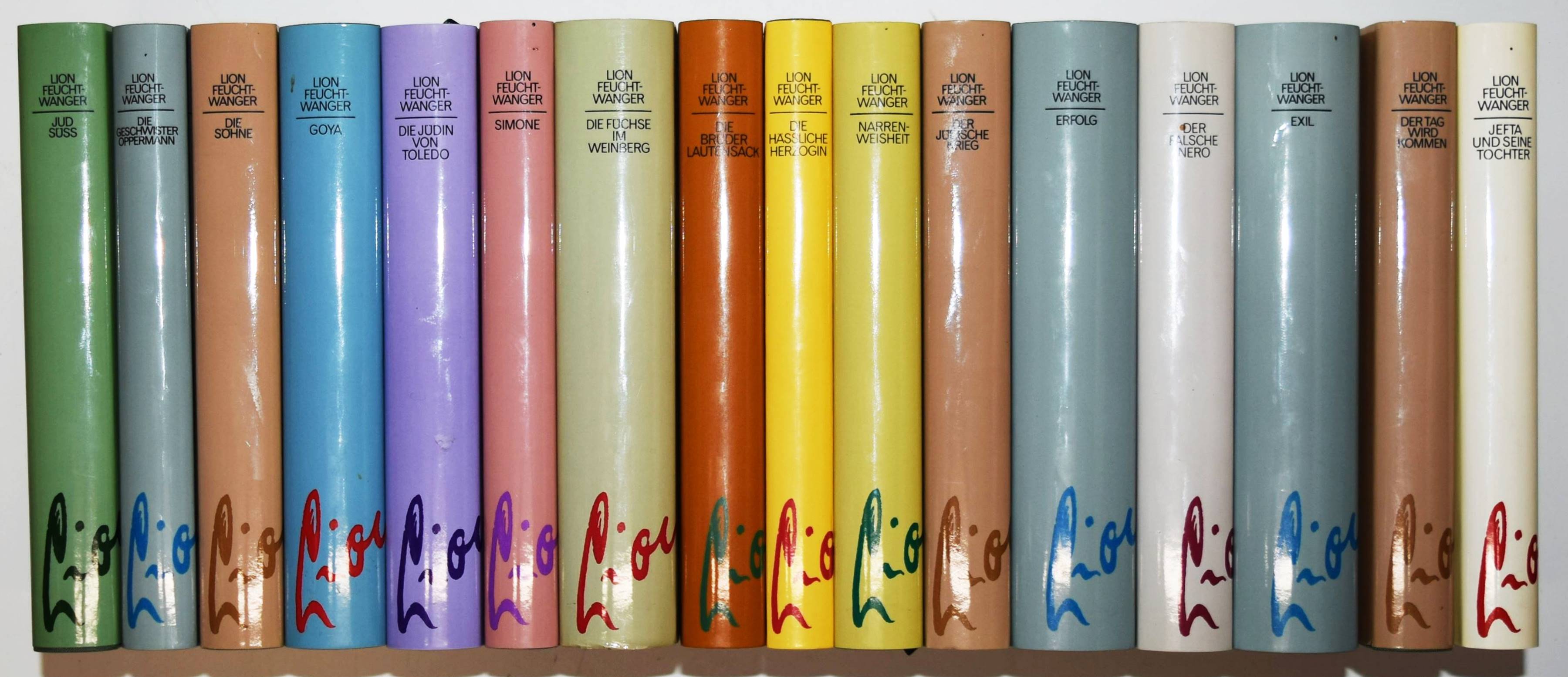 Feuchtwanger, Lion. Gesammelte Werke in Einzelausgaben. 16 Bände. Berlin und Weimar, Aufbau-Verlag 1991-1995. 8°. Orig.-Leinenbände mit typogr. Schutzumschlägen (von Josef Zeisz). I. Jud Süß. Roman. – II. Der Jüdische Krieg. Roman. – III. Die Söhne. Roman. – IV. Der Tag wird kommen. Roman. – V. Die hässliche Herzogin. Roman. – VI. Erfolg. Drei Jahre Geschichte einer Provinz. Roman. – VII. Die Geschwister Oppermann. Roman. – VIII. Exil. Roman. – IX. Der falsche Nero. Roman. – X. Die Brüder Lautensack. Roman. – XI. Simone. Roman. – XII. Die Füchse im Weinberg. Roman. – XIII. Goya oder Der arge Weg der Erkenntnis. Roman. – XIV. Narrenweisheit oder Tod und Verklärung des Jean-Jacques Rousseau. Roman. – XV. Die Jüdin von Toledo. Roman. – XVI. Jefta und seine Tochter. Roman. – Neuwertiges ungelesenes Exemplar.