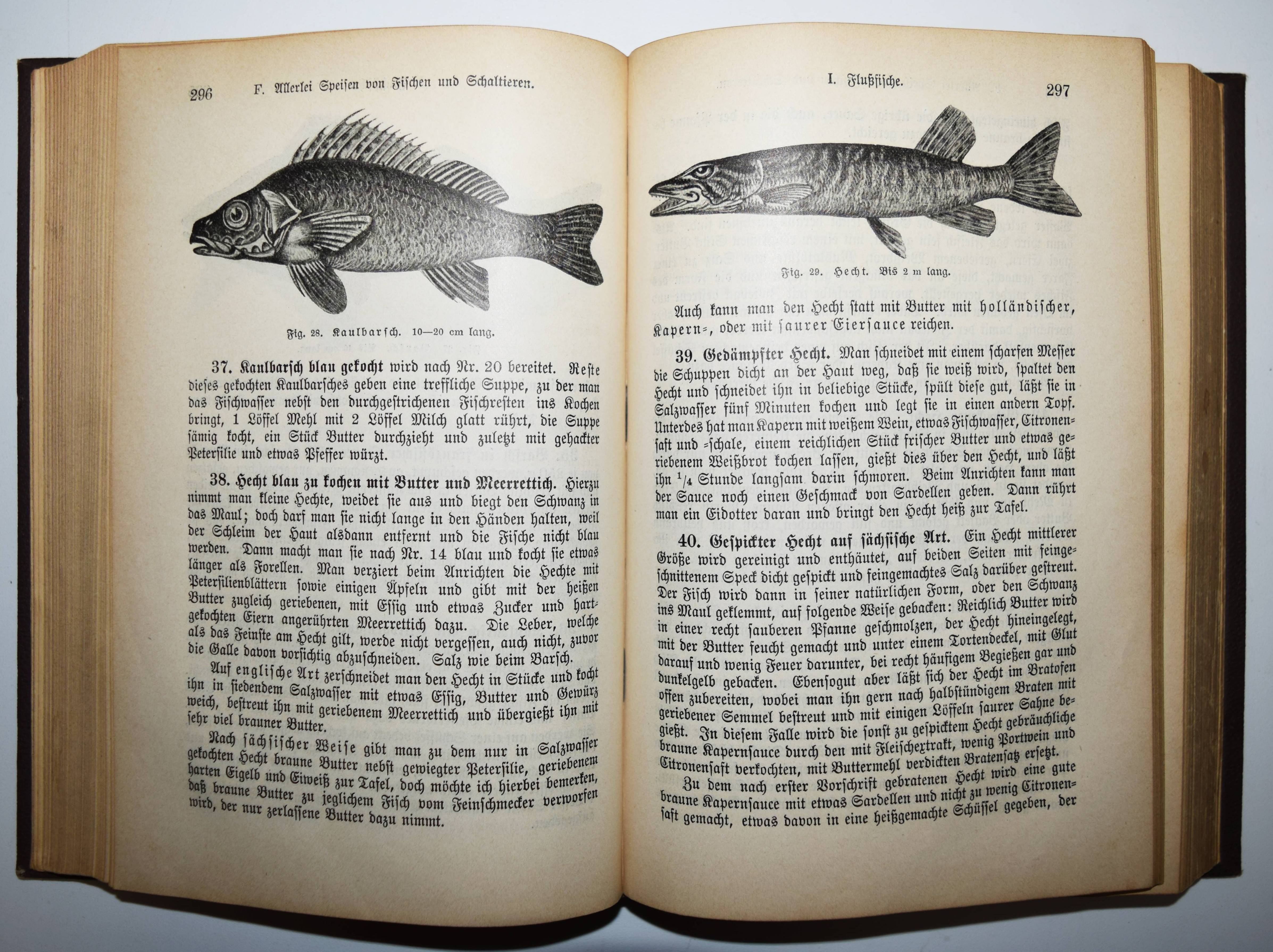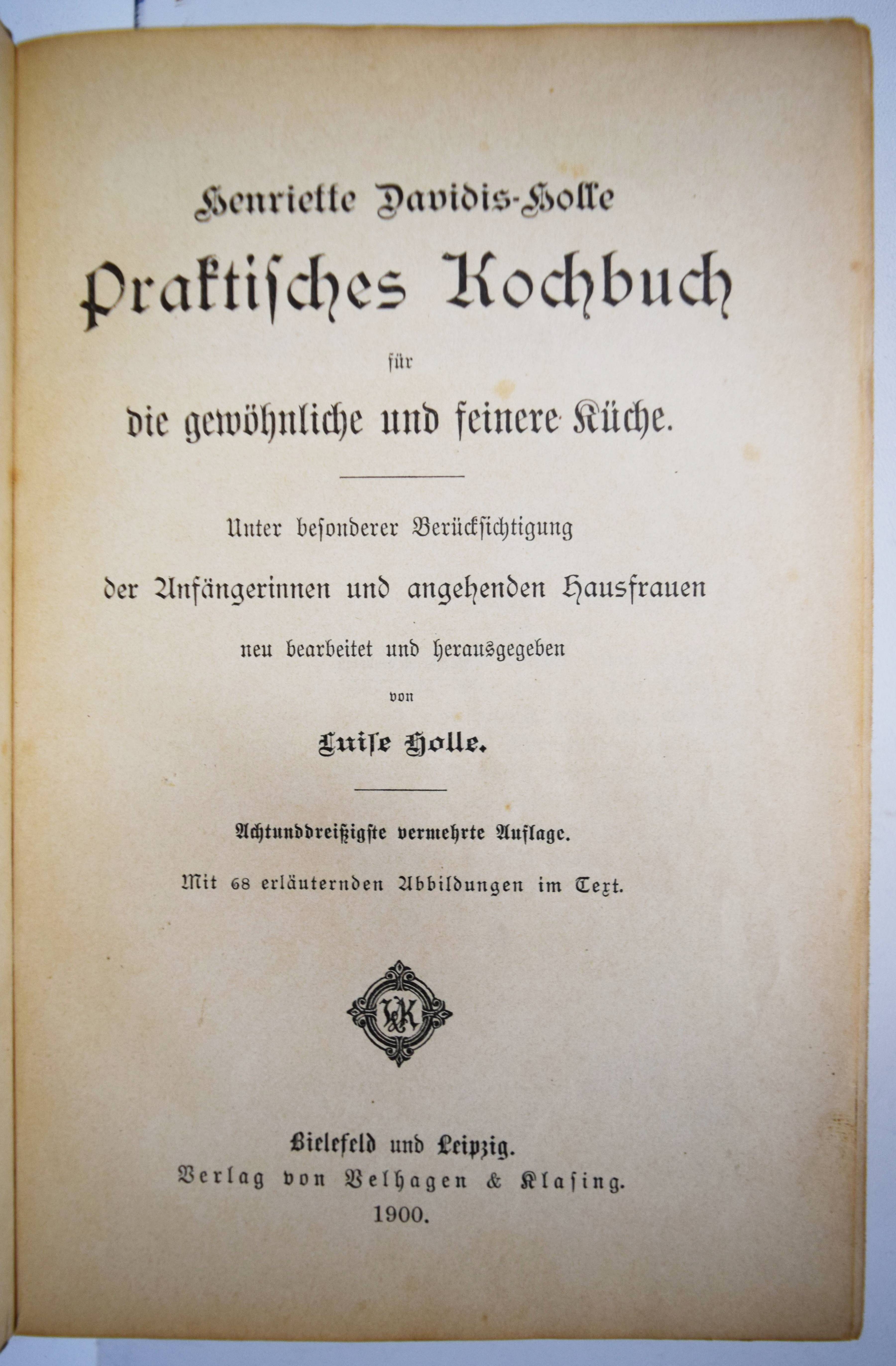 Davidis, Henriette. Praktisches Kochbuch für die gewöhnliche und feinere Küche. Unter besonderer Berücksichtigung der Anfängerinnen und angehenden Hausfrauen neu bearbeitet und herausgegeben von Luise Holle. 38. verm. Aufl. Bielefeld und Leipzig, Velhagen & Klasing 1900. 8°. LVI, 796 S., [3] Bl. mit 68 Abbildungen im Text. Farbig illustr. Orig.-Leinenband mit goldgepr. Rücken- und Deckeltitel. Methler 183. Weiss 694. – Sehr gutes Exemplar des Kochbuch-Klassikers.