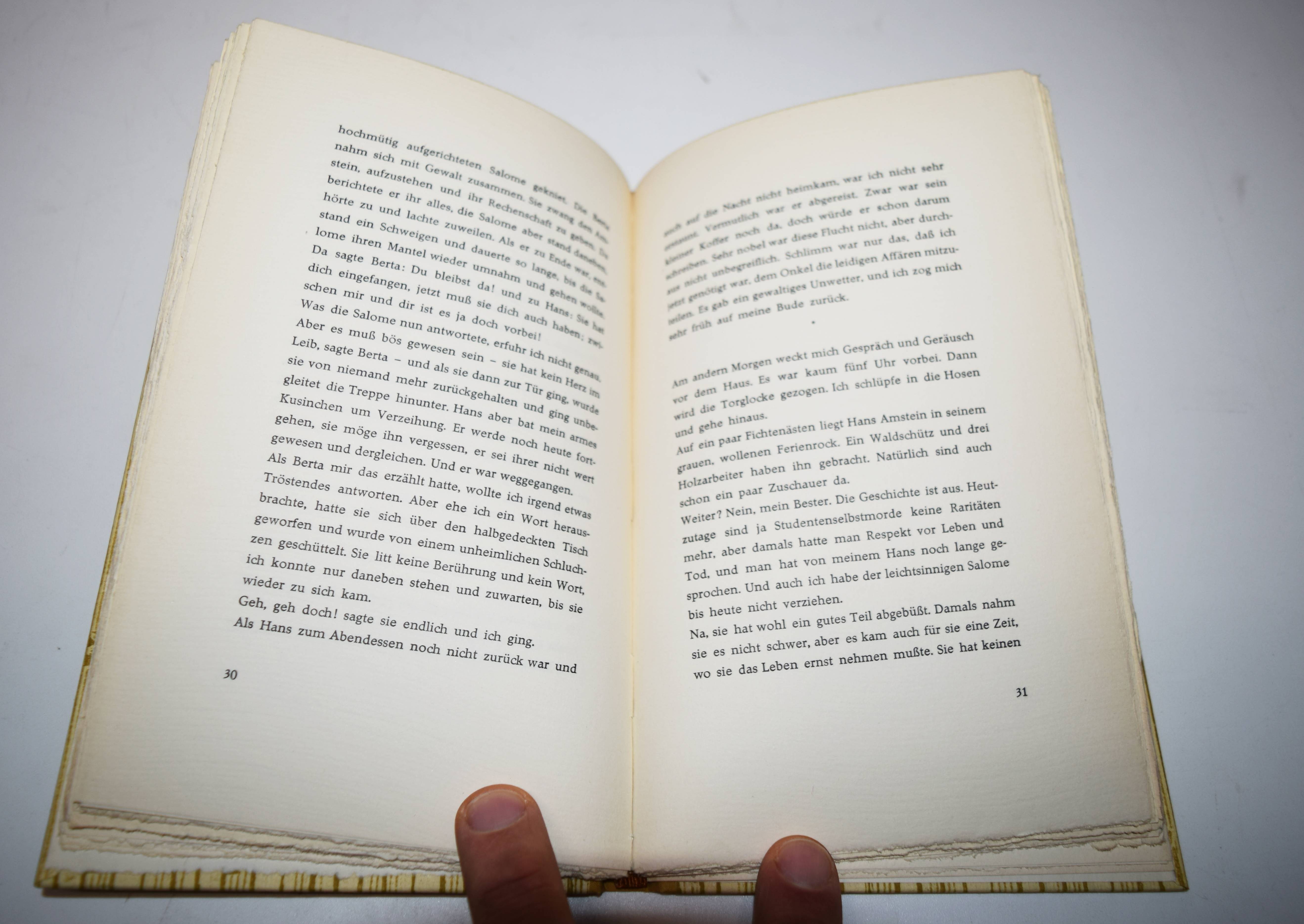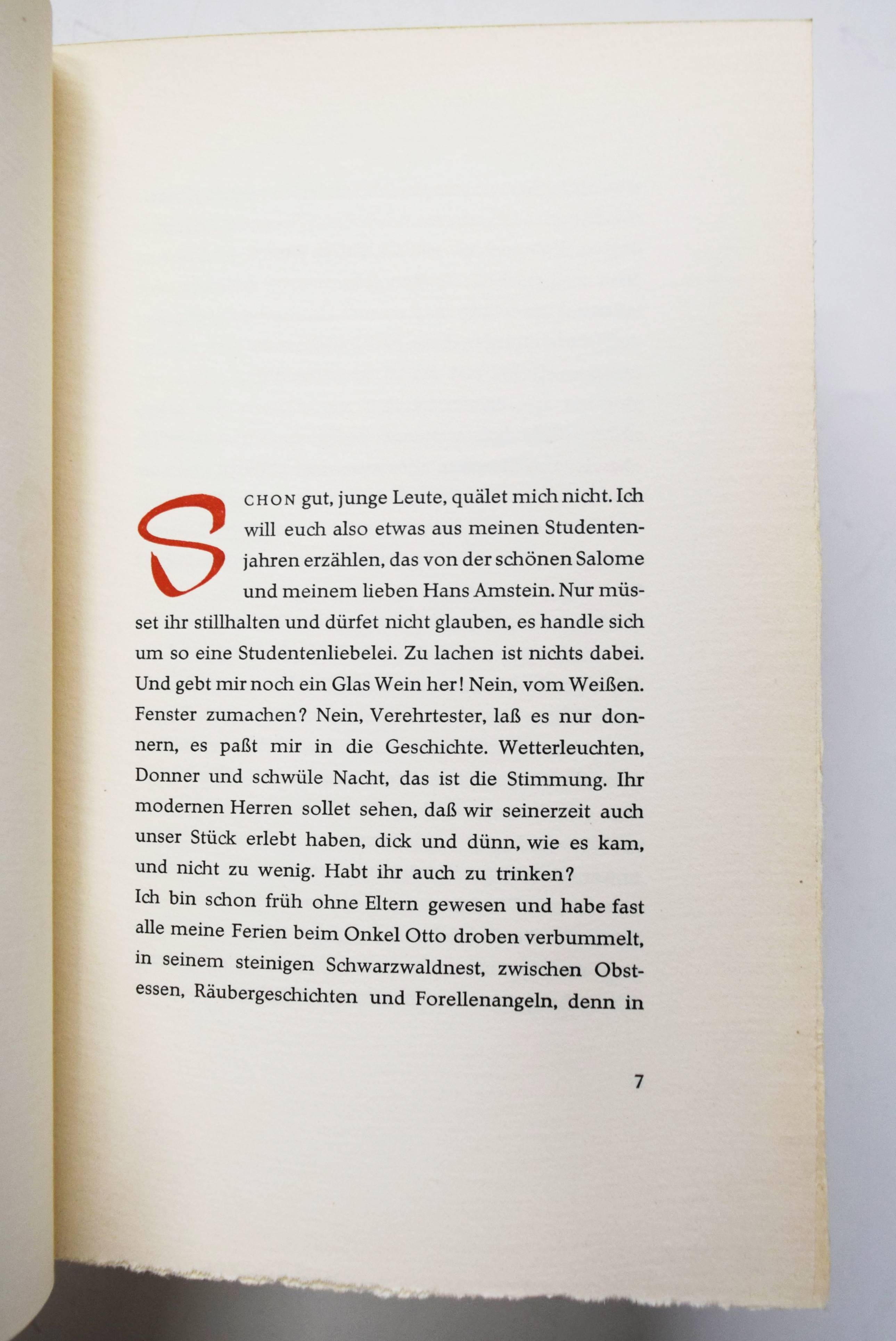 Hesse, Hermann. Zwei jugendliche Erzählungen. Olten, Vereinigung Oltner Bücherfreunde (1956). 8°. 56 S. Orig.-Pappband mit Überzugspapier in Batikmodelldruck von Emil Kretz, Basel. (Publikation der Vereinigung Oltner Bücherfreunde, Band 70). Mileck II, 121. Waibler E 54. W.-G.² 469. – Erste Ausgabe. – Eines von 574 num. Exemplaren (Gesamtauflage 750 Exemplare). – Sehr gutes Exemplar.