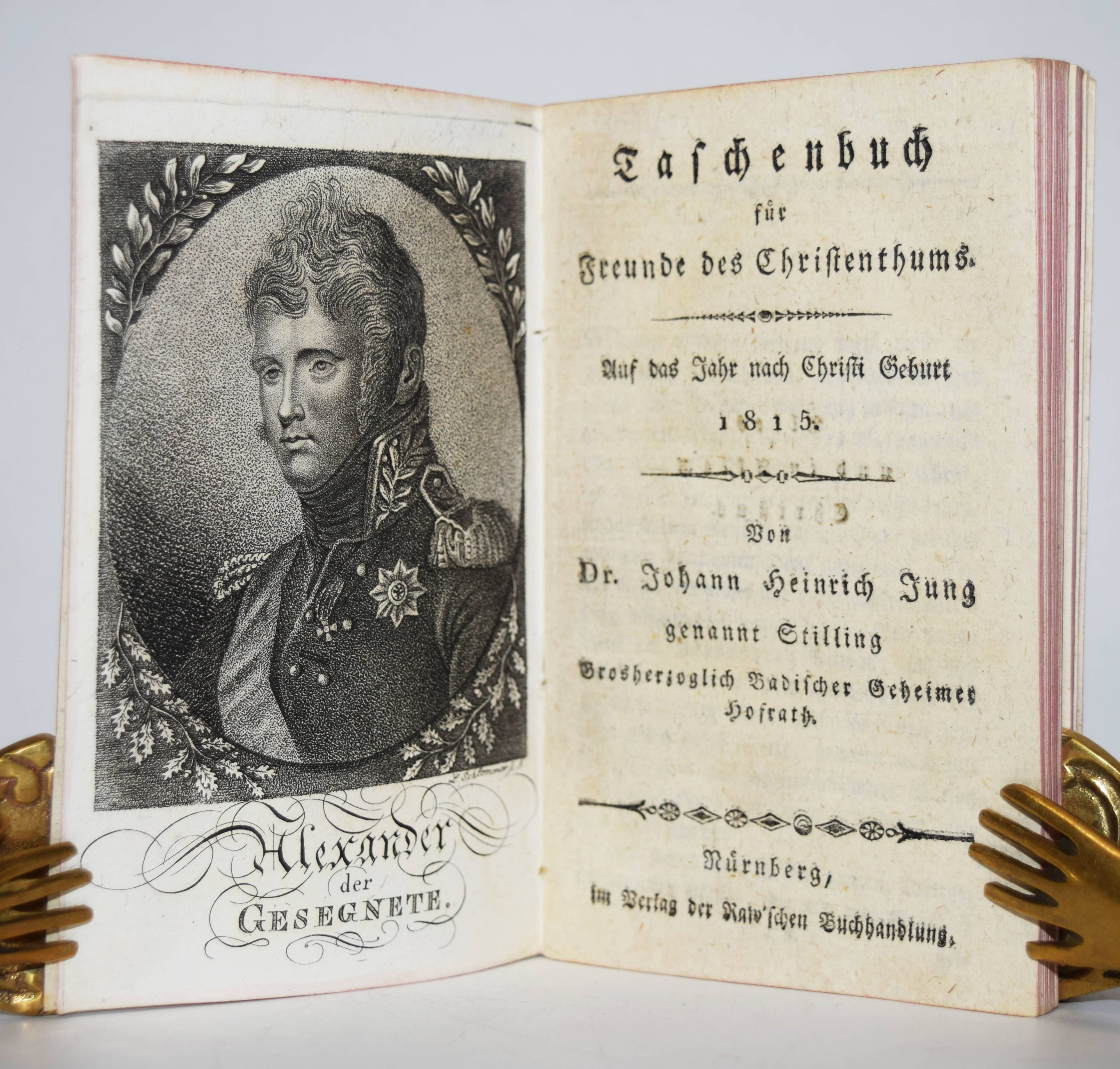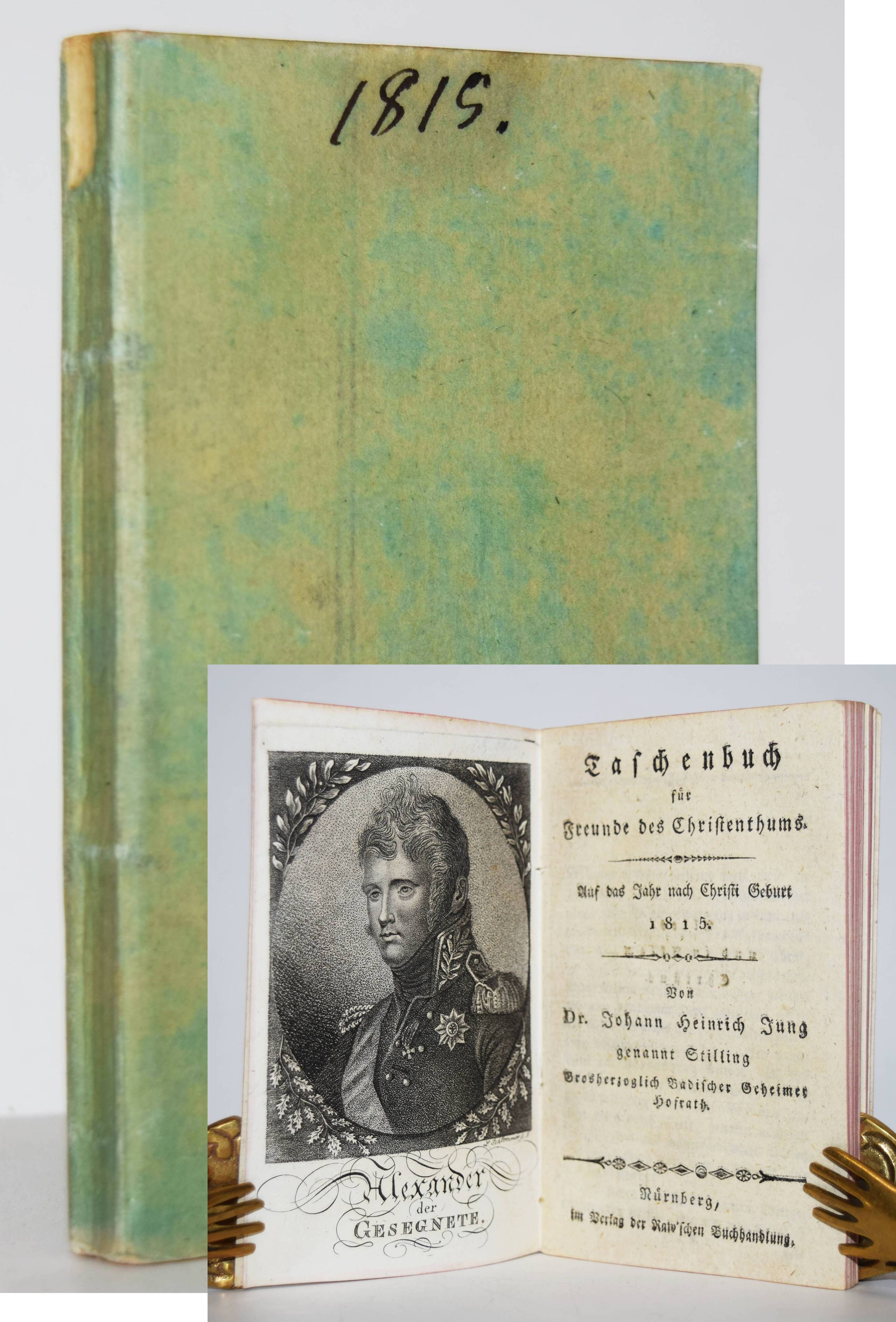 Almanach – Jung-Stilling, Johann Heinrich. Taschenbuch für Freunde des Christenthums. Auf das Jahr nach Christi Geburt 1815. Nürnberg, Raw (1814). 12° (12,5 x 7,5 cm.). 177 S. mit gestoch. Frontispiz (″Alexander der Gesegnete“) nach L(eonhard) Schlemmer. Hellgrüner Pappband der Zeit. Goed. IV/1. 690, 4, 16. Köhring 118. Lanckoronska/Rümann 177. Musenalm 2820. Schulte-Strathaus 36. W.-G.² 56. – Seltener Almanach mit Rätseln, Sprüchen und Dichtungen von J. H. Jung-Stilling (1740-1817). – Von 1805 bis 1816 erschienen zwölf Jahrgänge. – Umschlag etwas aufgehellt, Vorderdeckel mit handschr. Jahresangabe, sehr gutes sauberes Exemplar.