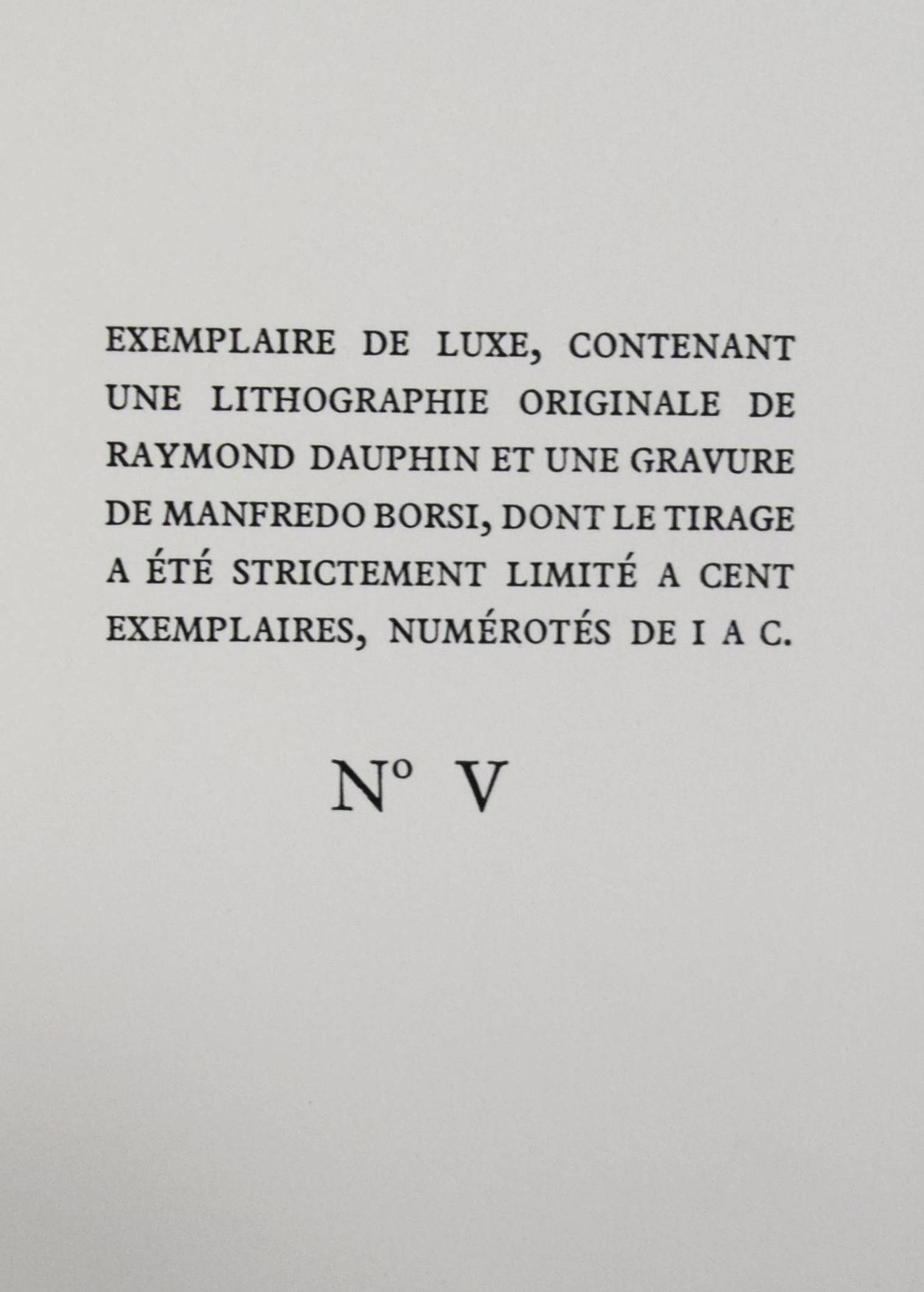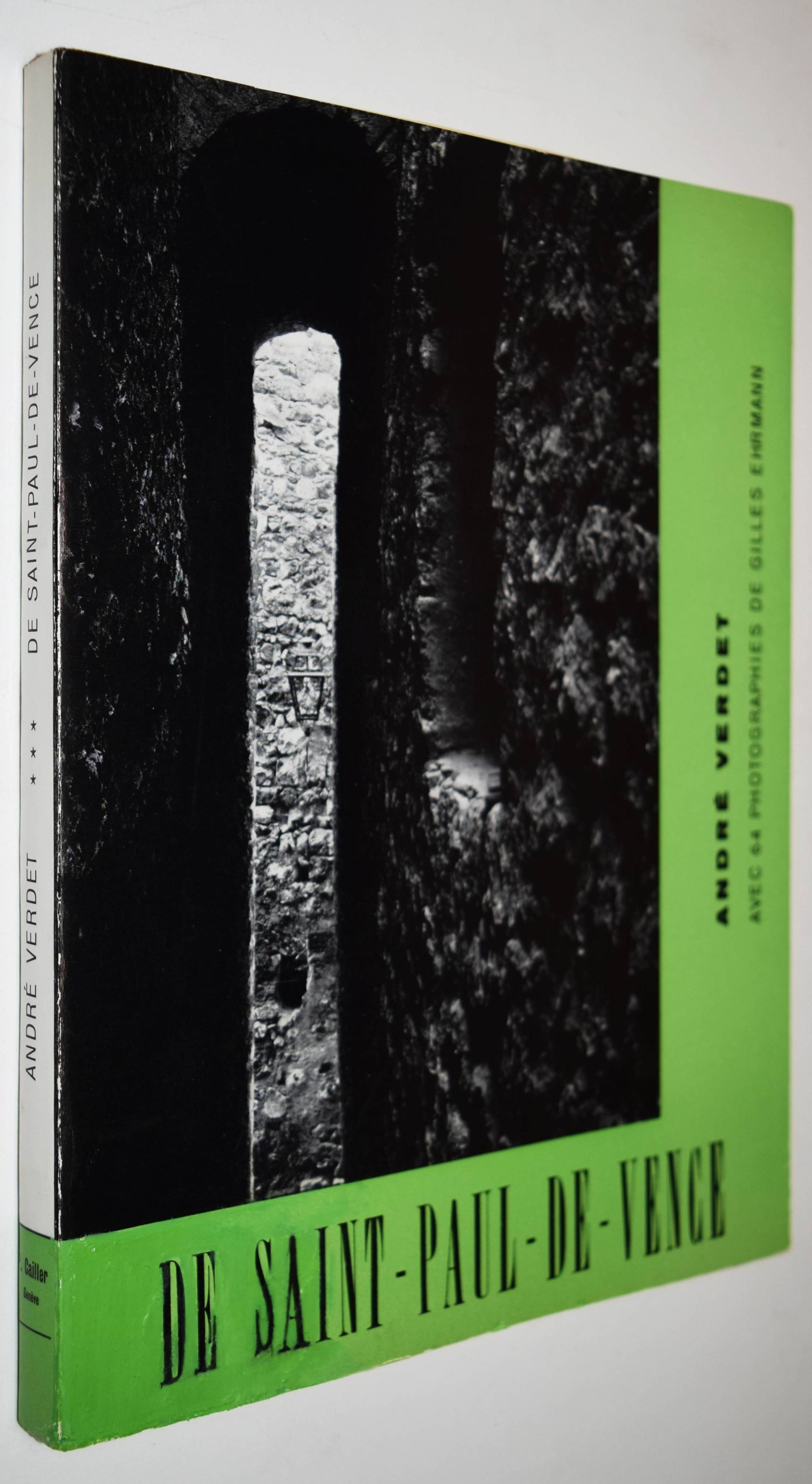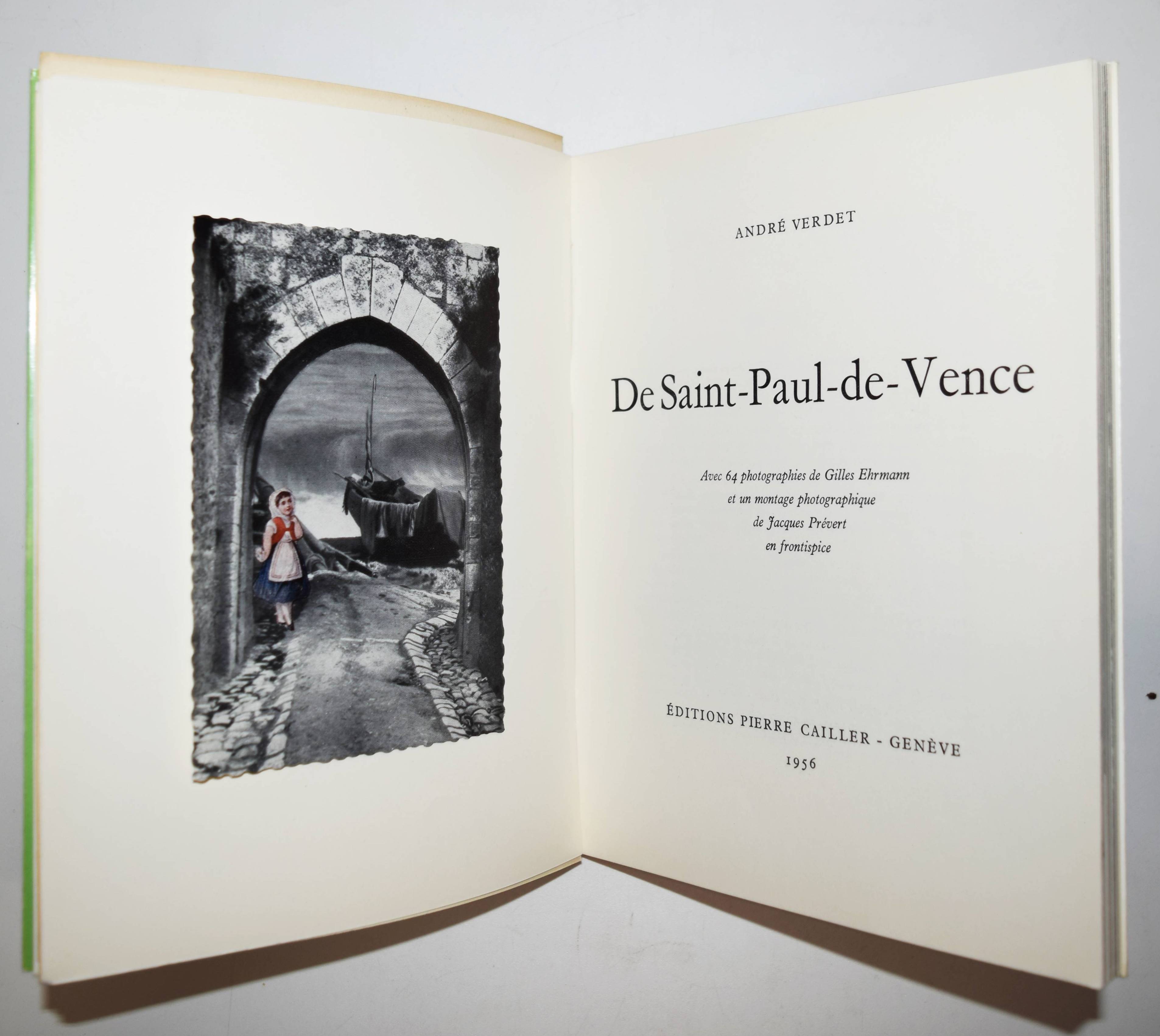 Ehrmann – Verdet, André. Saint Paul de Vence. Avec 64 photographies de Gilles Ehrmann et un montage photographique de Jacques Prévert en frontispice. Genève (Genf), Éditions Pierre Cailler 1956. 8°. 84 S. mit Frontispiz, 64 Tafeln u. 1 signierten Orig.-Lithographie von Raymond Dauphin u. 1 Orig.-Radierung von Manfredo Borsi. Illustr. Orig.-Kartonumschlag. Erste Ausgabe. – Nr. V von 100 Exemplaren der Vorzugsausgabe mit 2 (1 sign. und num.) Orig.-Graphiken. – Der franz. Schauspieler und Fotograf G. Ehrmann (1928-2005) studierte 1946 bis 1949 an der École nationale supérieure des arts décoratifs in Paris und gründete die Avantgarde-Theatergruppe „Ceux-là“. Während dieser Zeit lernte er auch einige Vertreter des Surrealismus kennen. 1950 begann er zu fotografieren. Er porträtierte Chagall, Picasso und andere Künstler und lernte den Schriftsteller, Maler und Bildhauer Anré Verdet (1913-2004) kennen. – A. Verdet war mit vielen bedeutenden Malern (Georges Braque, Marc Chagall, Hans Hartung, Fernand Léger, Henri Matisse und Pablo Picasso) befreundet. 1977 traf er Bill Wyman von den Rolling Stones und Jon Anderson, den Lead-Sänger von Yes. Verdet gründete daraufhin eine eigene Gruppe und nannte sie Bételgeuse. – Vorderdeckel unten unauffällig restauriert, sehr gutes Exemplar.
