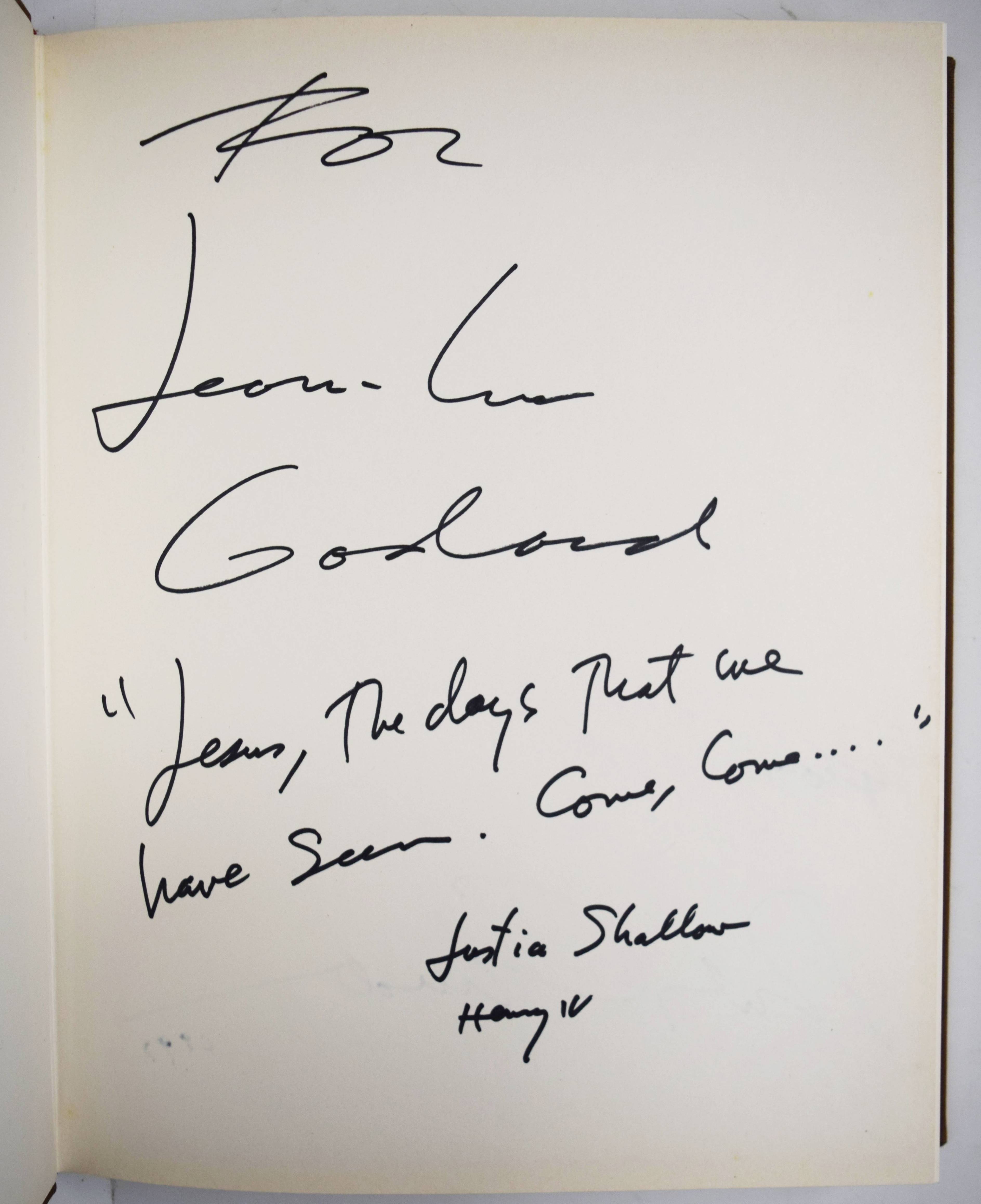 Avedon, Richard. An autobiography. (Bookdesign: Mary Shanahan). New York, Random House (1993). Folio (36,5 x 29 cm.). [432] S. mit 284 teils doppelblattgr. Duotone-Tafeln. Brauner Orig.-Leinenband mit rotem Rücken- und Deckeltitel und Portrait auf dem Rückendeckel. Koetzle, Fotografen A-Z 18 f. – Erste Ausgabe der wichtigen Monographie. – Mit eigenhändiger Widmung von R. Avedon für den berühmten französisch-schweizerischen Regisseur und Drehbuch-Autor Jean-Luc Godard (1930-2022), „For Jean-Luc Godard ‚Jesus, the days that we have seen. Come, Come …‘ Justice Shallow Henry IV, from Richard Avedon 1993“. – „Photographie, das ist die Wahrheit. Und der Film ist die Wahrheit 24 Mal in der Sekunde“ (J.-L. Godard aus Der kleine Soldat, Le petit soldat 1960). – „Während eines Großteils seines Lebens hat Richard Avedon in unterschiedlichen Genres der amerikanischen Fotografie den Ton angegegeben, sie aber gleichzeitig auch provoziert und ihre Grenzen ausgelotet. Als Porträt-, Mode- und Werbefotograf hat Avedon eine Reihe fotografischer Stile praktisch erfunden“ (Jane Livingston in Koetzle). – Tadellos.