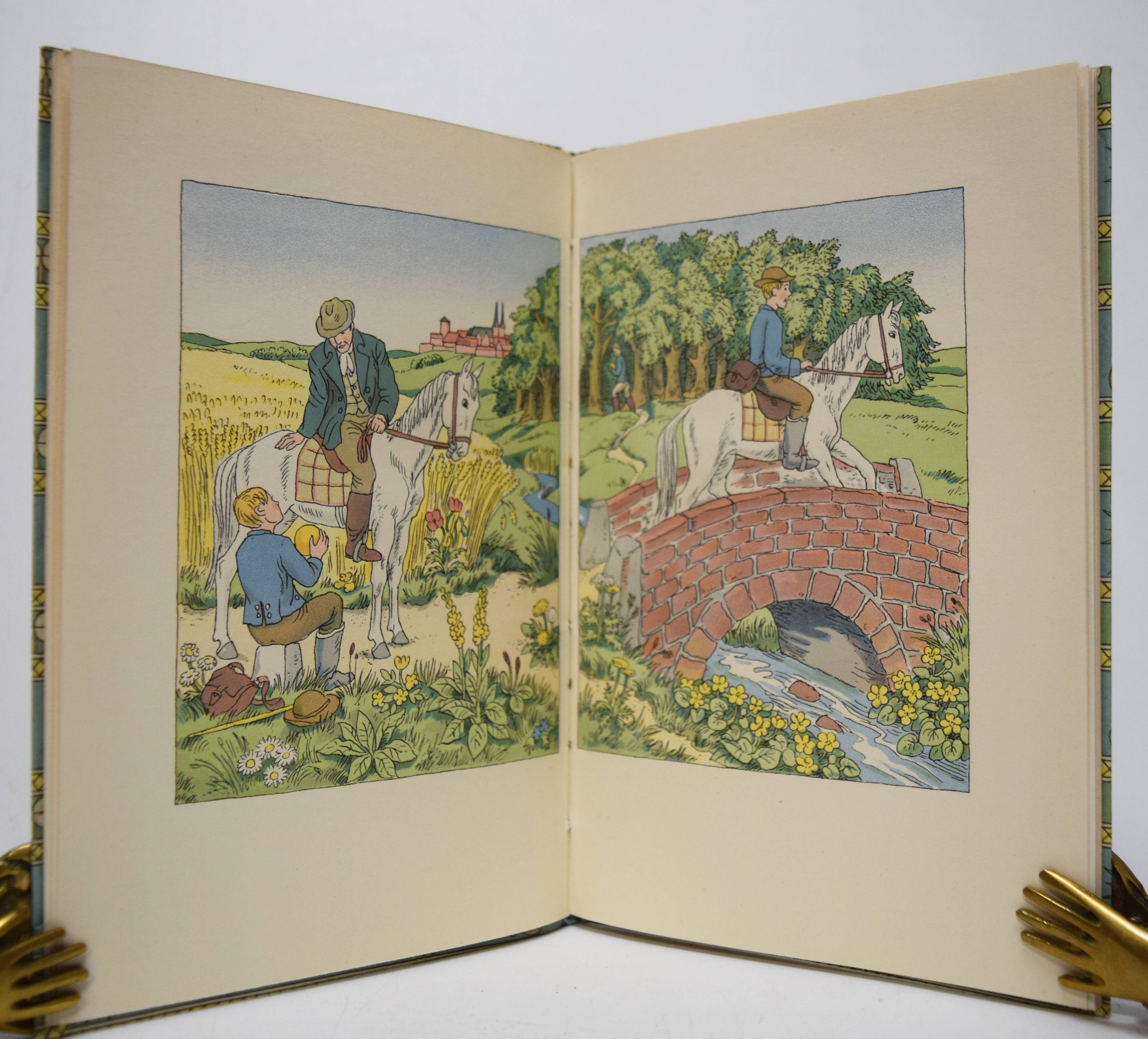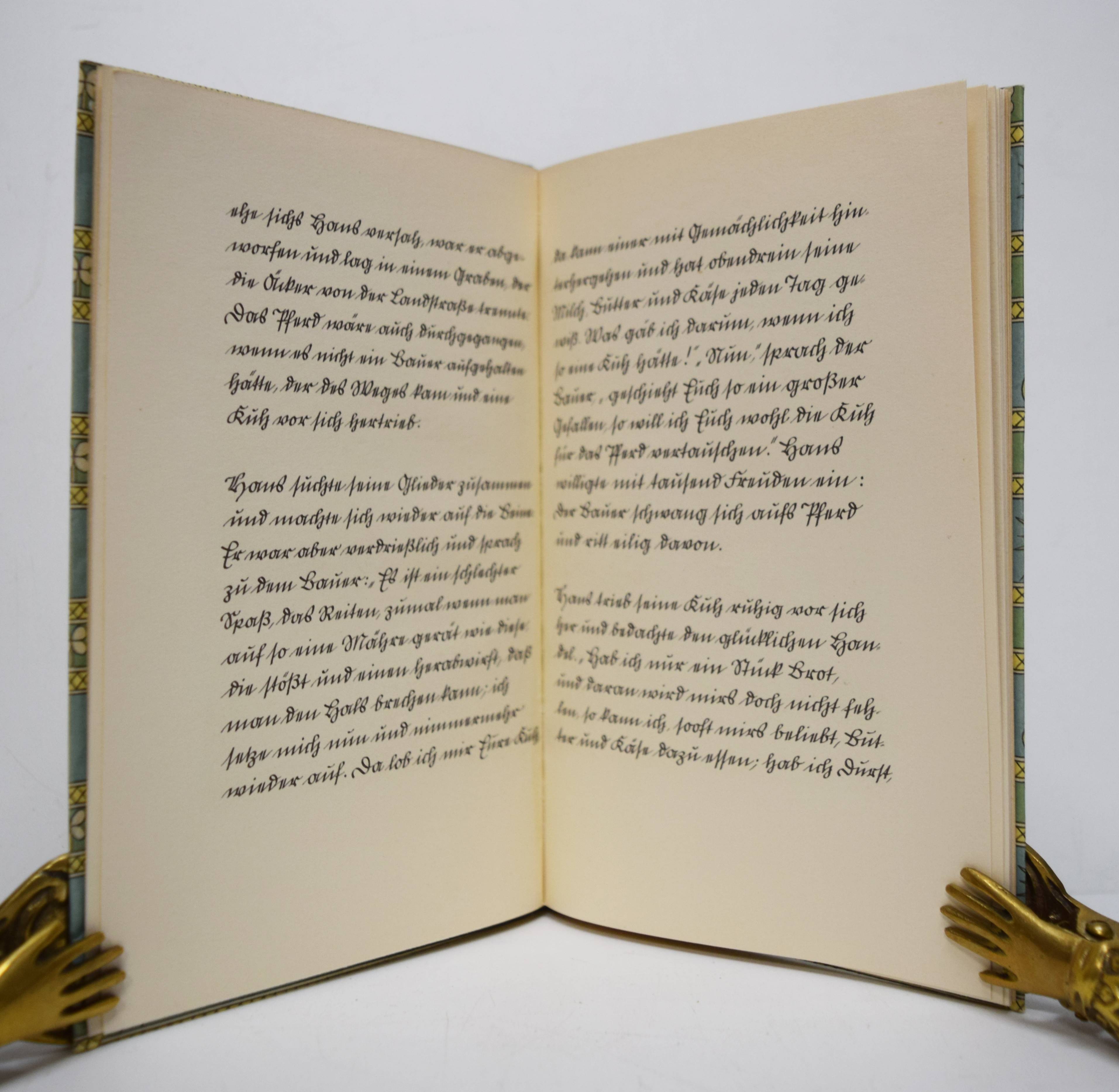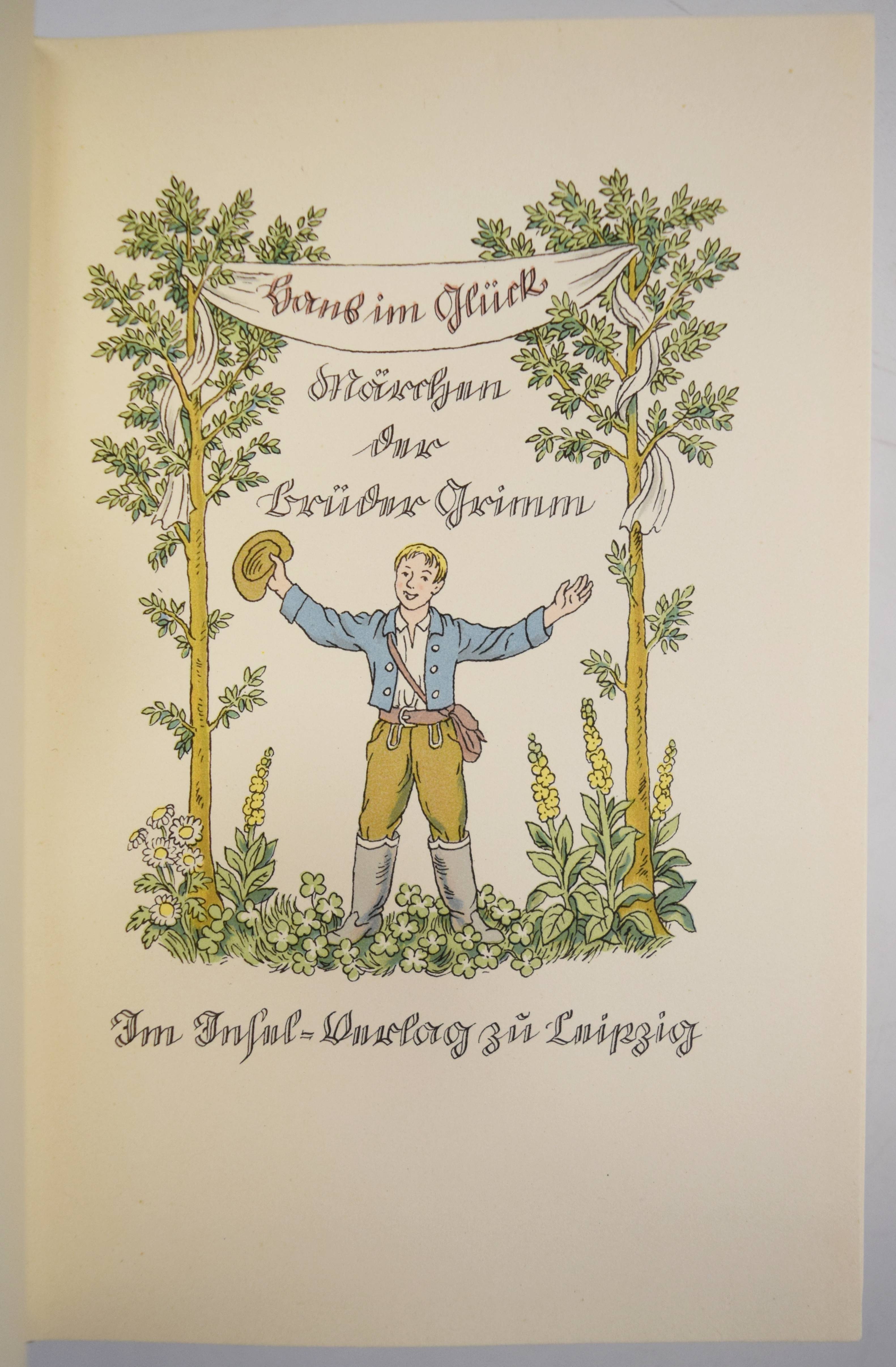 Grimm, (Jacob und Wilhelm). Hans im Glück. Märchen. Leipzig, Insel-Verlag o. J. (1938). 8°. [22] Bl. mit farbig illustr. Titel und 18 Farbtafeln von Wili Harwerth. Farbig illustr. Orig.-Pappband mit Rücken- und Deckelschild. (Insel-Bücherei Nr. 530). Jenne 530 (1A),1. Klotz, Bilderbücher 2081/16. – Erste Ausgabe. – Text geschrieben von Martin Hermersdorf in der Offenbacher Schulschrift von Rudolf Koch. – Sehr gutes sauberes Exemplar.