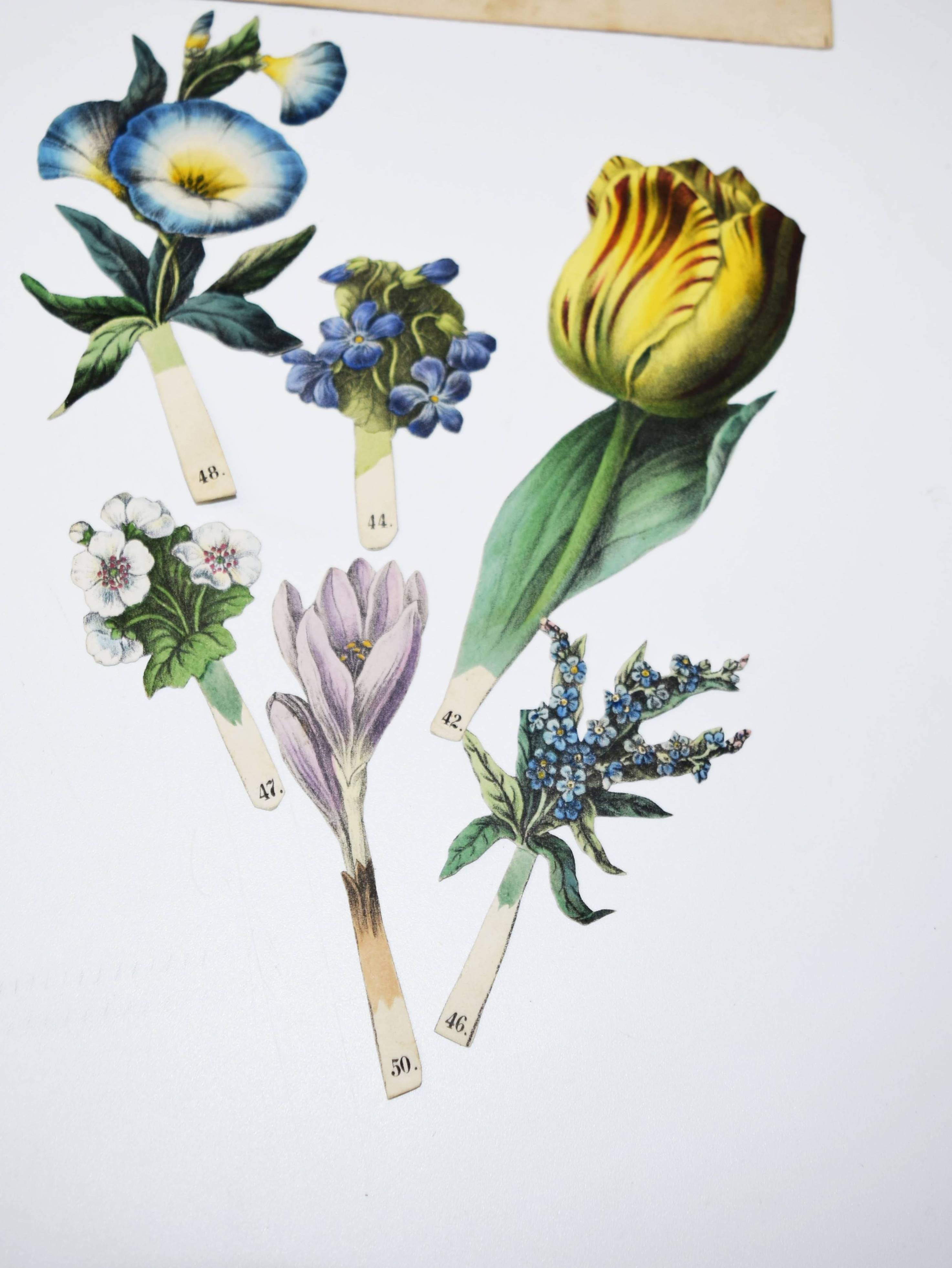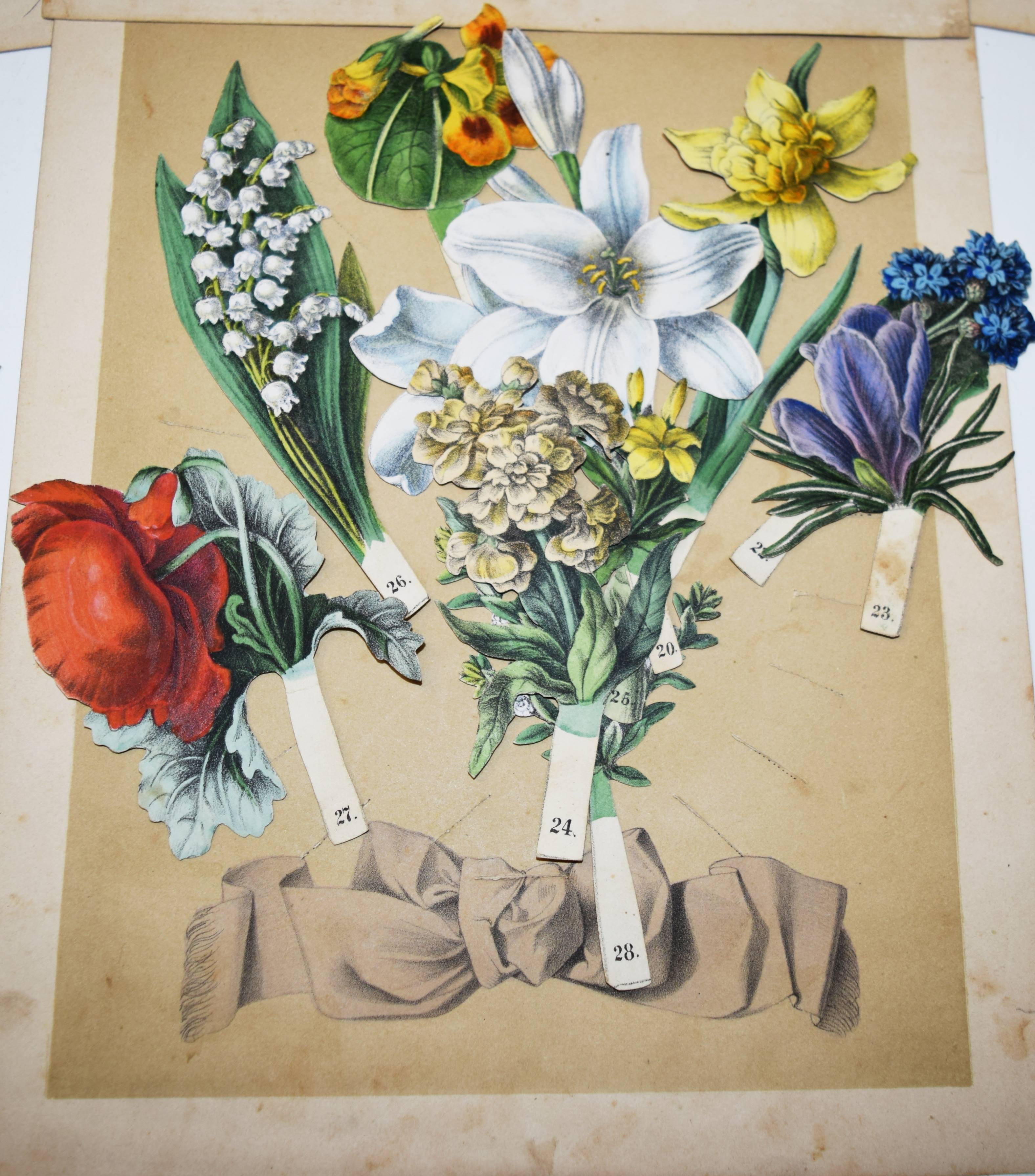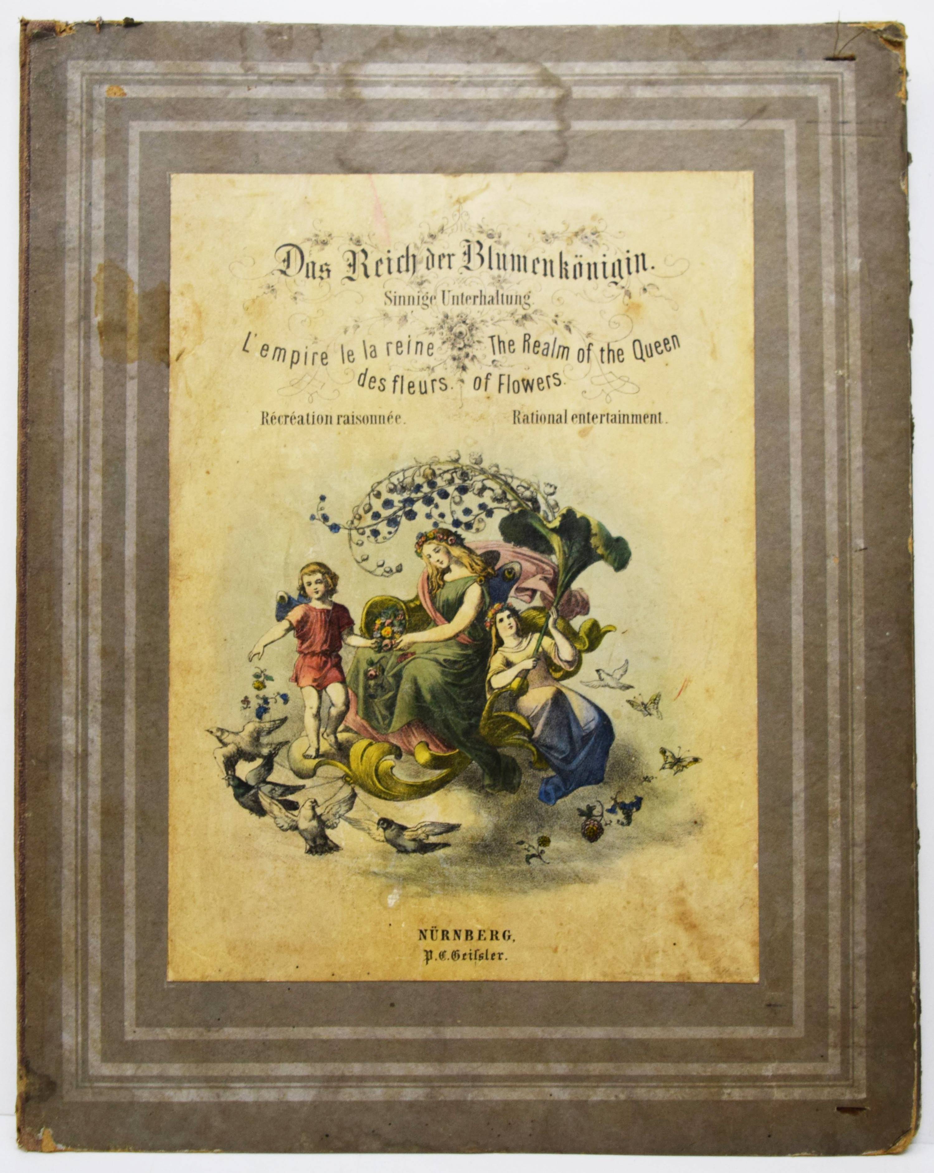 Geissler, P(eter) C(arl), (Hrsg.). Das Reich der Blumenkönigin. L’empire de la reine des fleurs. The Realm of the Queen of Flowers. Sinnige Unterhaltung durch Zusammenstellung der schönsten Zierpflanzen zu Bouquets und Kränzen in tausendfacher Veränderung. Nürnberg, P(eter) C(arl) Geissler o. J. (1860). Gr.-4° (34 x 26,5 cm.). 8 S. (Textheft), 4 farblithogr. Einsteck-Tafeln und 50 farblithogr. Einsteck-Blumen von Peter Carl Geissler. Orig.-Halbleinen-Flügelmappe mit farblithogr. Deckelbild. Hobrecker, Braunschweig 6168 (4. Aufl., um 1880). Osborne Collection I, 420. Nicht bei LKJ IV, 215, Rammensee und Wegehaupt I-IV. – Erste Ausgabe. – Seltenes Spiel-Bilderbuch mit Text in Französisch, Deutsch und Englisch. Bis zur Jahrhundertwende erschienen mindestens 9 Auflagen bei verschiedenen Verlagen, von denen jedoch nur noch wenige Exemplare in gutem Zustand und vollständig mit allen Elementen und dem Text erhalten geblieben sind. – „Die einzelnen Blumen werden auf einen der 4 Cartons in die darin angebrachten Einschnitte gesteckt, und dadurch die anmutigsten Kränze und Bouquets geformt, entweder durch freie Wahl der Blumen, oder je nach der Jahreszeit, in welcher sie blühen, oder nach dem Sinn ihrer Bedeutung. Zu letzerem Zweck dient das im Text dem Namen jeder Blume beigesetzte Motto…“ (aus der Spielanleitung). – Der Nürnberger Aquarellmaler, Zeichner, Illustrator und Verleger P. C. Geissler (1802-1872) hat zahlreiche Kinderbücher ausgestattet. – Flügelmappe, Textheft und die Einstecktafeln angestaubt und fingerfleckig, bei zwei Blumen fehlt der Stil, sonst gut erhalten und vollständig mit allen Teilen.