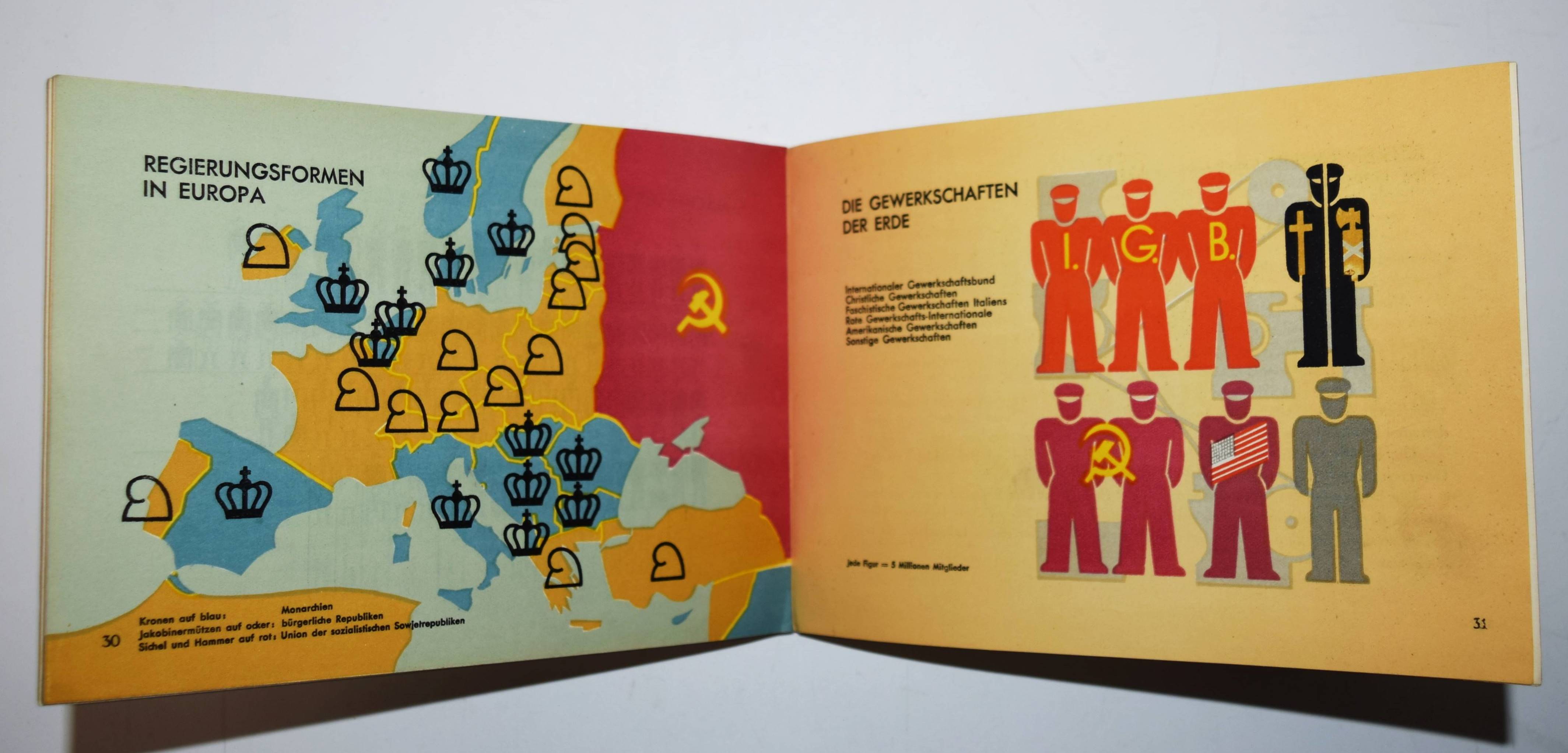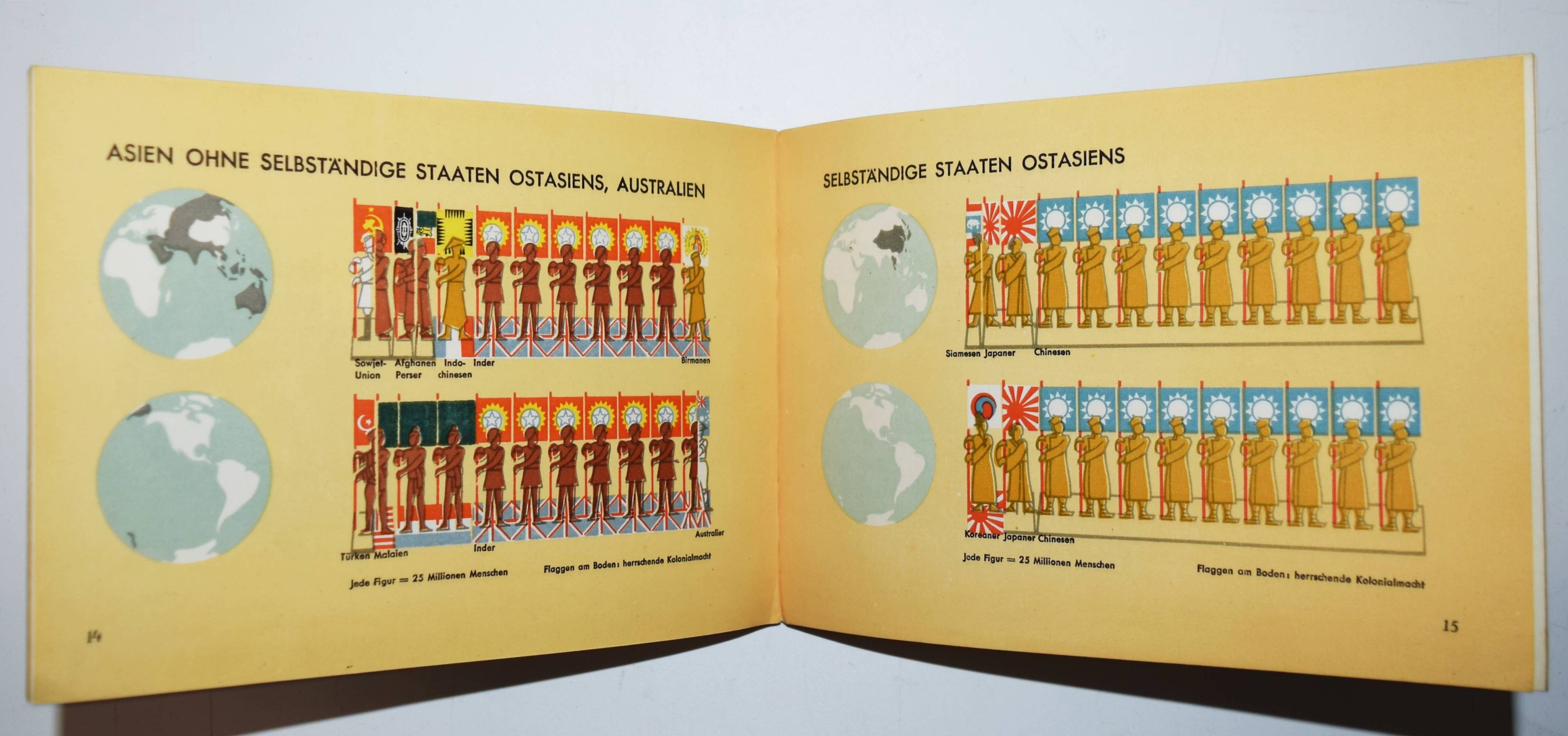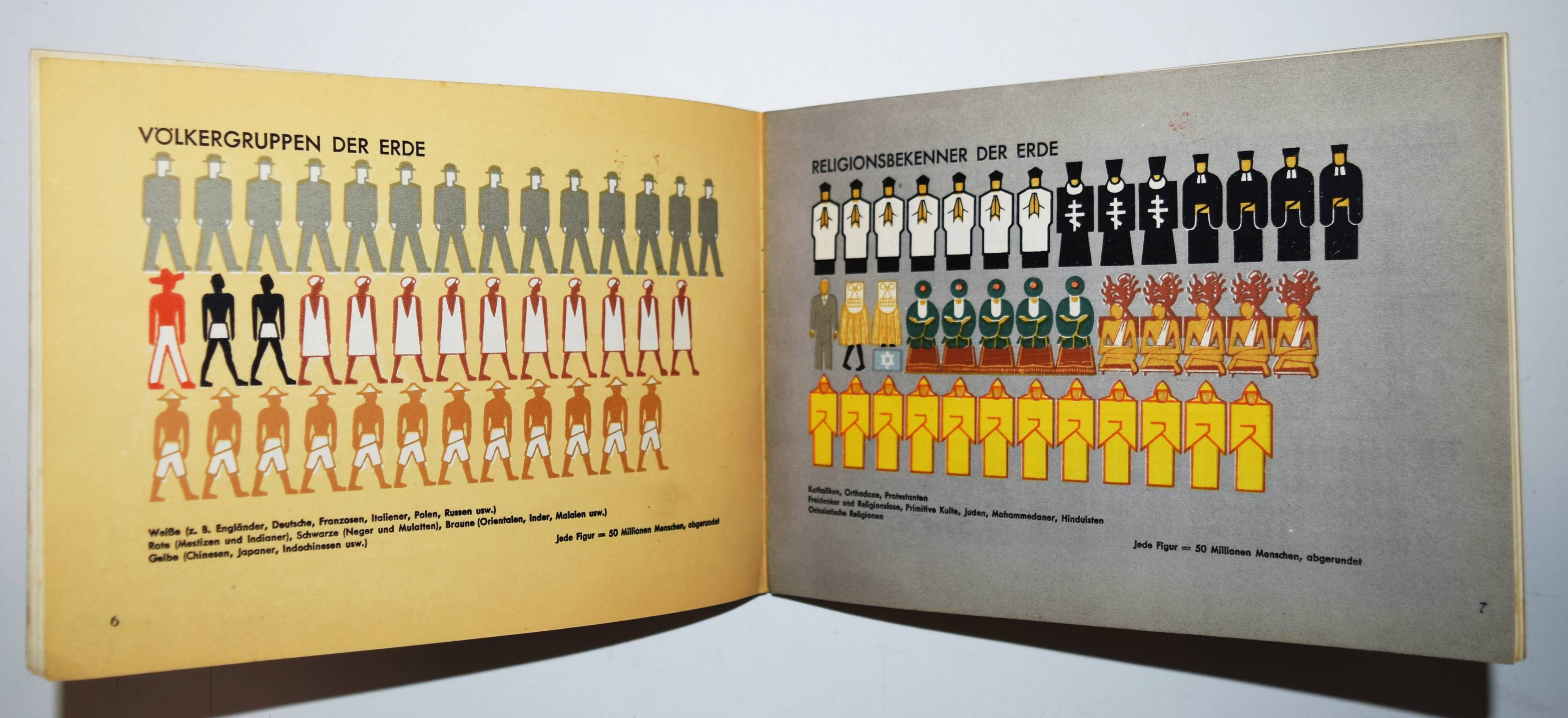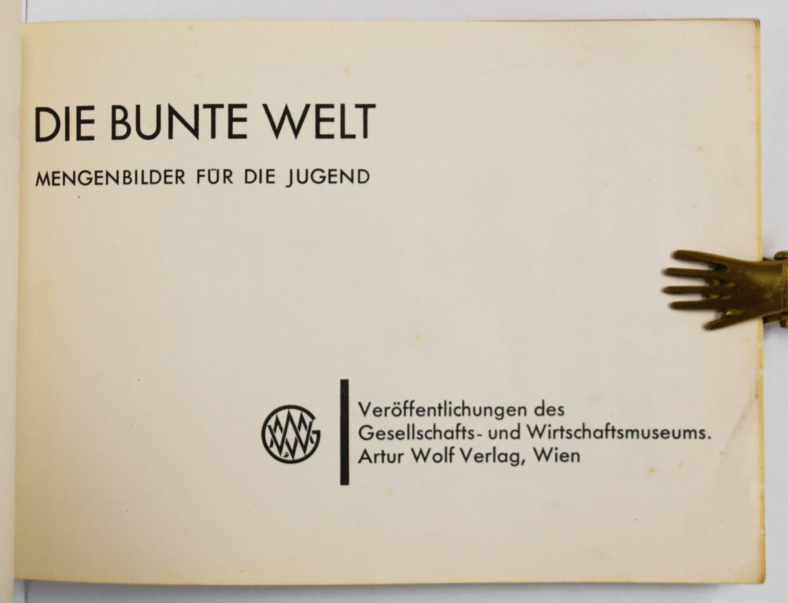 (Neurath, Otto, Hrsg.). Die bunte Welt. Mengenbilder für die Jugend. Wien, Arthur Wolf (1929). quer-8“. 47, (1) S. mit 36 (15 farbigen) Tafeln von Gerd Arntz. Farbig illustr. Orig.-Halbleinenband. (Veröffentlichungen des Gesellschafts- und Wirtschaftsmuseums, Wien). Bilderwelt 556. LKJ II, 151. Heller 1165. Neurath-Bibliothek 181 B. – Erste und einzige Ausgabe. – „Das seit 1924 in Wien bestehende Gesellschafts- und Wirtschaftsmuseum (begründet durch Otto Neurath) gilt heute als Pionierleistung sozialpädagogischer (und damit eminent politischer) Museumsarbeit. Seit 1926 wurden Kontakte zu dem jungen Graphiker Gerd Arntz aufgenommnen, der schließlich von 1929 bis 1934 als ‚grafischer Leiter‘ des Museums wirkte. Die von Neurath und Arntz entwickelte ‚Wiener Methode‘ der bildlichen Darstellung statistischer Fakten war schulbildend, aus ihr hat sich später die Methode der ISOTYPE (International System of Typographic Education) entwickelt“ (F. C. Heller in Bilderwelt). – „Die bunte Welt war der erste Versuch, das neue Verfahren in einem Jugendbuch vorzustellen. Der Text und vor allem die Tafeln vermitteln einen gezielten und umfassend wirkenden Einblick in demographische, wirtschaftliche und soziale Verhältnisse auf der Erde, aber auch in politische und historische Tatbestände. So werden u. a. gezeigt: Pflanzenregionen der Erde, die Staaten der Welt, Bodennutzung, Automobilbestand, Regierungsformen, Gewerkschaften, Reallöhne, Reiche und Arme, Säuglingssterblichkeit, Altersaufbau, aber auch: Die Kämpfenden des Weltkrieg 1914-18, Schicksal der Soldaten 1914–18. – Mit solchen Themenbehandlungen, die sich aller patriotischen, glorifizierenden, historisch konservativen Tendenzen enthalten und die quasi „nüchternen Zahlen“ sprechen lassen, stellt sich das Buch bewusst abseits der in den späten 1920er-Jahren immer noch und schon wieder manifestierenden Kriegs-Ideologien und bürgerlich-konservativen „Weltdarstellungen“ in Kinderbüchern und Schulliteratur. Damit zählt dieses Bilderbuch zu jenen wenigen Veröffentlichungen, die damals in Österreich den Typus eines modernen „Sachbuchs“; repräsentieren: Bücher, die tatsächlich und ohne scheinhafte „pädagogische Rücksicht“ die „Sachen“ und die „Sachlichkeit“ mitteilen und nicht eine heile „Welt für die Kinder“, fern von aller problemreichen Realität, vortäuschen. Gleichzeitig aber steht es auch in der jahrhundertealten Tradition der „Bildpädagogik“, die es auf eine moderne (nämlich die geänderten Bild-Erfahrungen der technischen Welt berücksichtigenden) Weise transformiert“ (F. C. Heller). – Deckel geringfügig angestaubt, sehr schönes sauberes Exemplar.