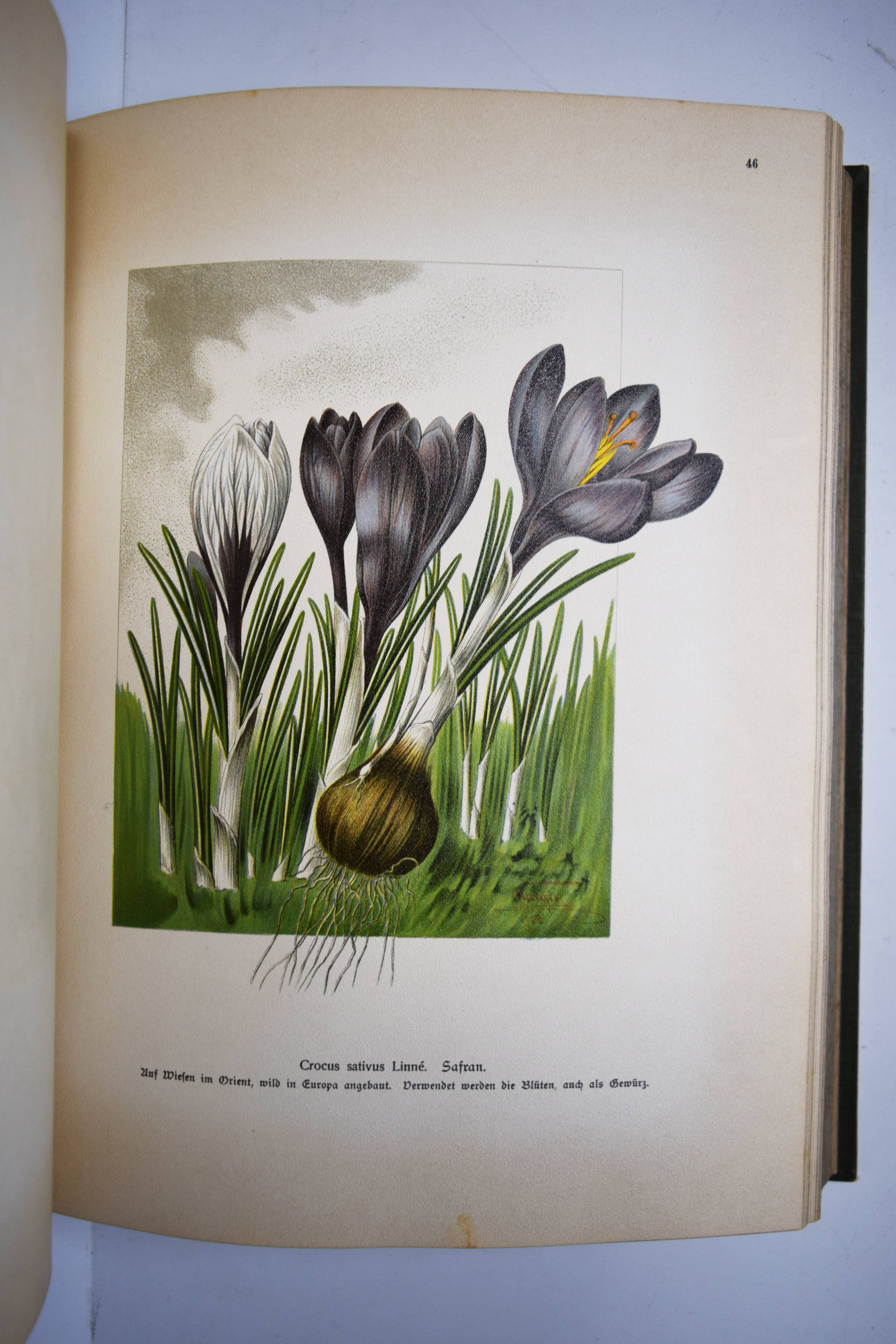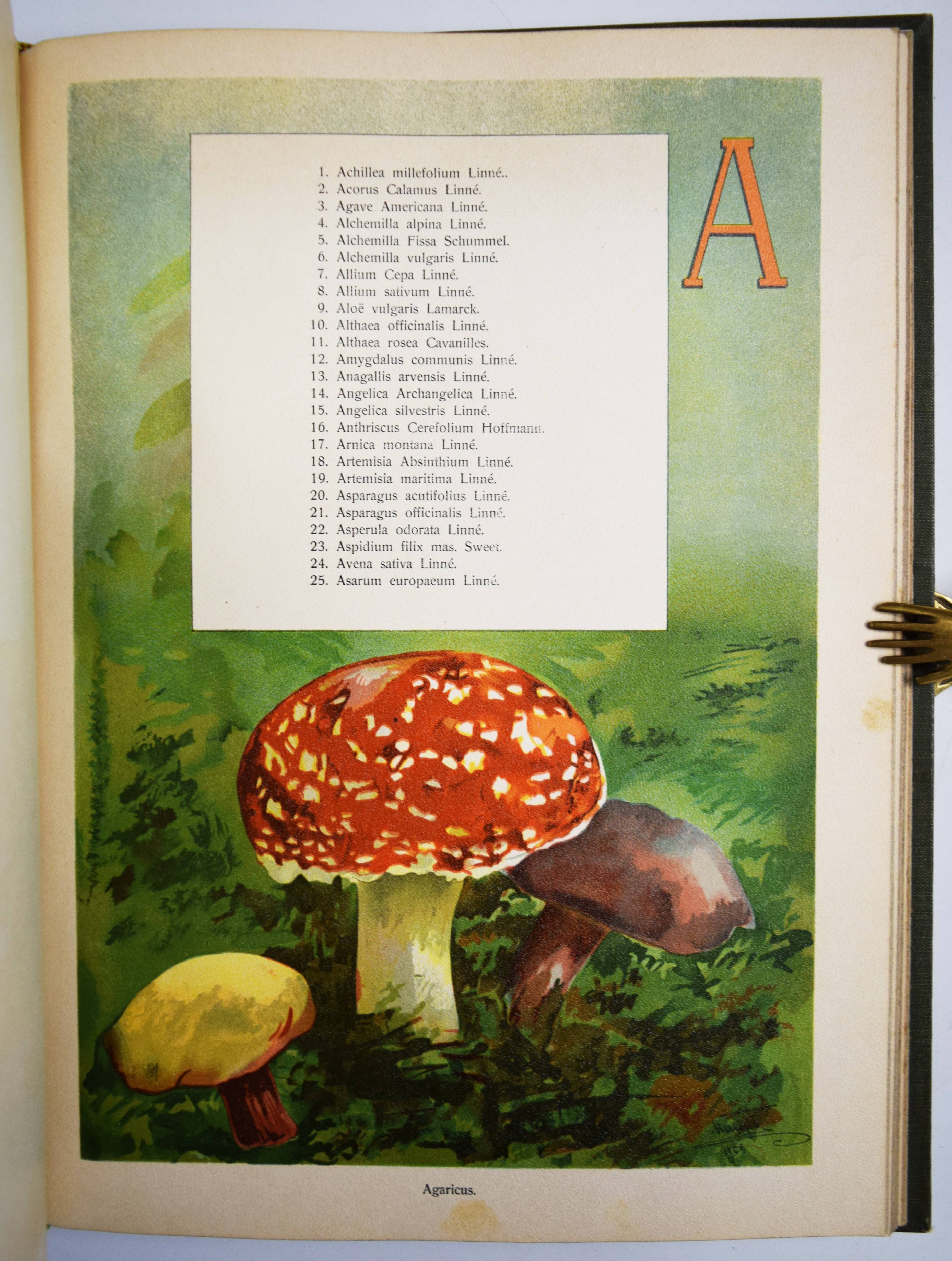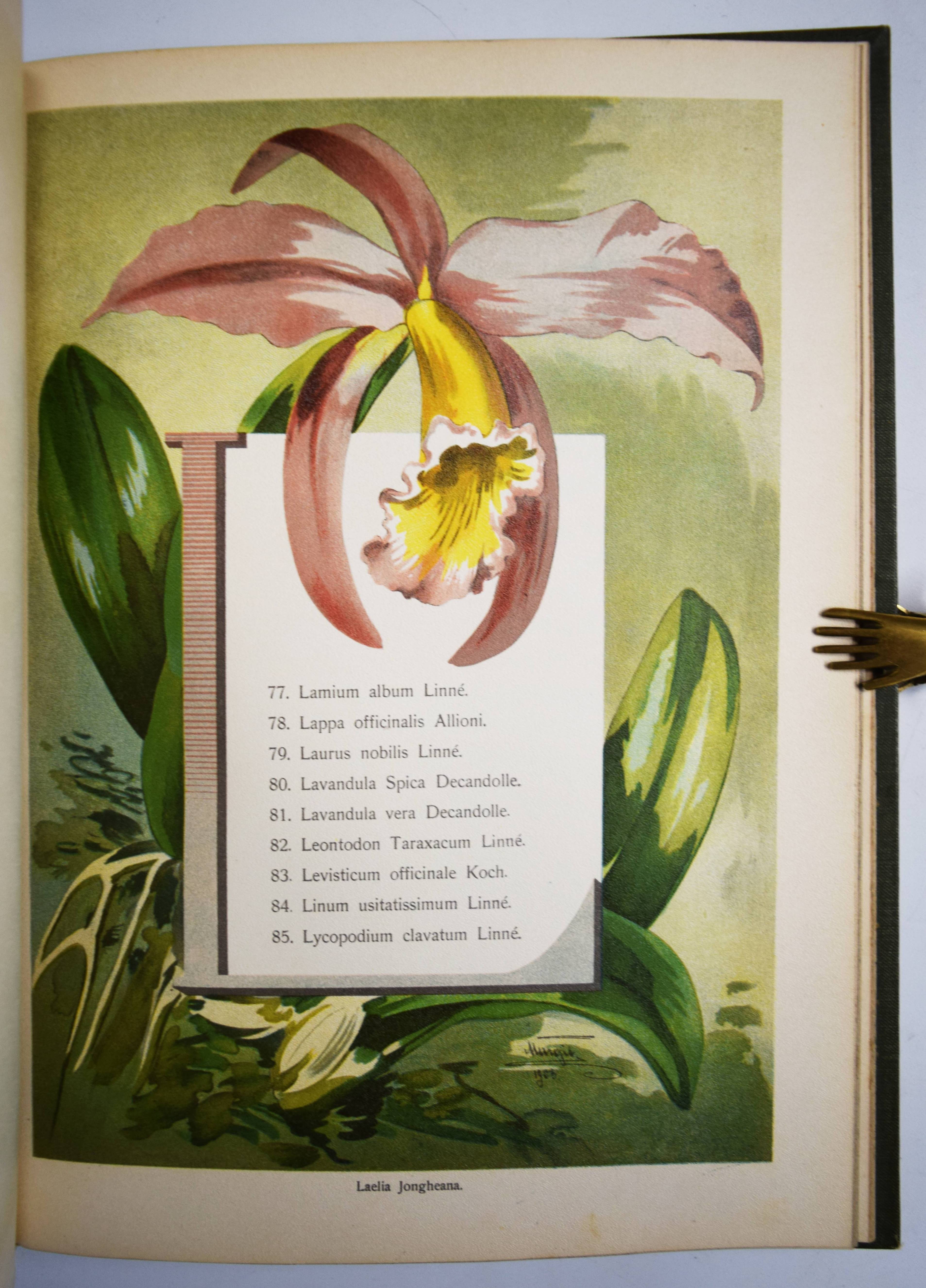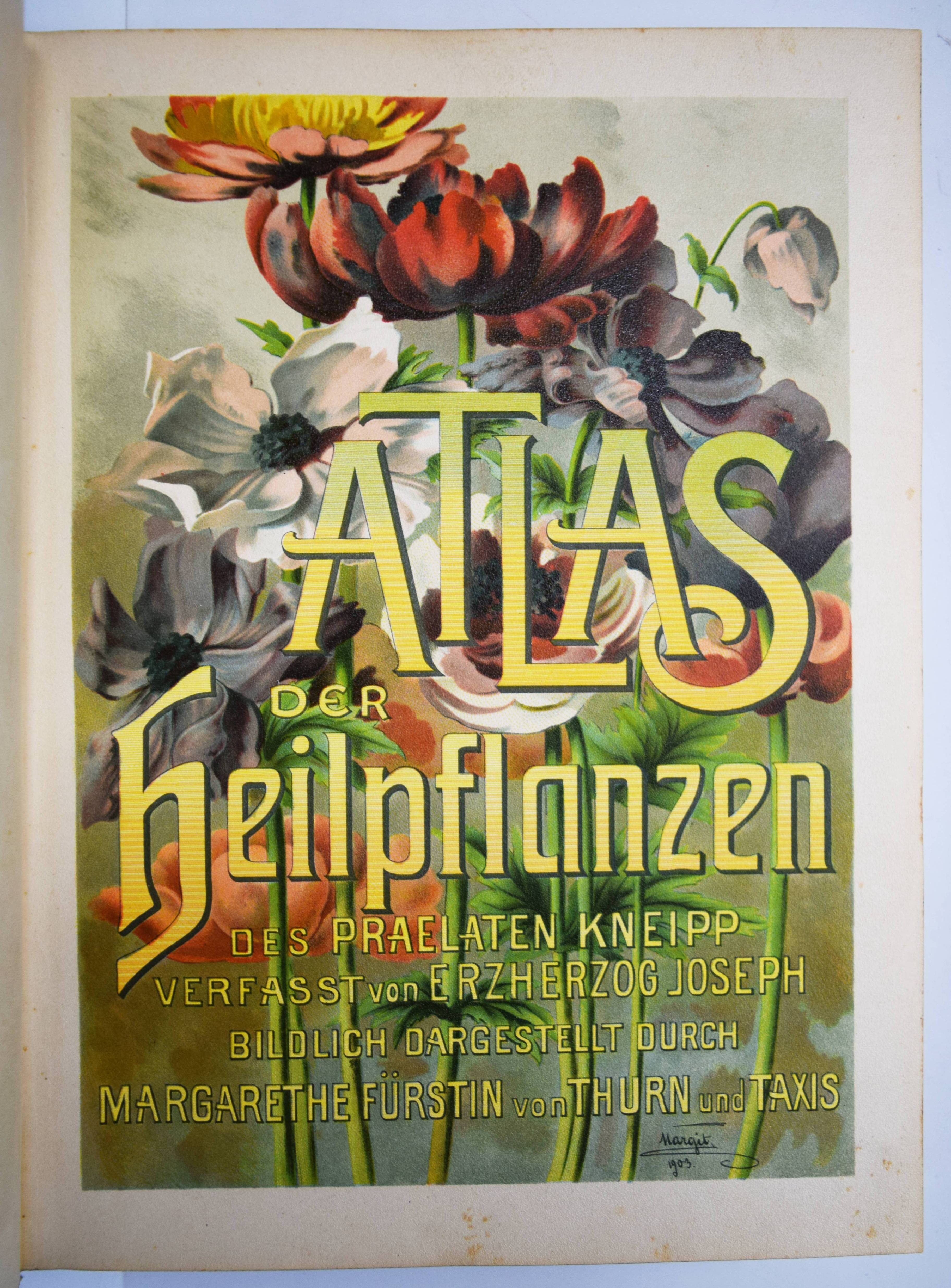 Joseph, Erzherzog von Österreich. Atlas der Heilpflanzen des Praelaten (Sebastian) Kneipp. Bildlich dargestellt durch Margarethe von Thurn und Taxis. Regensburg, W. Wunderlings Hofbuchhandlung (1904-1906). Gr.-4° (31 x 23,5 cm.). Chromolithogr. Titelblatt, chromolithogr. Widmungsblatt, [1] Bl. (Vorwort), 188 chromolithogr. Tafeln, 20 chromolithogr. Zwischentitel und 21 chromolithogr. Register-Blätter (zusammen 231 Chromolithographien). Farbig illustr. Orig.-Leinenband mit goldgepr. Rücken- und Deckeltiteln. Nissen 1008 n. – Erste Ausgabe mit prachtvollen Jugendstil-Pflanzendarstellungen. – Außer dem Vorwort vollständig chromolithographisch gedruckt. Die Fürstin, Tochter des Verfassers, die ihre Zeichnungen lässig mit „Margit“ signierte, schuf nicht nur die Pflanzen-Aquarelle, oft vor eindrucksvollen oder idyllischen Landschaften, sondern auch noch dekorative Zwischentitel und Registerblätter. – Rücken am Kapital und Fuß gering berieben, sehr schönes Exemplar.