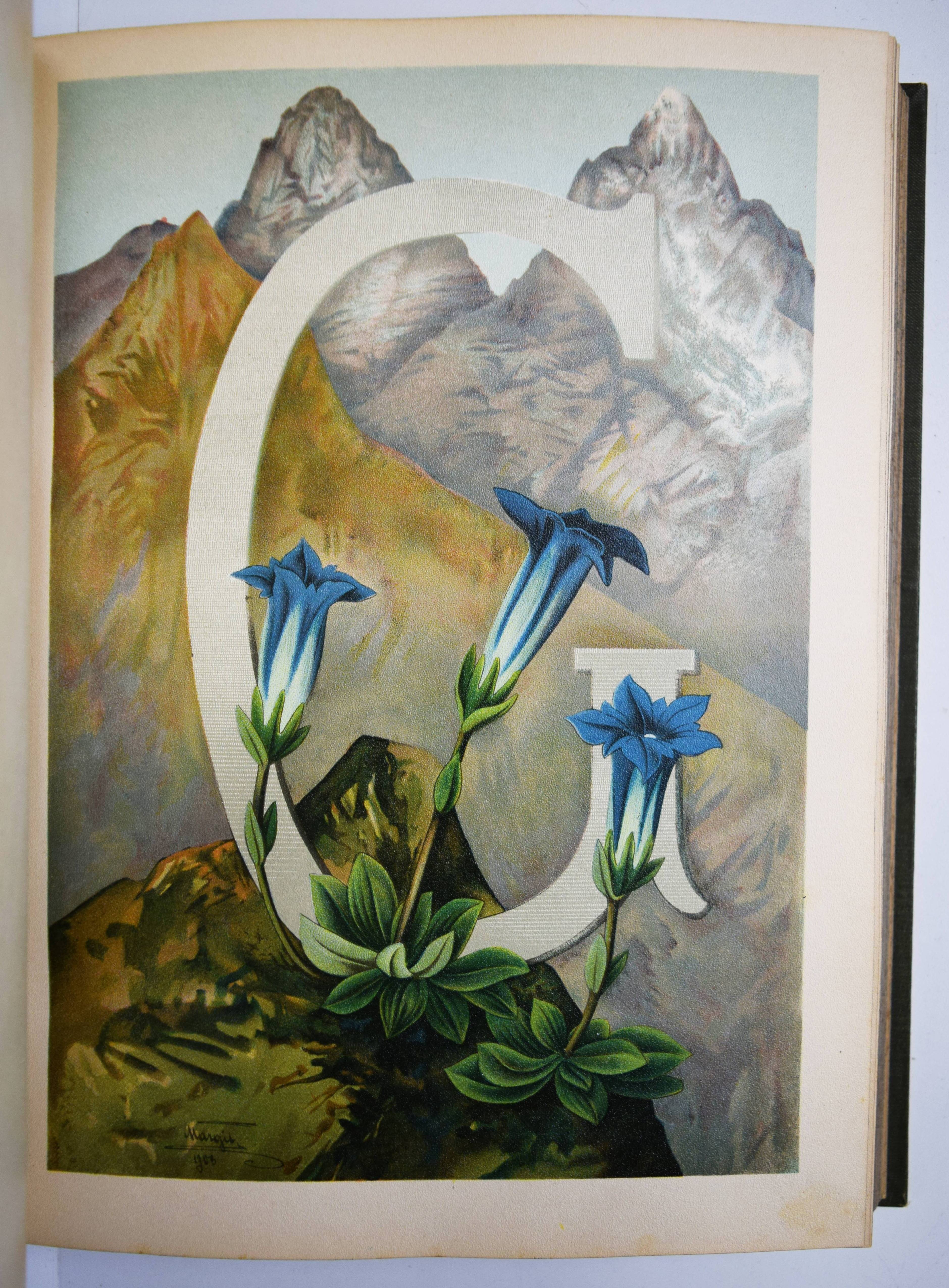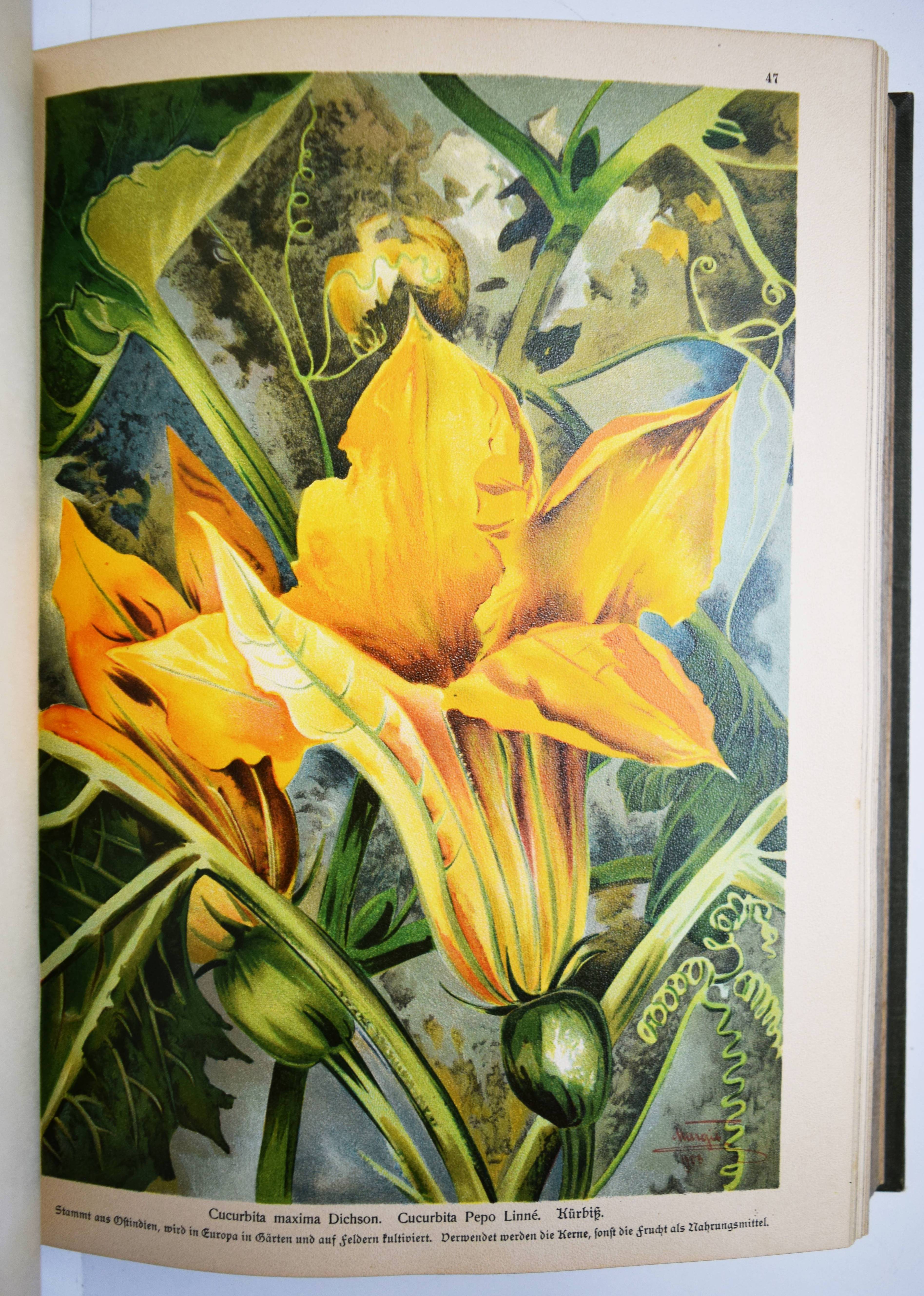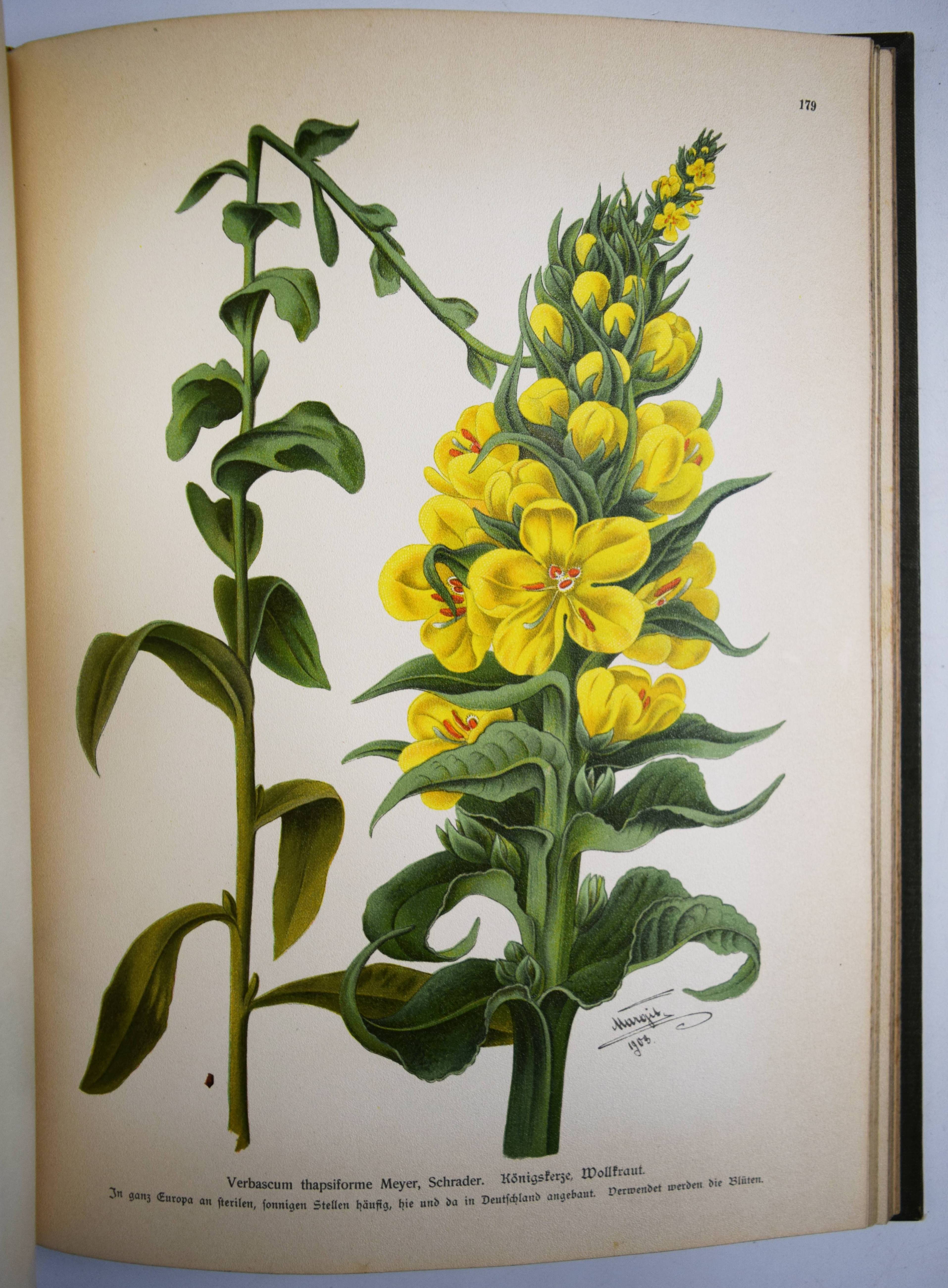 Joseph, Erzherzog von Österreich. Atlas der Heilpflanzen des Praelaten (Sebastian) Kneipp. Bildlich dargestellt durch Margarethe von Thurn und Taxis. Regensburg, W. Wunderlings Hofbuchhandlung (1904-1906). Gr.-4° (31 x 23,5 cm.). Chromolithogr. Titelblatt, chromolithogr. Widmungsblatt, [1] Bl. (Vorwort), 188 chromolithogr. Tafeln, 20 chromolithogr. Zwischentitel und 21 chromolithogr. Register-Blätter (zusammen 231 Chromolithographien). Farbig illustr. Orig.-Leinenband mit goldgepr. Rücken- und Deckeltiteln. Nissen 1008 n. – Erste Ausgabe mit prachtvollen Jugendstil-Pflanzendarstellungen. – Außer dem Vorwort vollständig chromolithographisch gedruckt. Die Fürstin, Tochter des Verfassers, die ihre Zeichnungen lässig mit „Margit“ signierte, schuf nicht nur die Pflanzen-Aquarelle, oft vor eindrucksvollen oder idyllischen Landschaften, sondern auch noch dekorative Zwischentitel und Registerblätter. – Rücken am Kapital und Fuß gering berieben, sehr schönes Exemplar.