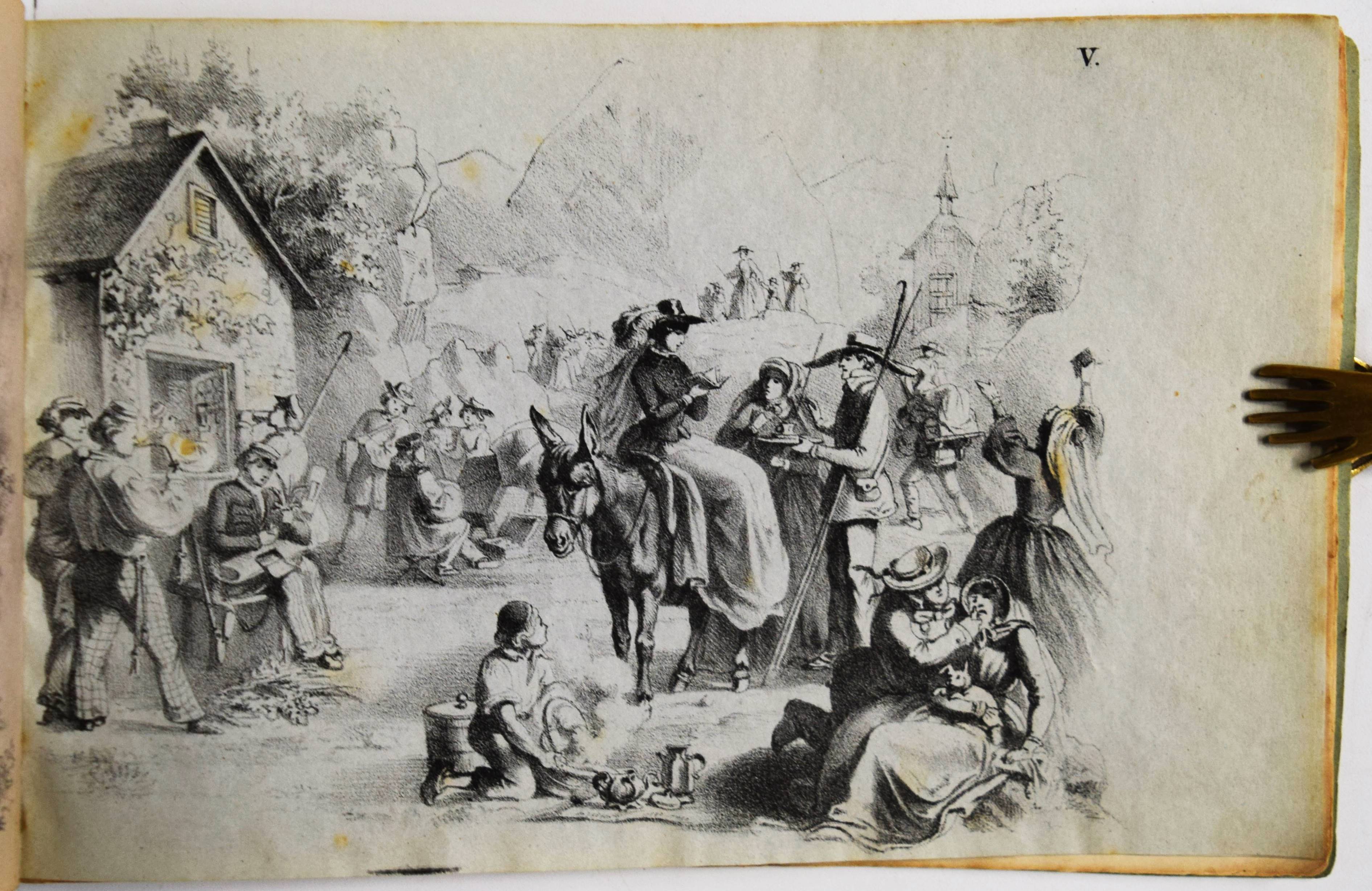 Kinderfreuden. Festgabe für die Schülerinnen und ihre Freunde zur freundlichen Erinnerung an die Einweihung des neuen Töchterschul-Gebäudes in Zürich am 7. April 1853. Zürich, Orell, Füßli und Comp. 1853. Quer-8° (16,5 x 25,5 cm.). VIII S., 15 S. mit Mit 8 ganzseitigen Kreidelithographien von Johann Conrad Werdmüller, 6 Federlithographien auf 2 Blättern und 1 Holzstich-Illustration im Text. Typogr. Orig.-Kartonumschlag. Hauswedell 703. Seebaß I,1033 und II, 1010. Weilenmann 1622. – Erste und wohl einzige Ausgabe. – „Einem Prolog folgen Gedichte, kurze Theaterszenen und Charaden in Versen sowie ein Versmärchen. Ausser einem sind alle Texte in Zürcher Mundart verfasst, wobei jeder Beitrag mit einem ganzseitigen Bild illustriert ist“ (C. Weilenmann). – Umschlag angestaubt und fingerfleckig, Textteil etwas braunfleckig, sonst gut erhalten.