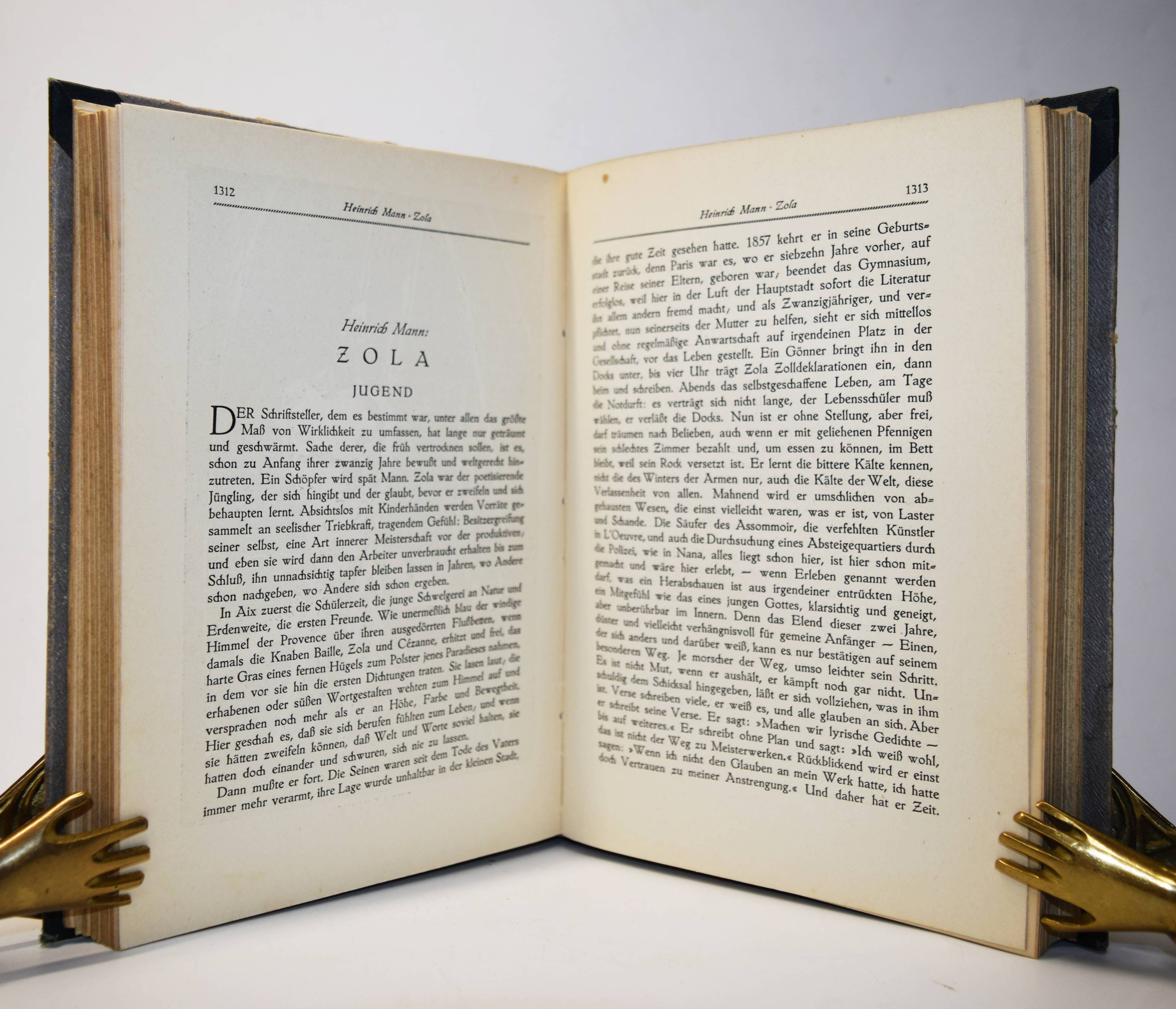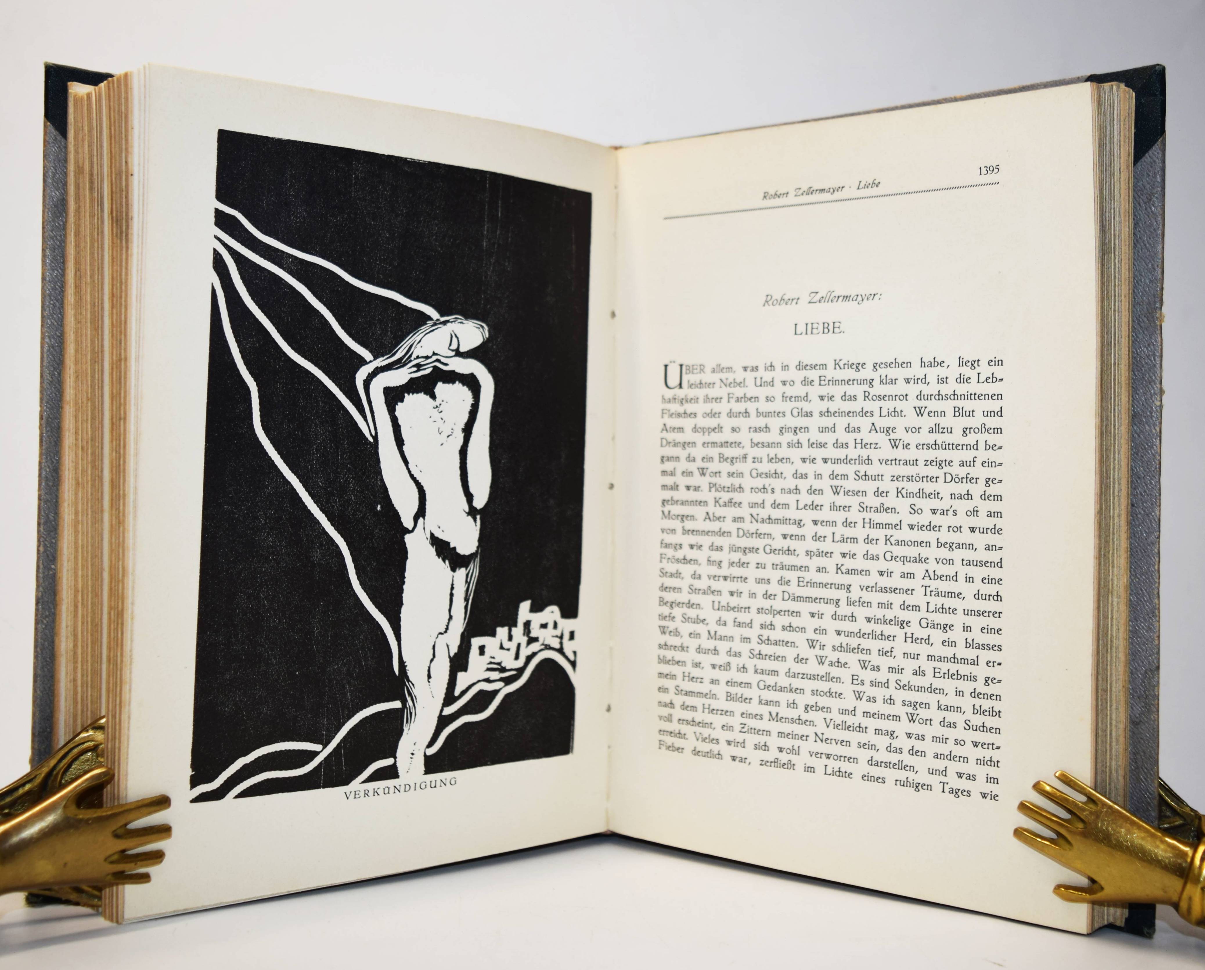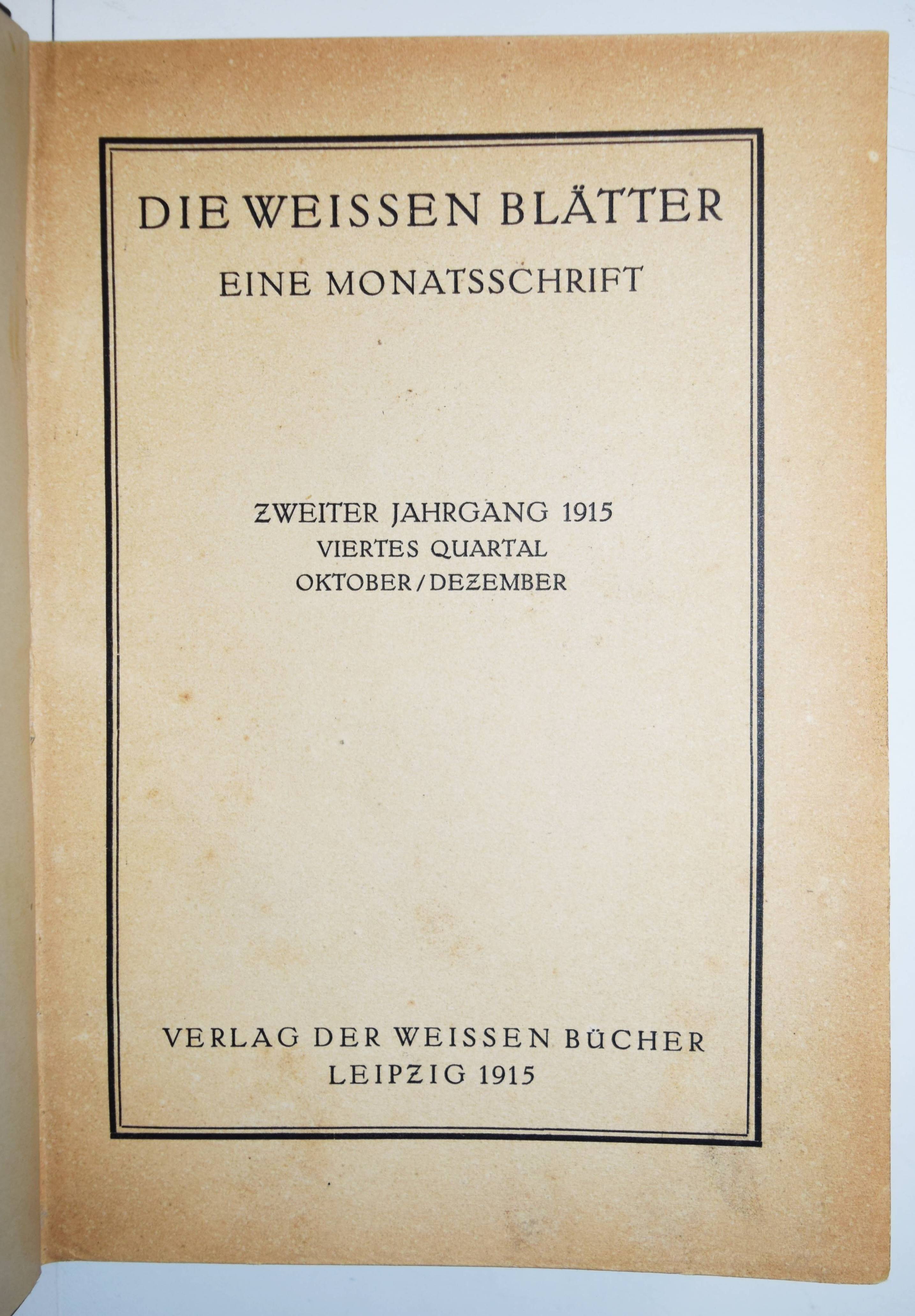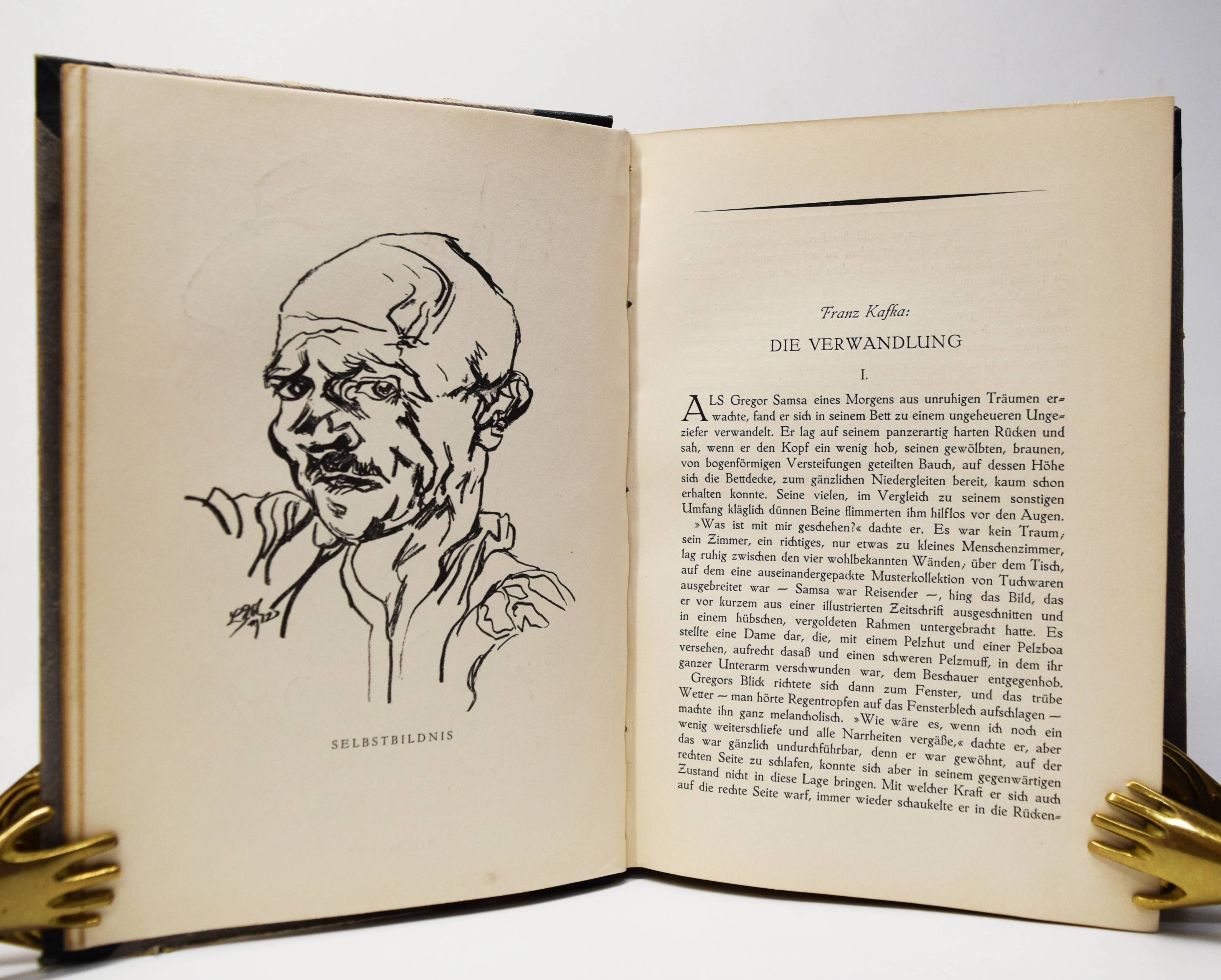 Kafka, Franz. Die Verwandlung. In: Die weissen Blätter. Eine Monatsschrift. (Herausgegeben von E.-E. Schwabach und René Schickele). Zweiter Jahrgang 1915. Viertes Quartal Oktober/Dezember. S. 1177-1230. Leipzig, Verlag der Weissen Bücher 1915. Gr.-8° (23 x 16,5 cm.). IV, S. 1177-1510 mit 10 lithogr. Tafeln von Ludwig Meidner und 4 Holzschnitten von Christian Schad. Orig.-Halbleinenband mit goldgepr. Rückentitel. Diesch 2827 a. Dietz 25. Raabe, Zeitschriften 15. Schlawe II, 11-14. – Seltener erster Druck der ersten Ausgabe von Kafkas bekanntester Erzählung. – „Kafkas ’Wanzengeschichte`, so hatte Franz Werfel sie Kurt Wolff anempfohlen, erschien im Oktober 1915 zunächst in der Zeitschrift ‚Die weißen Blätter‘. Nur wenige Wochen später, im November wurde die Buchausgabe gedruckt … – 1915 gab der Fontane-Preisträger Carl Sternheim das Preisgeld auf Empfehlung von Franz Blei an „den jungen Prager Erzähler Franz Kafka für dessen Bücher ‚Der Heizer‘ und ‚Die Verwandlung‘ weiter als ein Zeichen seiner Anerkennung“. Dieser Umstand, werbewirksam in Szene gesetzt, sorgte für steigende Absatzzahlen der Kafka-Bücher“ ( L. Dietz). – Die Zeitschrift „Die weissen Blätter“ ist – nach dem „Sturm“ und der „Aktion“ – das wichtigste Organ der neuen Literaturbewegung, dessen Titel bildstark auf den Neuanfang hindeutete. Hermann Hesse schrieb: „Das Echo dieser blutigen Zeit klingt in diesen Blättern der jüngsten dichterischen Jugend Deutschlands so ernst und doch so mit Hoffnung, daß wir gut tun, auf diesen Ton zu achten.“ Die „weißen Blätter“ begleiteten die Jahre des Expressionismus von ihrer „frühen Reife bis zu ihrem Höhepunkt und stellte ihr Erscheinen ein, als der expressionistische Impuls versiegte“ (Raabe). – Der vorliegende Jahrgang enthält außerdem Erstdrucke von Kasimir Edschmid, Robert Walser, Franz Werfel und Heinrich Manns Zola-Essay, der zum Zerwürfnis mit seinem Bruder führte, sowie Glossen von J. R. Becher, Franz Blei, Else Lasker-Schüler, Kurt Pinthus und anderen. – Innengelenke am Anfang etwas angeplatzt, sonst sehr gut erhalten.