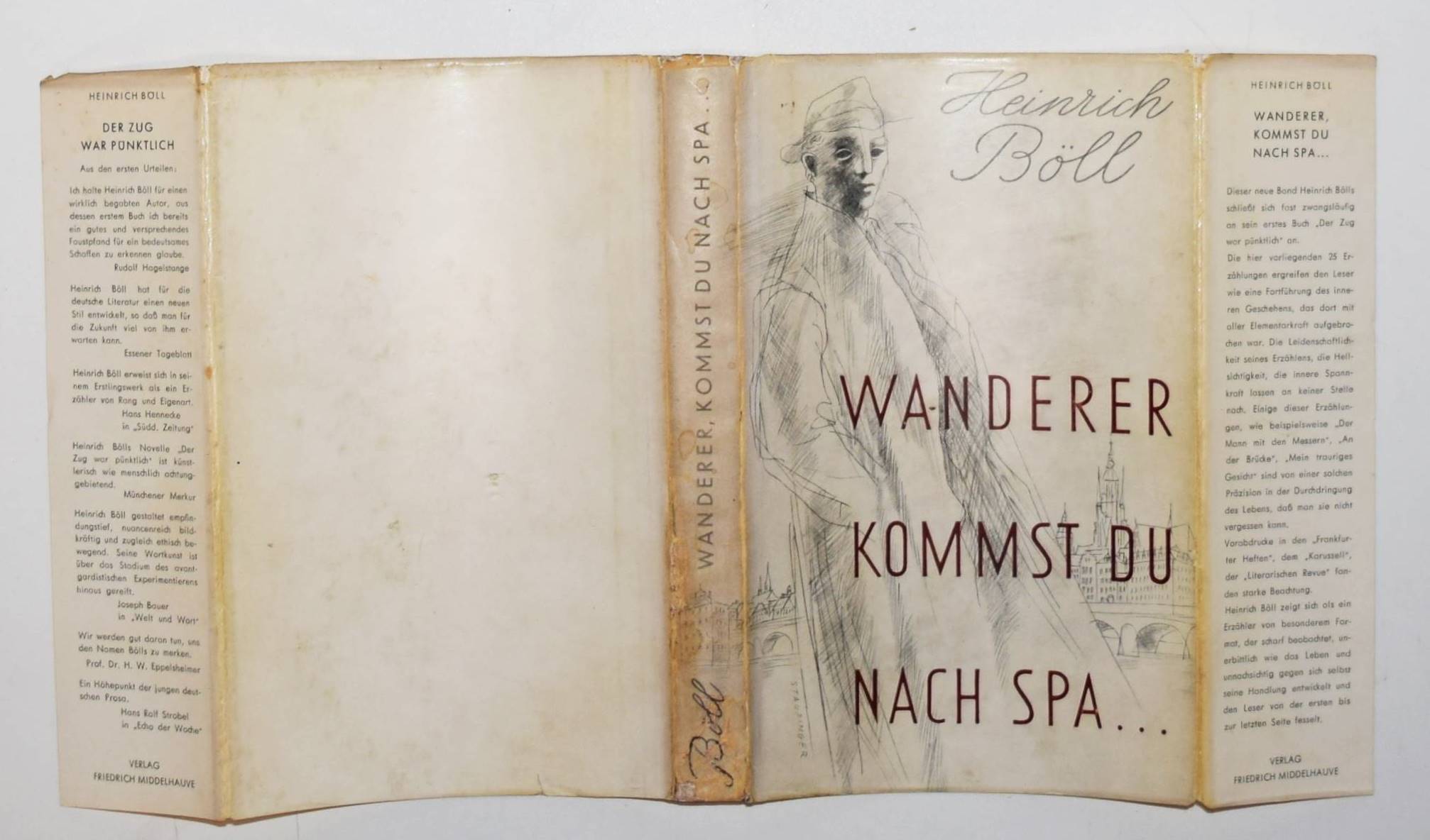 Böll, Heinrich. Wanderer kommst Du nach Spa … Opladen, Friedrich Middelhauve 1950. 8°. 227 (1) S. Orig.-Halbleinenband mit illustr. Schutzumschlag (von Karl Staudinger). W.-G.² 2. Lergning 1.3. – Erste Ausgabe der zweiten Veröffentlichung. – Sammlung mit 25 Kurzgeschichten des Hauptvertreters der sogenannten Trümmerliteratur. – Die Titelgeschichte zitiert den Anfang eines der bekanntesten Distichen des griechischen Altertums, in der Übersetzung Schillers: „Wanderer, kommst du nach Sparta, verkündige dorten, du habest / Uns hier liegen gesehn, wie das Gesetz es befahl.“ – Schutzumschlag am Kapital unauffällig restauriert, sehr gutes Exemplar.