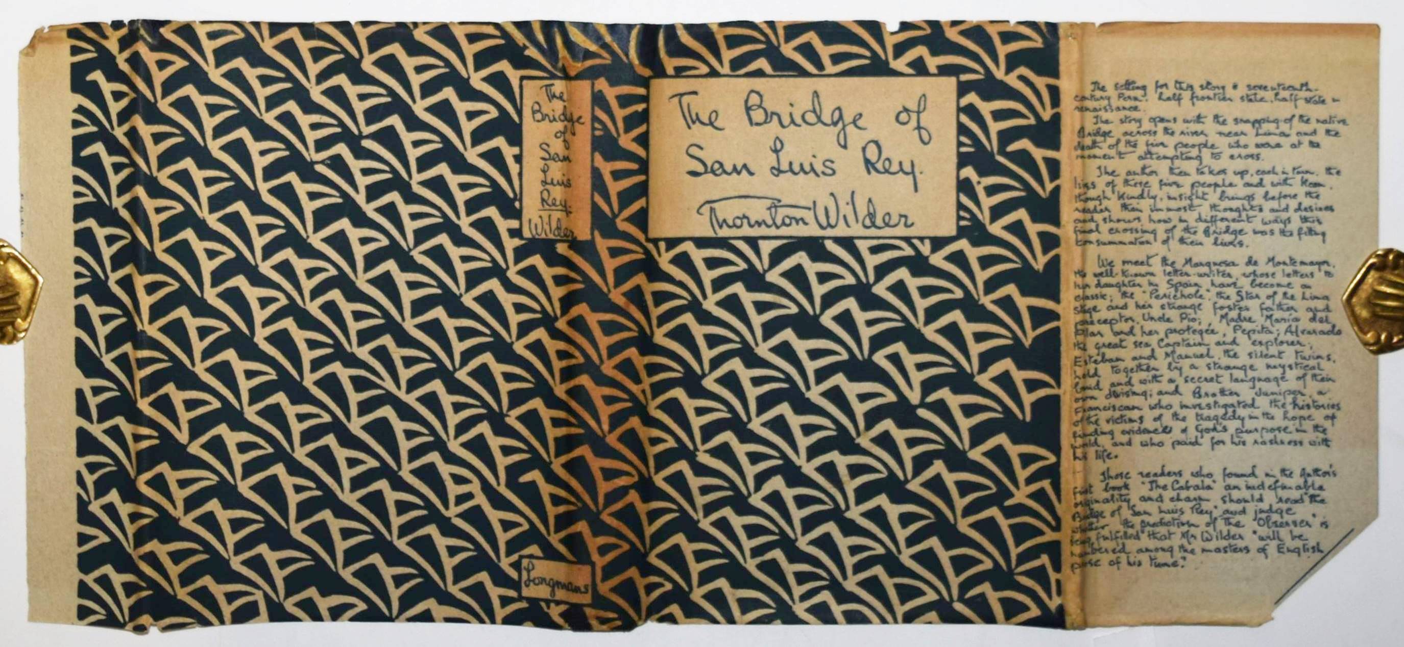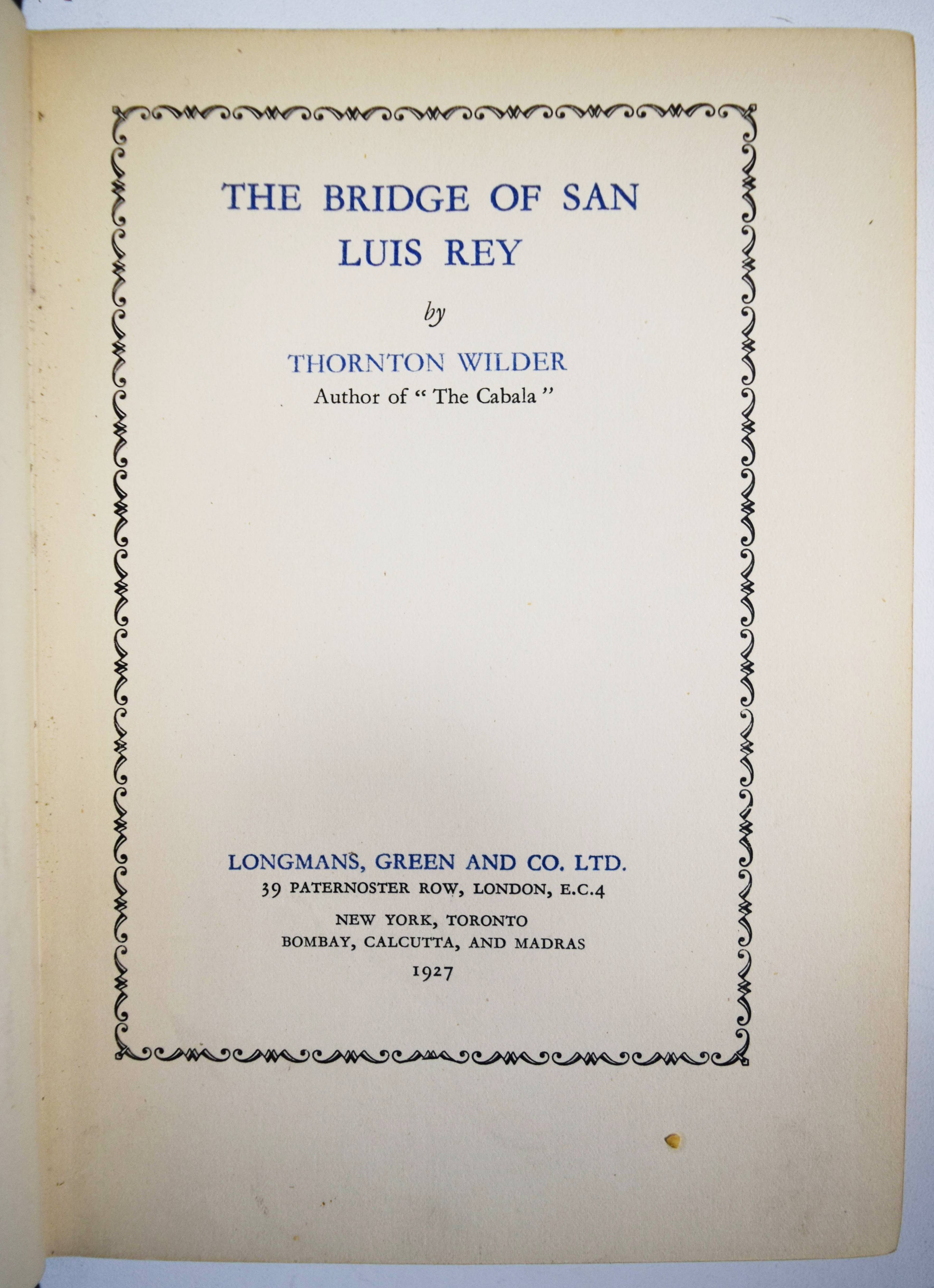 Wilder, Thornton (Niven). The bridge of San Luis Rey. London, Westminster Press for Longmans, Green and Co. 1927. 8°. VII, 139, (2) p. Original cloth binding with gold-stamped spine title and cover signature, and dust jacket. Burke/Howe p. 826. Johnson/Blanck p. 541. – First English edition; „English trade edition issued a few days before American trade edition.“ (Johnson/Blanck). – T. N. Wilder (1897-1975) won his first Pulitzer Price for this novel in 1928, and it was the best-selling work of fiction that year. – „The Bridge of San Luis Rey tells the story of people who die in the collapse of an Inca rope bridge in Peru, and the events that lead up to their being on the bridge. A friar who witnesses the accident then goes about inquiring into the lives of the victims, seeking some sort of cosmic answer to the question of why each had to die. – Wilder explained that the plot was inspired in its external action by a one-act play [Le Carrosse du Saint-Sacrement] by [the French playwright] Prosper Mérimée, which takes place in Latin America and one of whose characters is a courtesan. However, the central idea of the work, the justification for a number of human lives that comes up as a result of the sudden collapse of a bridge, stems from friendly arguments with my father, a strict Calvinist. Strict Puritans imagine God all too easily as a petty schoolmaster who minutely weights guilt against merit, and they overlook God’s ‚Caritas‘ which is more all-encompassing and powerful. God’s love has to transcend his just retribution. But in my novel I have left this question unanswered. As I said earlier, we can only pose the question correctly and clearly, and have faith one will ask the question in the right way“ (Wikipedia). – Dust jacket inconspicuously restored at the top, near fine copy of Wilder’s most famous novel.