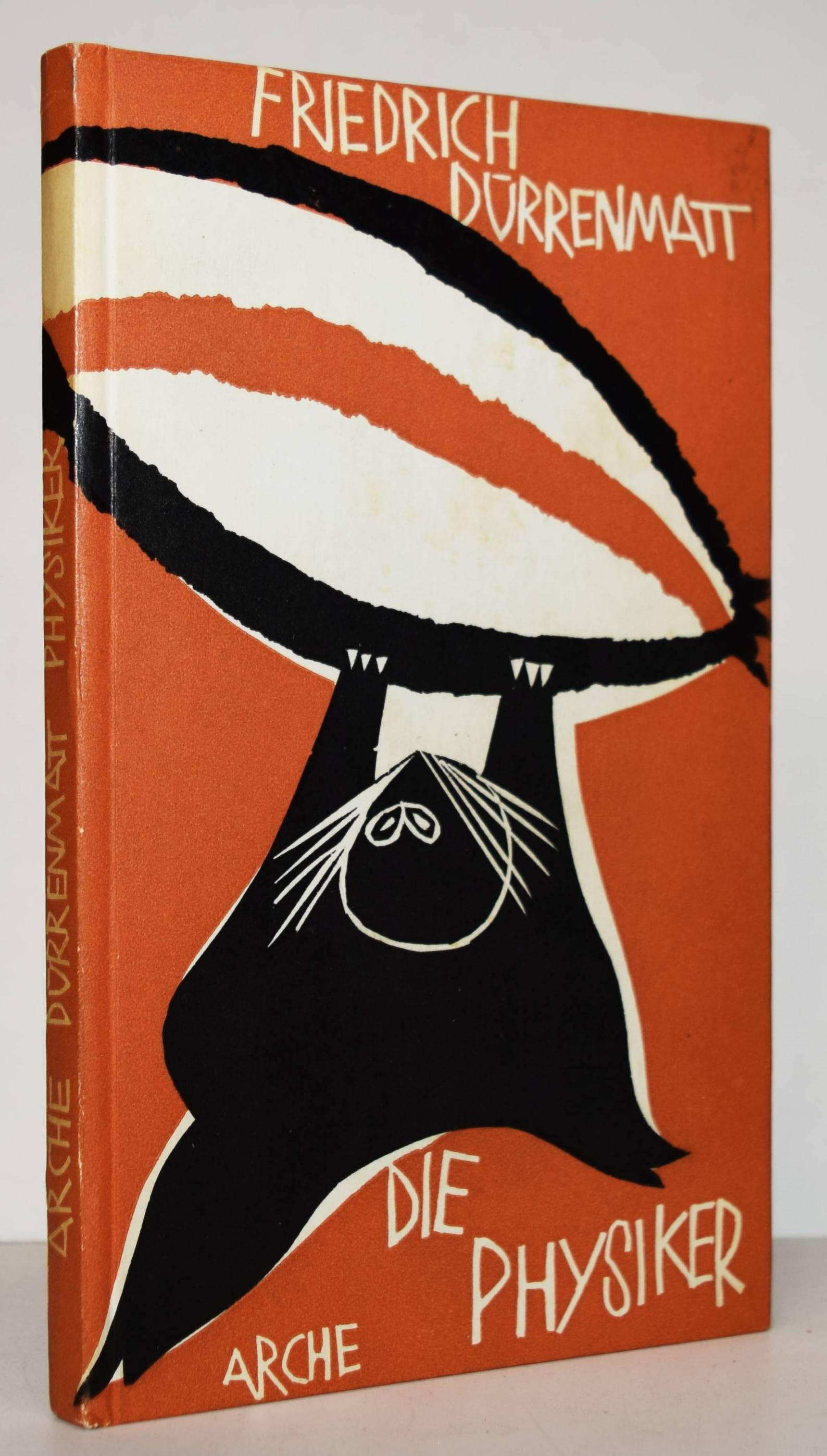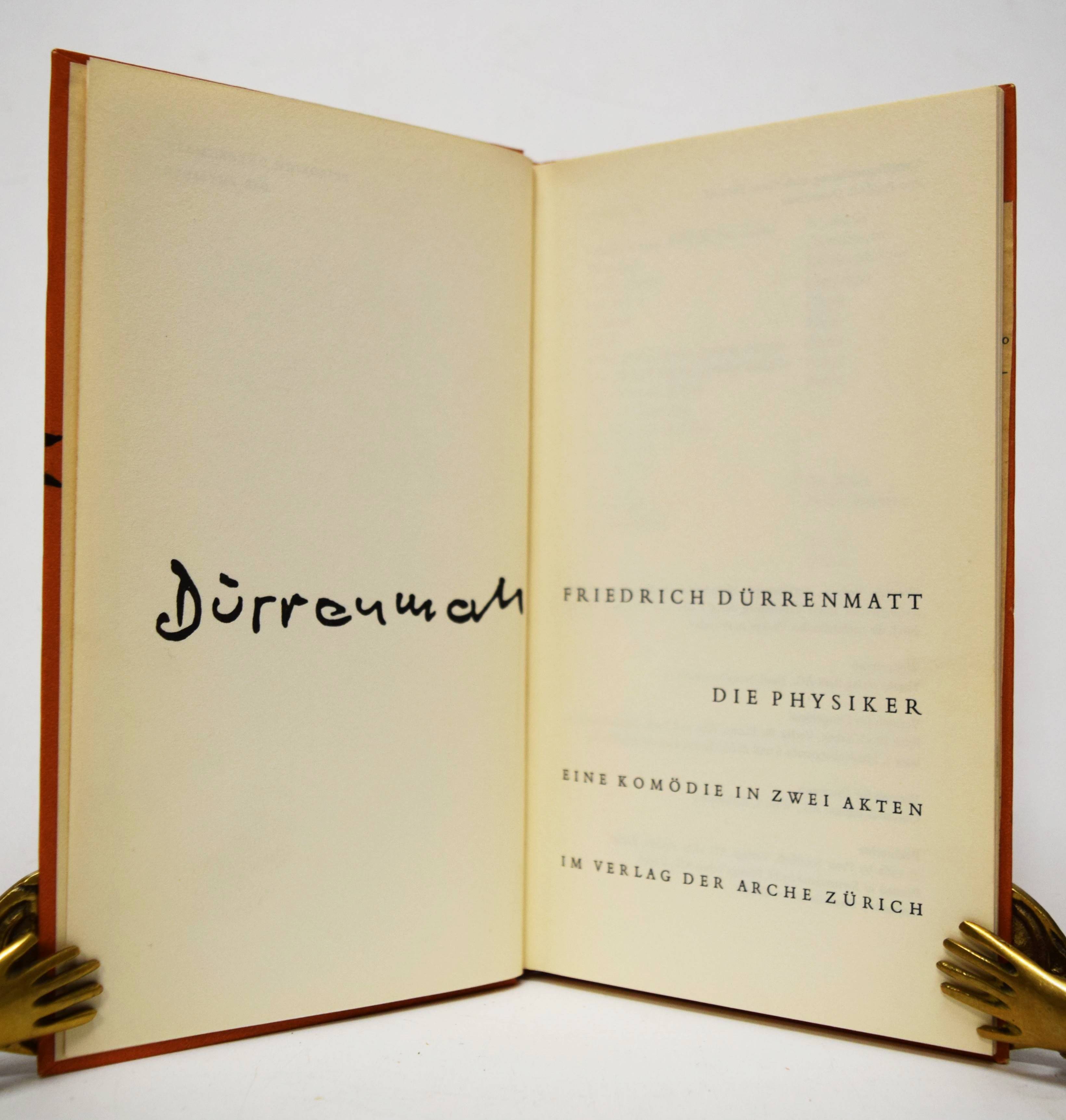 Dürrenmatt, Friedrich. Die Physiker. Eine Komödie in zwei Akten. Zürich, Verlag Die Arche (1962). 8°. 71, (1) S. Farbig illustrierter Orig.-Pappband (nach einem Entwurf von F. Dürrenmatt). W.-G.² 30. – Erste Ausgabe. – Auf dem vorderen freien Vorsatzblatt von F. Dürrenmatt signiert. – Das 1961 entstandene Theaterstück wurde am 21. Februar 1962 unter der Regie von Kurt Horwitz im Schauspielhaus Zürich uraufgeführt. Bereits die Uraufführung der Physiker war ein Erfolg. In der folgenden Saison avancierte das Drama zum meistgespielten Theaterstück im deutschen Sprachraum und gehört heute zu den größten deutschsprachigen Theatererfolgen nach dem Zweiten Weltkrieg. – Ohne den Schutzumschlag, sehr gutes Exemplar.
