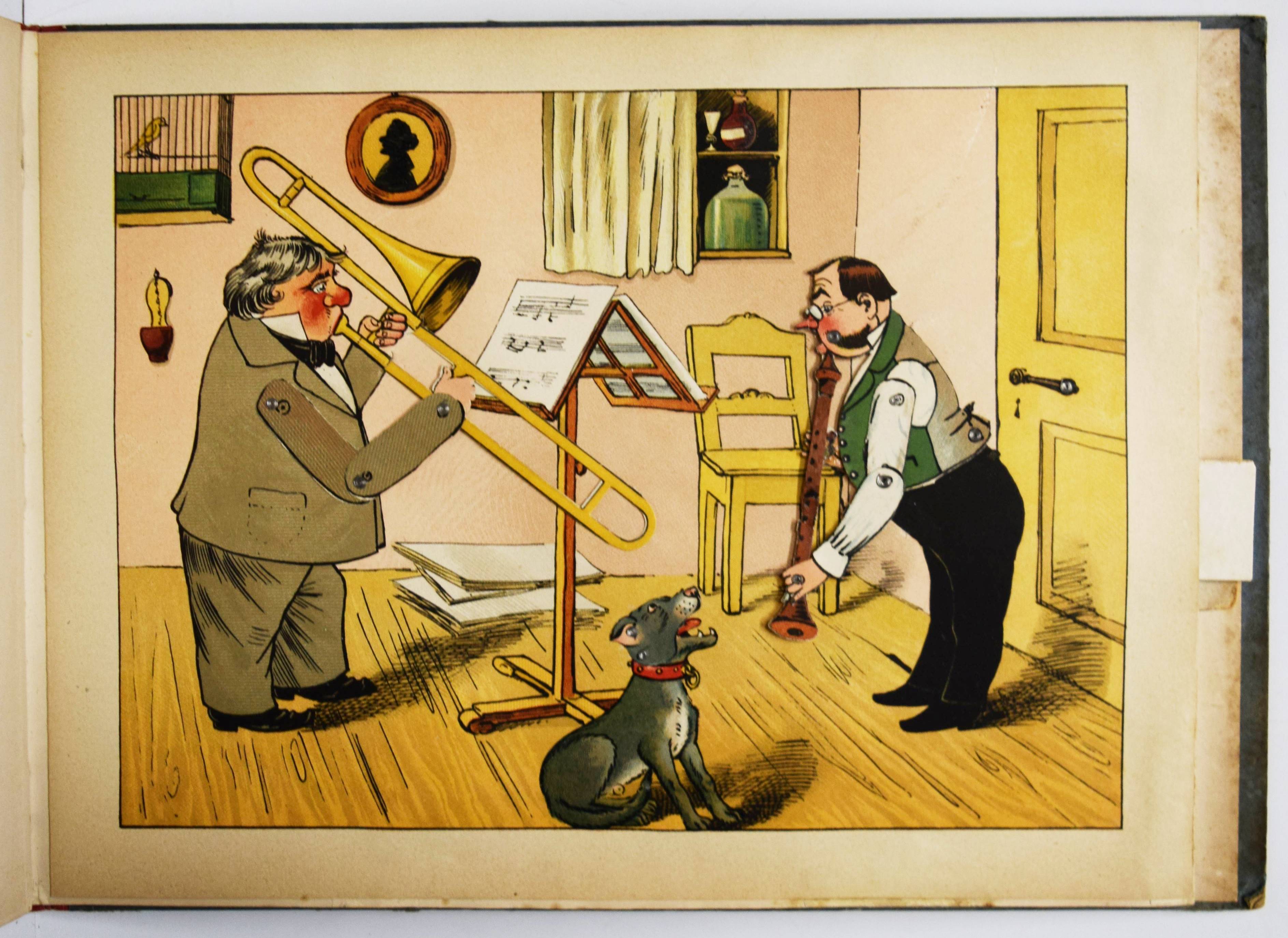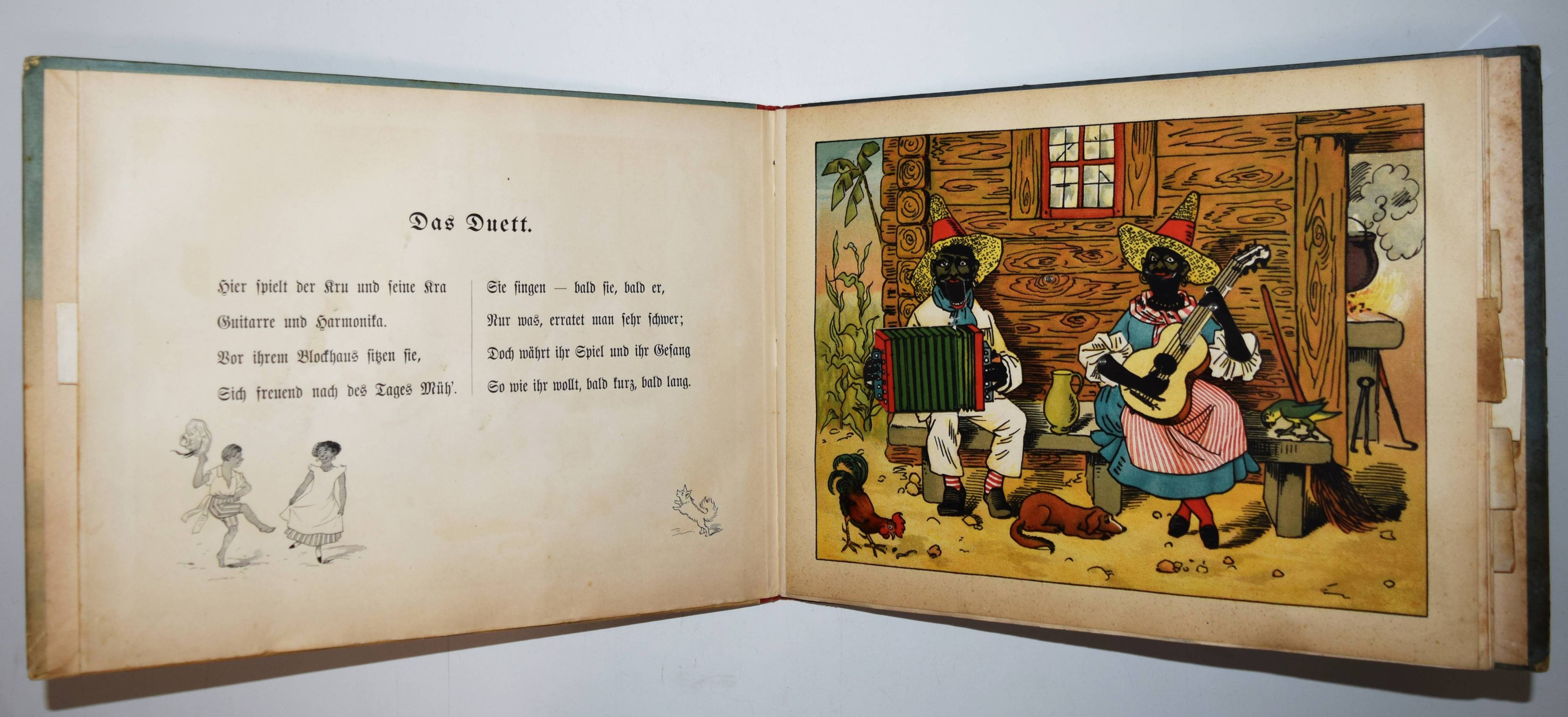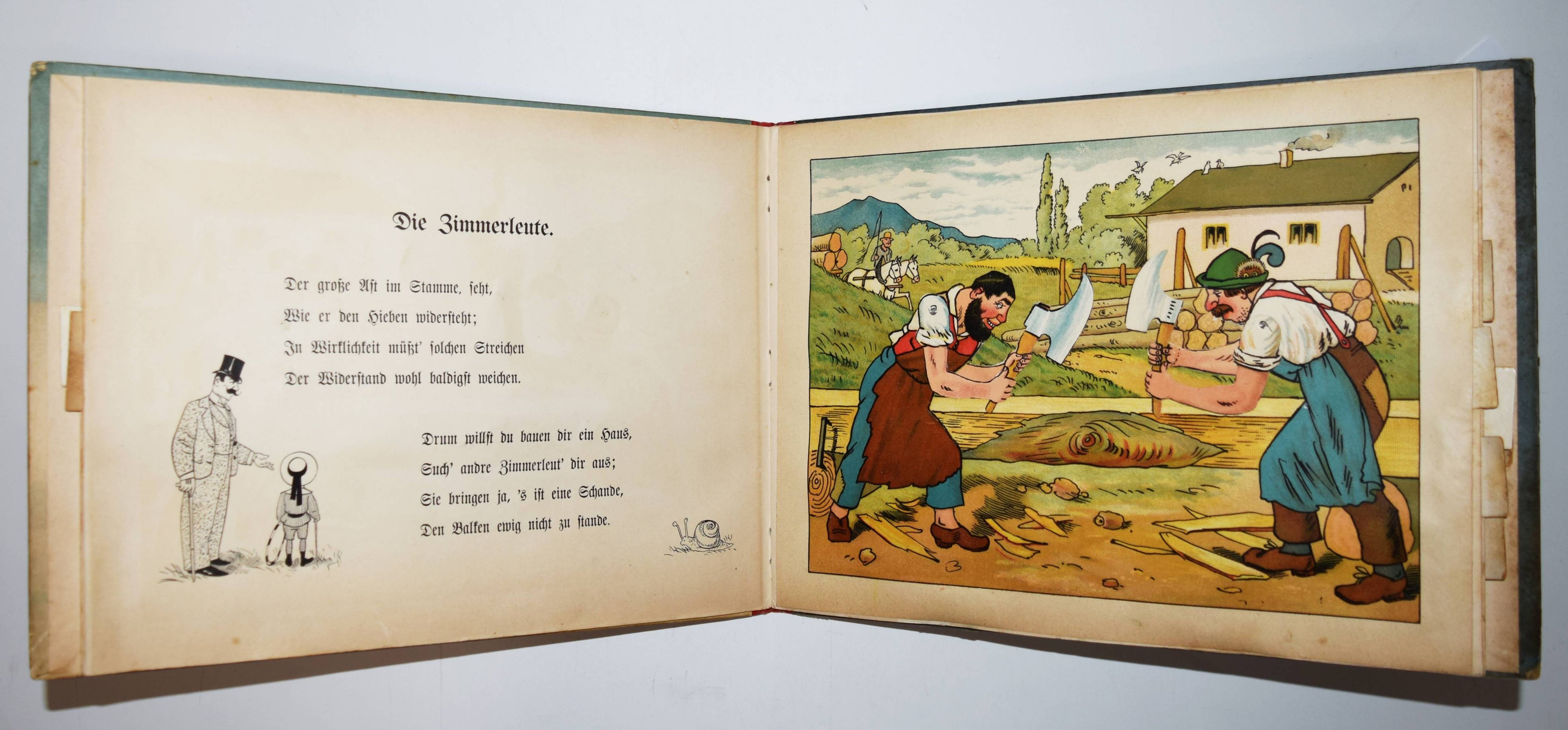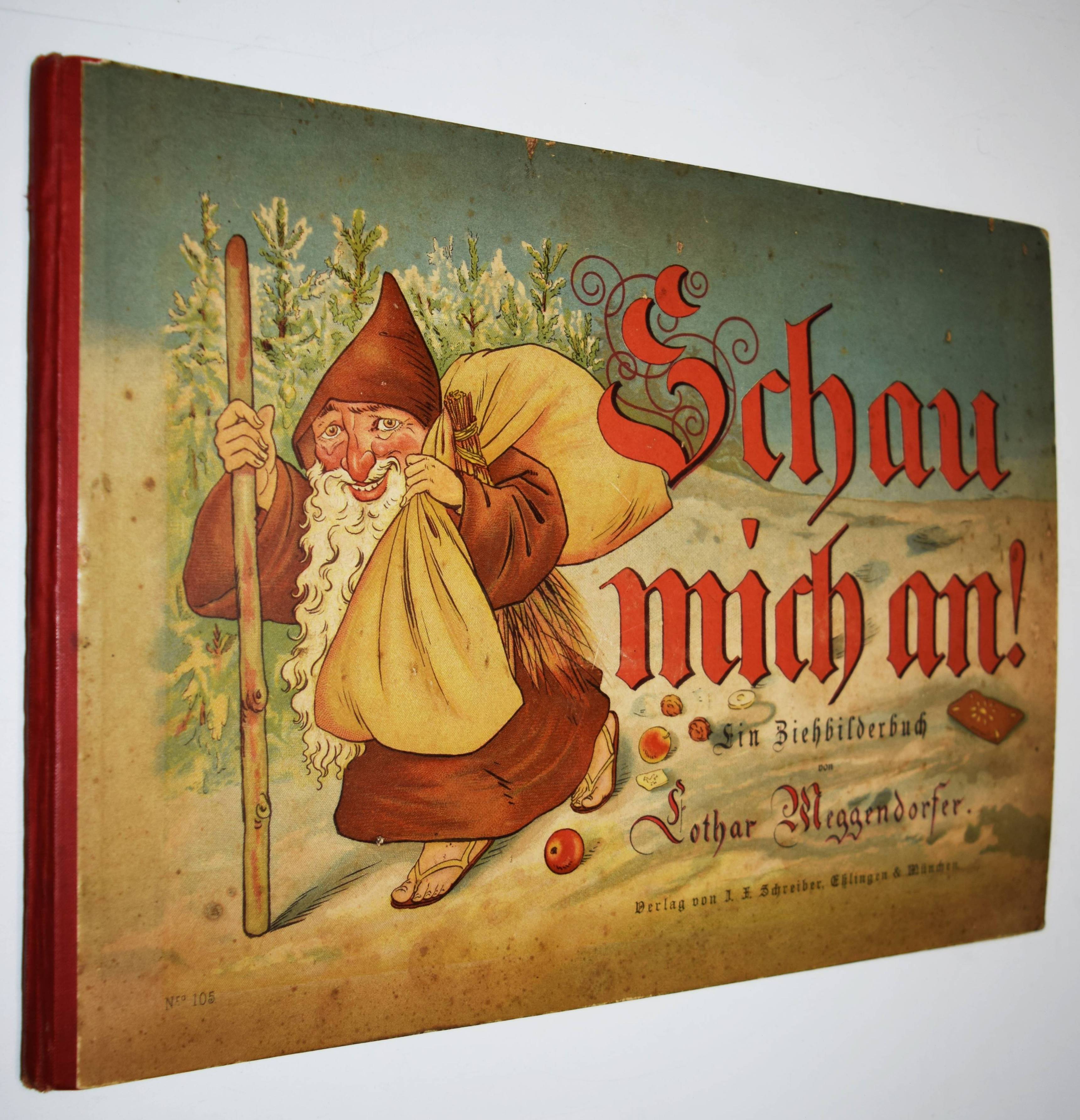 Meggendorfer, Lothar. Schau mich an! Ein Ziehbilderbuch. Esslingen, J. F. Schreiber o. J. (ca. 1899). Quer-4° (26,5 x 36 cm.). [9] Bl. mit 8 farblithogr. Tafeln mit beweglichen Teilen und Ziehmechanismus sowie einigen Illustrationen im Text. Farbig illustr. Orig.-Halbleinenband. (Verlags-Nr. 105). Bilderwelt 2053. Hauswedell 832. Katzenheim 284 ff. Krahé 119 (mit farb. Abb. S. 43, 130 und 146). Klotz, Bilderbücher 3678/131. LKJ II,460. Ries 711, 49. Wegehaupt IV, 1442. – Erschien zuerst 1888. Die Verlagsanzeige auf der Rückseite der letzten Tafel ausschließlich mit Werbung für Meggendorfer-Titel, darunter auch das 1898 erschienene Ziehbilderbuch „Prinz Liliput“. – Eines der bekanntesten Ziehbilderbücher Meggendorfers. Mit den Ziehbildern: St. Nikolaus kommt. – Das Duett. – Die Zimmerleute. – Der störrische Esel. – In der Kinderstube. – Beim Friseur. – Hausmusik. – Der gefoppte Ami. Die letzte Tafel und die Verlagswerbung ist in späteren Auflagen nicht mehr vorhanden. – „In den Ziehbildern dieses Buches präsentiert Meggendorfer eine besonders ausgeklügelte Mechanik, so zum Beispiel in dem Bild von Kru und Kra (Abbildung, siehe Krahé S. 130). Die Bewegungsabläufe der beiden Akteure sind genau aufeinander abgestimmt. Während Kru auf seiner Ziehharmonika spielt, begleitet ihn Kra auf der Gitarre. Nicht nur die Arme, sondern auch die Mundpartien sind beweglich, so daß der Eindruck eines Wechselgesanges entsteht“ (S. Blöcker in Bilderwelt). – Einband etwas berieben und leicht fleckig, das Nikolausbild mit 2 geschlossenen Randeinrissen, im Blattrand und die Ziehstreifen etwas fingerfleckig, sehr gutes und voll funktionsfähiges Exemplar.