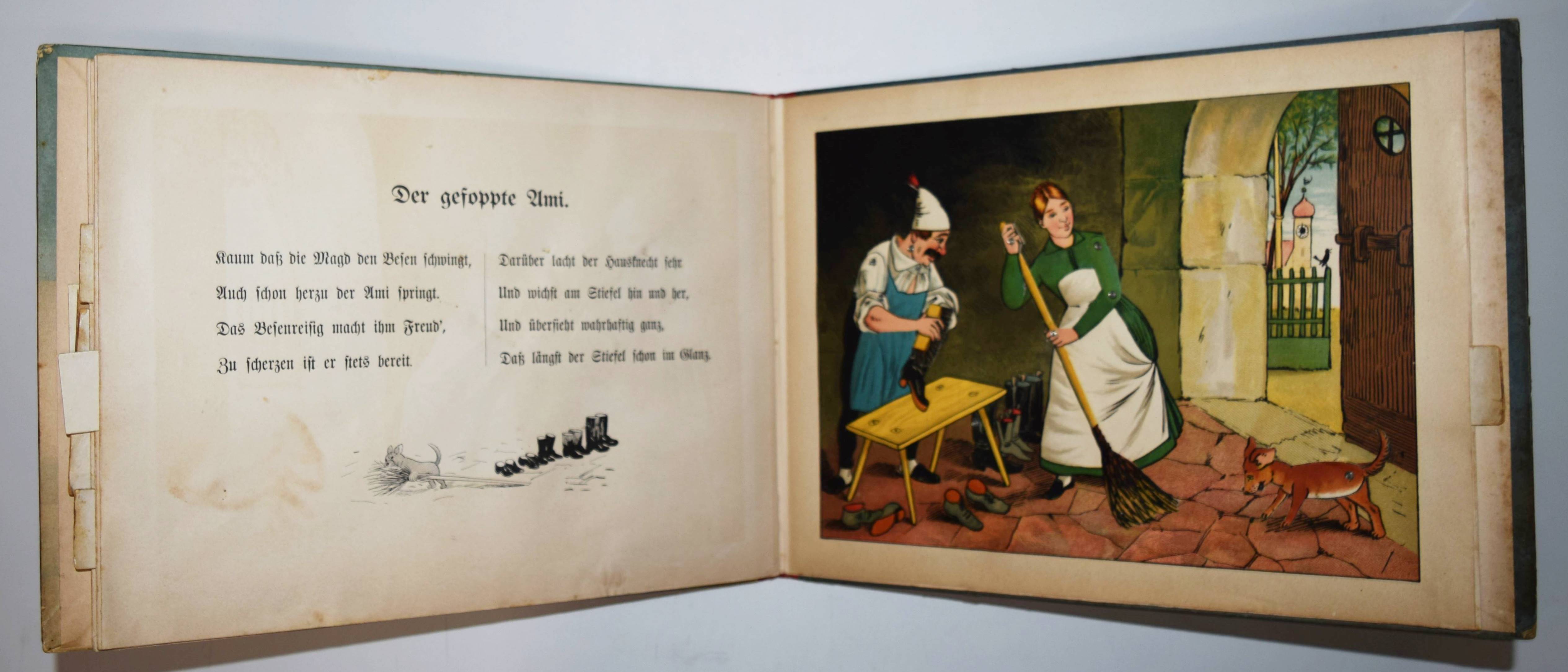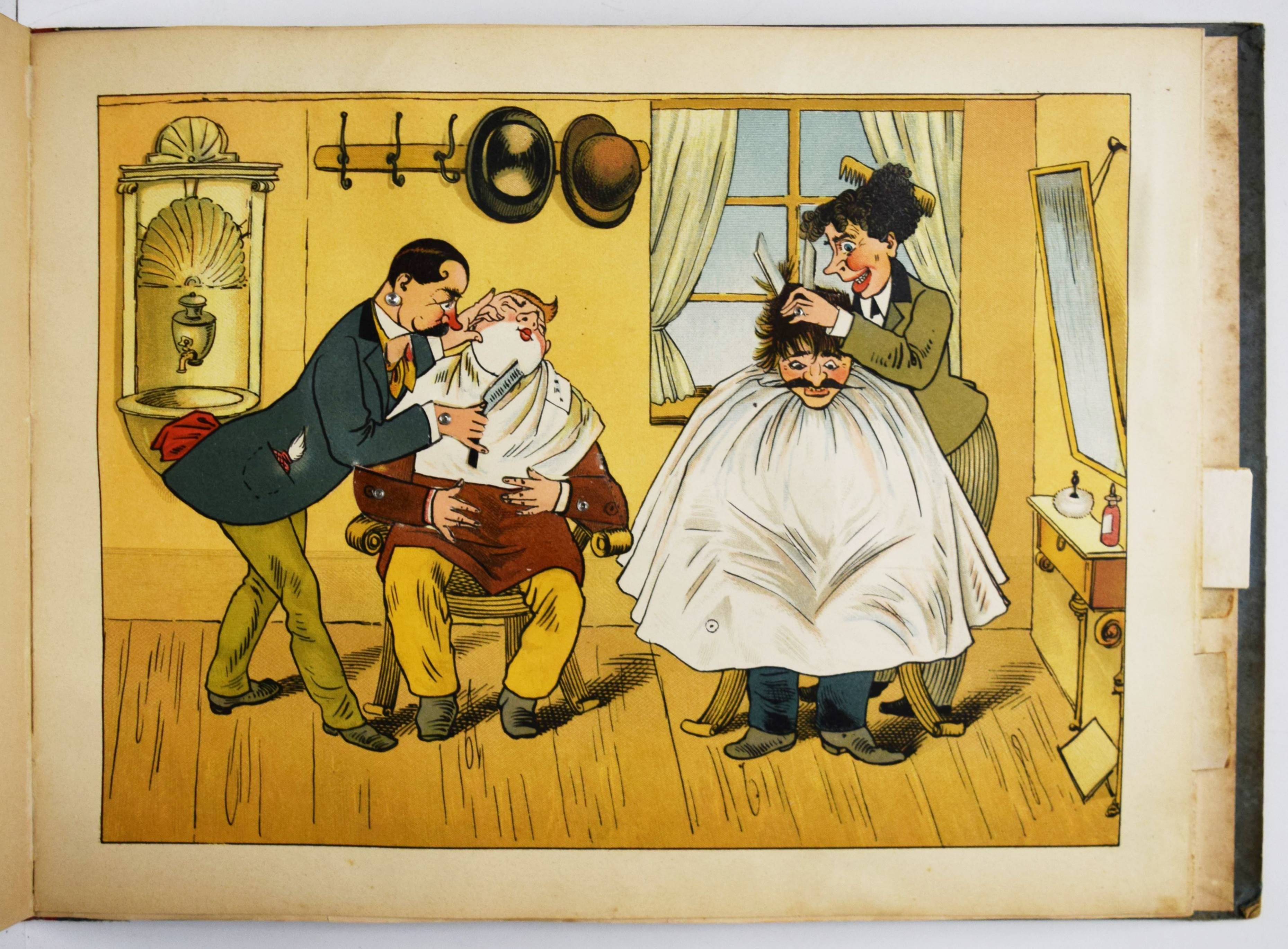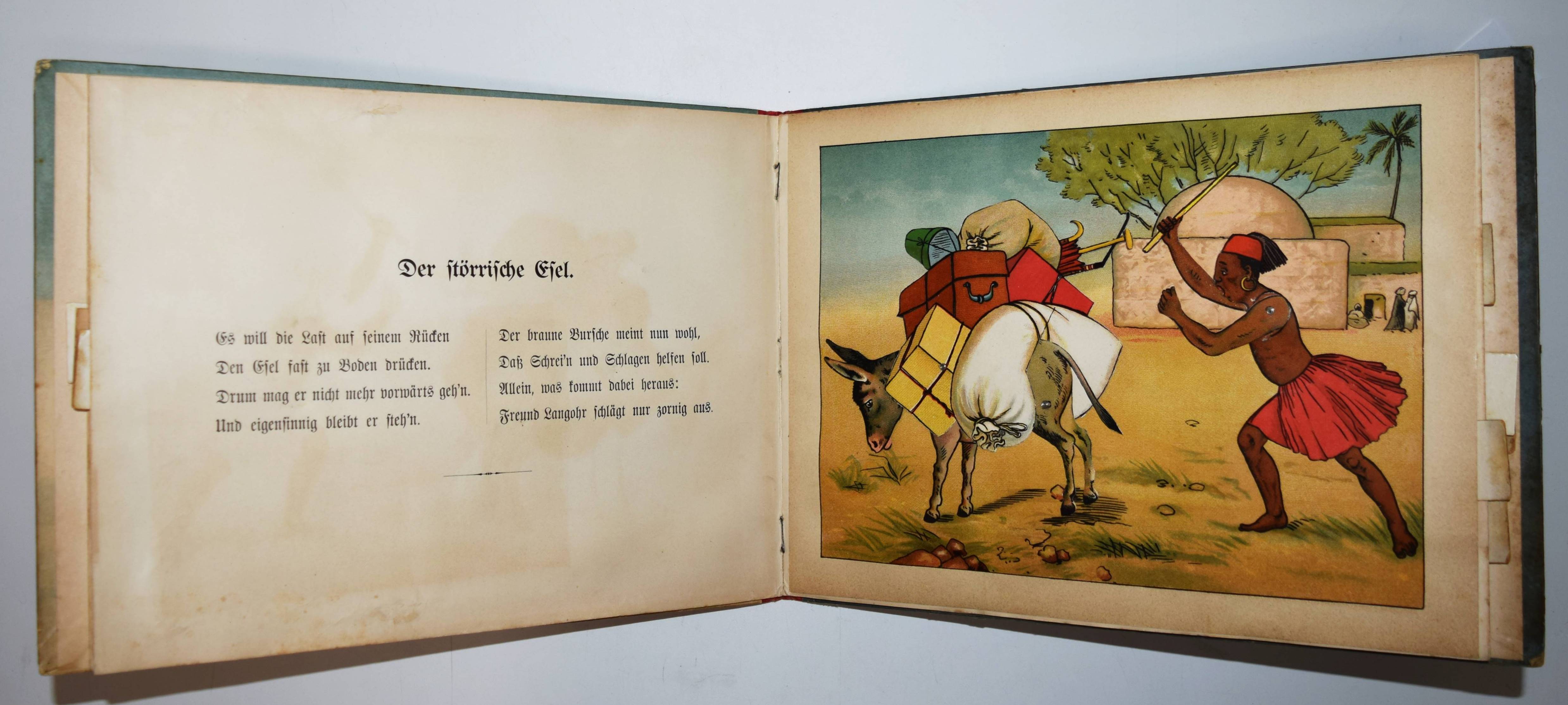 Meggendorfer, Lothar. Schau mich an! Ein Ziehbilderbuch. Esslingen, J. F. Schreiber o. J. (ca. 1899). Quer-4° (26,5 x 36 cm.). [9] Bl. mit 8 farblithogr. Tafeln mit beweglichen Teilen und Ziehmechanismus sowie einigen Illustrationen im Text. Farbig illustr. Orig.-Halbleinenband. (Verlags-Nr. 105). Bilderwelt 2053. Hauswedell 832. Katzenheim 284 ff. Krahé 119 (mit farb. Abb. S. 43, 130 und 146). Klotz, Bilderbücher 3678/131. LKJ II,460. Ries 711, 49. Wegehaupt IV, 1442. – Erschien zuerst 1888. Die Verlagsanzeige auf der Rückseite der letzten Tafel ausschließlich mit Werbung für Meggendorfer-Titel, darunter auch das 1898 erschienene Ziehbilderbuch „Prinz Liliput“. – Eines der bekanntesten Ziehbilderbücher Meggendorfers. Mit den Ziehbildern: St. Nikolaus kommt. – Das Duett. – Die Zimmerleute. – Der störrische Esel. – In der Kinderstube. – Beim Friseur. – Hausmusik. – Der gefoppte Ami. Die letzte Tafel und die Verlagswerbung ist in späteren Auflagen nicht mehr vorhanden. – „In den Ziehbildern dieses Buches präsentiert Meggendorfer eine besonders ausgeklügelte Mechanik, so zum Beispiel in dem Bild von Kru und Kra (Abbildung, siehe Krahé S. 130). Die Bewegungsabläufe der beiden Akteure sind genau aufeinander abgestimmt. Während Kru auf seiner Ziehharmonika spielt, begleitet ihn Kra auf der Gitarre. Nicht nur die Arme, sondern auch die Mundpartien sind beweglich, so daß der Eindruck eines Wechselgesanges entsteht“ (S. Blöcker in Bilderwelt). – Einband etwas berieben und leicht fleckig, das Nikolausbild mit 2 geschlossenen Randeinrissen, im Blattrand und die Ziehstreifen etwas fingerfleckig, sehr gutes und voll funktionsfähiges Exemplar.