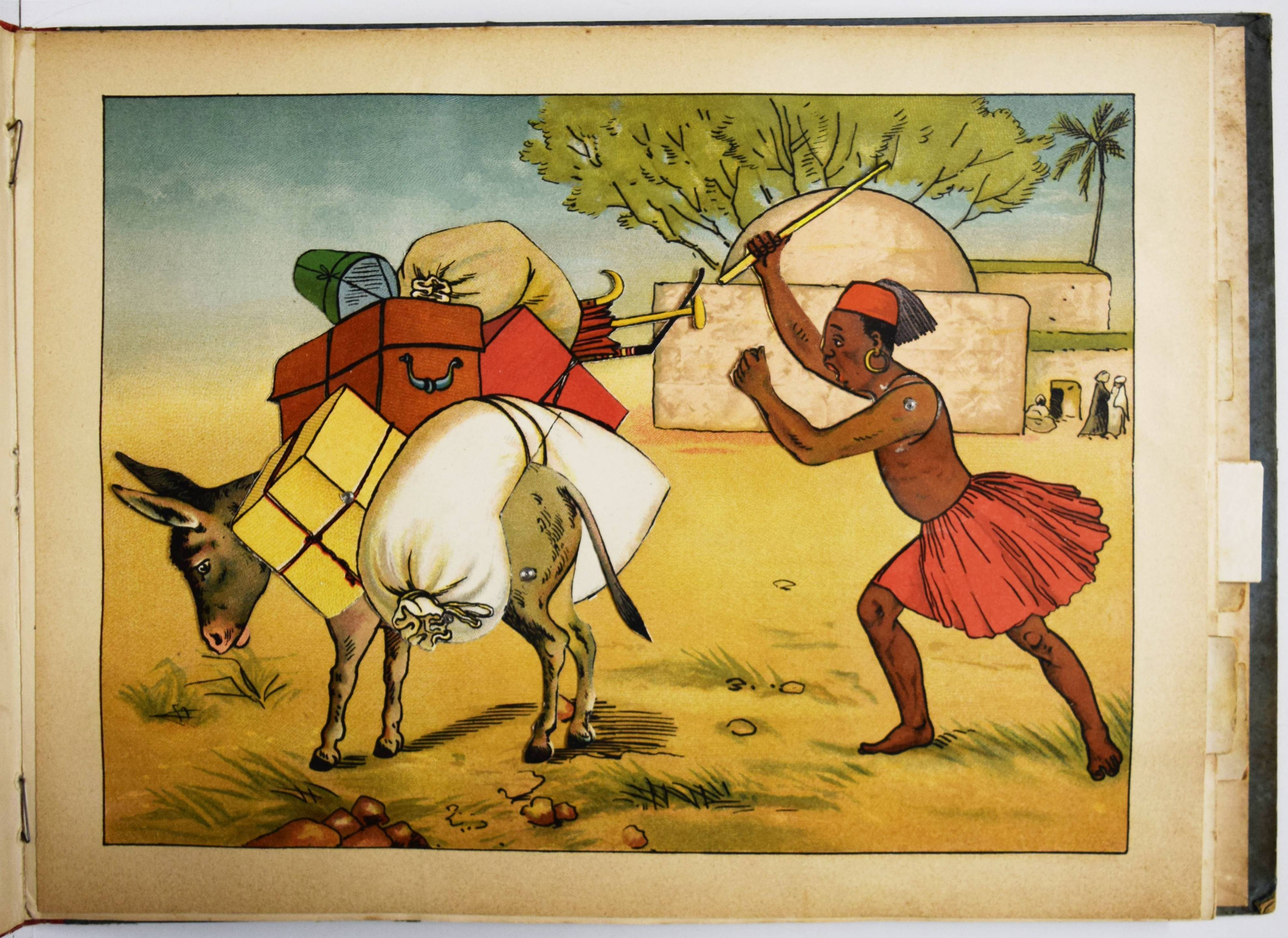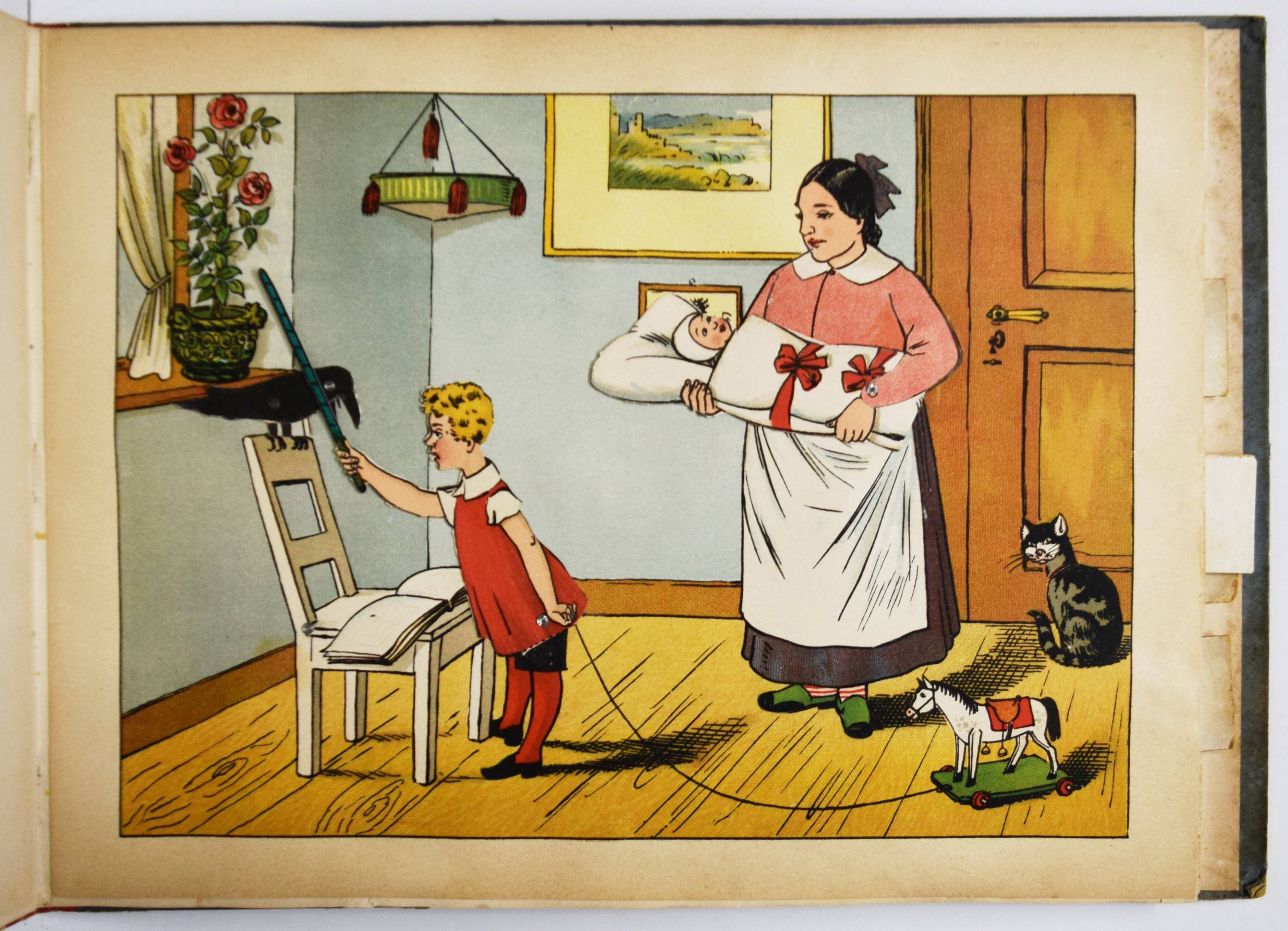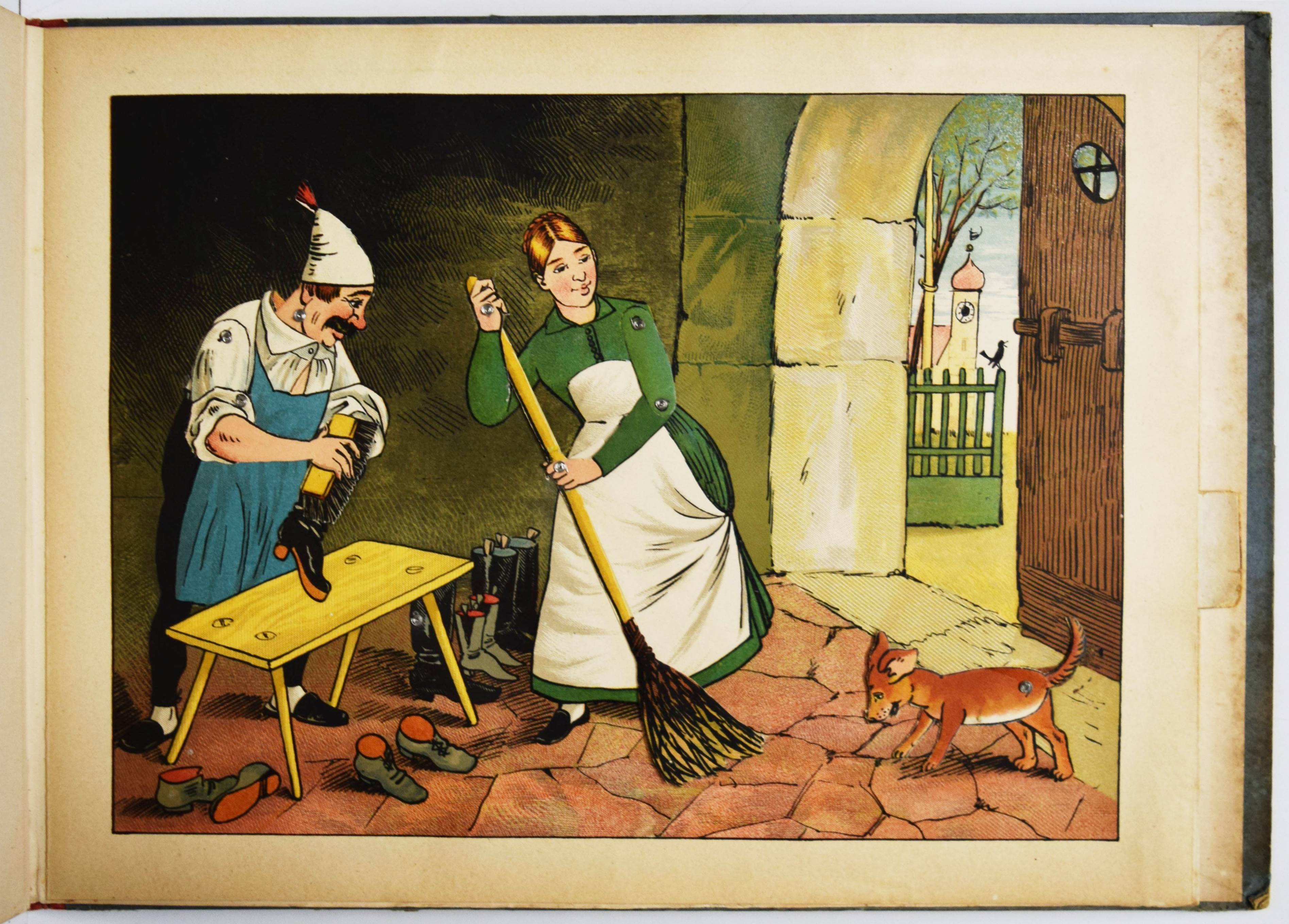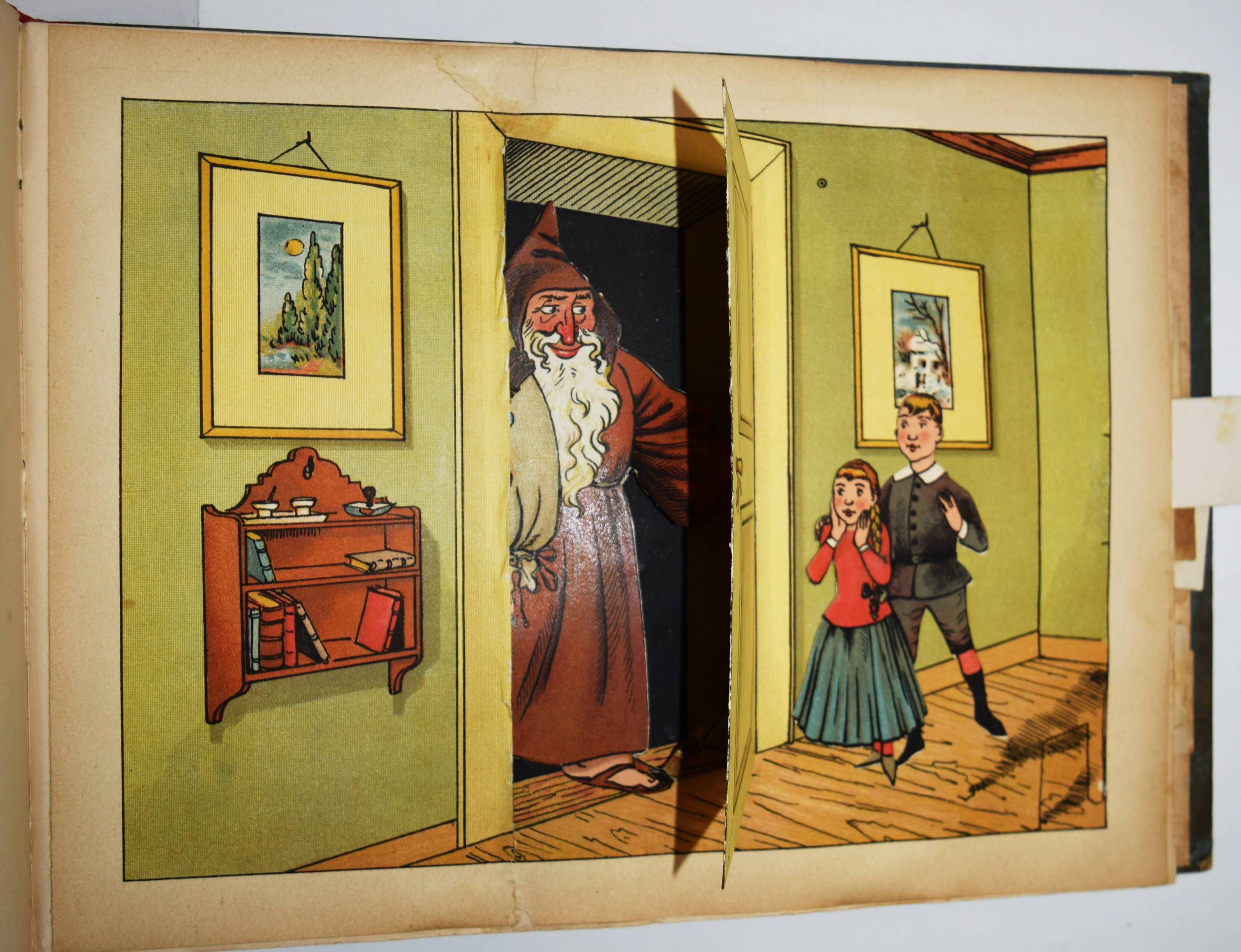 Meggendorfer, Lothar. Schau mich an! Ein Ziehbilderbuch. Esslingen, J. F. Schreiber o. J. (ca. 1899). Quer-4° (26,5 x 36 cm.). [9] Bl. mit 8 farblithogr. Tafeln mit beweglichen Teilen und Ziehmechanismus sowie einigen Illustrationen im Text. Farbig illustr. Orig.-Halbleinenband. (Verlags-Nr. 105). Bilderwelt 2053. Hauswedell 832. Katzenheim 284 ff. Krahé 119 (mit farb. Abb. S. 43, 130 und 146). Klotz, Bilderbücher 3678/131. LKJ II,460. Ries 711, 49. Wegehaupt IV, 1442. – Erschien zuerst 1888. Die Verlagsanzeige auf der Rückseite der letzten Tafel ausschließlich mit Werbung für Meggendorfer-Titel, darunter auch das 1898 erschienene Ziehbilderbuch „Prinz Liliput“. – Eines der bekanntesten Ziehbilderbücher Meggendorfers. Mit den Ziehbildern: St. Nikolaus kommt. – Das Duett. – Die Zimmerleute. – Der störrische Esel. – In der Kinderstube. – Beim Friseur. – Hausmusik. – Der gefoppte Ami. Die letzte Tafel und die Verlagswerbung ist in späteren Auflagen nicht mehr vorhanden. – „In den Ziehbildern dieses Buches präsentiert Meggendorfer eine besonders ausgeklügelte Mechanik, so zum Beispiel in dem Bild von Kru und Kra (Abbildung, siehe Krahé S. 130). Die Bewegungsabläufe der beiden Akteure sind genau aufeinander abgestimmt. Während Kru auf seiner Ziehharmonika spielt, begleitet ihn Kra auf der Gitarre. Nicht nur die Arme, sondern auch die Mundpartien sind beweglich, so daß der Eindruck eines Wechselgesanges entsteht“ (S. Blöcker in Bilderwelt). – Einband etwas berieben und leicht fleckig, das Nikolausbild mit 2 geschlossenen Randeinrissen, im Blattrand und die Ziehstreifen etwas fingerfleckig, sehr gutes und voll funktionsfähiges Exemplar.