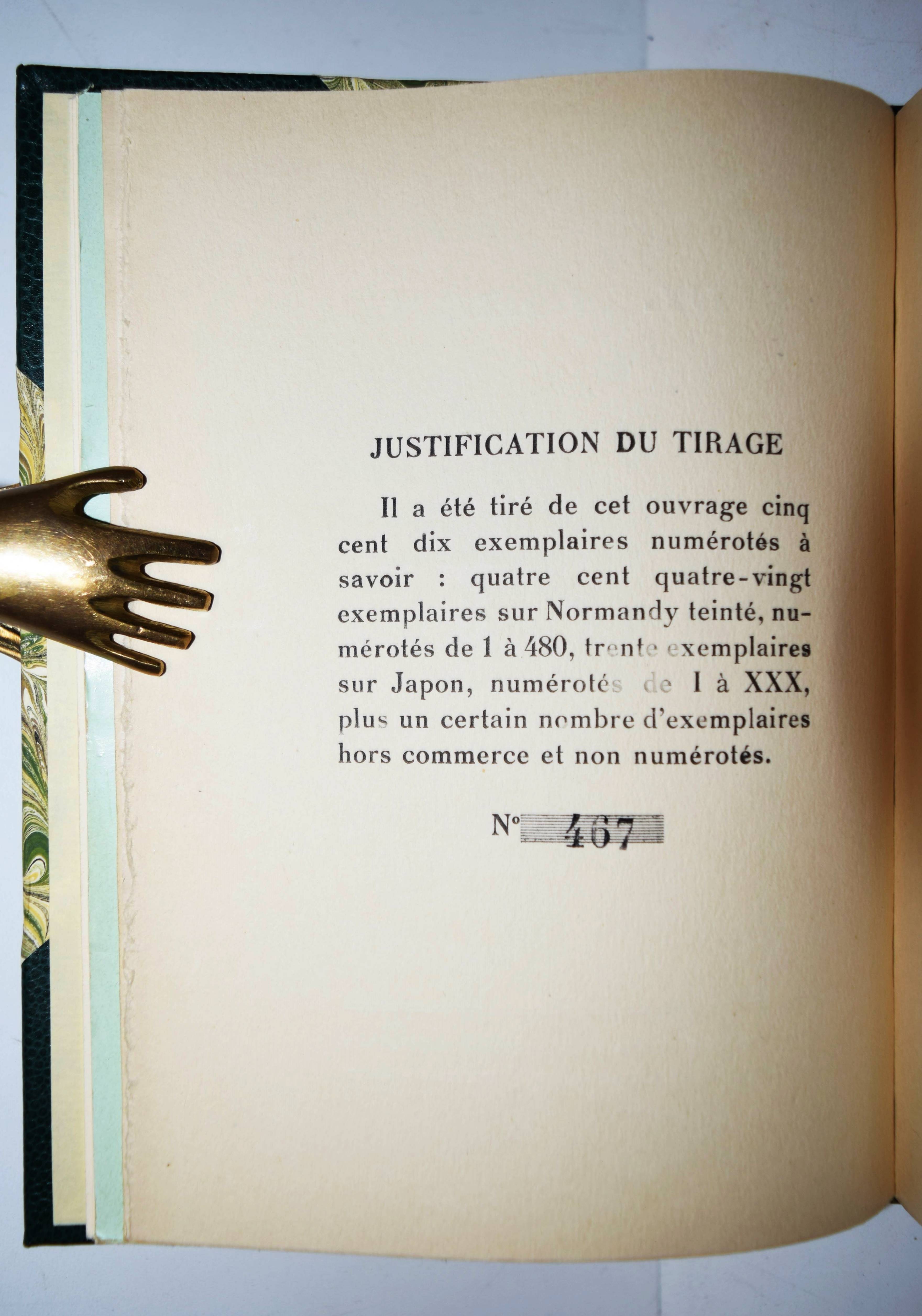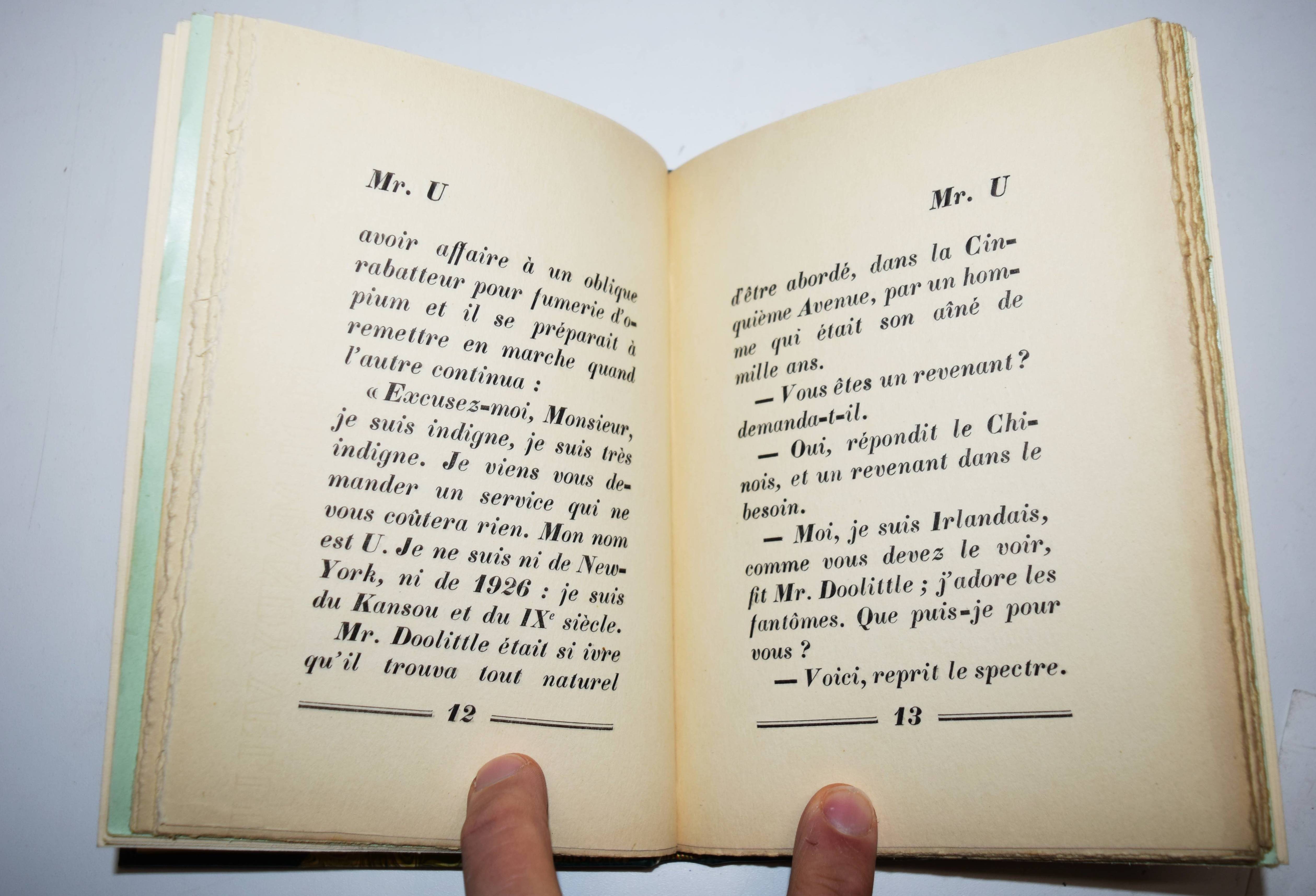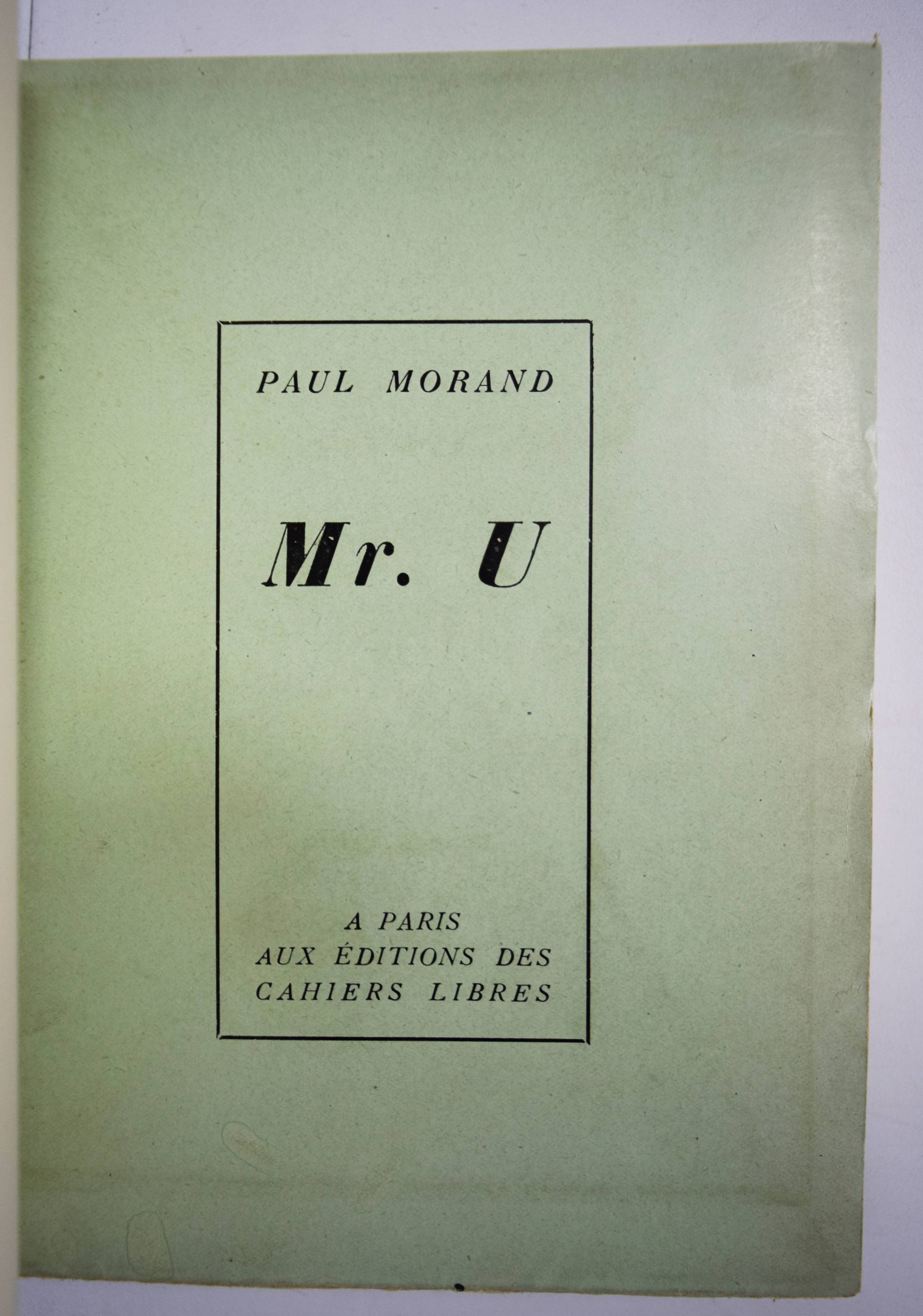 Morand, Paul. Mr. U. Paris, Éditions des Cahiers Libres 1927. 8°. 38 S., [1] Bl. mit 1 Kaltnadel-Radierung von Tsuguharu-Léonard Foujita. Dunkelgrüner Halblederband mit goldgepr. Rückentitel (signiert B. Salvignol, typogr. Orig.-Umschlag beigebunden). Monod 8447. – Eines von 480 num. Exemplaren auf Normandy teinté (Gesamtauflage 510 Exemplare). – Die makabere Kaltnadel-Radierung des japanisch-französischer Malers und Graphikers T. L. Foujita (1886-1968) zeigt den Chinesen „Mr. U.“, bis zum Skelett abgemagert mit einem Huhn an einer Leine. Paul Morand (1888-1976) schätzte Foujita als den einzigen japanischen Künstler, dem in Frankreich ein echter Durchbruch gelang. Beide waren zentrale Figuren der Pariser Bohème und gehörten zur internationalen Kunstszene von Montparnasse. 1928 veröffentlichte Morand die erste Monographie über Foujita. – Sehr schönes Exemplar in einem signierten Handeinband.