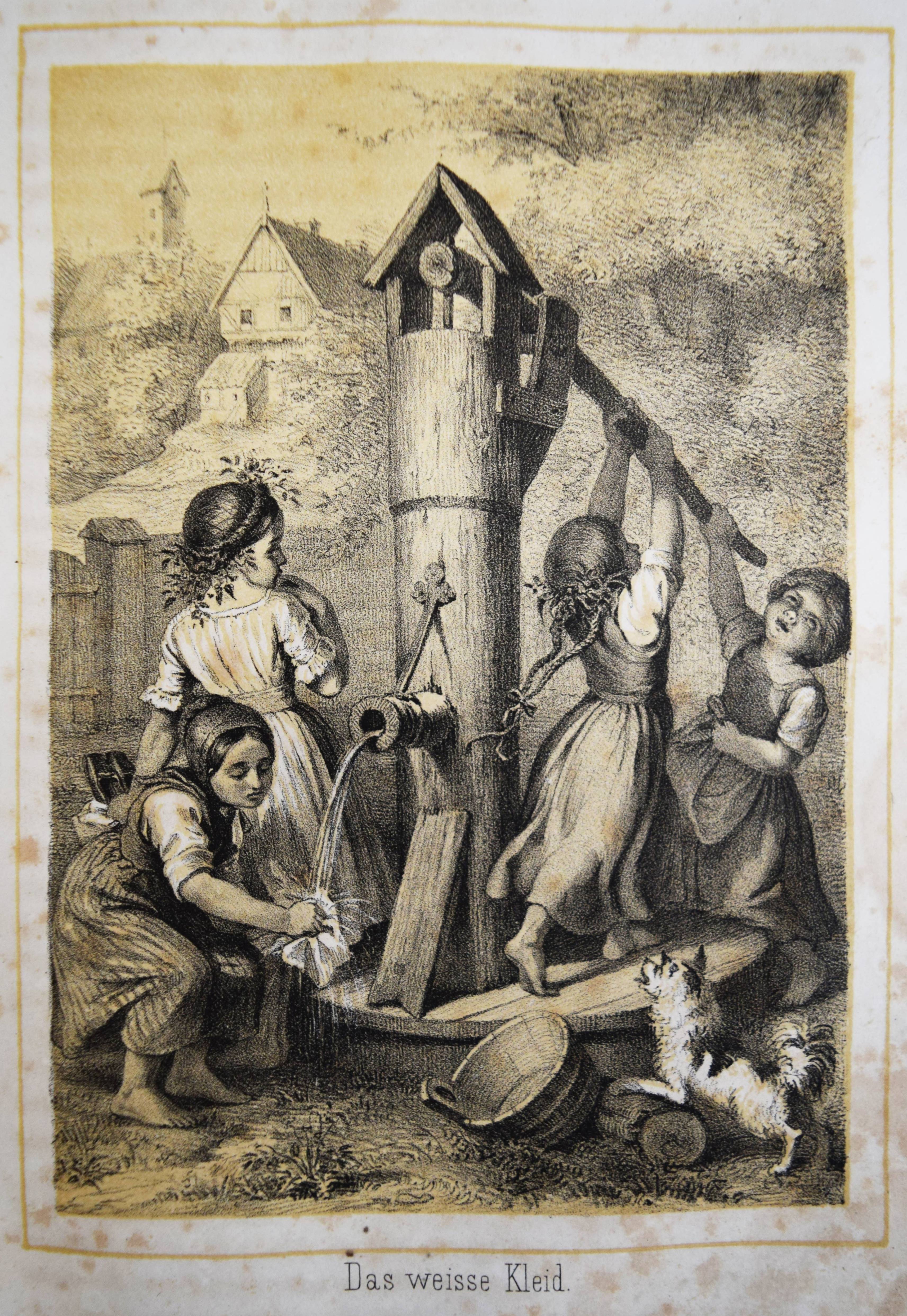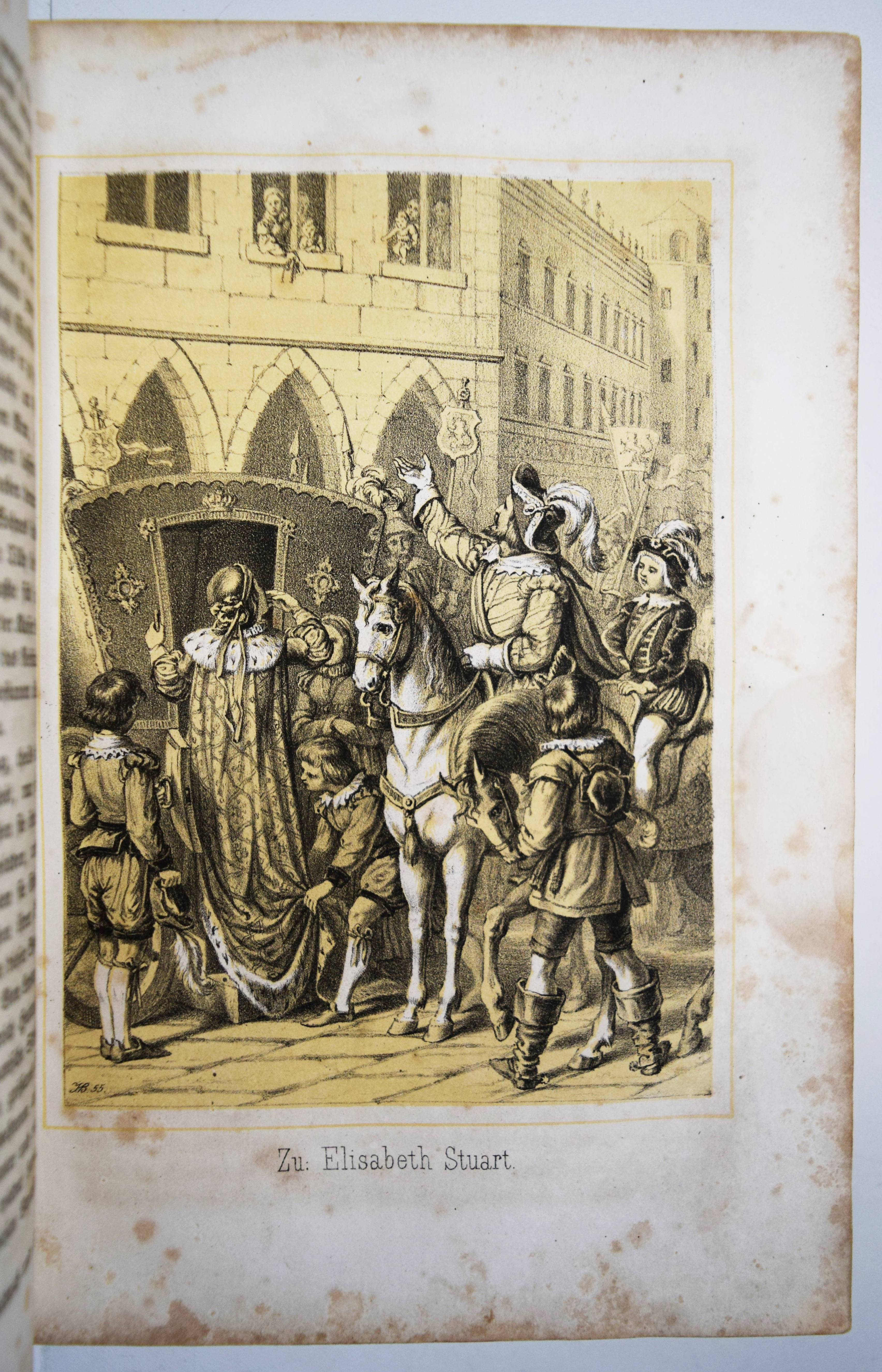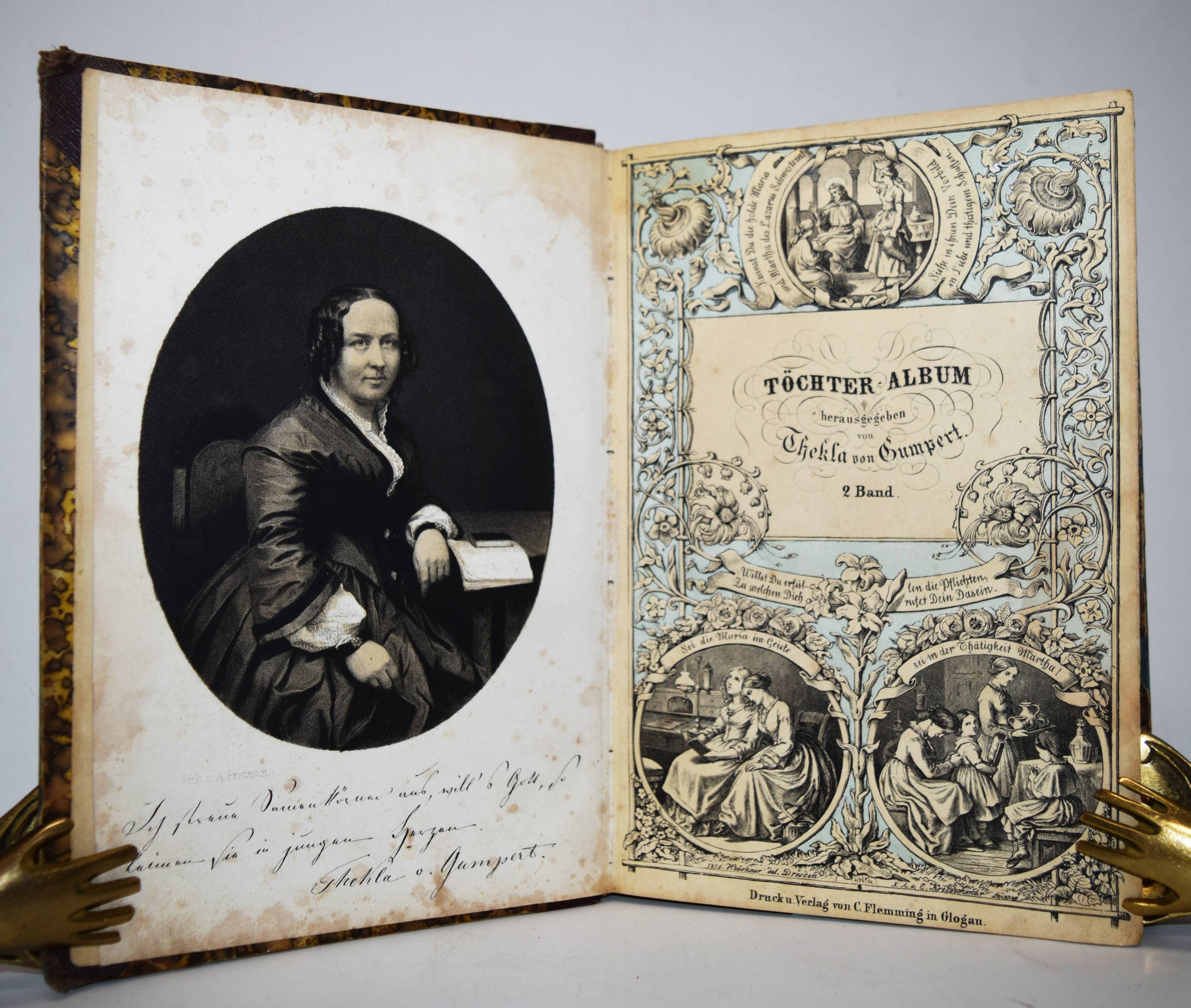 Gumpert, Thekla v. (d. i. Thekla von Schober, Hrsg.). Töchter-Album. Unterhaltungen im häuslichen Kreise zur Bildung des Verstandes und Gemüthes der heranwachsenden weiblichen Jugend. Zweiter Band. Glogau, Carl Flemming o. J. (1856). Gr.-8°. VII, 574 S., [1] Bl. mit lithogr. Portrait-Frontispiz, lithogr. illustr. hellblau lavierter Titel und 29 lithogr. Tafeln von (Hugo) Bürkner und H(ermann) Wagner. Halblederband der Zeit mit goldgepr. Rückentitel und Romantikervergoldung. Bilderwelt 1290. HKJL IV, 910. Hobrecker, Braunschweig 7848. LKJ I, 512 und III, 544 f. Seebaß II, 2053. Wegehaupt IV, 2737. – Seltener zweiter Jahrgang des, neben dem „Herzblättchen“ erfolgreichsten Mädchen-Jahrbuchs des 19. Jahrhunderts. – „Absicht der Herausgeberin und Inhalt lassen sich aus dem Motto ablesen, welches sich auf den hübsch lithographierten Titeln findet: „Willst du erfüllen die Pflichten, zu welchen Dich rufet Dein Dasein, Sei die Maria im Geist, sei in der Thätig keit Martha!“. Der Inhalt setzt sich aus Erzählungen, Biographien, geschichtlichen und kulturgeschichtlichen Schilderungen, naturwissenschaftlichen Artikeln, Anleitungen zu Beschäftigungen usw. zusammen. Die Illustrationen sind oft bemerkenswert“ (A. Seebaß). – Rücken etwas berieben, durchgehend teils stärker braunfleckig, noch gutes Exemplar.