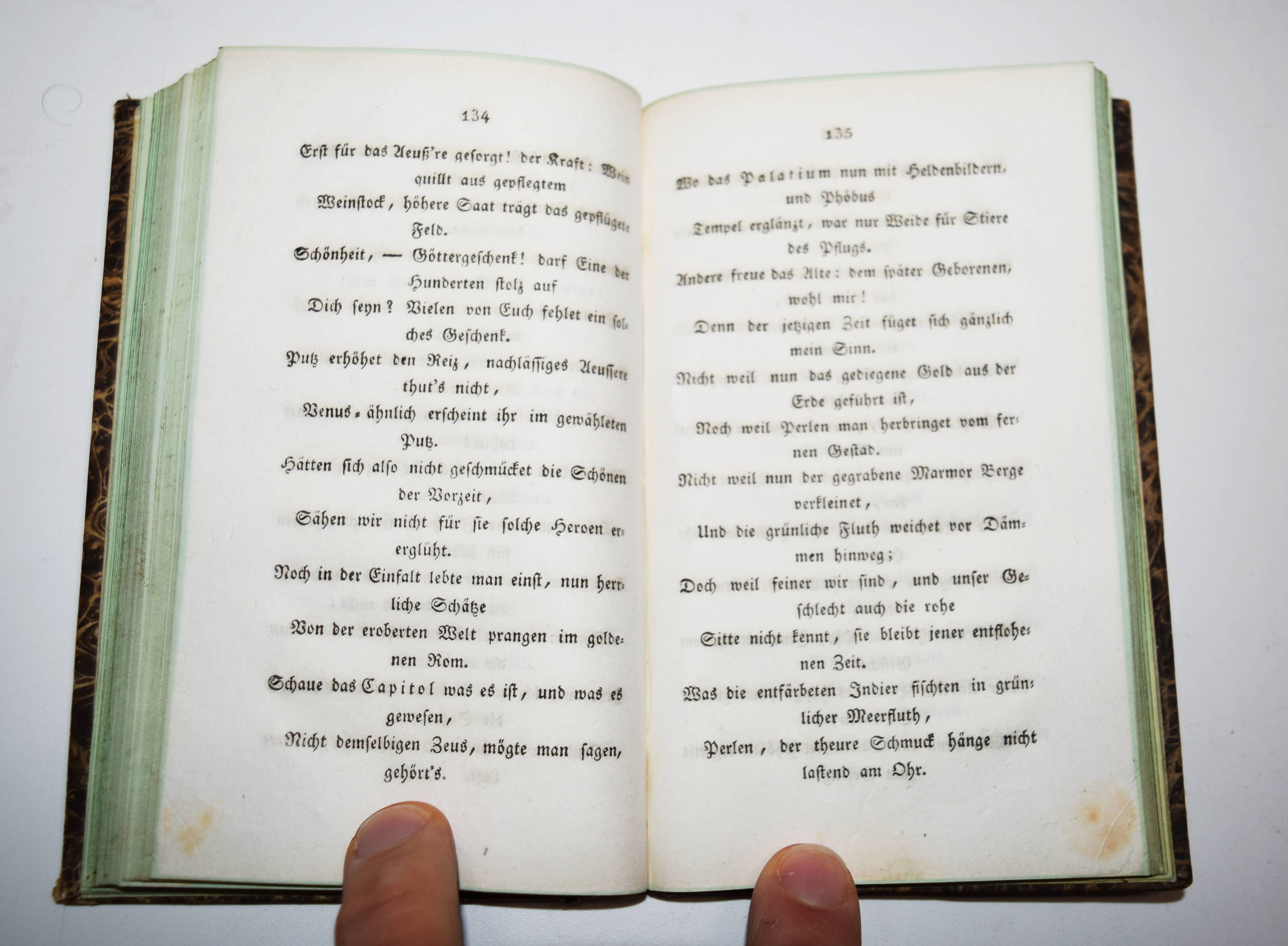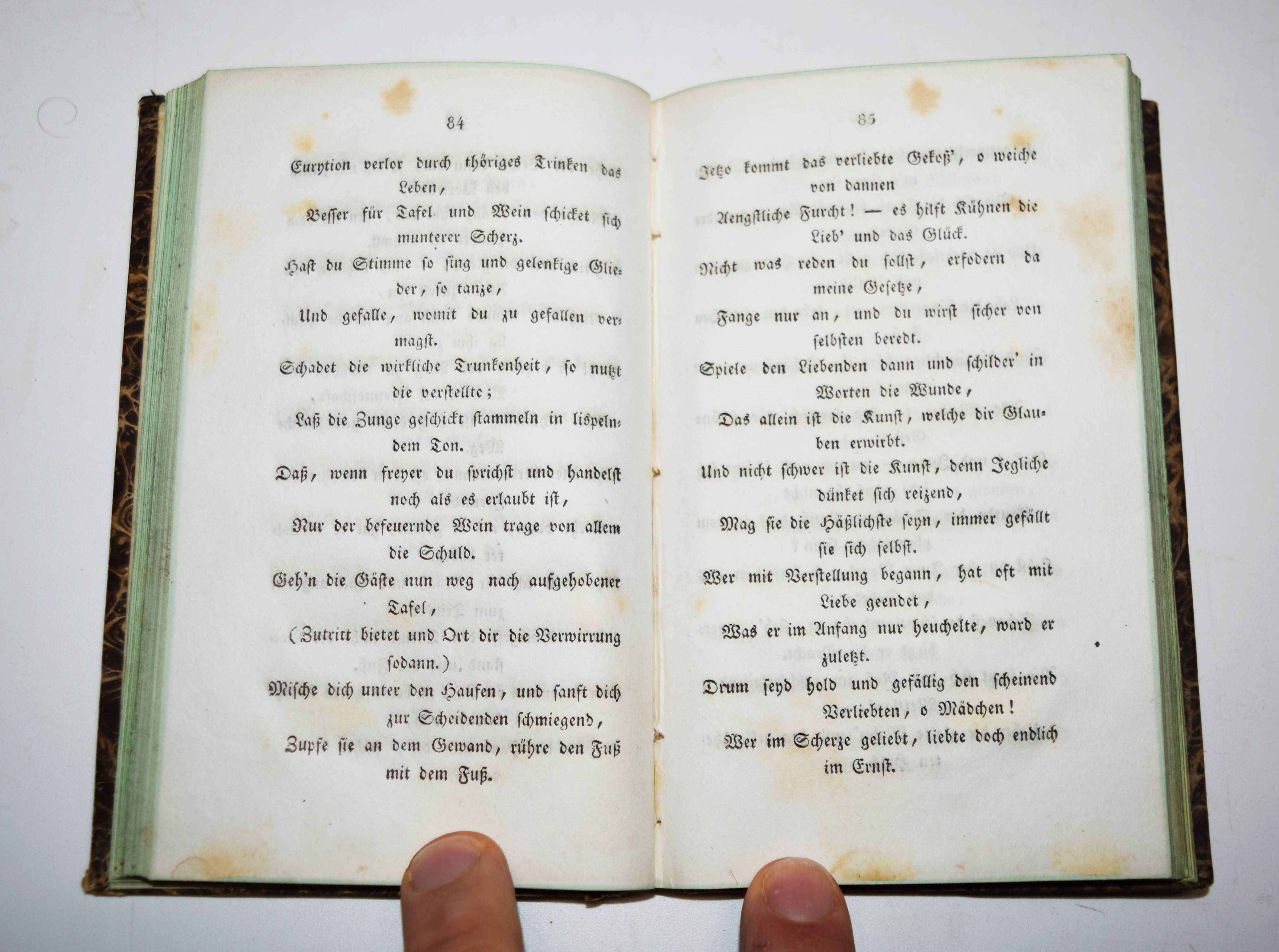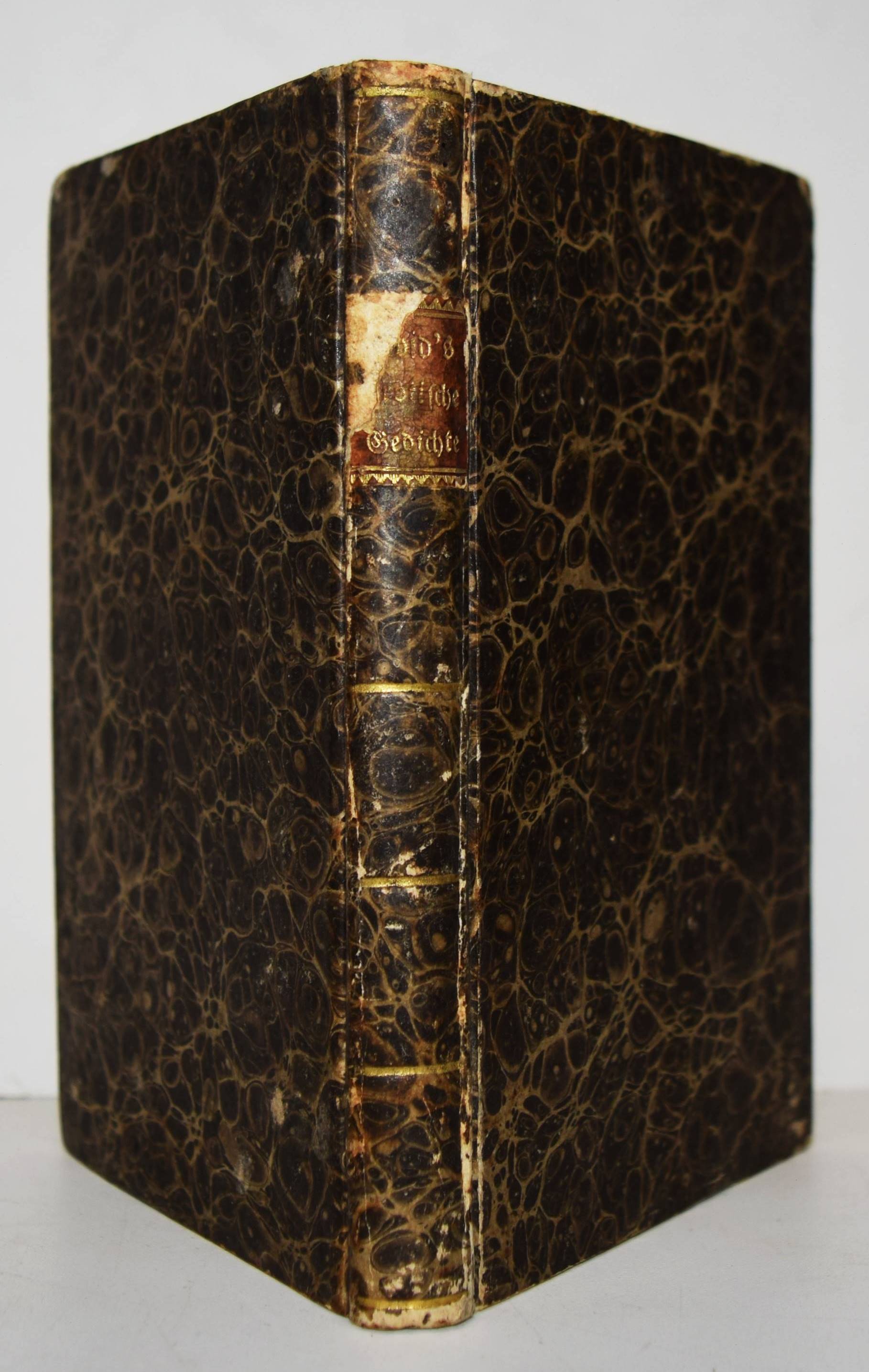 Ovidius Naso, Publius. Erotische Gedichte des Ovid. Metrisch übersetzt von (Johann Isaac v.) Gerning. Frankfurt a. M., Hermann 1815. Kl.-8° (16 x 10 cm.). XX, 199, (1) S. Marmorierter Pappband der Zeit mit goldgepr. Rückenschild und Linienvergoldung. Brümmer 138. Frankfurter Personenlexikon 2369. – Erste Ausgabe dieser Übersetzung. – J. I. v. Gerning (1767-1837), Königlich Sizilianischer Legationsrat. Großherzoglich und Landgräflich Hessischer Geheimer Rat, Dr. jur. et phil. Diplomat, Schriftsteller und Sammler, war „bis 1802 regelmäßiger Gast am Hof in Weimar. Von Goethe und Herder angeregt, schrieb er seine „Reise durch Österreich und Italien“ (3 Bde., 1803). Nach des Vaters Tod (1802) lebte G. zumeist in Ffm., daneben Sommer- und Landsitze in Kronberg, Homburg und Soden. 1817 hessen-homburgischer Bundestagsgesandter. … Neben Beiträgen in verschiedenen zeitgenössischen Blättern veröffentlichte G. vor allem poetische Landschafts- und Reisebeschreibungen, aber auch Ovid-Übersetzungen. Hauptwerke: „Die Heilquellen am Taunus“ (1813/14), „Die Rheingegenden von Mainz bis Cölln“ (1819, engl. 1820), „Die Lahn- und Maingegenden von Embs bis Ffm.“ (1821) sowie die Gedichte „Fft.s Erhaltung und Rettung“ (1795) und „Säculargedicht“ (1800)“ (S. Hock in Frankfurter Personenlexikon). – Einband etwas berieben, Rückenschild mit kl. Abriebstelle, stellenweise etwas braunfleckig, gutes Exemplar.
