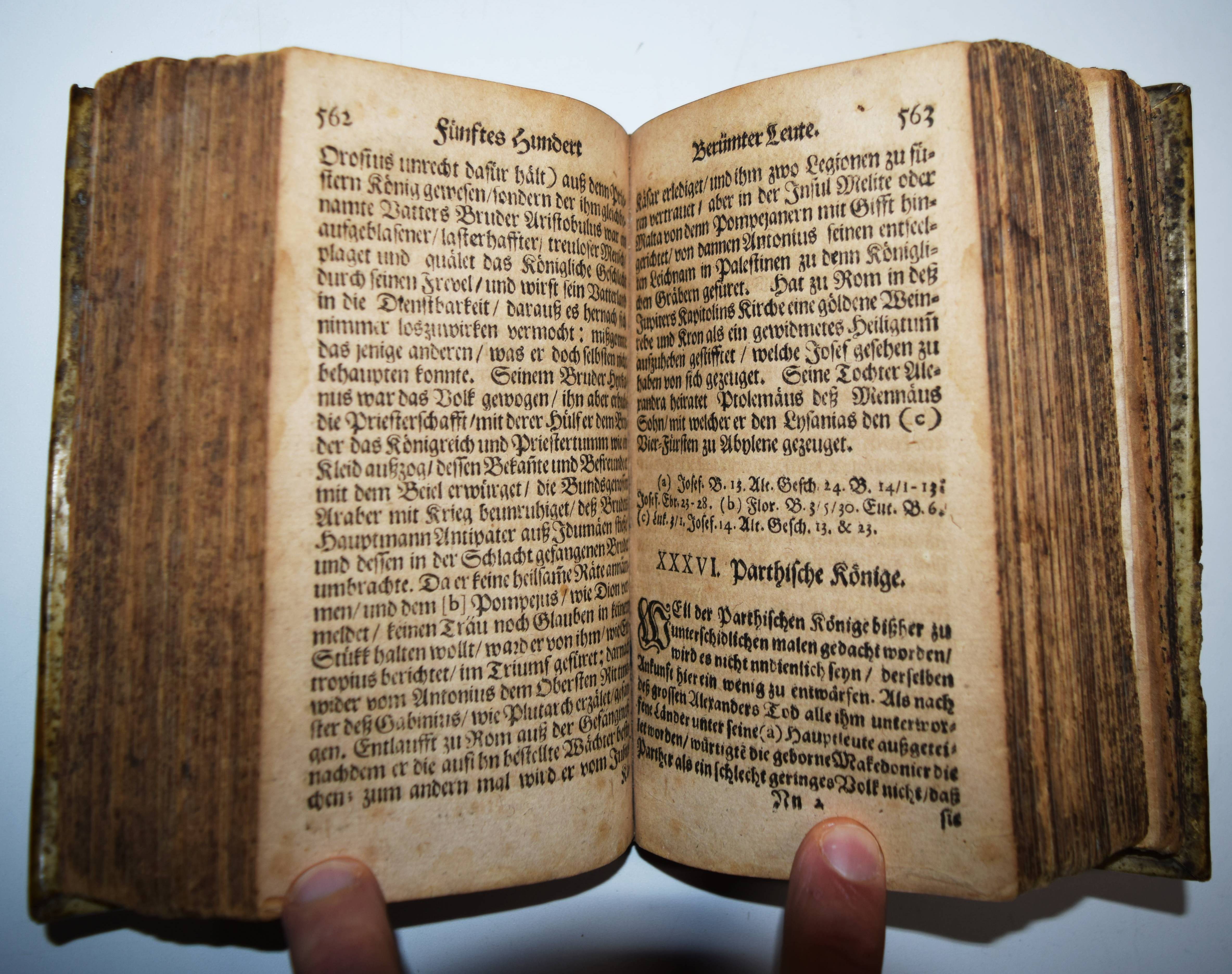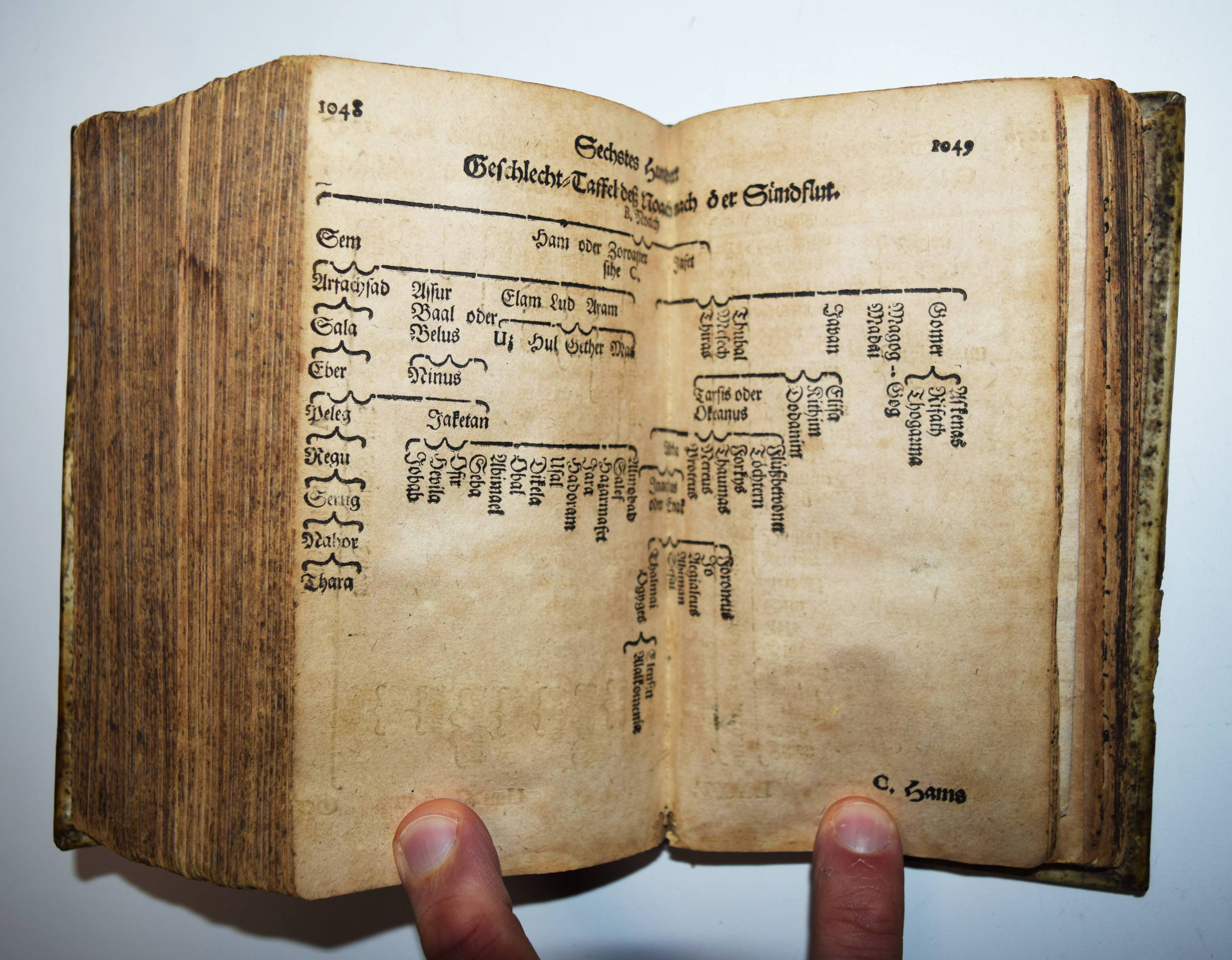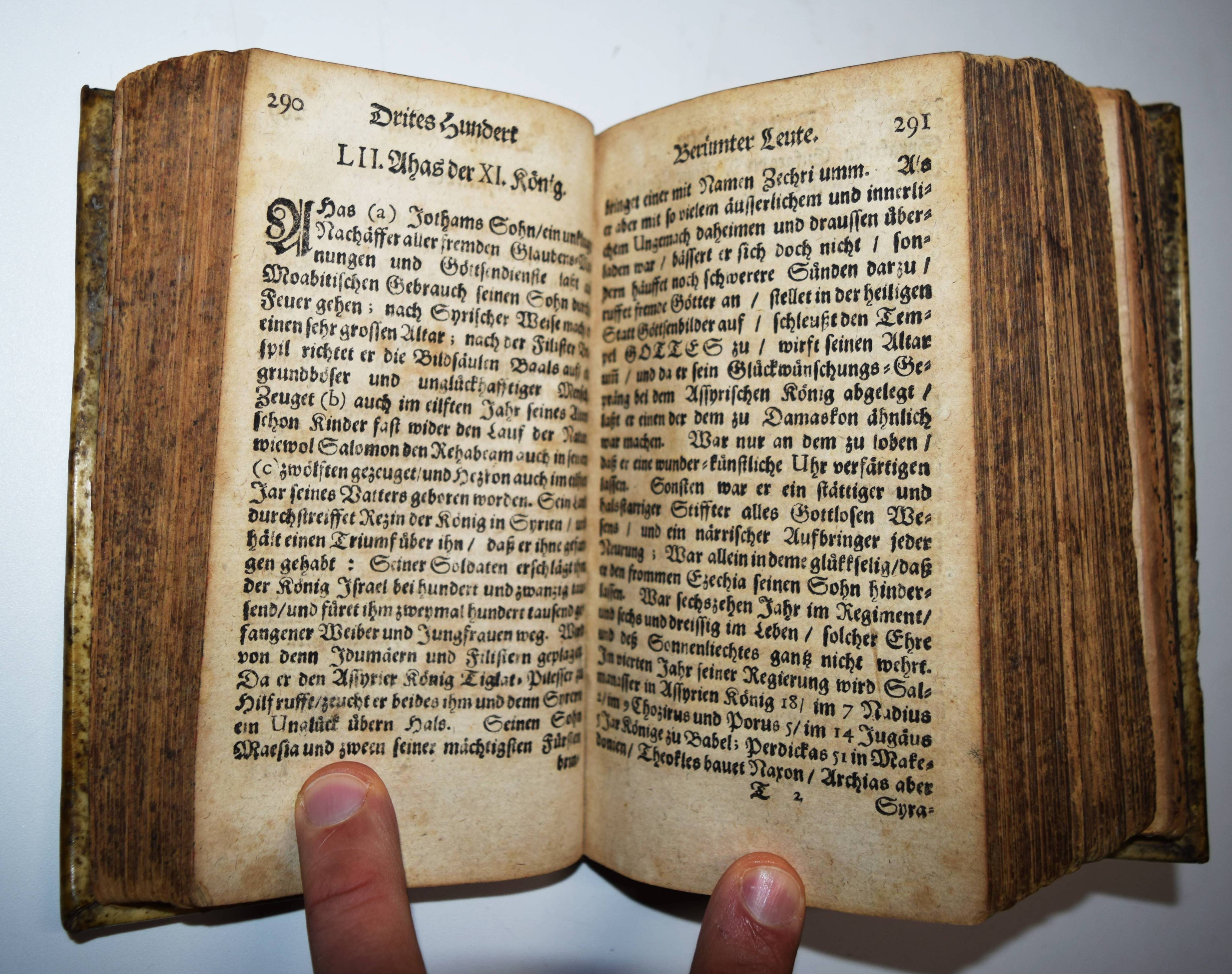 Fabricius, Georg. Acerra Sacra, Das ist Kurtze Historische Beschreibung Sechs-Hundert Berümter Leute / deren in H. Schrifft und mit einlauffenden Geschichten gedacht wird. Hiebevor durch Georg Fabrizien von Chemnitz in 434 Personen Lateinisch beschriben / ietzo aber Deutsch um viel vermehrter herauß gegeben von Matthia Flachsland von Hausingen, Pfarrern zu Haslach. Frankfurt am Main, Wilhelm Serlin und Johann Georg Drullmann 1674. 8°. [14] Bl. 1191, (1) S. mit 38 teils mehrfach gefaltete Stamm-Tafeln. Pergamentband der Zeit. VD17 23:249173 N. Vgl. ADB VI, 510 ff. und NDB IV, 734 f. – Sehr seltene deutsche Ausgabe von Georg Fabricius (1516-1571) ‚Virorum iliustrium seu historiae sacrae ll. X‘ (Leipzig 1564), übersetzt und beträchtlich vermehrt von Matthias Flachsland (1646-1711). Flachsland war nach seinem Theologie-Studium in Straßburg 1655 bis 1667, Pfarrer in Wolfenweiler (1671), danach in Haslach (bis 1681), Tegernau (1682), Broggingen (1699, 1702) und schließlich in Stein, wo er wegen der Einnahme Freiburgs durch die Truppen Ludwigs XIV. 1677 vertrieben wurde. Danach hielt er sich im Exil in Basel, Colmar und Mülhausen auf. Im Spätjahr 1678 unternahm er eine ausgedehnte Rundreise durch Süddeutschland. – Einband leicht fleckig, Vorsätze und Titelblatt stärker angestaubt, Titelblatt rechts mit Randläsuren (minimaler Textverlust), durchgehend gleichmäßig gebräunt, gutes Exemplar.