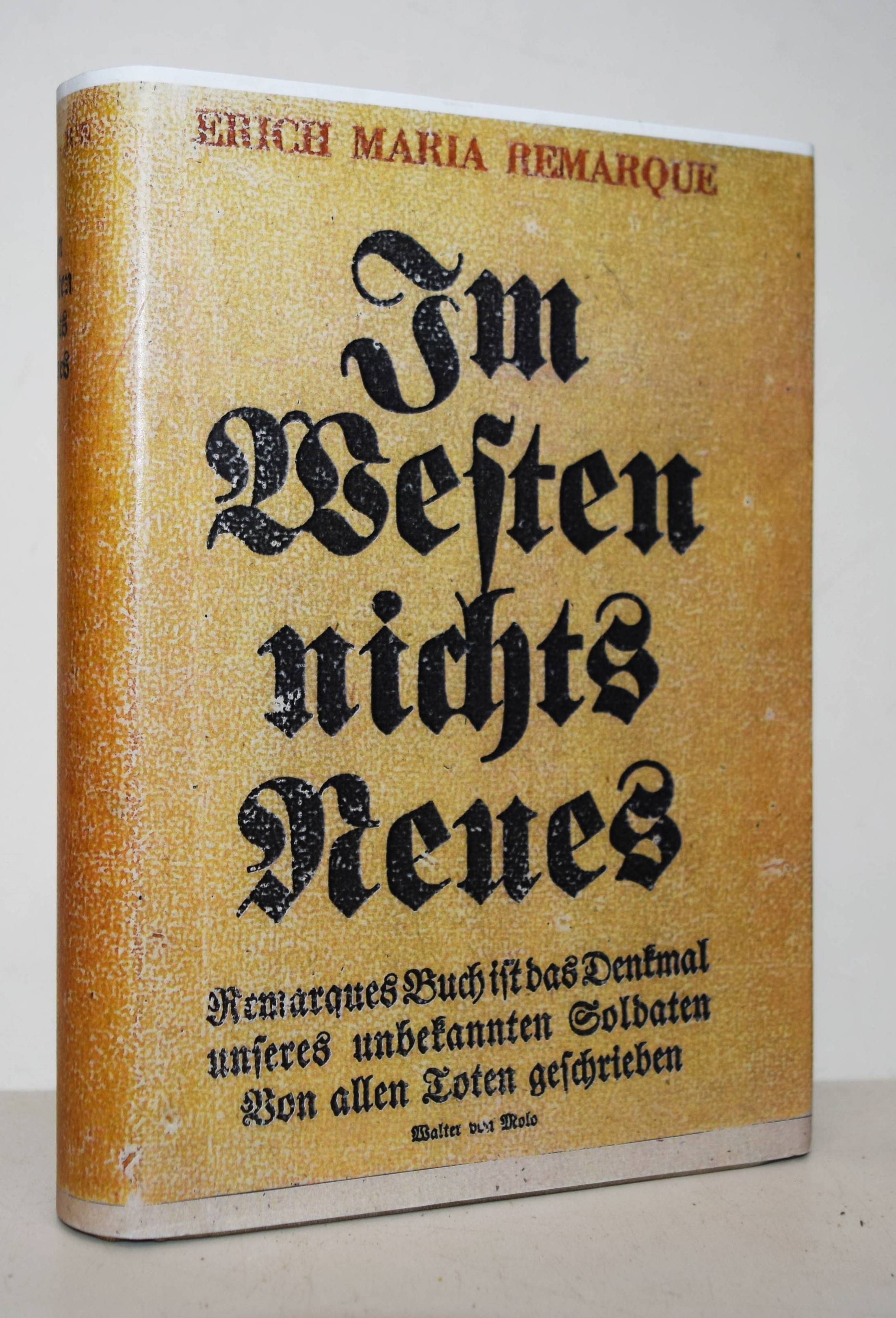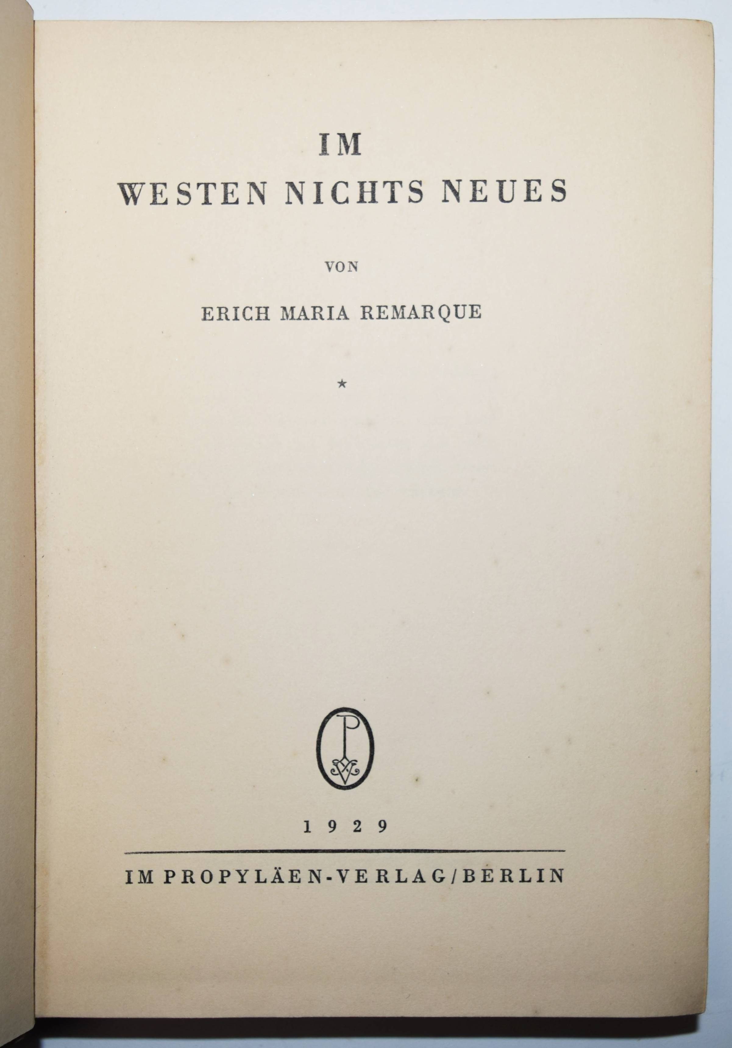 Remarque, Erich Maria (d. i. Erich Paul Remark). Im Westen nichts Neues. Berlin, Propyläen-Verlag (Ullstein & Co.) 1929. 8°. 287, (1) S. Orig.-Leinenband. Kosch³ XII, 983. NDB XXI, 415. W.-G.² 3. – Erste Ausgabe des berühmten Anti-Kriegsromans. Zuerst ab November 1928 als Vorabdruck in der Vossischen Zeitung erschienen. – „Remarques Buch ist das Denkmal unseres unbekannten Soldaten. Von allen Toten geschrieben“ (Walter von Molo, Umschlagtext). – „Am 10.11.1928 begann in der „Vossischen Zeitung“ der Vorabdruck seines Romans „Im Westen nichts Neues“, in der R. die Geschichte einer Generation erzählt, „die vom Krieg zerstört wurde“; die erste dt. Buchausgabe erschien Anfang 1929 im Ullstein-Verlag, die Auflage überschritt bereits im Juni 1930 die Millionengrenze. Durch seinen in mehr als 20 Sprachen übersetzten Roman, der die Fronterlebnisse des 1. Weltkriegs literarisch verarbeitete, wurde R. über Nacht zu einem der berühmtesten, umstrittensten und reichsten dt.sprachigen Autoren seiner Zeit. Ebenfalls ein Welterfolg wurde der 1930 unter der Regie von Lewis Milestone in Hollywood gedrehte gleichnamige Film, dessen Vorführungen in Berlin Ende 1930 von den Nationalsozialisten massiv gestört wurden. Von der Filmprüfstelle bald zeitweise verboten und vom Reichstag in einer Debatte mehrheitlich scharf kritisiert, wurde er erst wieder nach 1952 in einer gekürzten Fassung in bundesdt. Kinos gebracht“ (W. v. Sternburg in NDB). – Schutzumschlag liegt in Farbkopie bei, hinteres Innengelenk geringfügig angeplatzt, sehr gutes sauberes Exemplar.