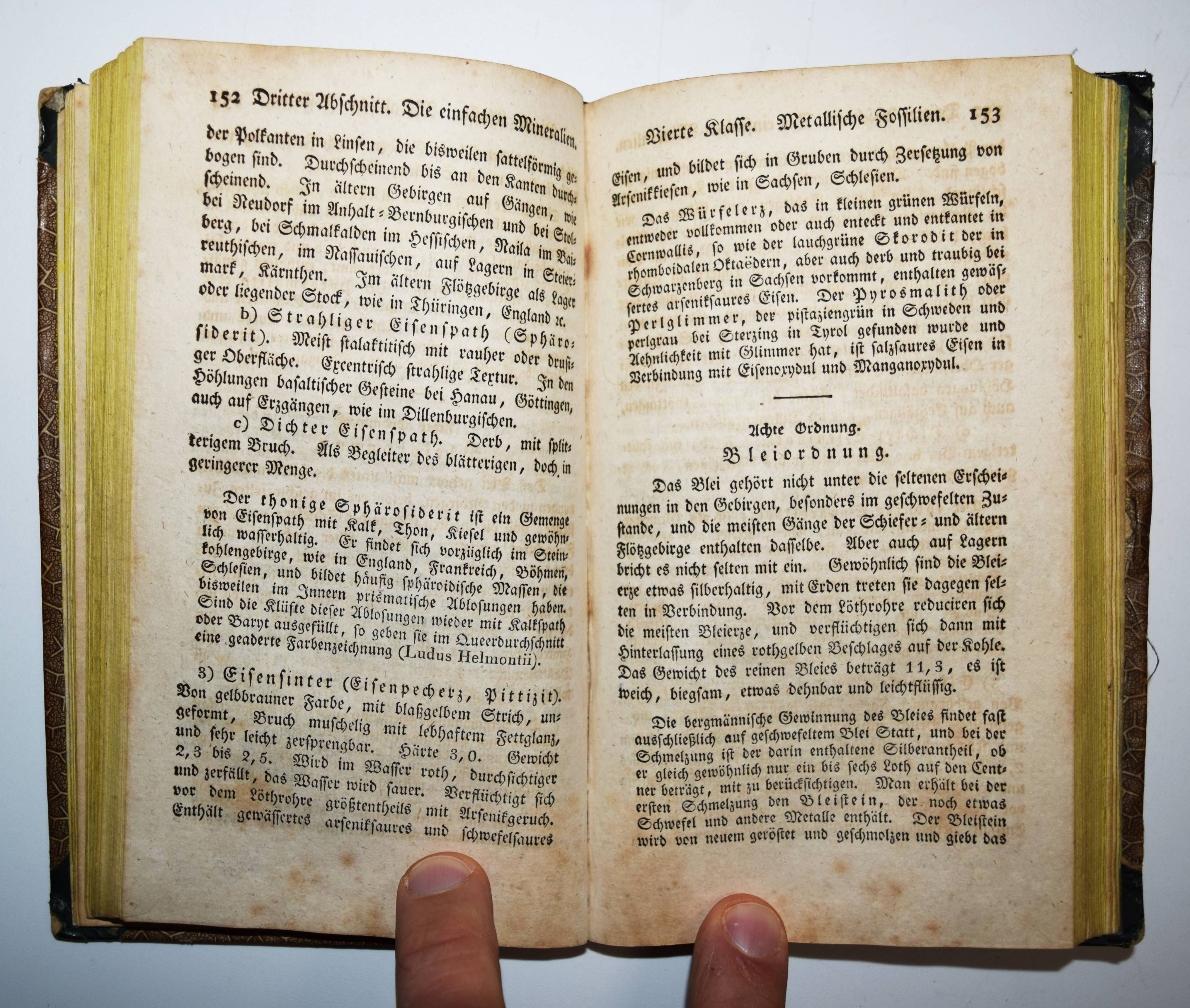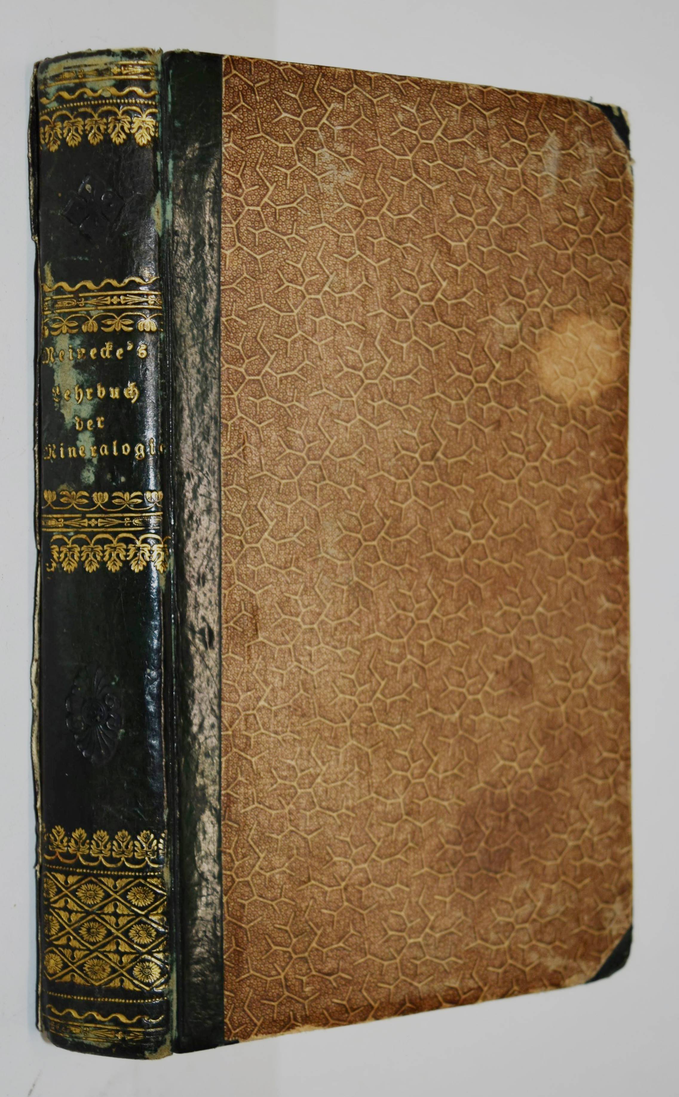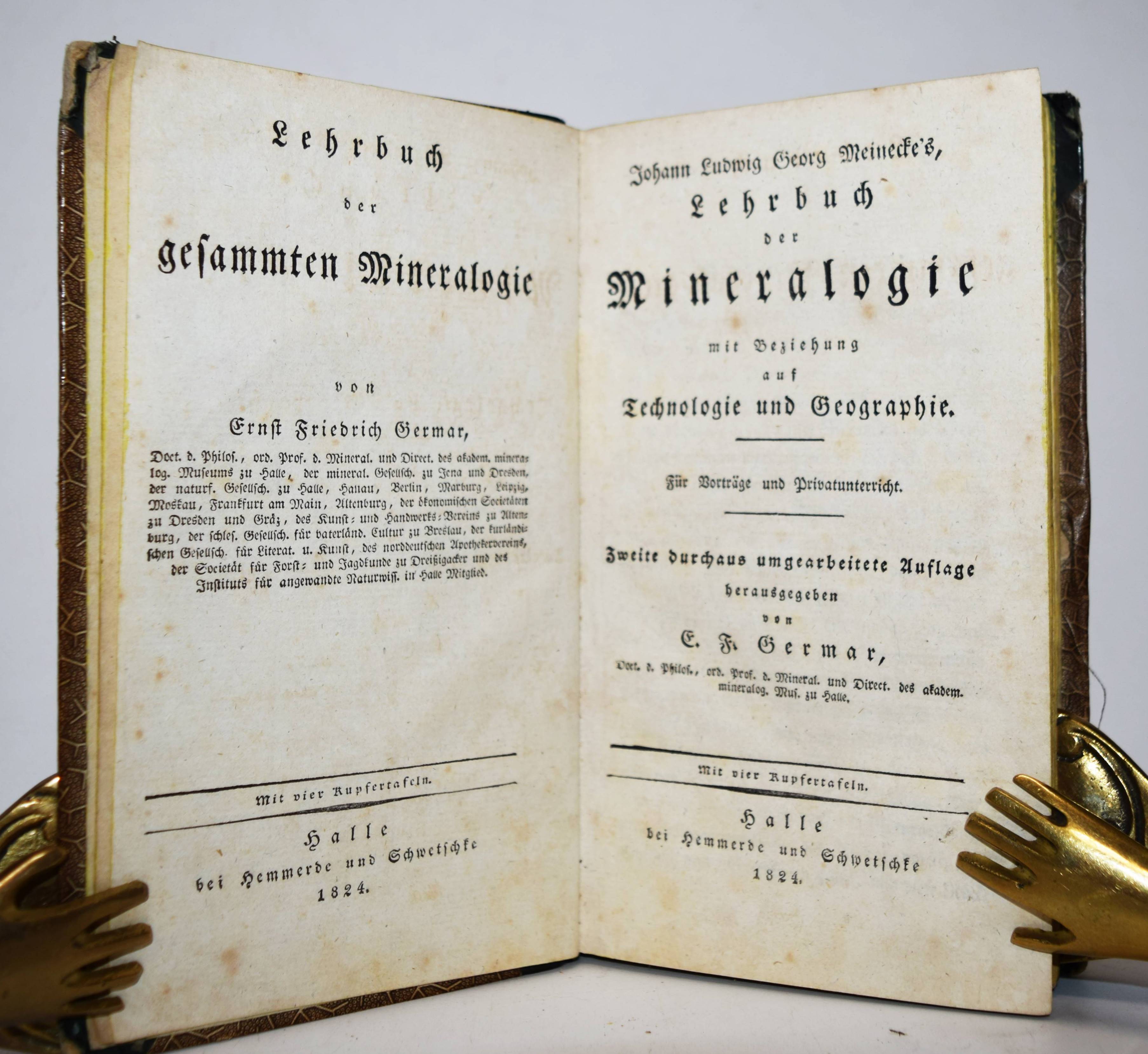Meinecke, Johann Ludwig Georg. Lehrbuch der Mineralogie mit Beziehung auf Technologie und Geographie. Für Vorträge und Privatunterricht. 2. durchaus umgearbeitete Auflage herausgegeben von E(rnst) F(riedrich) Germar. Halle, Hemmerde und Schwetschke 1824. 8°. [5] Bl., 358 S., [1] Bl. mit 46 Abbildungen auf 4 Kupfertafeln. Halblederband der Zeit mit goldgepr. Rückentitel und Rückenvergoldung. NDB XVI, 660 f. und VI, 310 f. Poggend. II, 104. – Zweite neubearbeitete Ausgabe des zuerst 1808 erschienenen Lehrbuchs. – J. L. G. Meinecke (1781-1823) war seit 1812 „Professor für Physik, Chemie und Naturgeschichte an der Artillerieschule in Kassel und nahm schließlich 1814 den Ruf als o. Professor der Technologie an der Univ. Halle an. … M. war weniger ein experimenteller Forscher, eher ein Theoretiker, dessen Schlußfolgerungen auf den praktischen Arbeiten anderer fußten. Seine Interessengebiete waren breit gestreut. So gab er 1808 ein Lehrbuch der Mineralogie heraus und schrieb 1805 Abhandlungen über den Chrysopras in Schlesien. 1820 verfaßte er ein „Mineralogisches Taschenbuch“ für Deutschland, 1819 schrieb er über den Aragonit und über ein neues, sich bei Dölau/Halle bildendes Schwefeleisen. Seine Tätigkeit an der Artillerieschule fand ihren Niederschlag in einer Abhandlung über das Schießpulver und einer Anleitung zum Guß bronzener Geschütze. Seine Beiträge zur chemischen Wissenschaft sind heute zwar so gut wie vergessen, waren aber von beträchtlicher Originalität und zu ihrer Zeit von großem Einfluß“ (Otto Krätz in NDB). – Der Bearbeiter E. F. Germar (1786-1853) war berühmt für „seine Arbeiten über Coleopteren und Hemipteren, über fossile Insekten sowie über die fossile Flora des Wettiner Kohlevorkommens. Seine unermüdlichen Aufsammlungen legten den Grundstock des ihm anvertrauten „Mineraliencabinets“ der Universität Halle“ (Max Pfannenstiel in NDB). – Einband etwas berieben, hintereres Gelenk alt mit Papier überklebt, zeitgenöss. Besitzvermerk, die Kupfertafeln verso mit umfangreichen handschriftlichen Notizen, vereinzelt Anstreichungen, gutes dekorativ gebundenes Exemplar.