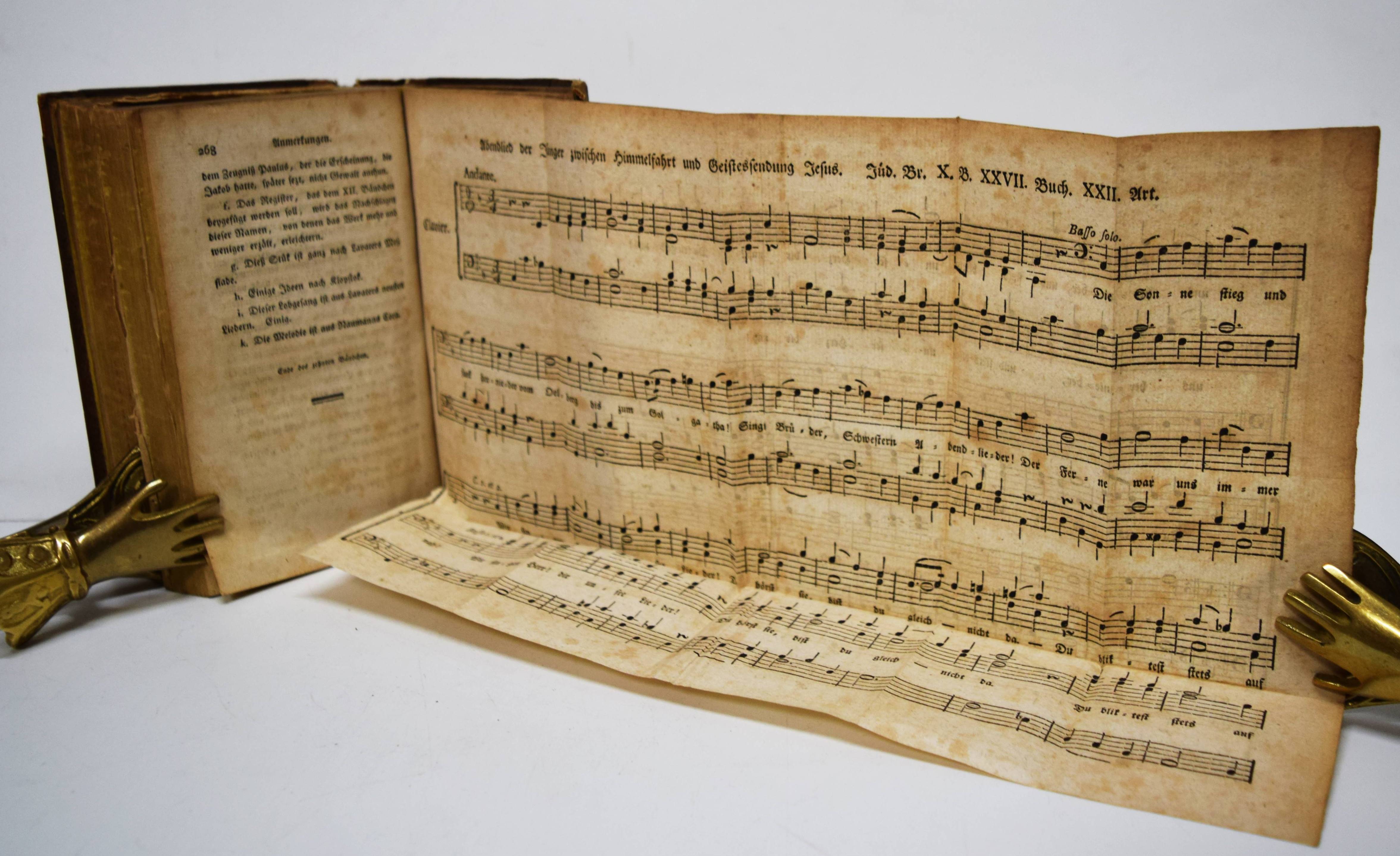 Pfenninger, Johann Konrad. Jüdische Briefe, Erzählungen, Dialogens um die Zeit Jesu, von Nazareth. Oder eine Messiade in Prose. Neuntes Bändchen. Mit einer Melodie. Wizenmann zugeeignet. (Und) zehntes Bändchen. Mit einer Melodie. Karoline, Charlotte, und Christiane von Palm zugeeignet. 2 Teile in 1 Band. Leipzig, Johann Friedrich Junius 1788 und 1789. Kl.-8°. XXIV, 232, XIV S.; XII, 268, XXIV S. mit 2 mehrfach gefalteten Musikbeilagen. Pappband des frühen 19. Jahrhundert mit Rückenschild. Fürst III, 84. Goedeke IV, 1, 286, 6. – Erste Ausgabe des neunten und zehnten Teils. Von 1783 bis 1792 erschienen 12 Teile. – „Das Werk umfaßt in 34 Büchern die Evangelien und die Apostelgeschichte. Es war auf wenigstens 14 Bände geplant und sollte noch die Briefe der Apostel, also das ganze Neue Testament umfassen. Es enthält auch mehrere Gedichte von Lavater“ (Goedeke). – Einband etwas berieben, Gelenke angeplatzt, stellenweise etwas braunfleckig, sonst gut erhalten.