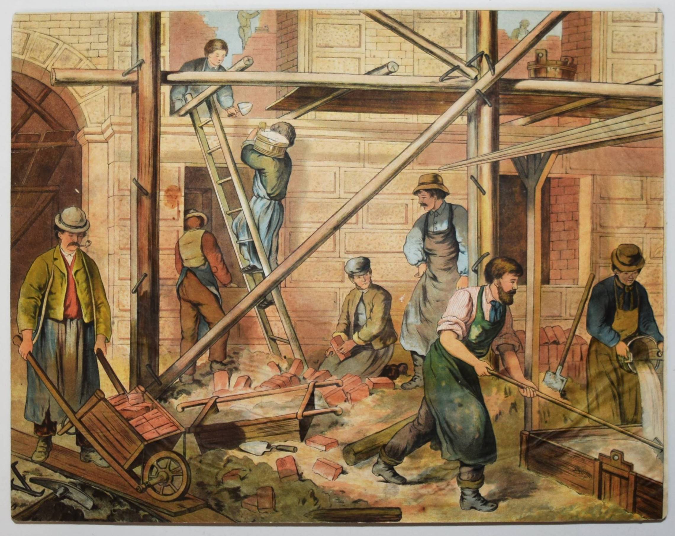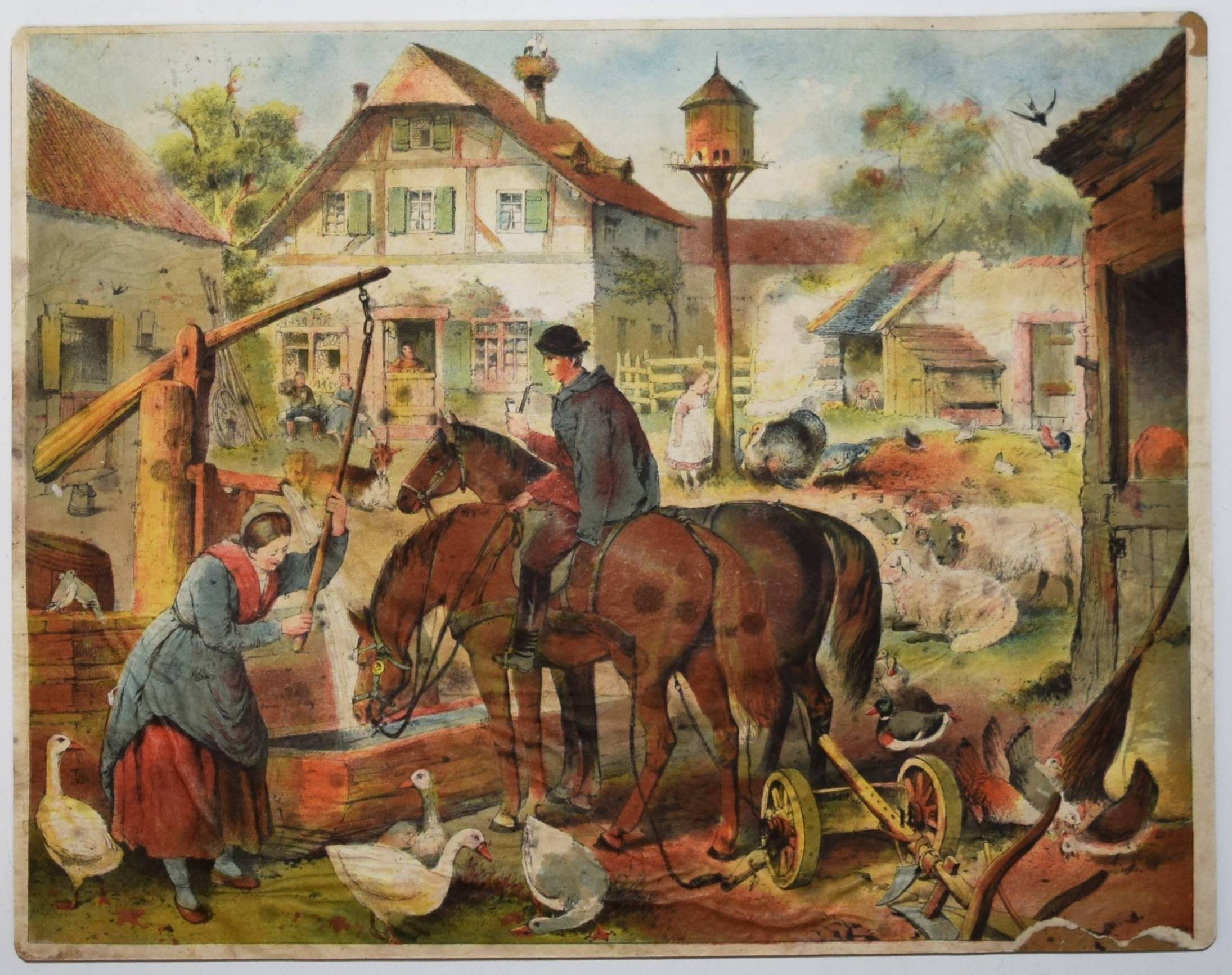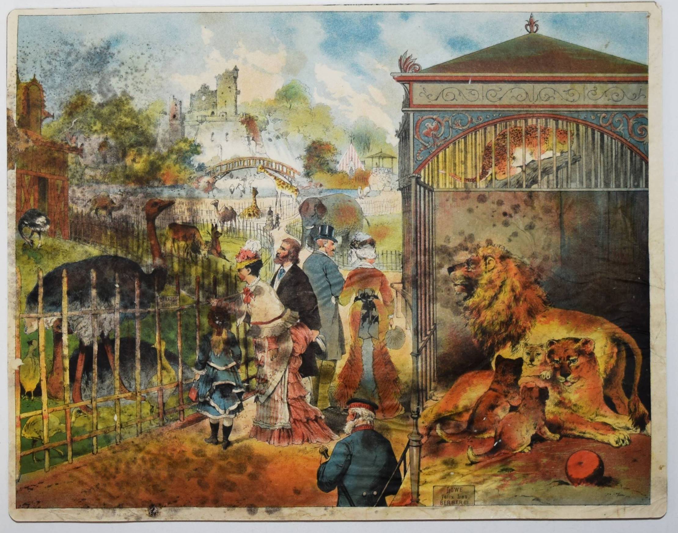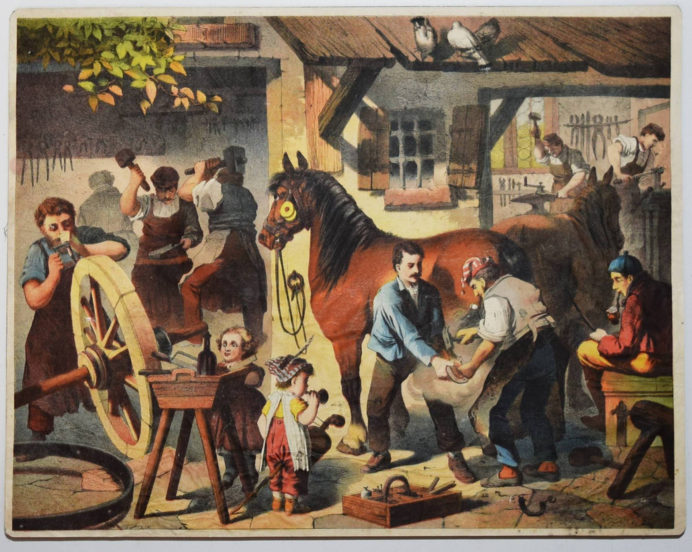 Bilderbogen, Anschauungs-Tafeln. Ohne, Ort, Druck und Jahr (um 1870). Quer-4° (28,5 x 36,5 cm.). 26 farblithographierte Tafeln, beidseitig auf Karton aufgezogen. Moderne Flügelmappe mit farblithgr. Deckelbild (Vögel). Dekorative farbig lithographierte Anschauungs-Bilder mit dreizehn Berufsdarstellungen (Maurer, Zimmermann, Landwirt, HufschmiedSchneider, Tischler etc.) und Kinderszenen (Besuch im Zoo und auf dem Jahrmarkt und Kinder beim Spielen) sowie Tiere. – 6 Tafeln sporfleckig, 1 Tafel (Maultier) am linken Rand mit Abriebstellen, sonst gut erhalten.