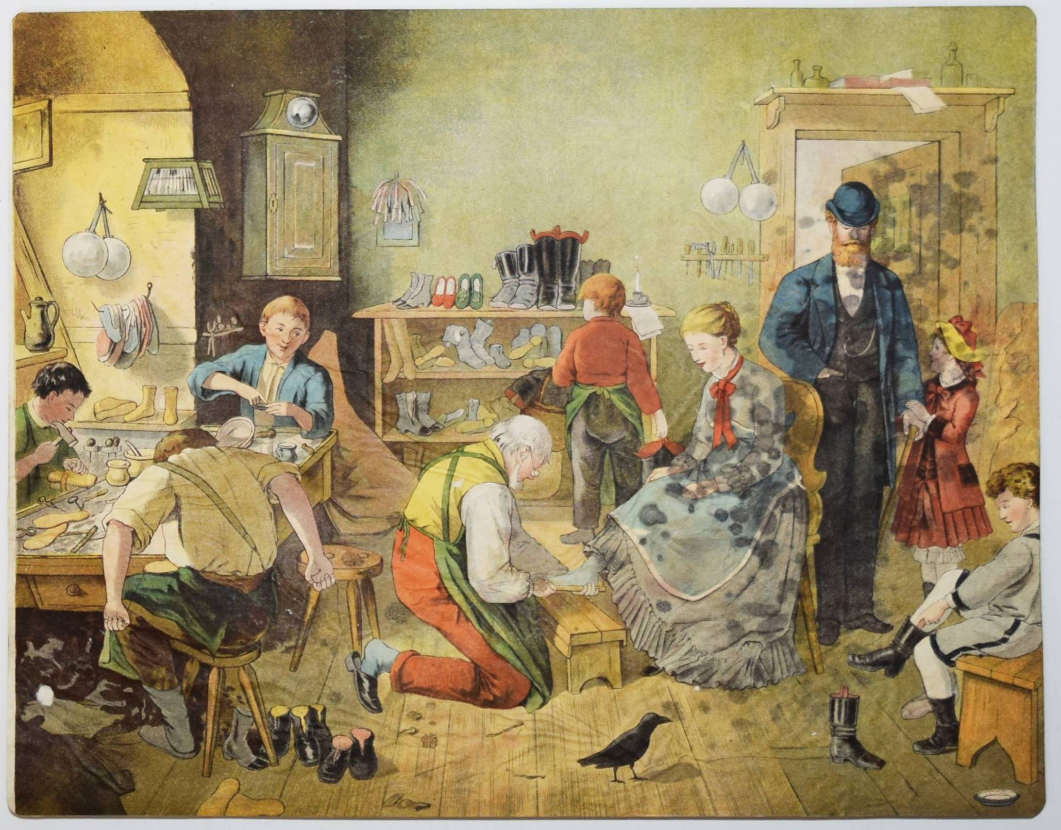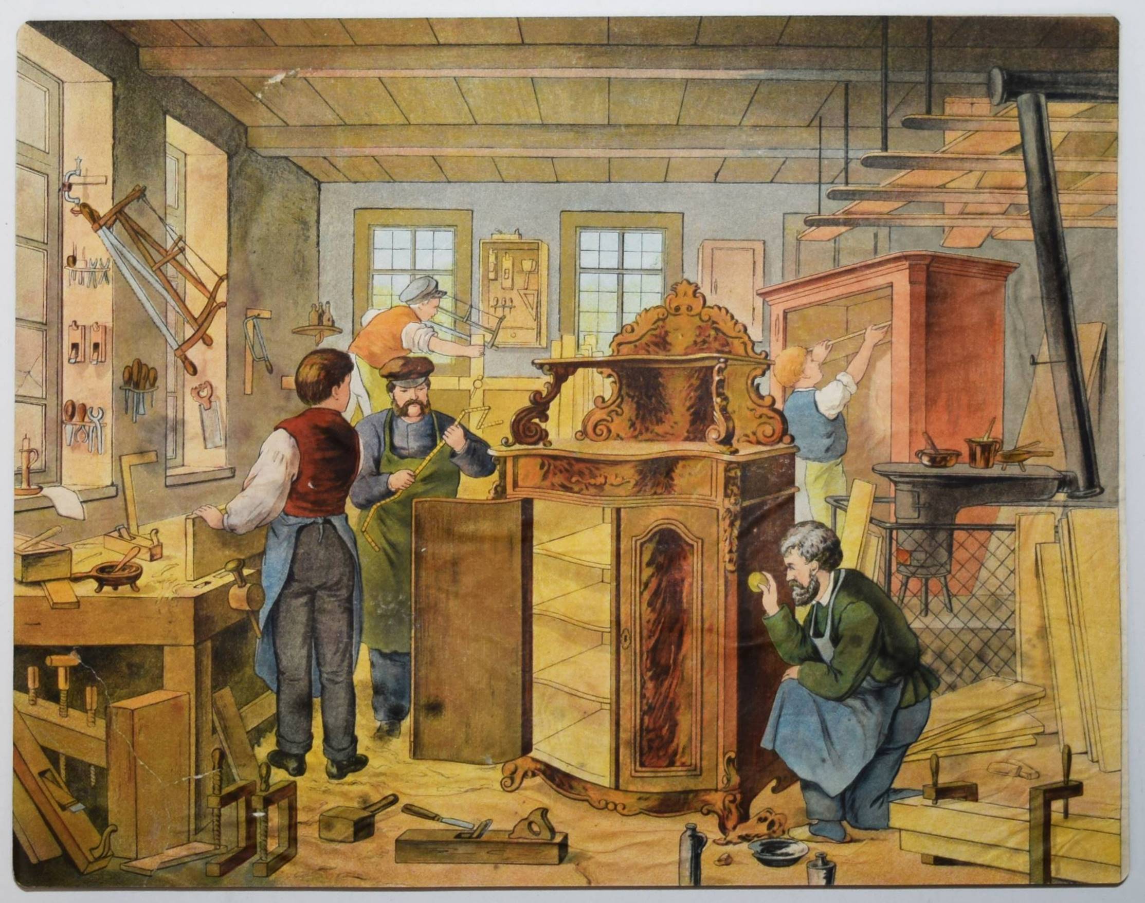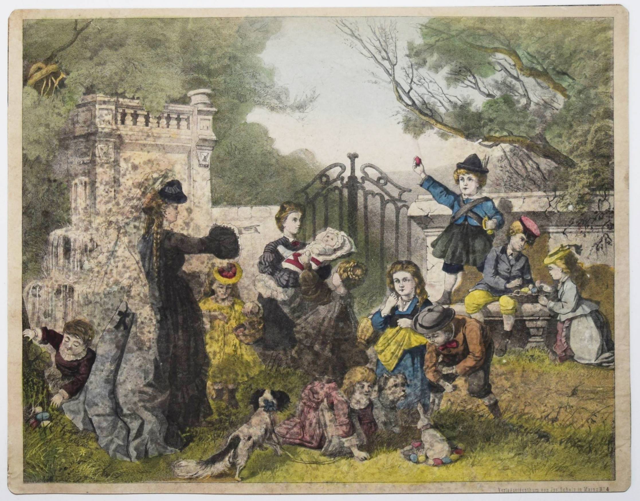 Bilderbogen, Anschauungs-Tafeln. Ohne, Ort, Druck und Jahr (um 1870). Quer-4° (28,5 x 36,5 cm.). 26 farblithographierte Tafeln, beidseitig auf Karton aufgezogen. Moderne Flügelmappe mit farblithgr. Deckelbild (Vögel). Dekorative farbig lithographierte Anschauungs-Bilder mit dreizehn Berufsdarstellungen (Maurer, Zimmermann, Landwirt, HufschmiedSchneider, Tischler etc.) und Kinderszenen (Besuch im Zoo und auf dem Jahrmarkt und Kinder beim Spielen) sowie Tiere. – 6 Tafeln sporfleckig, 1 Tafel (Maultier) am linken Rand mit Abriebstellen, sonst gut erhalten.