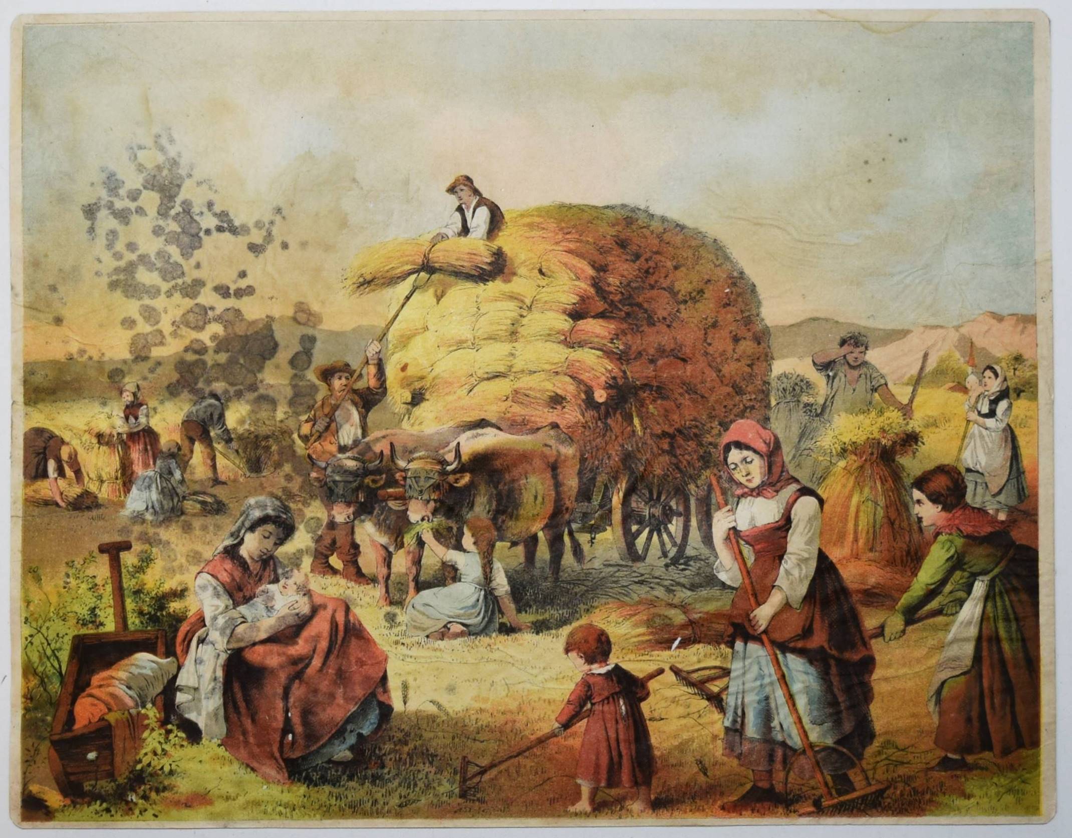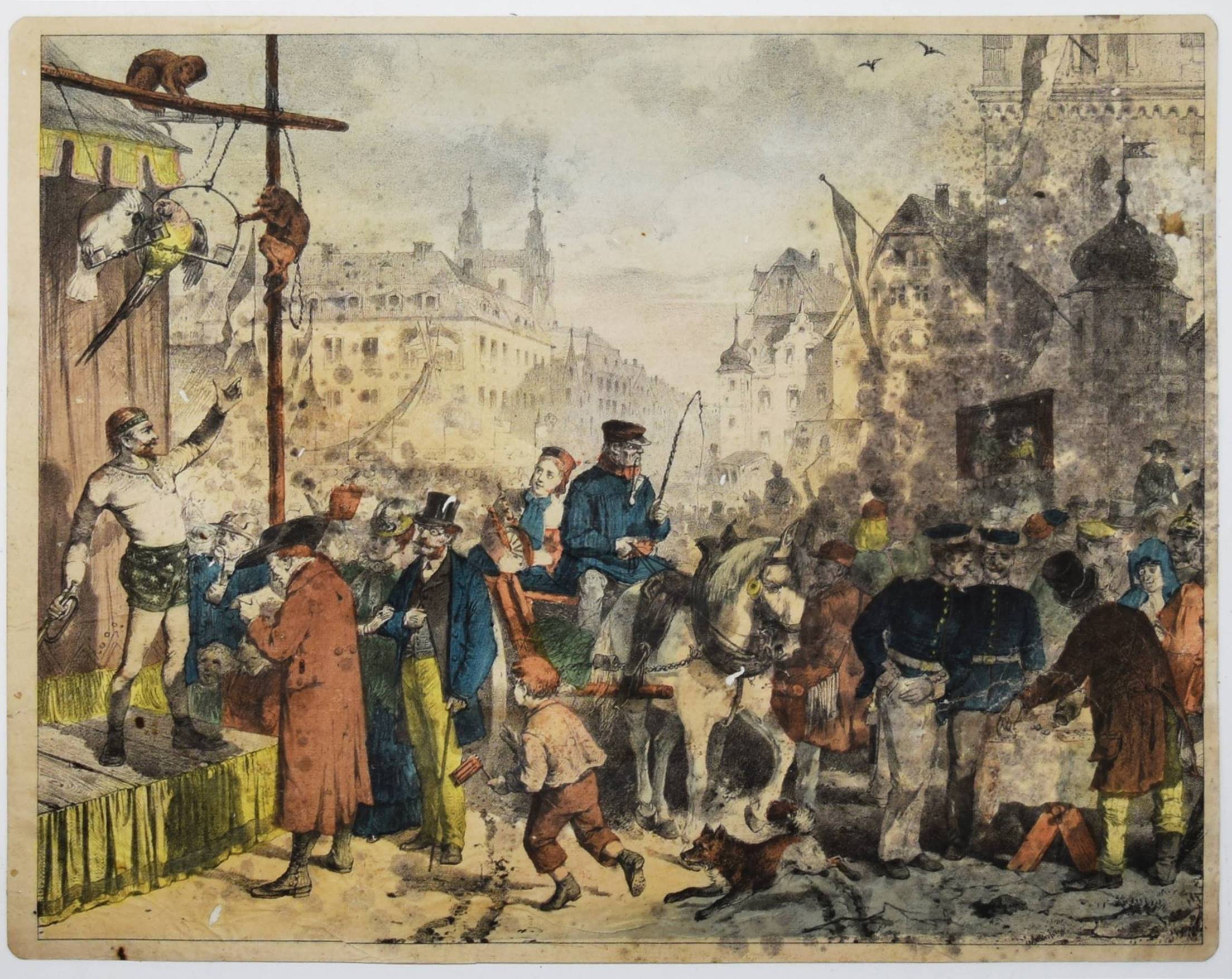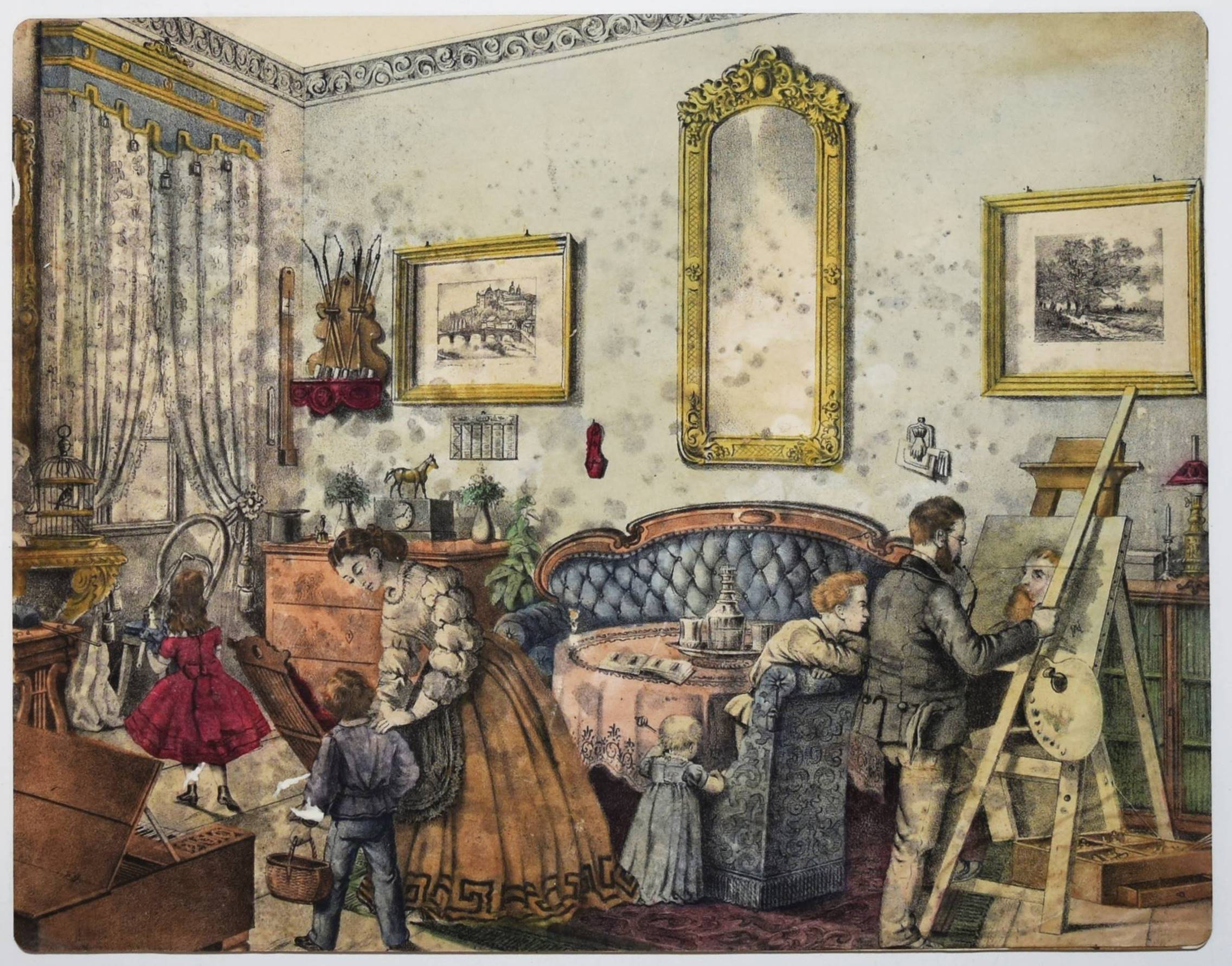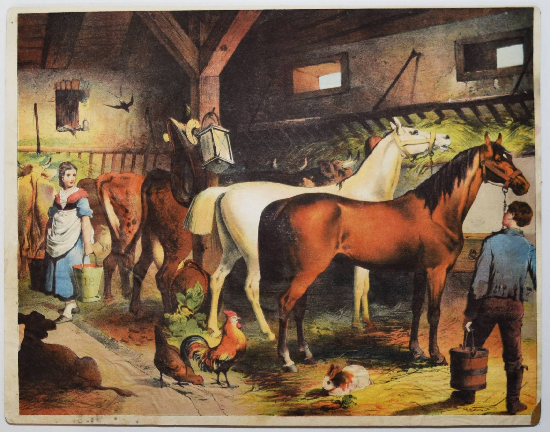 Bilderbogen, Anschauungs-Tafeln. Ohne, Ort, Druck und Jahr (um 1870). Quer-4° (28,5 x 36,5 cm.). 26 farblithographierte Tafeln, beidseitig auf Karton aufgezogen. Moderne Flügelmappe mit farblithgr. Deckelbild (Vögel). Dekorative farbig lithographierte Anschauungs-Bilder mit dreizehn Berufsdarstellungen (Maurer, Zimmermann, Landwirt, HufschmiedSchneider, Tischler etc.) und Kinderszenen (Besuch im Zoo und auf dem Jahrmarkt und Kinder beim Spielen) sowie Tiere. – 6 Tafeln sporfleckig, 1 Tafel (Maultier) am linken Rand mit Abriebstellen, sonst gut erhalten.