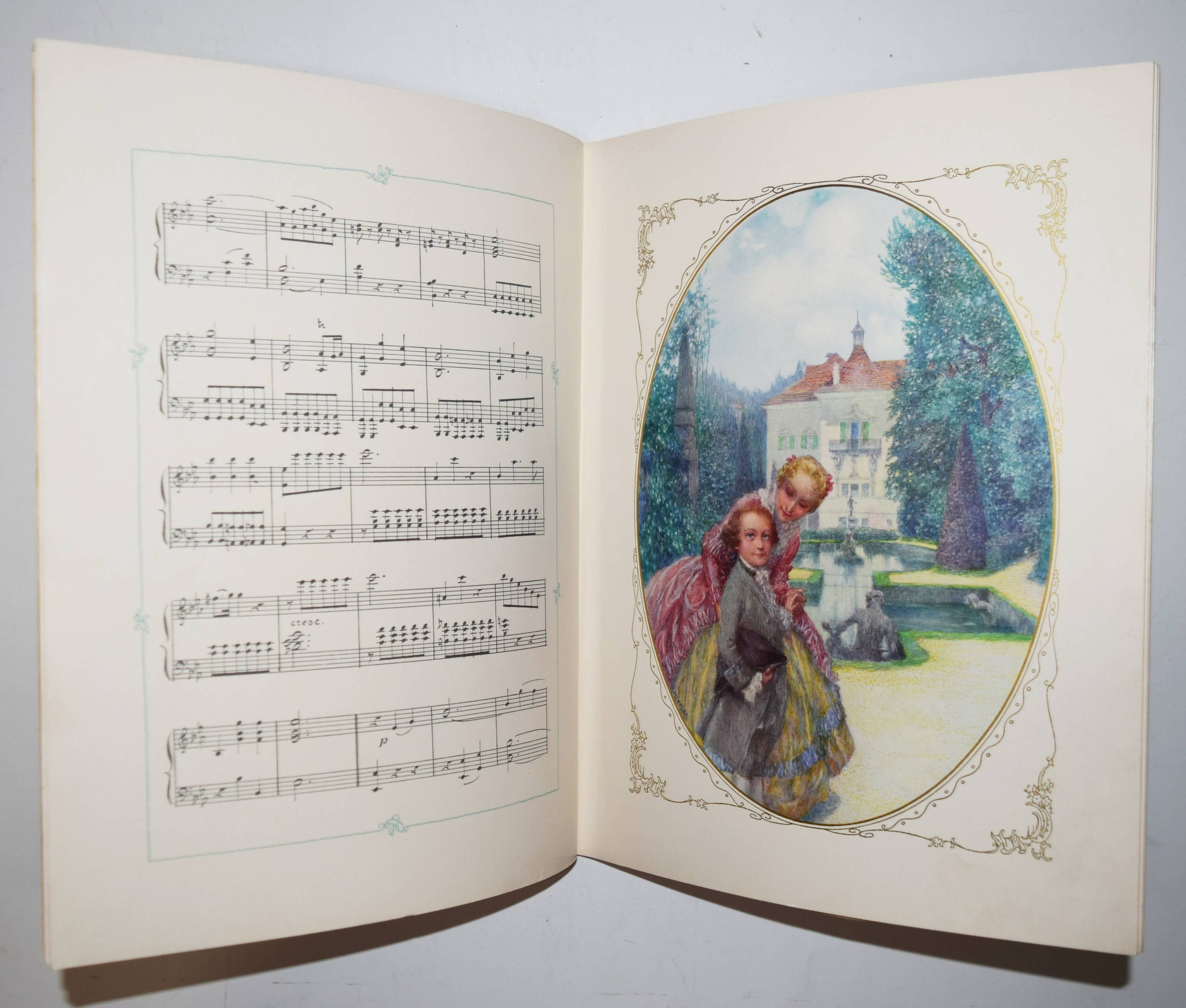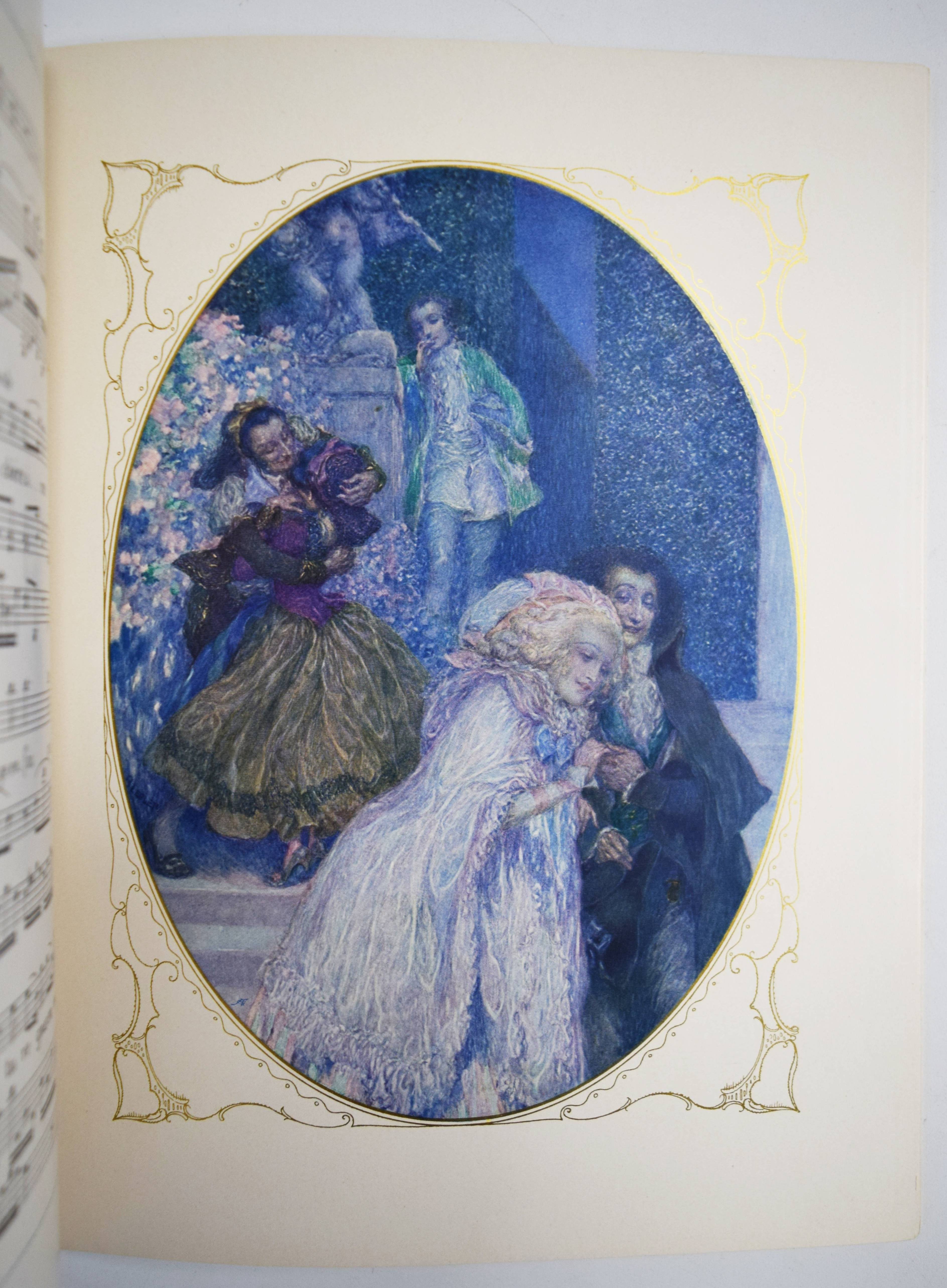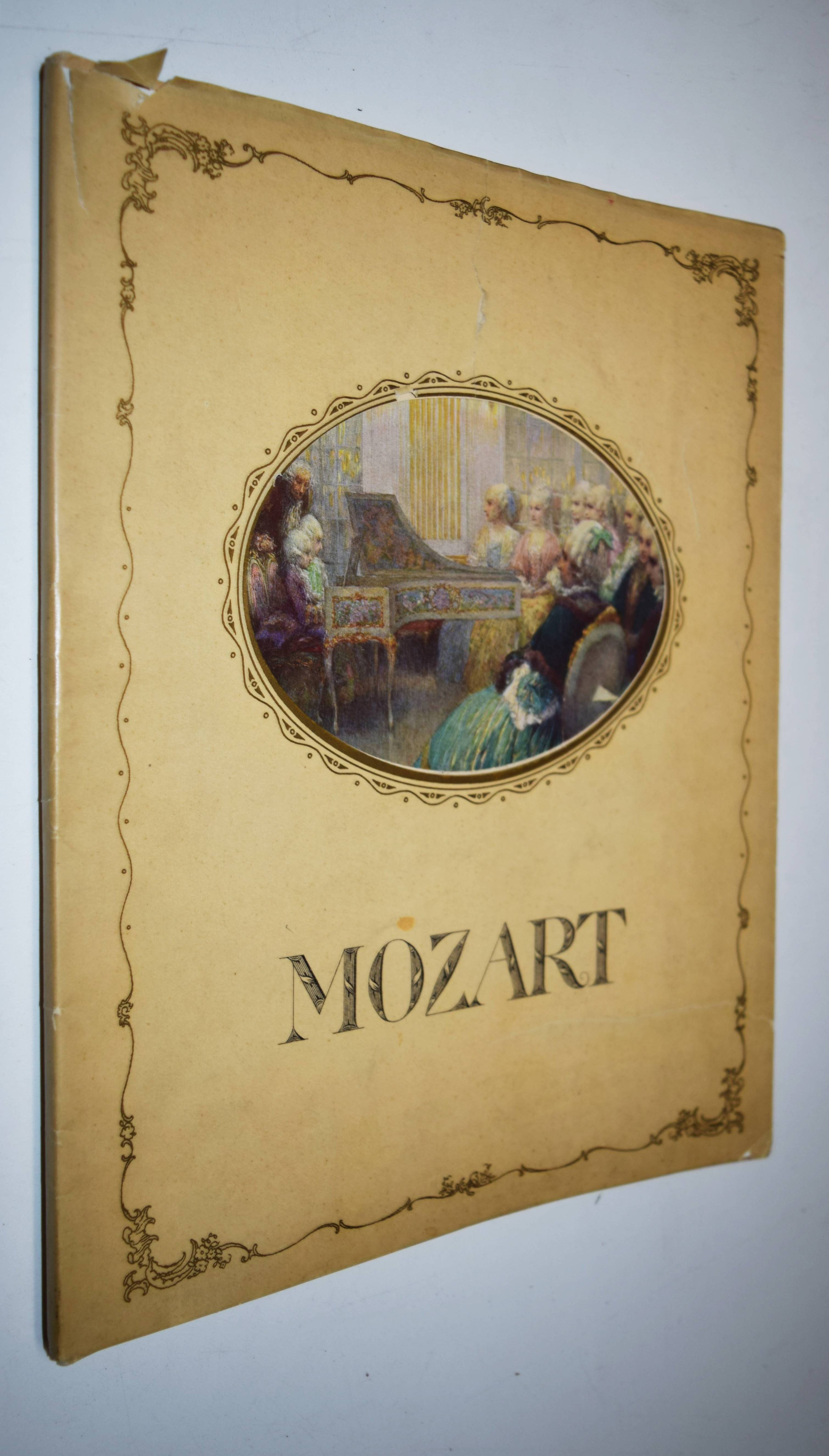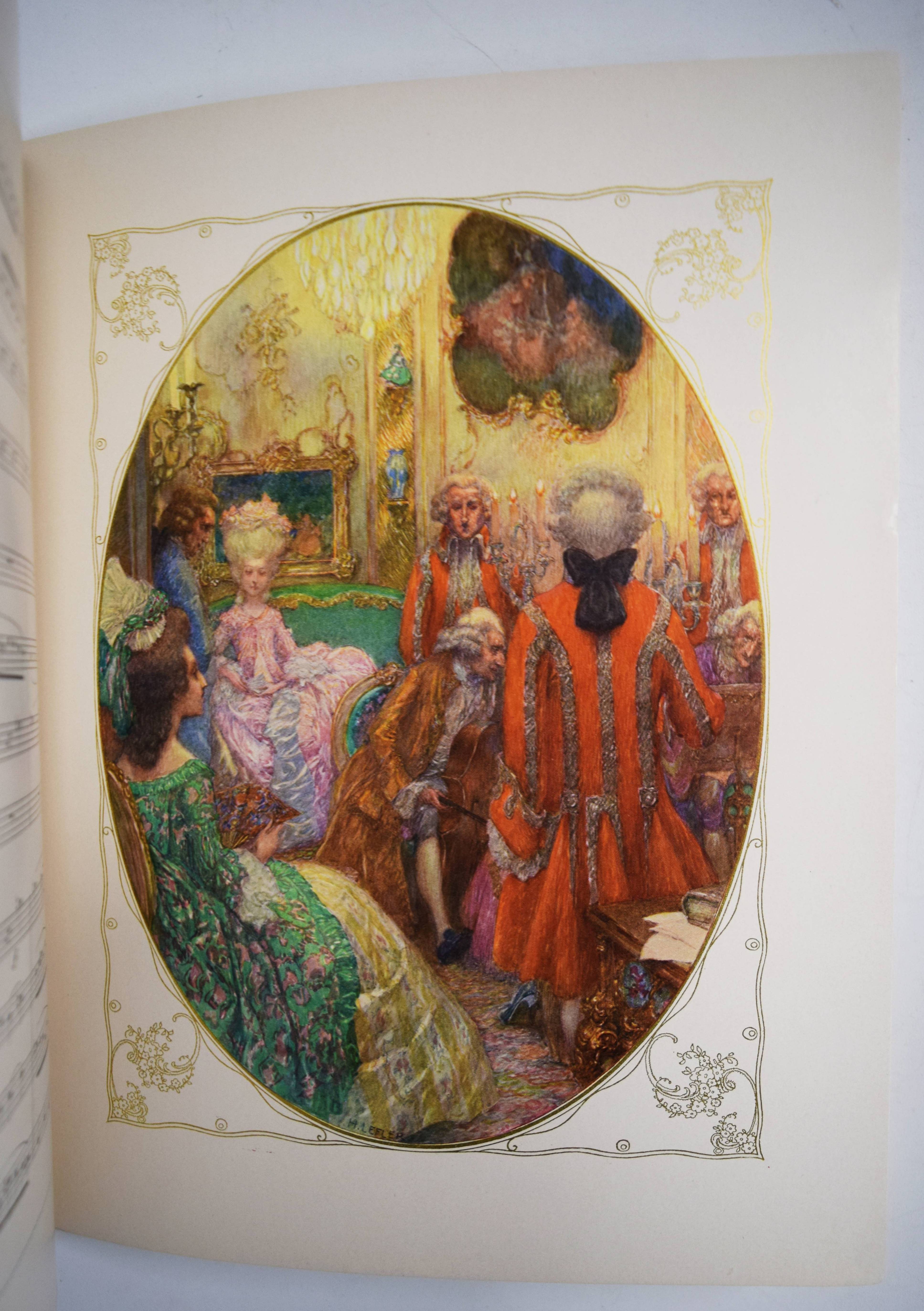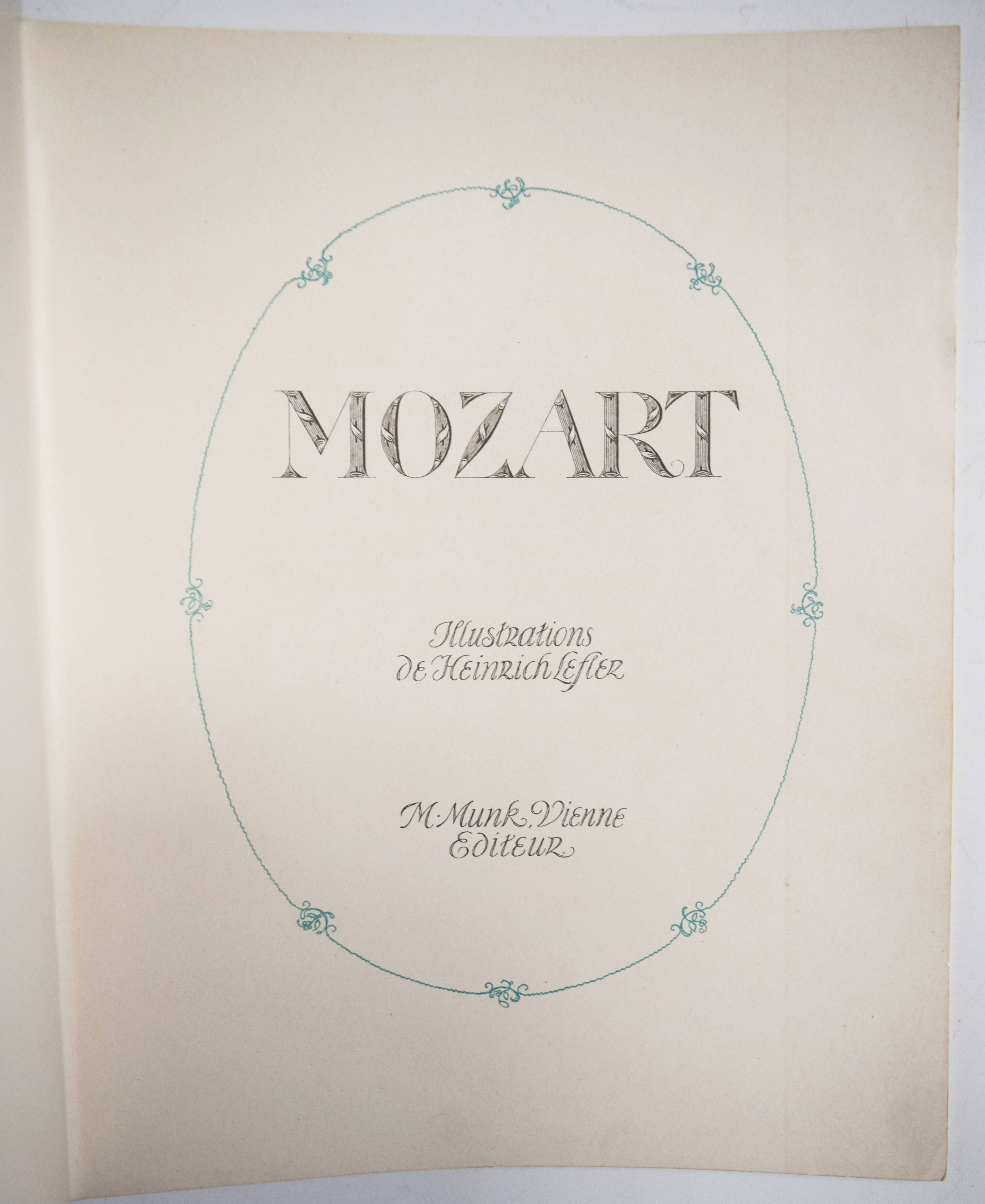 Mozart, (Wolfgang Amadeus). (Dix chansons et deux mélodies). Illustrations du Heinrich Lefler. Wien, M(arkus und Hugo) Munk o. J. (1914). 4° (31 x 24,5 cm.). [25] Bl. mit 12 ganzseitigen, farbigen Illustrationen im Oval mit ornamentaler Goldbordüre, sowie Buchschmuck in Grün von Heinrich Lefler. Farbig illustr. Orig.-Kartonumschlag mit ausgestanztem Schutzumschlag mit Deckeltitel und Ornamentrahmen. Seltene französische Ausgabe mit dekorativen Jugendstil-Illustrationen und Buchschmuck von H. Lefler (1863-1919). Die deutsche Ausgabe erschien in gleicher Ausstattung mit 12 Gedichten von Richard Specht. – Mit den Melodien: „39e. Symphonie“ und „Quartette A“. Sowie den Liedern: „Bastien et Bastienne, L’enlevement au Serail, Cosi fan tutte, Les noces de Figaro (2), Don Juan (Trio des Masques), Don Juan (Rondeau), La flute enchanté“ (2) und „Requiem (Benedictus)“. – Bei M. und H. Munk erschienen auch Mörikes, Mozart auf der Reise nach Prag und Kinderbücher mit den Illustrationen von H. Lefler. – Schutzumschlag mit geringen Randläsuren, sonst gut erhalten.