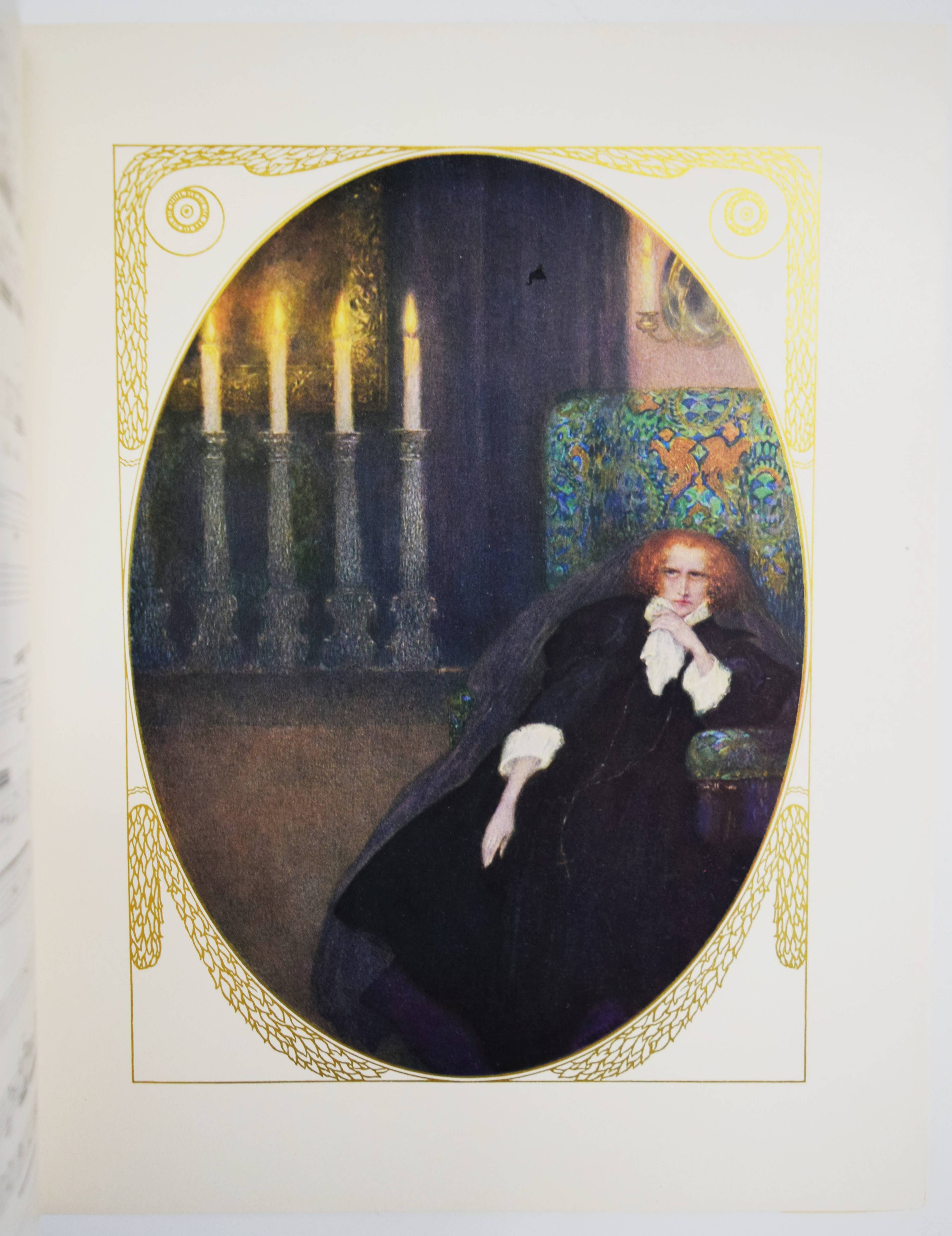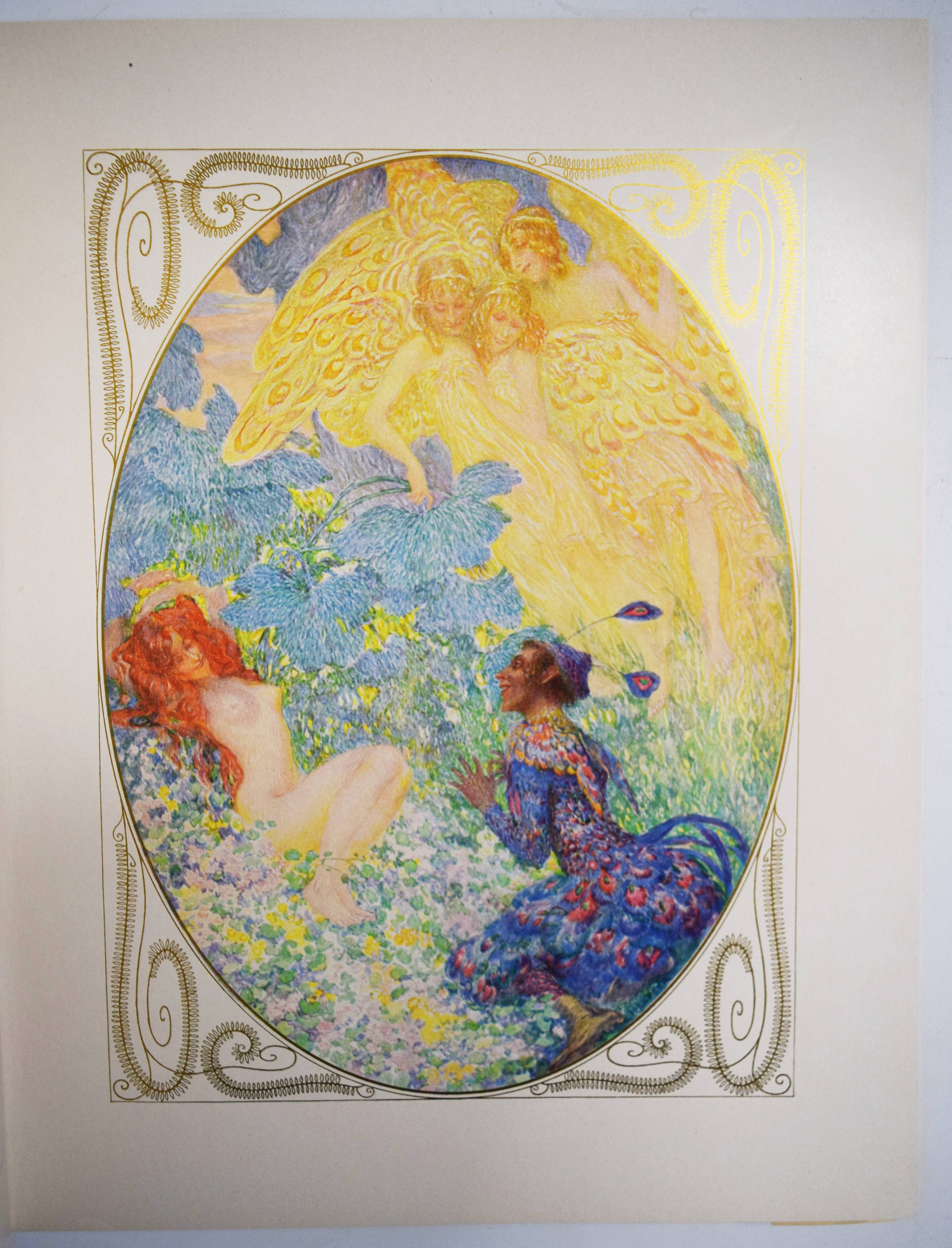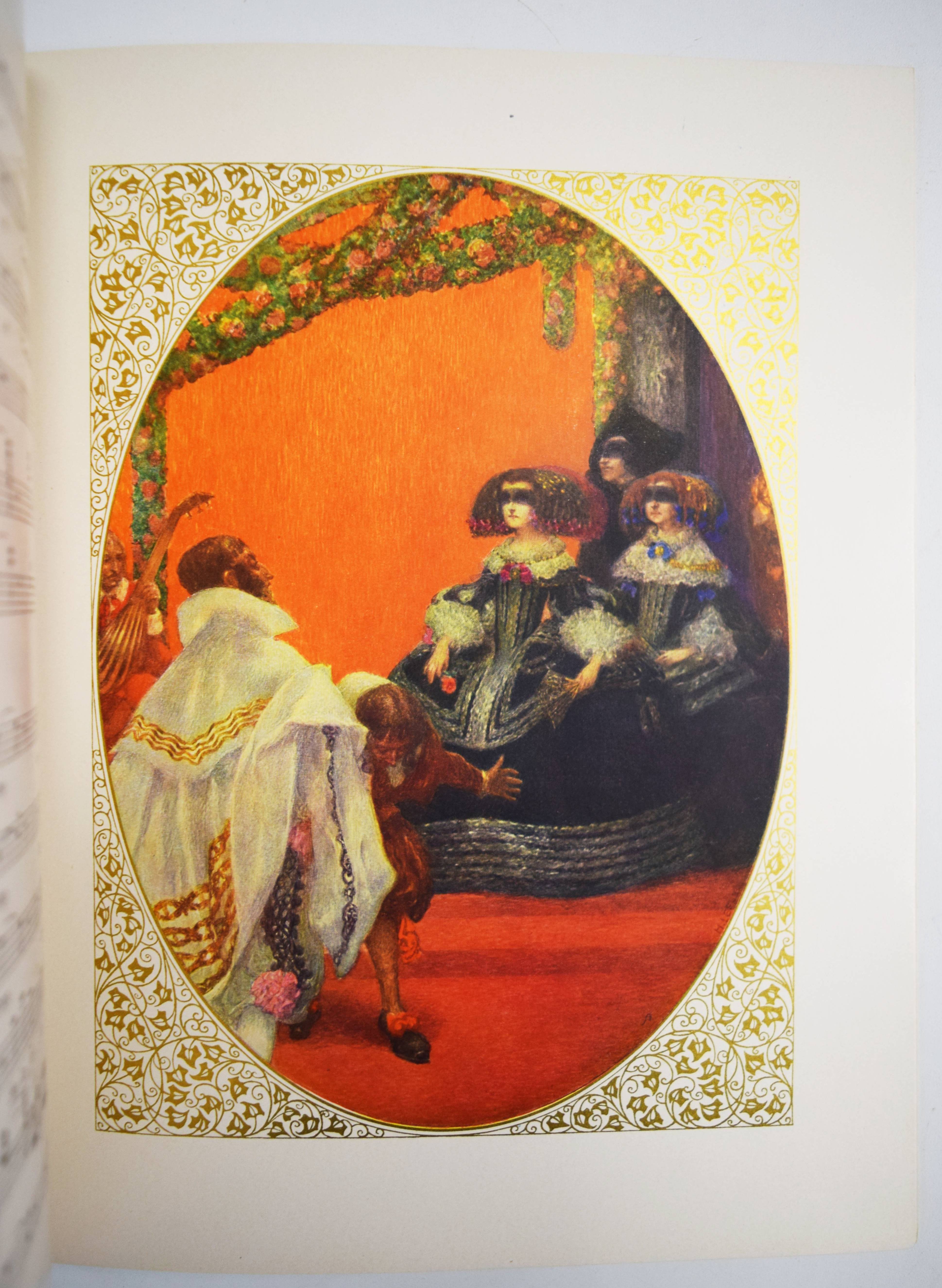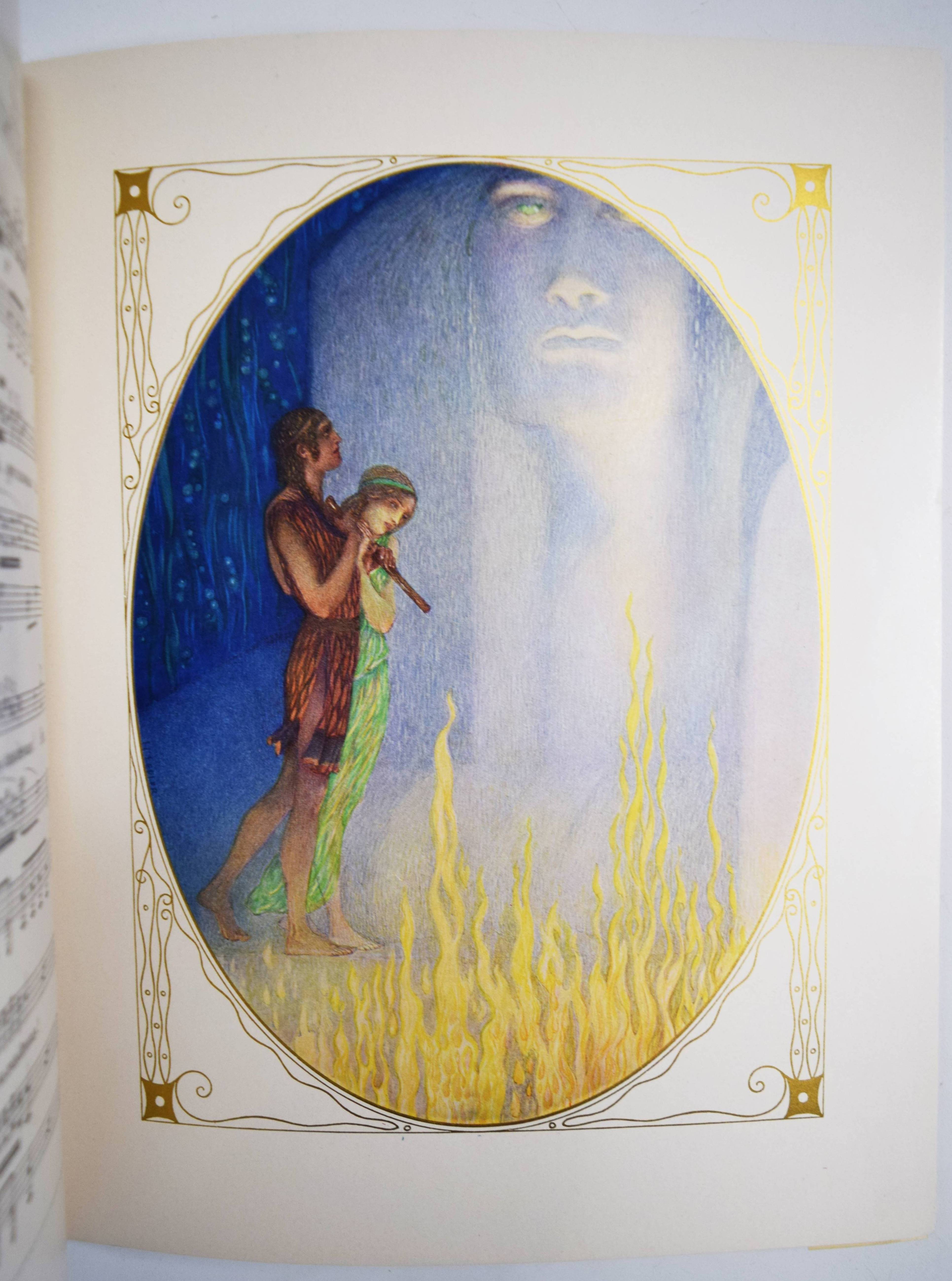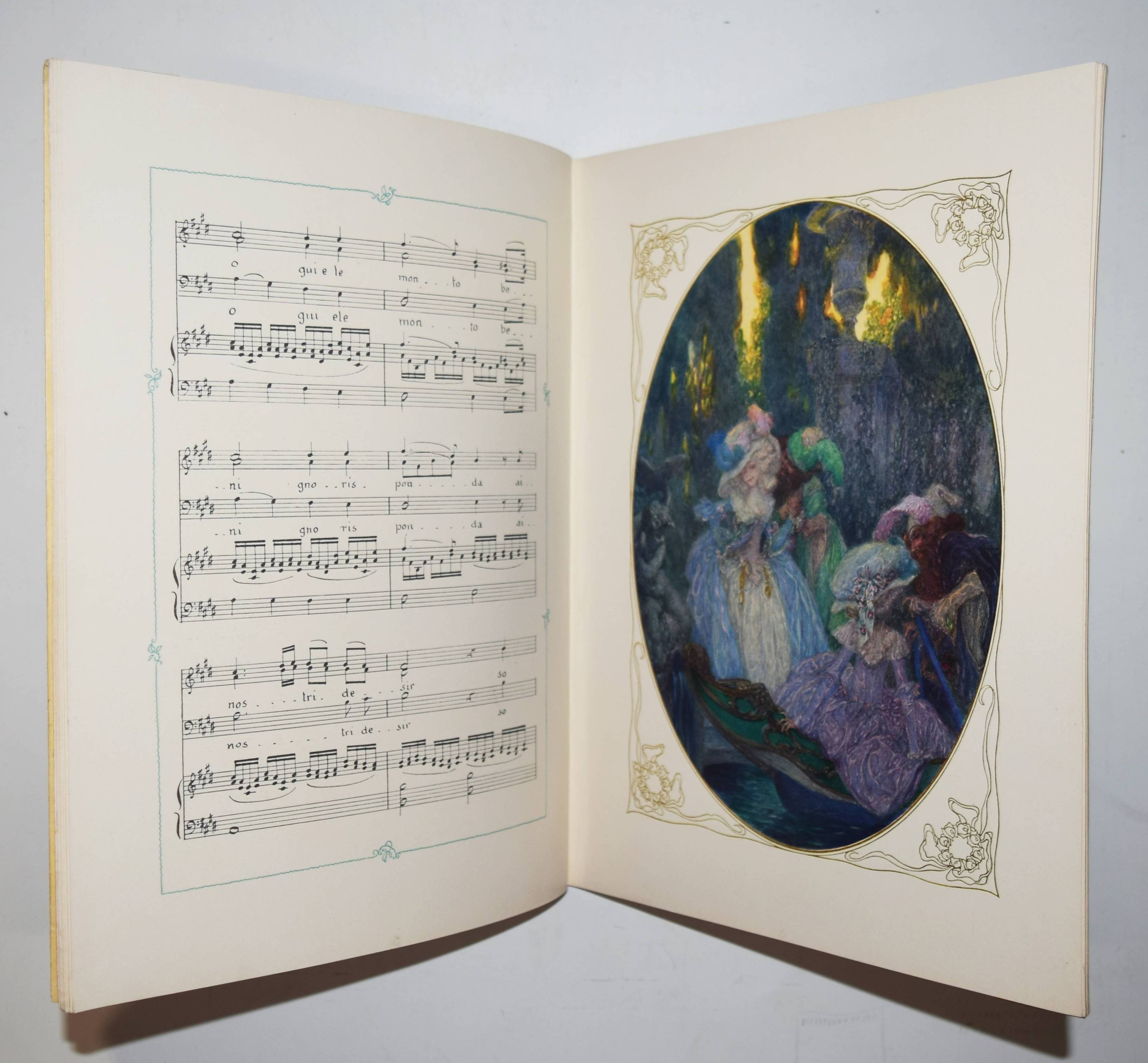 Mozart, (Wolfgang Amadeus). (Dix chansons et deux mélodies). Illustrations du Heinrich Lefler. Wien, M(arkus und Hugo) Munk o. J. (1914). 4° (31 x 24,5 cm.). [25] Bl. mit 12 ganzseitigen, farbigen Illustrationen im Oval mit ornamentaler Goldbordüre, sowie Buchschmuck in Grün von Heinrich Lefler. Farbig illustr. Orig.-Kartonumschlag mit ausgestanztem Schutzumschlag mit Deckeltitel und Ornamentrahmen. Seltene französische Ausgabe mit dekorativen Jugendstil-Illustrationen und Buchschmuck von H. Lefler (1863-1919). Die deutsche Ausgabe erschien in gleicher Ausstattung mit 12 Gedichten von Richard Specht. – Mit den Melodien: „39e. Symphonie“ und „Quartette A“. Sowie den Liedern: „Bastien et Bastienne, L’enlevement au Serail, Cosi fan tutte, Les noces de Figaro (2), Don Juan (Trio des Masques), Don Juan (Rondeau), La flute enchanté“ (2) und „Requiem (Benedictus)“. – Bei M. und H. Munk erschienen auch Mörikes, Mozart auf der Reise nach Prag und Kinderbücher mit den Illustrationen von H. Lefler. – Schutzumschlag mit geringen Randläsuren, sonst gut erhalten.