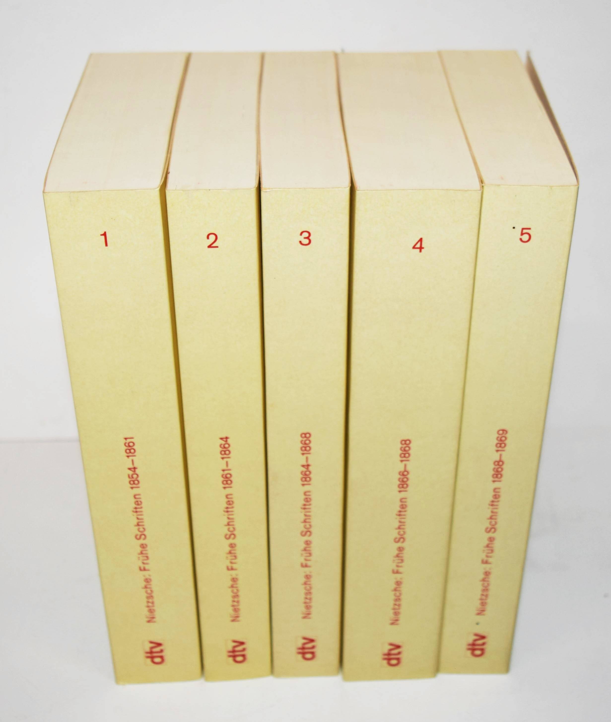 Nietzsche, Friedrich. Frühe Schriften. Herausgegeben von Hans Joachim Mette und Karl Schlechta. Mit einer editorischen Vorbemerkung von Rüdiger Schmidt zum Nachdruck der Ausgabe. (Fotomechanischer Nachdruck der Ausgabe München, Beck 1933-1940). 5 Bände. München, Dt. Taschenbuch Verlag 1994. Gr.-8°. Orig.-Kartonumschläge. I. Jugendschriften 1854-61. – II. Jugendschriften 1861-64. – III. Schriften der Studenten- und Militärzeit 1864-68. – IV. Schriften der Studenten- und Militärzeit 1866-68. Schriften der letzten Leipziger Zeit 1868. V. Schriften der letzten Leipziger und ersten Basler Zeit 1868-69. – Ohne den Pappschuber, sehr gutes Exemplar der Studienausgabe.