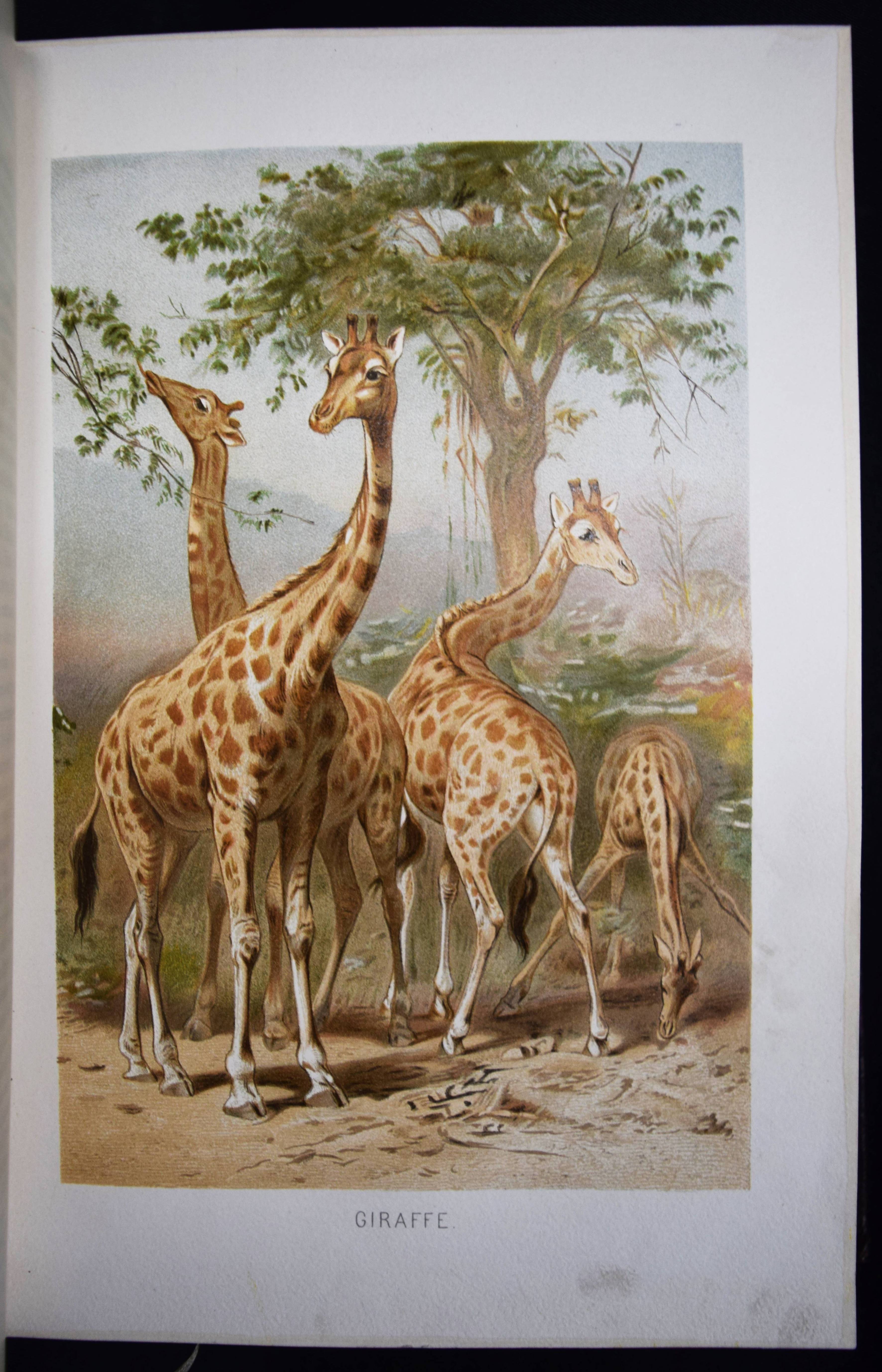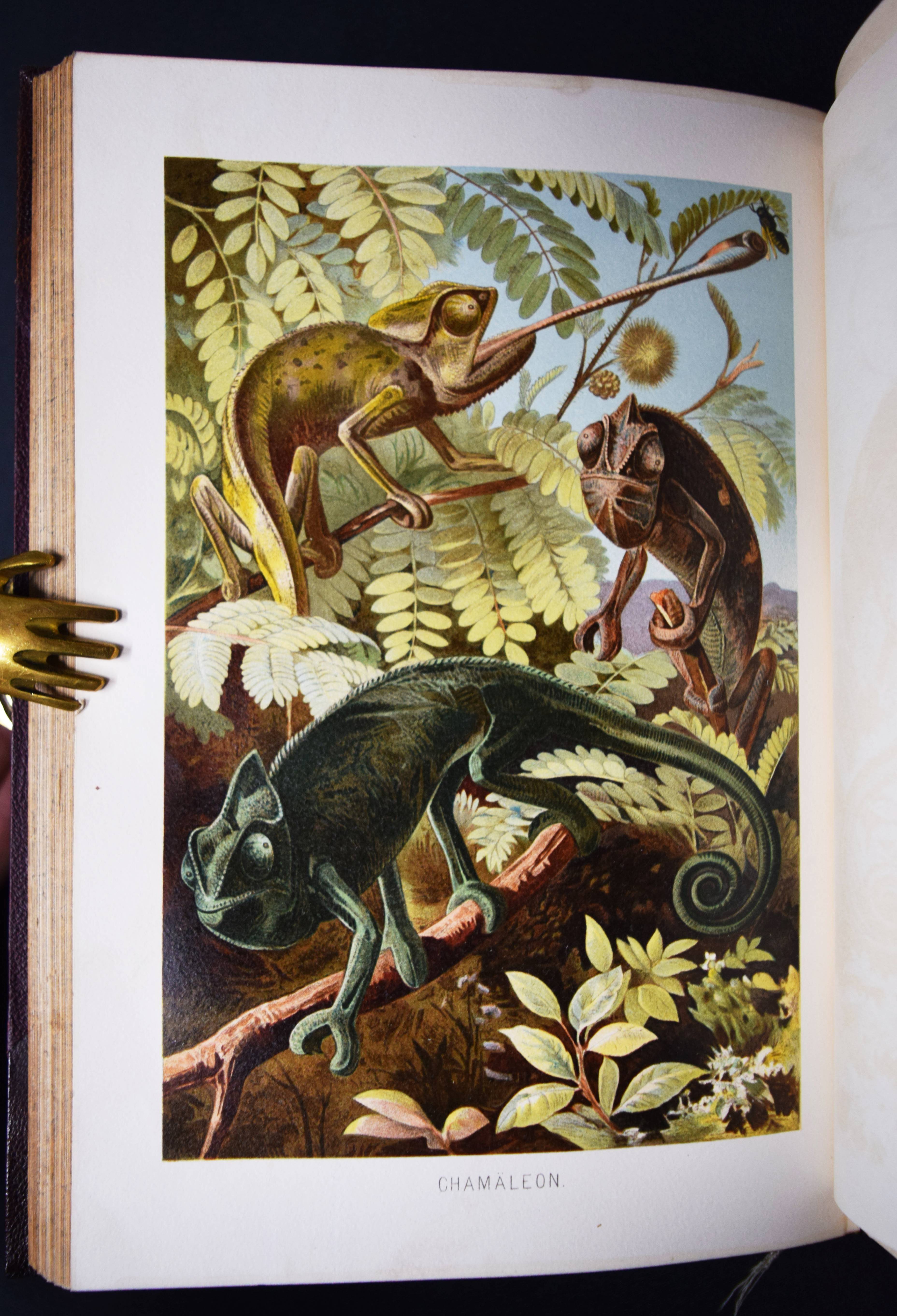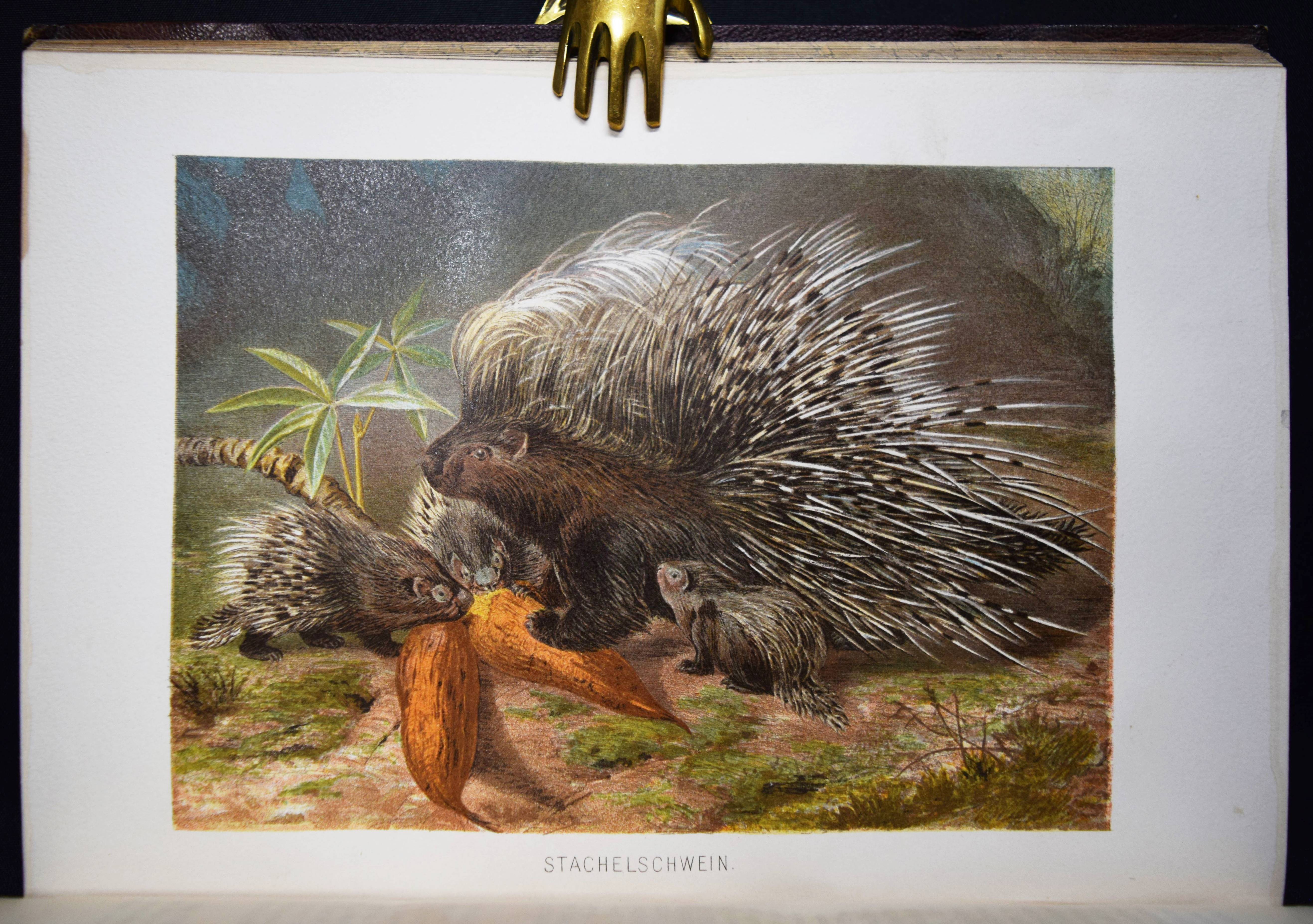 Brehm, (Alfred Edmund). Brehms Tierleben. Allgemeine Kunde des Tierreichs. 3. gänzlich neubearb. Auflage von (Eduard) Pechel-Loesche. 10 Bände. Leipzig, Wien, Bibliographische Institut 1890-1893. Gr.-8° (25,5 x 18 cm.). Mit 180 Tafeln in Chromolithographie und Holzschnitt, 11 Karten und 1910 Textabb. Orig.-Halbledereinbände mit goldgepr. Rückentiteln und Rückenvergoldung. KNLL III, 117. Nissen, IVB 138. – Beste Ausgabe mit den schönen chromolithographierten Tafeln. – I. bis III. Säugetiere. – IV. bis VI. Vögel. – VII. Kriechtiere und Lurche. – VIII. Fische. – IX. Insekten. – X. Niedere Tiere. – „Der besondere Reiz und damit wohl auch ein wichtiges Element des literarischen Werks von Brehms Tierschilderungen liegt in seiner von genialer Intuition geleiteten Deutung der Tierseele…“ (KNLL). – Der Geograph und Afrikaforscher E. Pechel-Loesche (1840-1913) war seit 1895 Professor an der Universität Erlangen. – Rücken teils etwas berieben, Vorderdeckel von Band IX fleckig, gutes Exemplar.