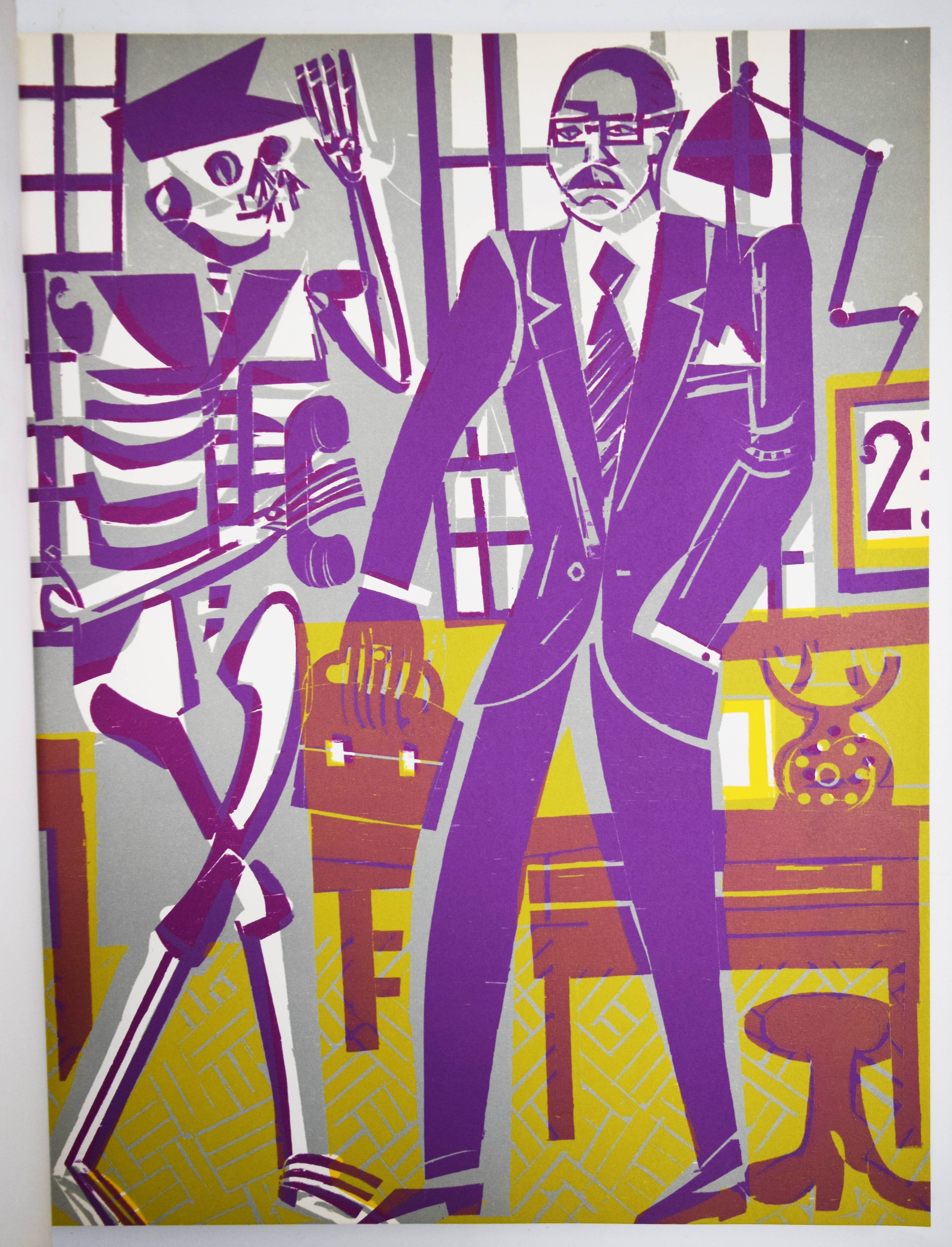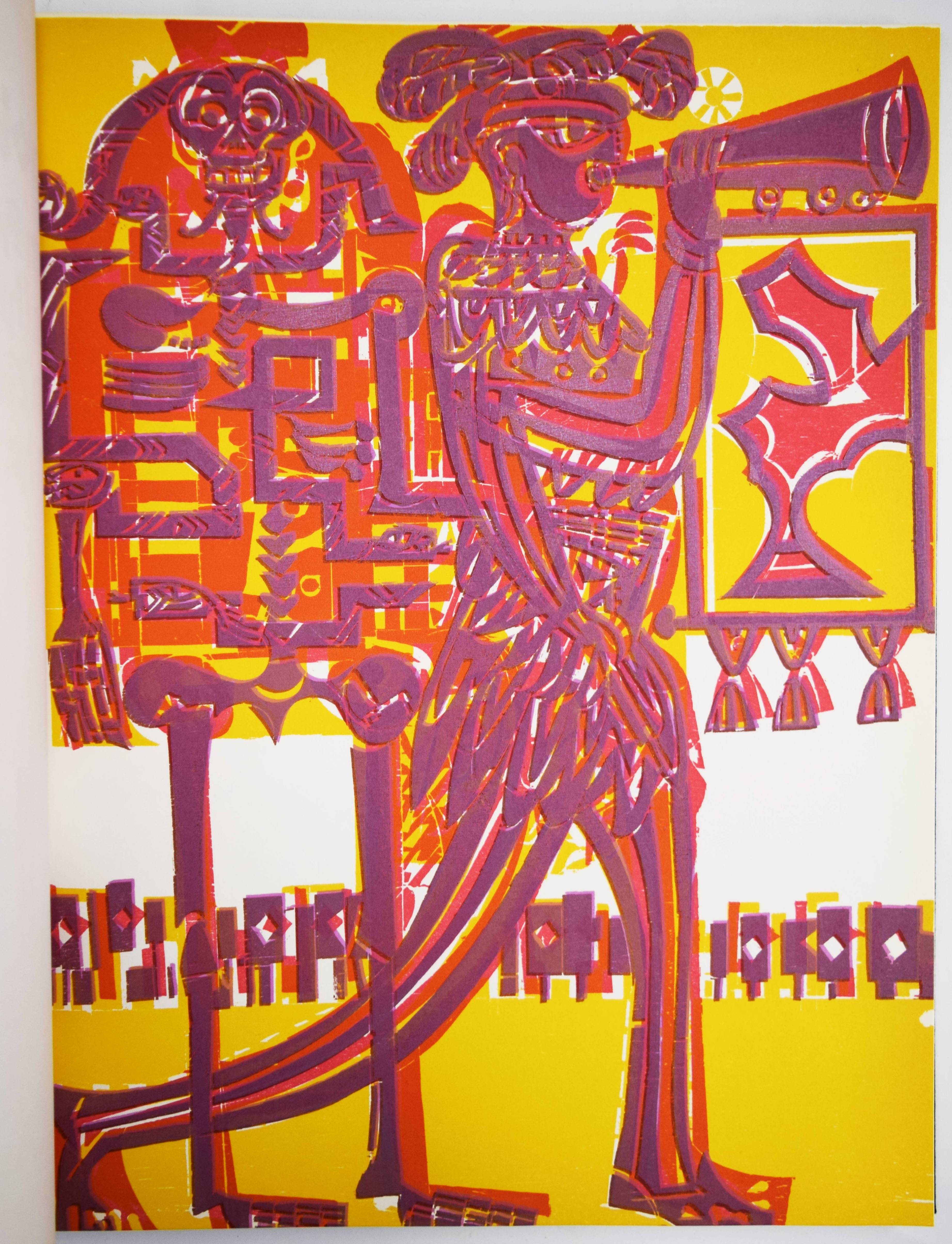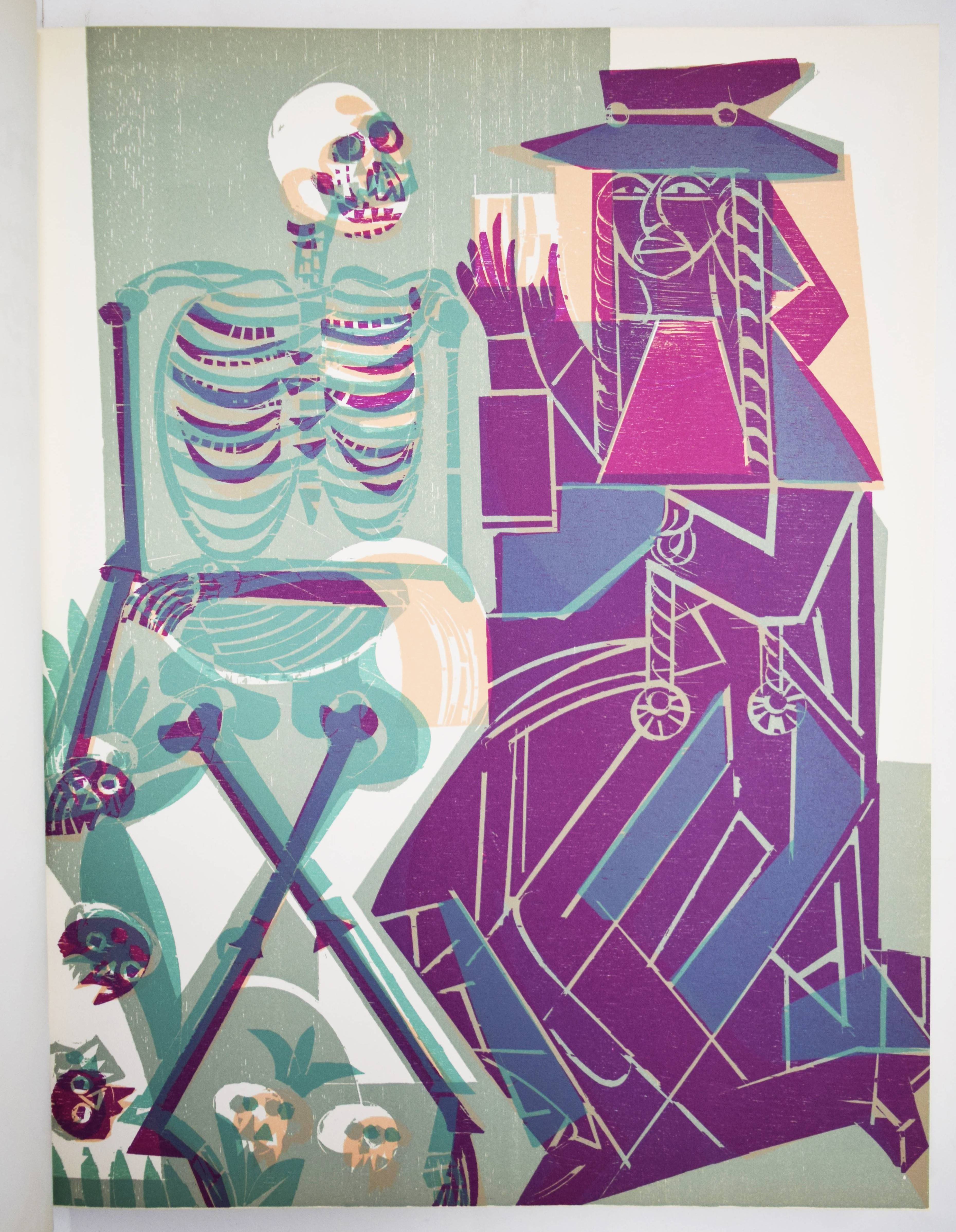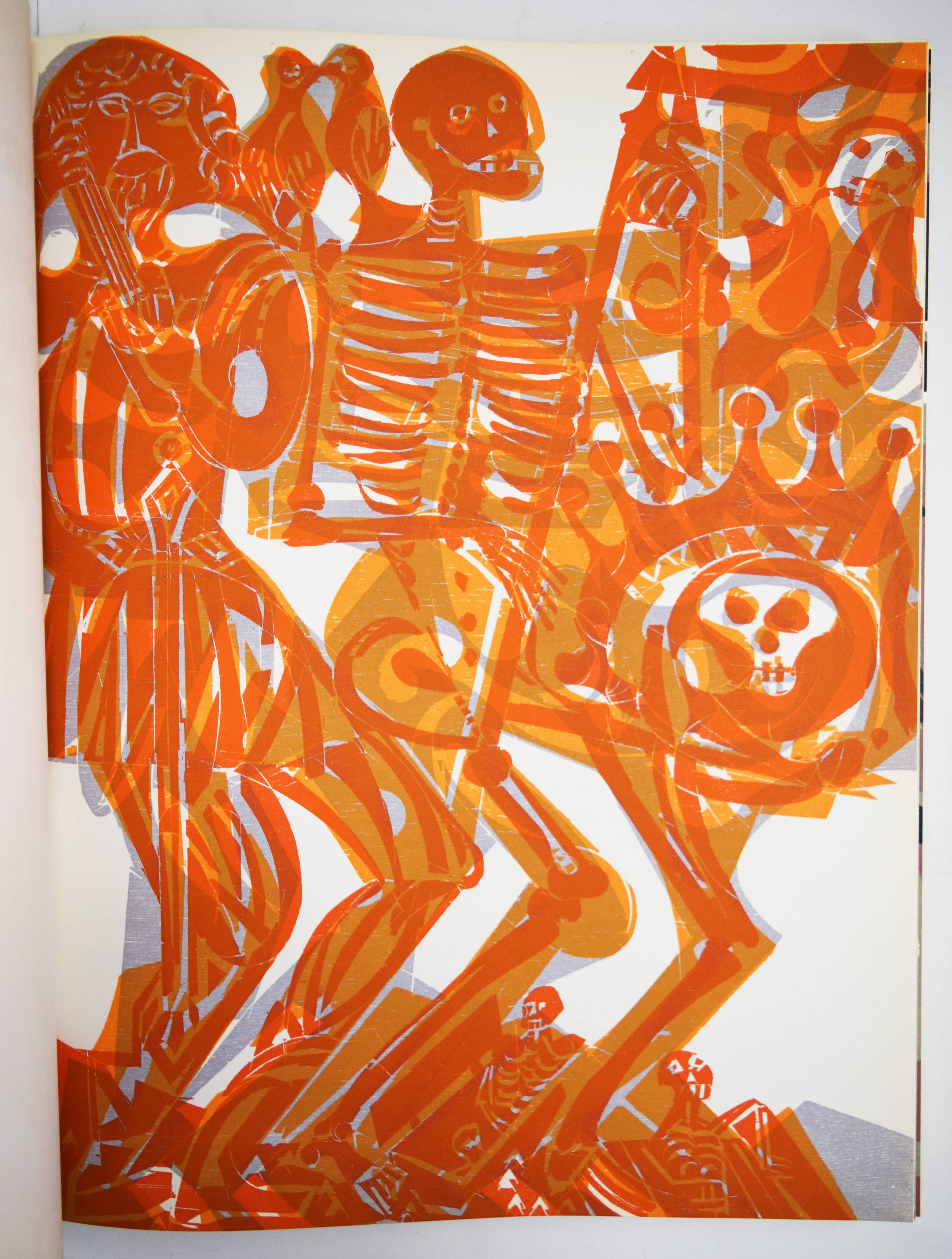 Grieshaber, HAP. Totentanz von Basel. Mit den Dialogen des mittelalterlichen Wandbildes. – The dance of death at Basle. – La danse des morts à Bâle. – (Mit einem Nachwort von Rudolf Meyer). Dresden, Verlag der Kunst 1966. Folio. 40 Bl., 2 Bl., VII S. mit 40 Orig.-Farbholzschnitten. Orig.-Leinenband mit goldgepr. Deckelillustration und Schutzumschlag. (4. Druck der Leipziger Presse). Fichtner 55. Fürst 66/1-40. „Ihr müßt alle nach meiner Pfeife tanzen“. Ausst.-Kat. Herzog August Bibliothek und Bibliothek Otto Schäfer 2000/2001, S. 241 ff. Spindler 65, 4. Tiessen III, 9. „Zum Sterben schön“. Ausst.-Kat. Schnütgen Museum Köln 2006, No. 106. – Erste Ausgabe. – Dreisprachiger Text. Die Schriften für die deutschen Texte entwarf Albert Kapr, sie wurden in Holz geschnitten. Sämtliche Holzschnitte wurden von den Originalstöcken in den Werkstätten der Leipziger Hochschule für Grafik und Buchkunst gedruckt. – „Ein Totentanz von vierzig Paaren, mit handwerklicher Beharrlichkeit in Holz geschnitten vom 24. Dezember 1965 bis zum 13. Juni 1966 … der Knochenmann als Schnitter, Totengräber oder Spielmann“ (Nachwort). – „Das Buch erregte 1966 auf der Buchmesse in Frankfurt a. M. großes Aufsehen und ebenso die zahlreichen Ausstellungen (die ersten im Juli 1966 in Leipzig und gleichzeitig in Essen). Obwohl Grieshaber die mittelalterlichen Stände sowie die Ständeordnung gänzlich übernahm, sind seine Bilder nicht nur originell, sondern oft von einer eindringlichen Aktualität. Mittels seiner sehr persönlichen, von jeder Stilrichtung unabhängigen Bildersprache ist es ihm gelungen, aus vielen der alten Motiv Symbole unserer Zeit zu schaffen.“ (Schuster, Mensch und Tod. Graphiksammlung der Univ. Düsseldorf. Bestandskat. Nrn. 262-302 (mit ausführl. Beschreibung aller Holzschnitte). – Schutzumschlag mit kleinen Randläsuren und leicht angestaubt, sonst sehr gut erhalten.