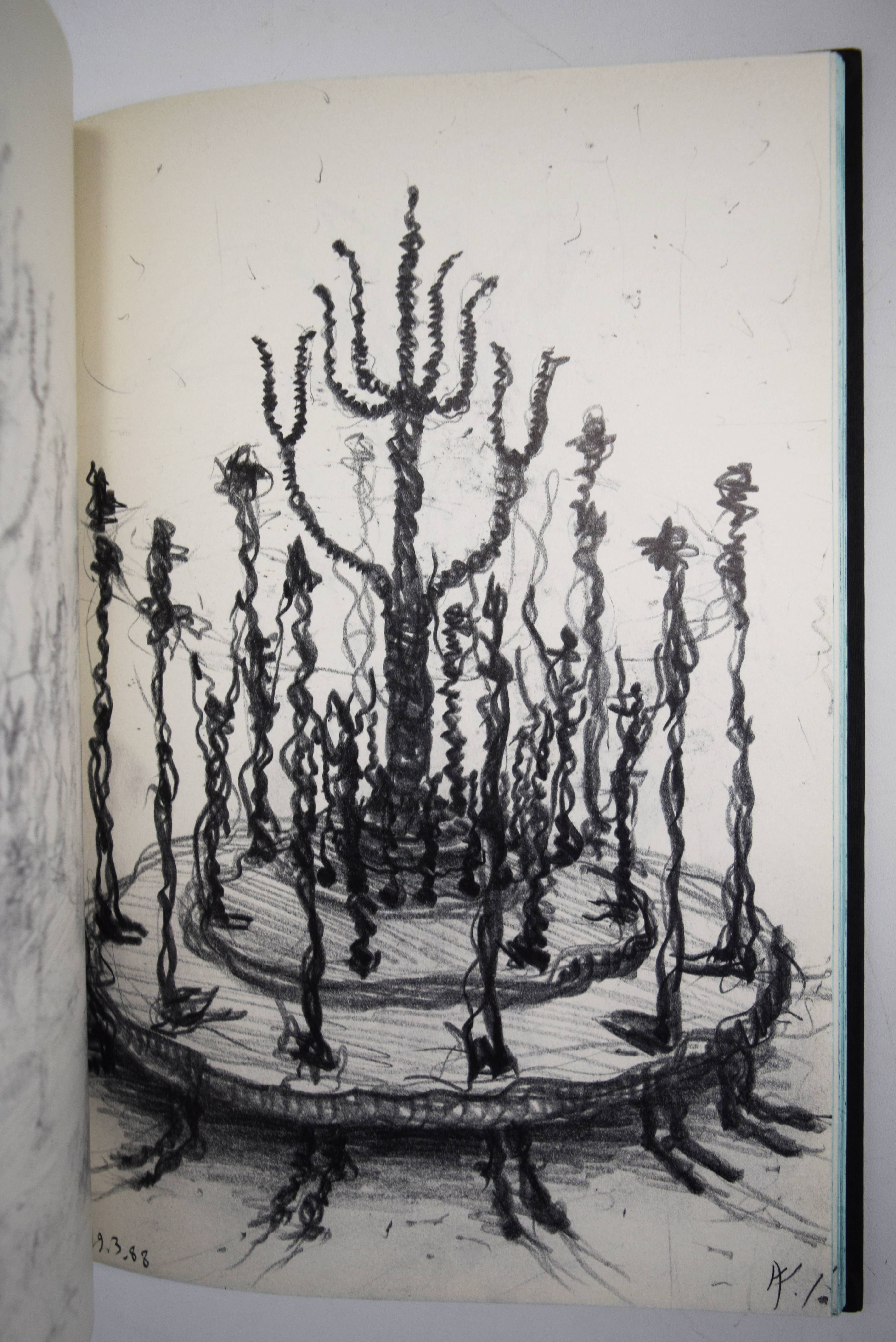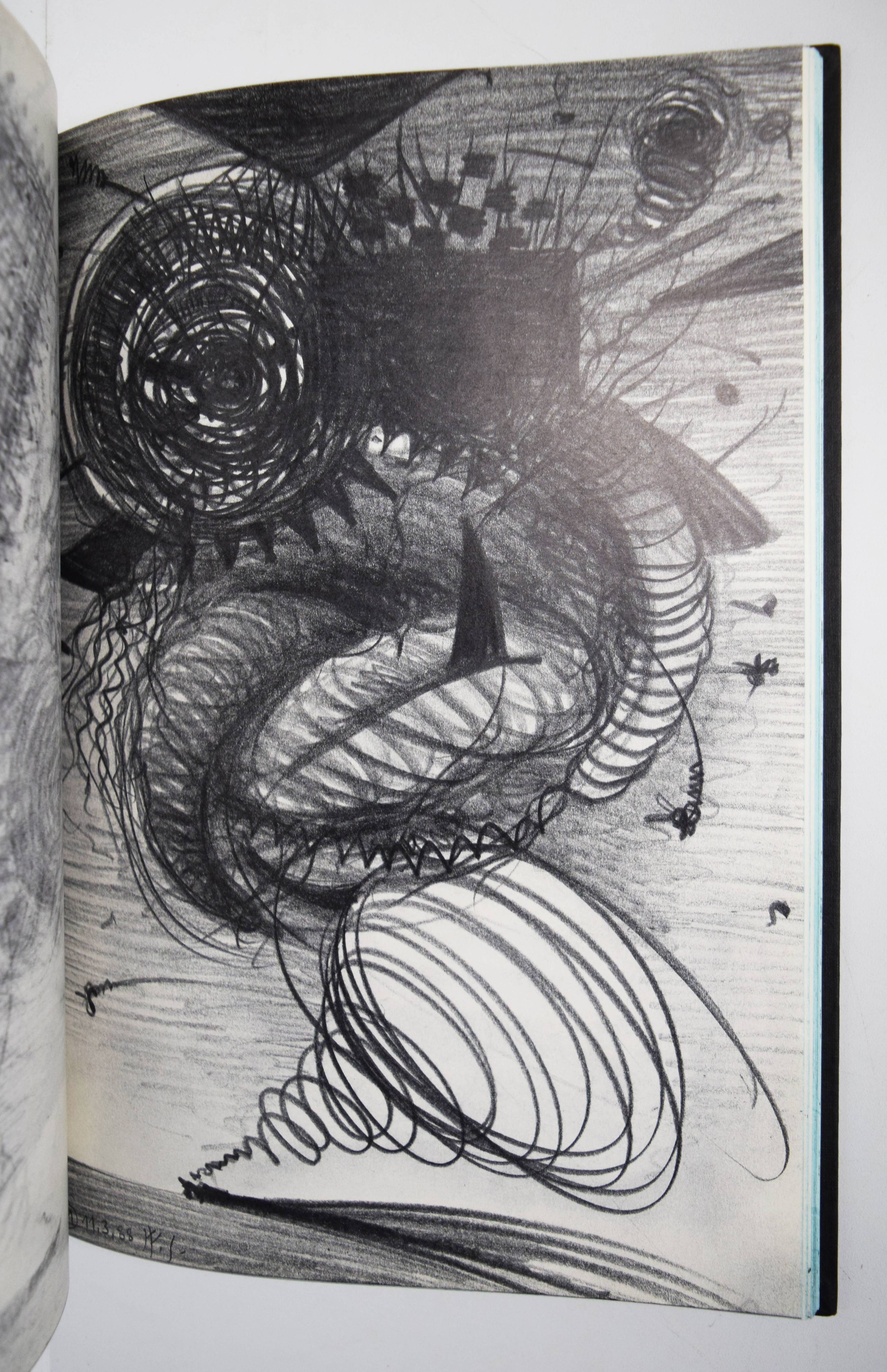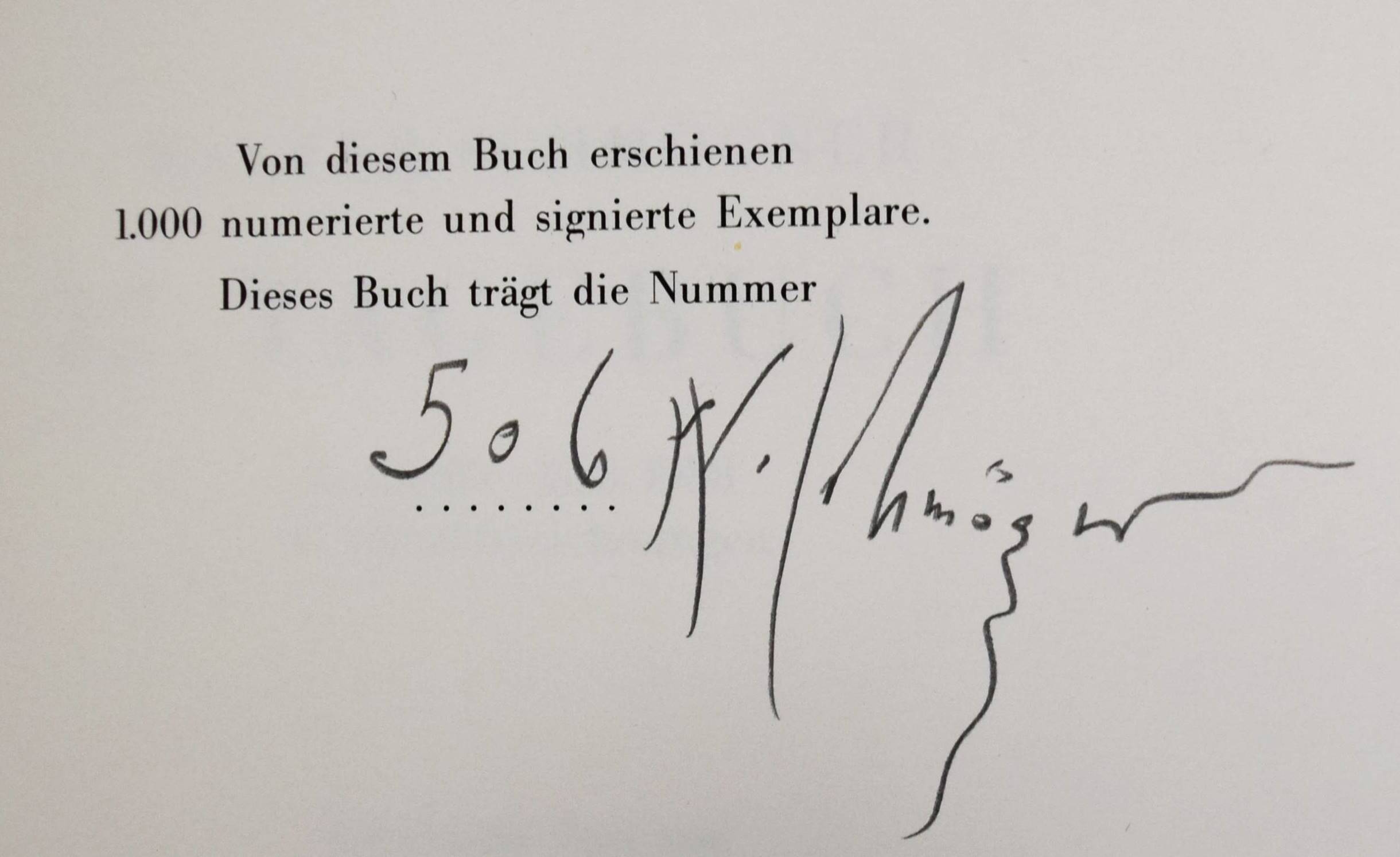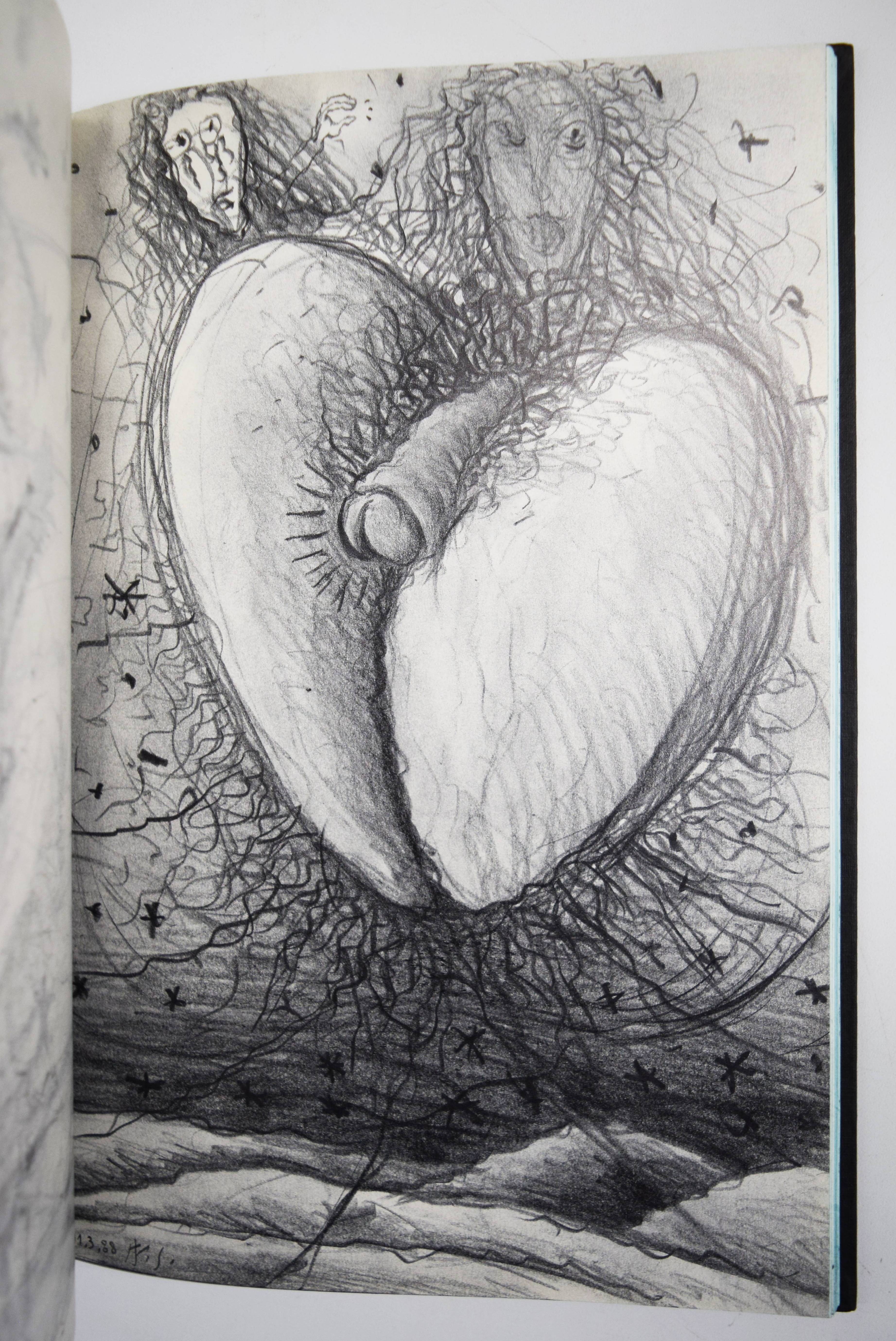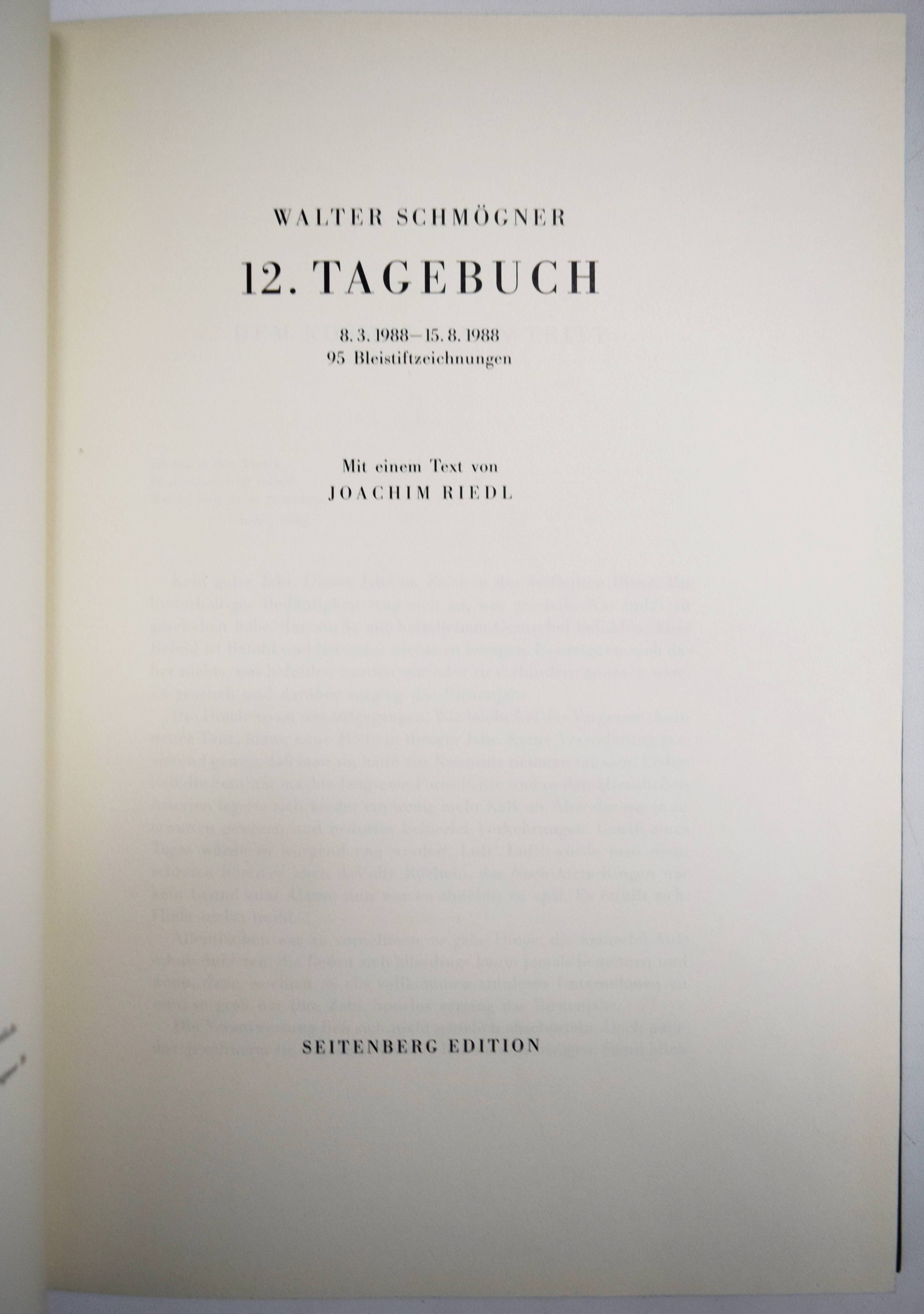 Schmögner, Walter. 12. Tagebuch. 8.3.1988 – 15.8.1988. 95 Bleistiftzeichnungen. Mit einem Text von Joachim Riedl. Wien, Seitenberg Edition (1989). 4°. [204] S. mit 95 Tafeln. Orig.-Halbleinenband mit farbigem Deckelschild. Eines von 1000 num. Exemplaren; im Druckvermerk von W. Schmögner signiert und mit eigenhändiger Widmung für die Kölner Antiquarin Gundel Gelbert. – Sehr gutes Exemplar.