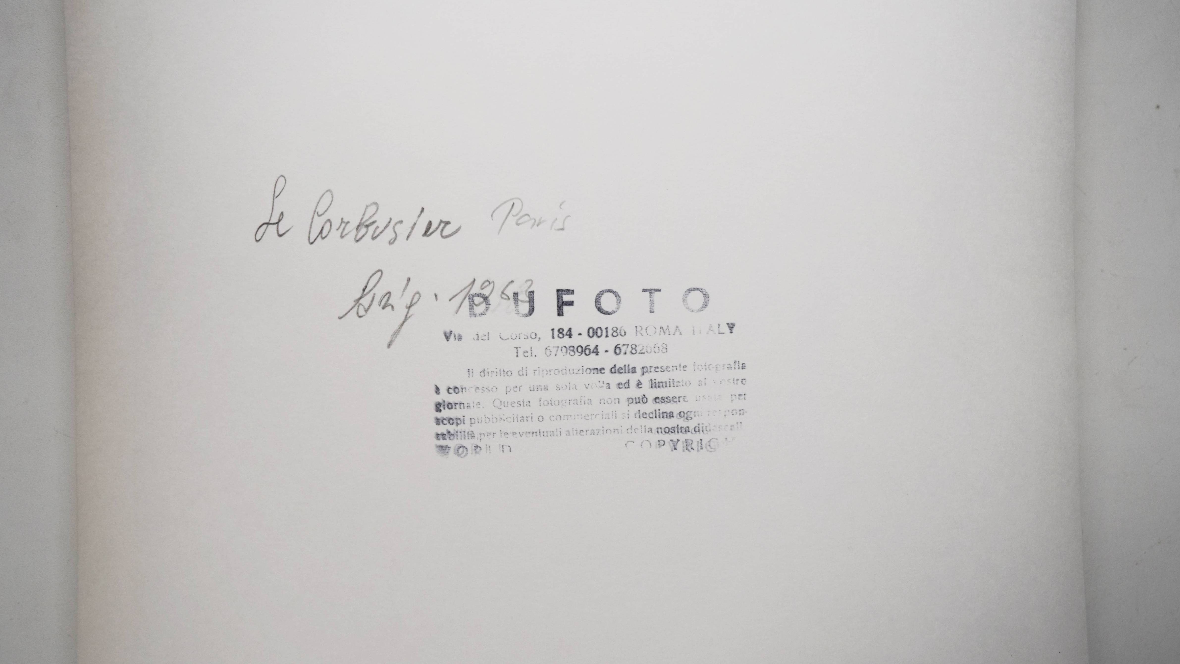 Le Corbusier (eig. Charles-Édouard Jeanneret-Gris, 1887-1965, schweizerisch-französischer Architekt und Maler). Orig.-Photographie (Silbergelatine-Abzug) von Aldo Durazzi (1925-1990). Paris Februar 1963. Format: 40 x 30 cm. Schönes Portrait des bedeutenden Architekten in seinem Pariser Atelier. Im Hintergrund ist eine Zeichnung seines berühmten Modulor Man zu sehen. – Rückseitig mit Stempel einer ital. Foto-Agentur.
