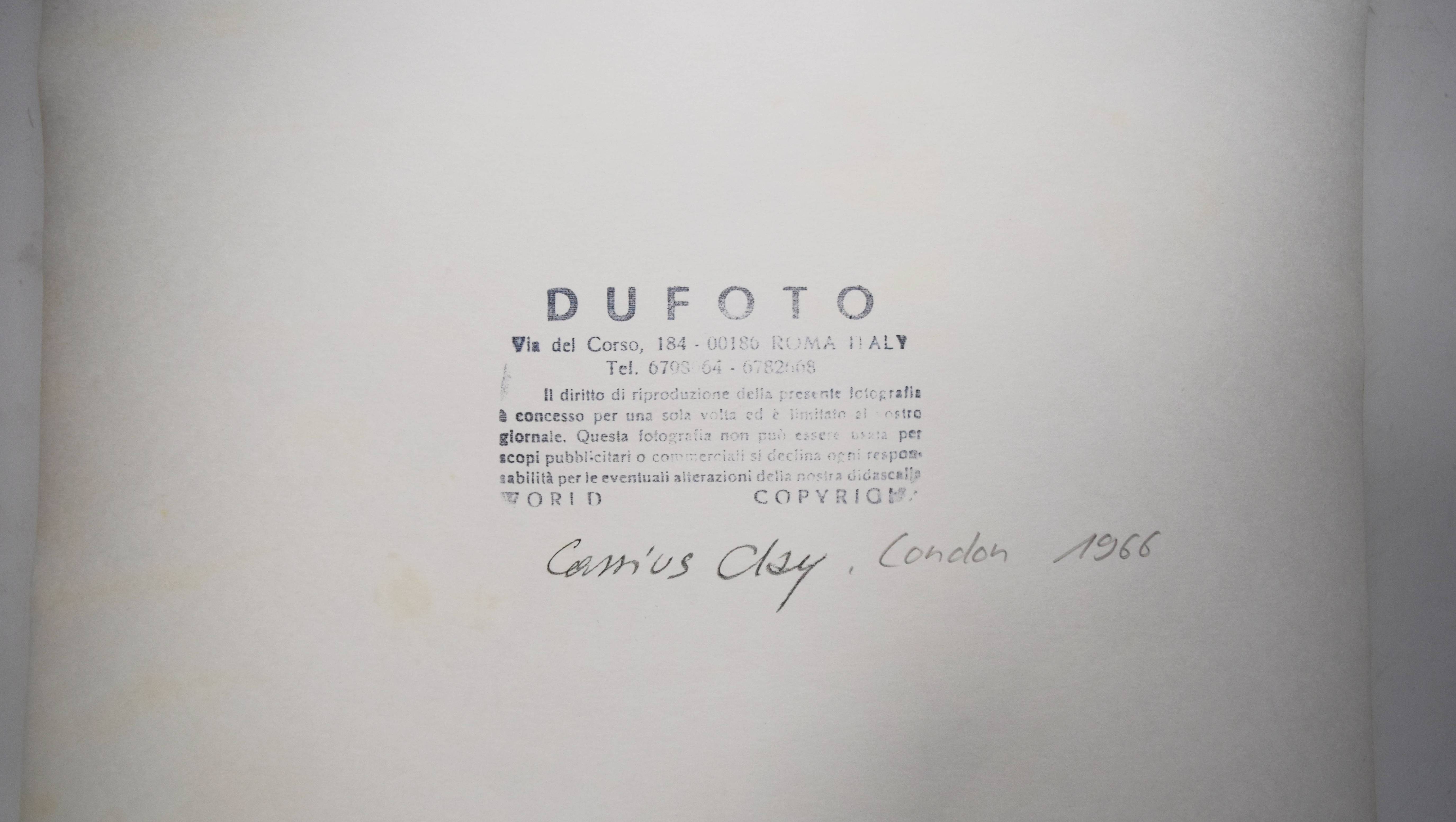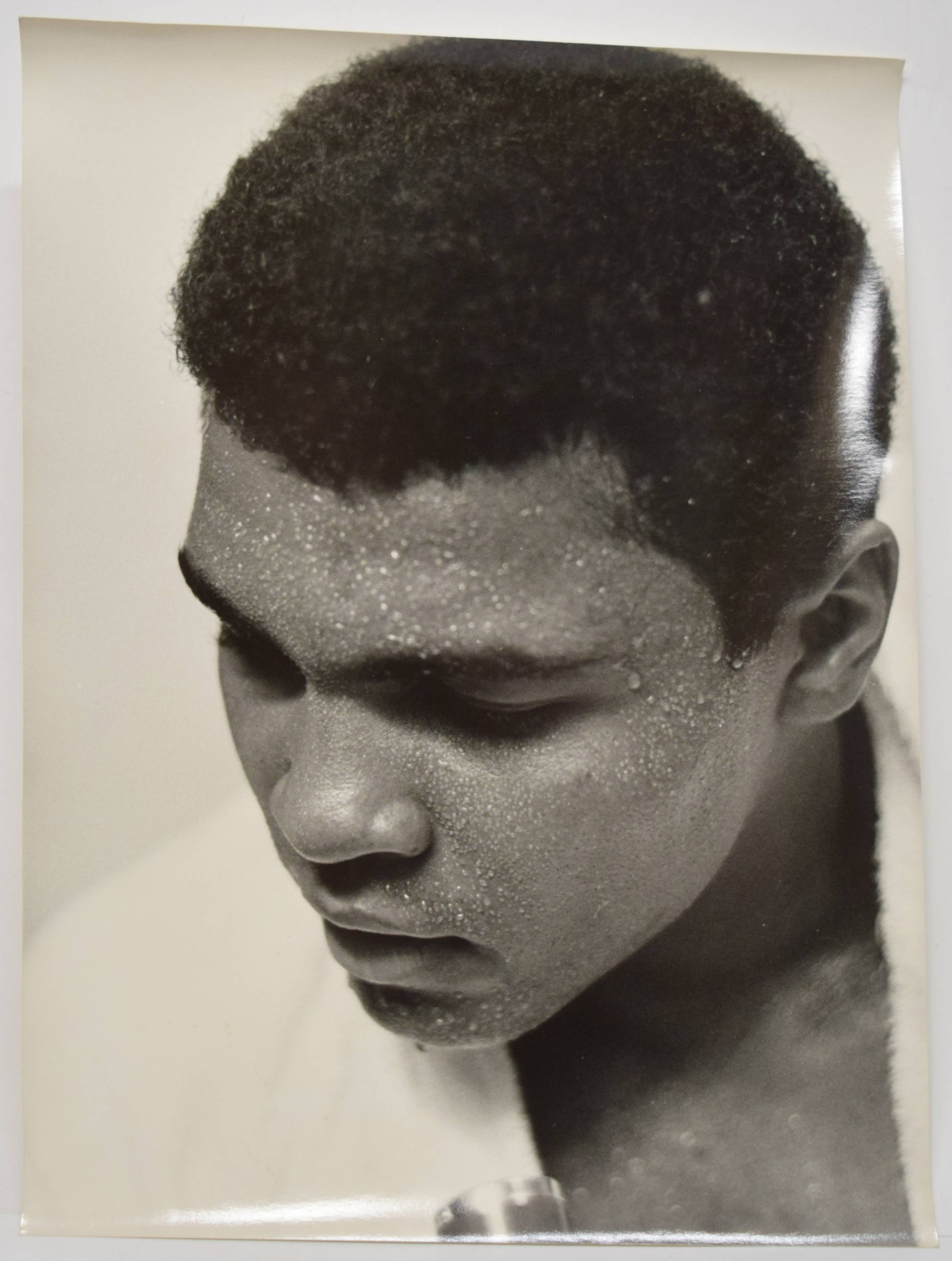 Ali, Muhammad (eig. Cassius Marcellus Clay, 1942-2016, US-amerikanischer Boxer). Orig.-Porträtphotographie (Silbergelatine-Abzug). London 8. August 1966. Format: 40 x 30 cm. Ausdrucksstarkes Porträt des wohl berühmtesten Sportlers aller Zeiten. – Es zeigt den schweißbedeckten Boxweltmeister nach seinem legendären Kampf gegen Brian London in der Earls Court Arena, London. – Rückseitig mit Stempel einer italienischen Foto-Agentur, vintage.