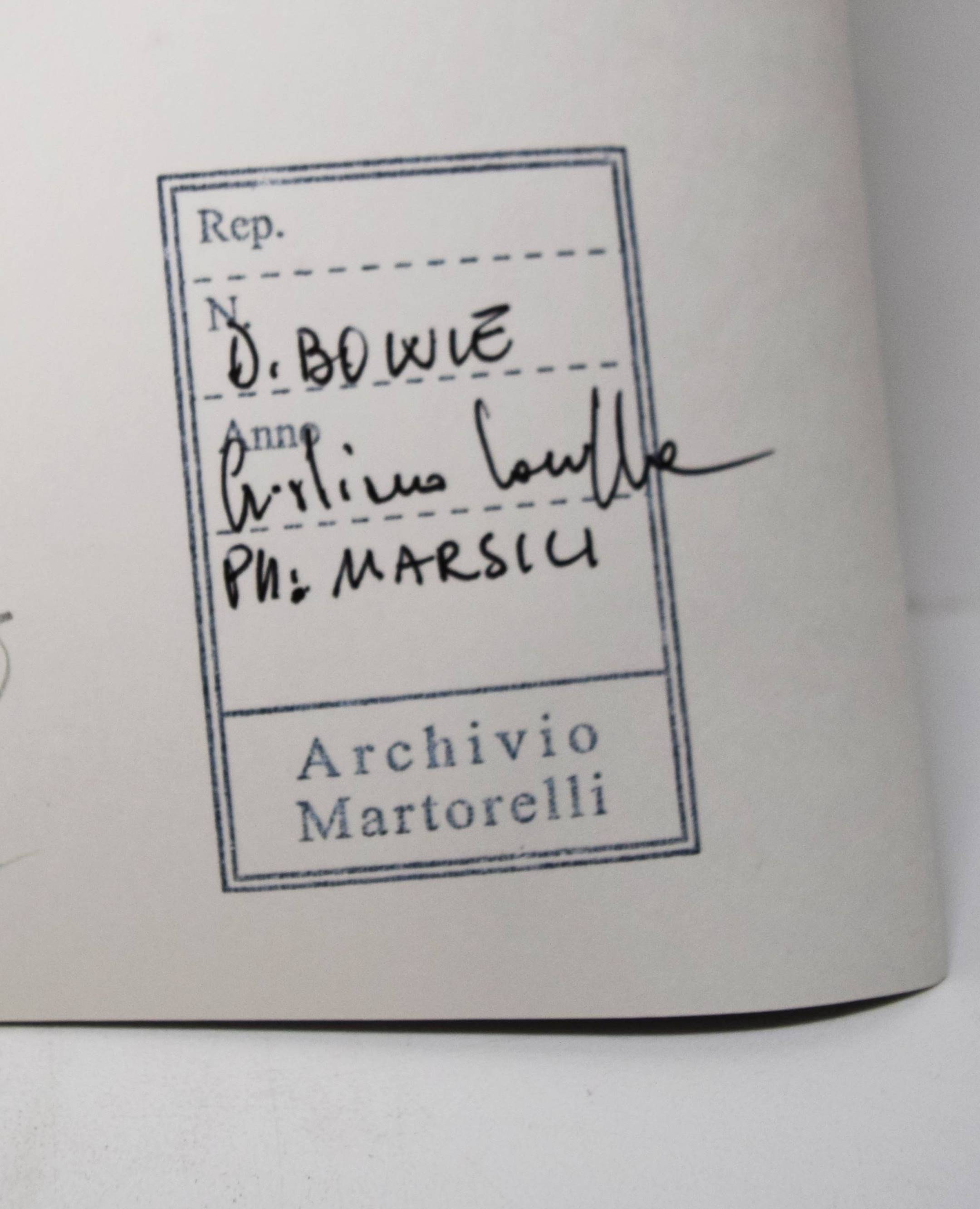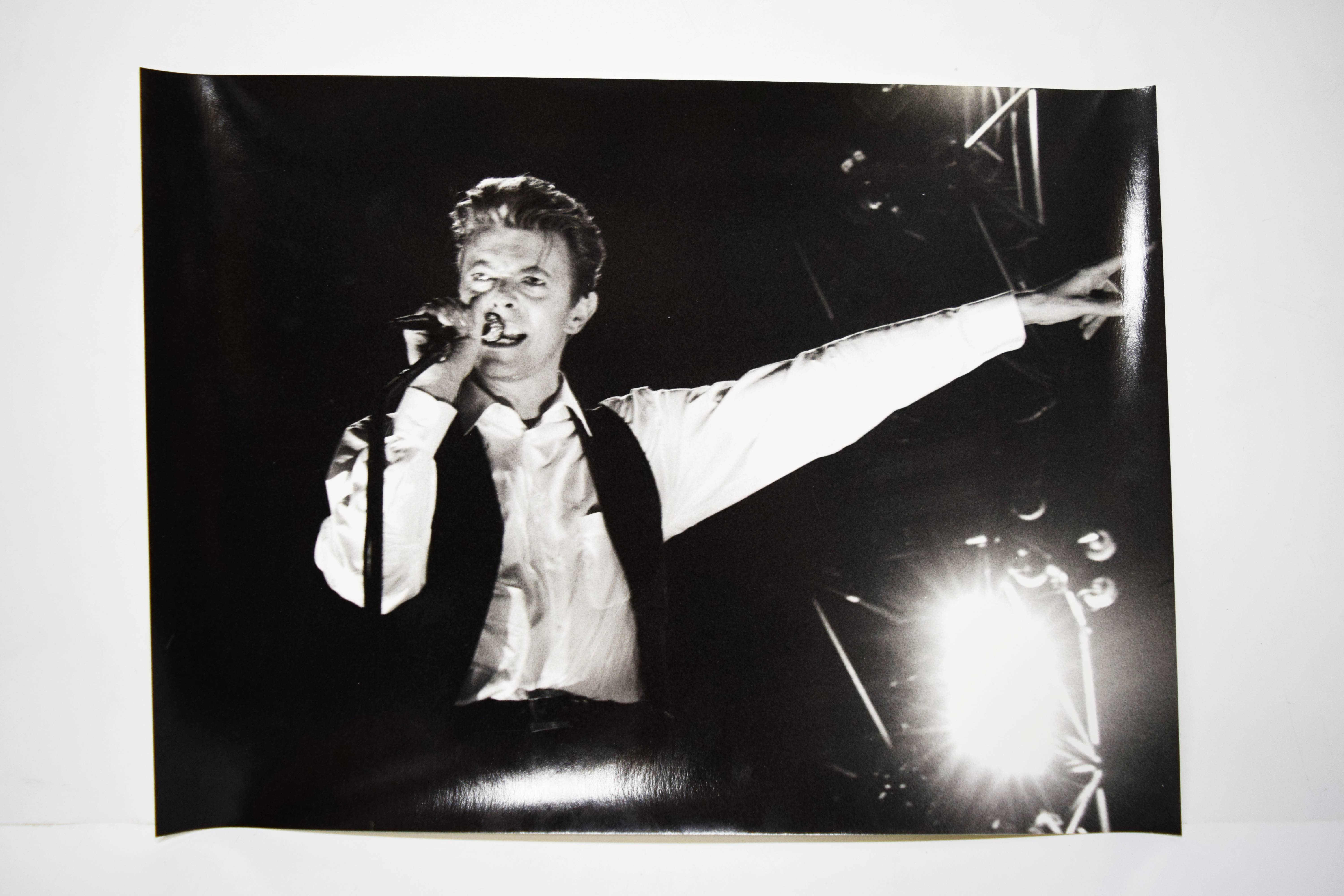 Bowie, David (d. i. David Robert Jones, 1947-2016, britischer Musiker, Sänger, Produzent und Schauspieler). Original-Portrait-Photographie (Silbergelatine) von Marsili. Rom 15. oder 16. Juni 1987. Format 30 x 40 cm. (Querformat) Konzertfoto des berühmten Pop-Stars bei seiner „Glass Spider Tour“ im Stadio Flaminio in Rom. – Rückseitig mit Stempel einer italienischen Fotoagentur, vintage.