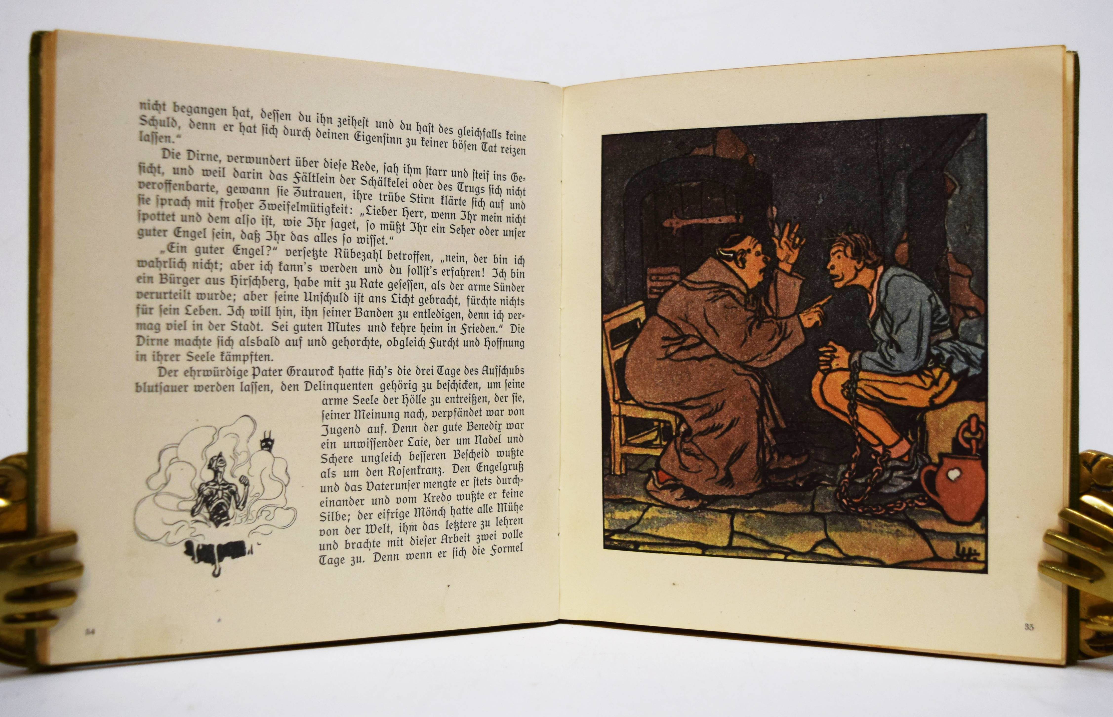 Musäus, (Johann Karl August). Rübezahl, der Herr des Riesengebirges. Deutsche Volkssagen von Musaeus. Bearbeitet von Hans Fraungruber. Bilderschmuck von Hans Schwaiger und Jos(ef) J. Loukota. Wien und Leipzig, Gerlach & Wiedling o. J. (1907). Kl.-8°. 118 S., [1] Bl. mit 82 teils farb. u. ganzs. Illustrationen. Illustr. Orig.-Leinenband. (Gerlach’s Jugendbücherei, Band 18). Heller 18. Nebehay, Gerlach 18. Ries 696, 1 u. 876, 1. – Erste Ausgabe. – Zeitgenöss. Widmung gegenüber dem Titelblatt, sehr gutes sauberes Exemplar.