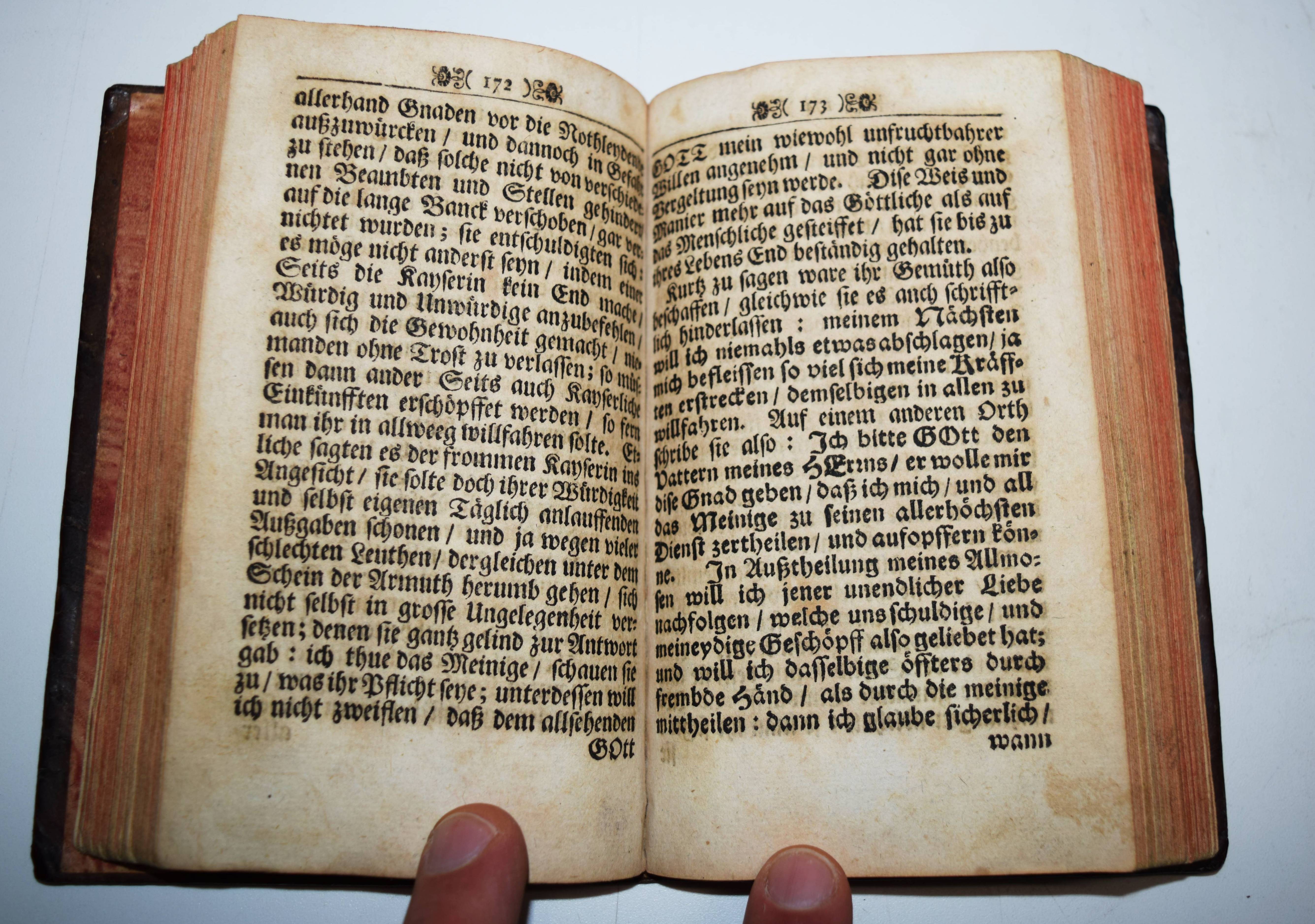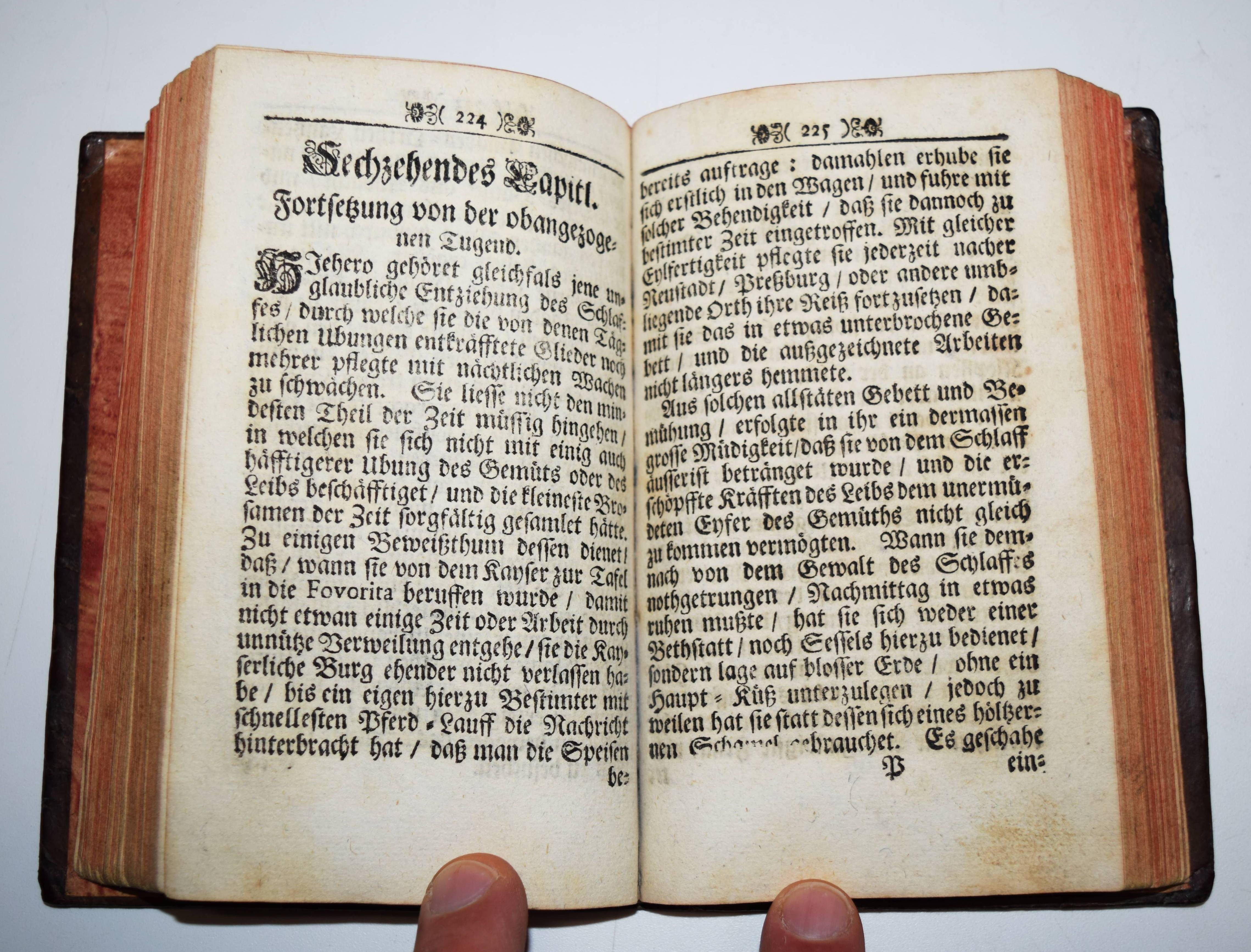(Wagner, Franz und Bernhard Lanz). Leben und Tugenden Eleonorae Magdalenae Theresiae, Römischen Kayserin. Wien, Wolfgang Schwendimann 1721. Kl.-8° (16,5 x 10,5 cm.). [8] Bl., 367 S. Kalbslederband der Zeit mit goldgepr. Rückenschild und reicher Rückenvergoldung. De Backer-Sommervogel VIII, 10. Holzmann-Bohatta VI, 6349. Oettinger 175. VD18 11395494. – Erste deutsche Ausgabe der 1720 beim gleichen Verleger in Latein erschienenen Biographie der Gattin von Leopold I. – Rücken etwas berieben, Exlibris, gutes Exemplar.